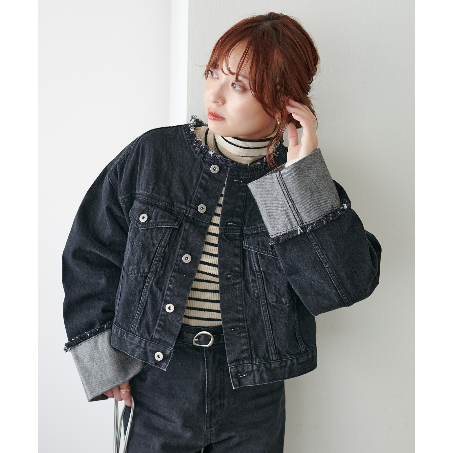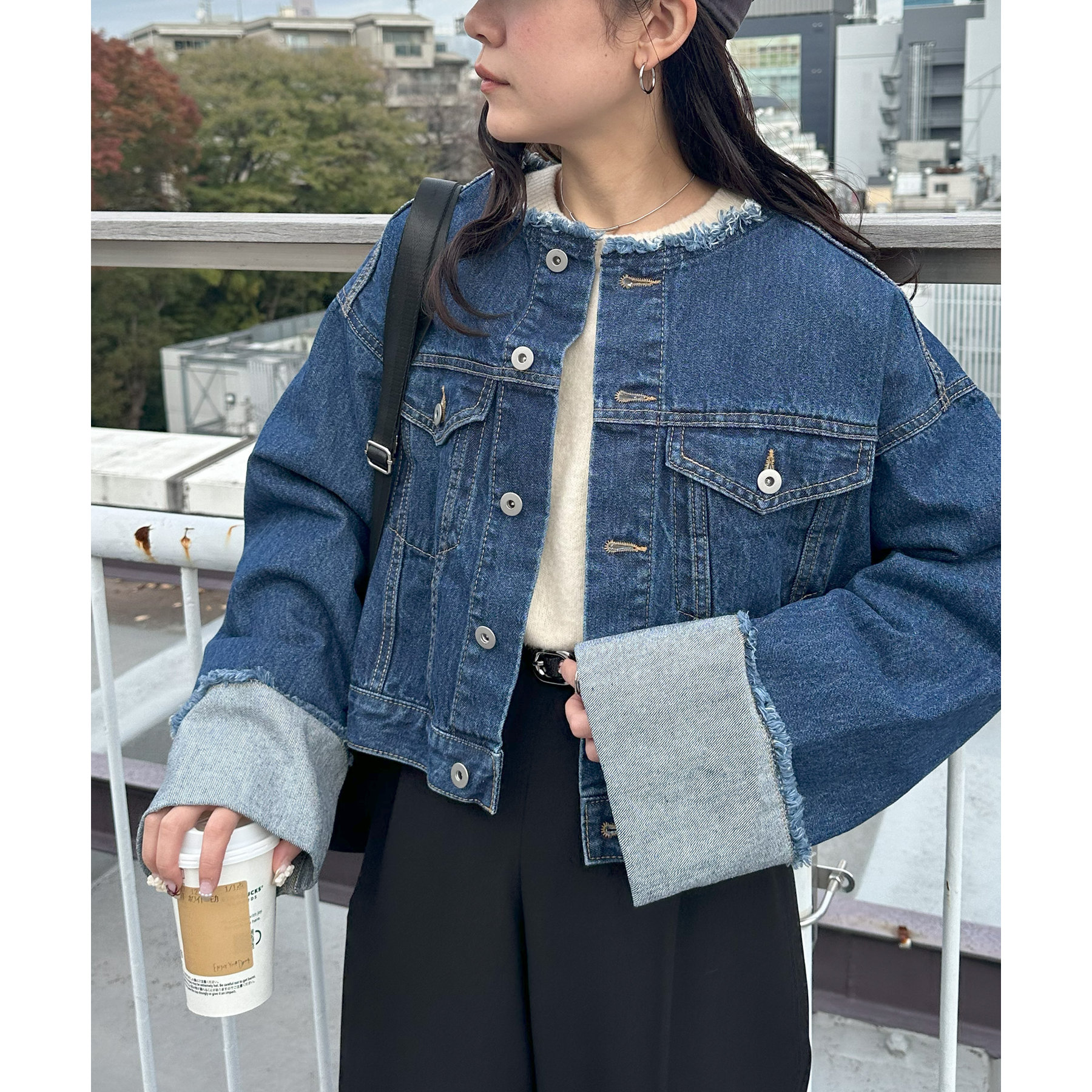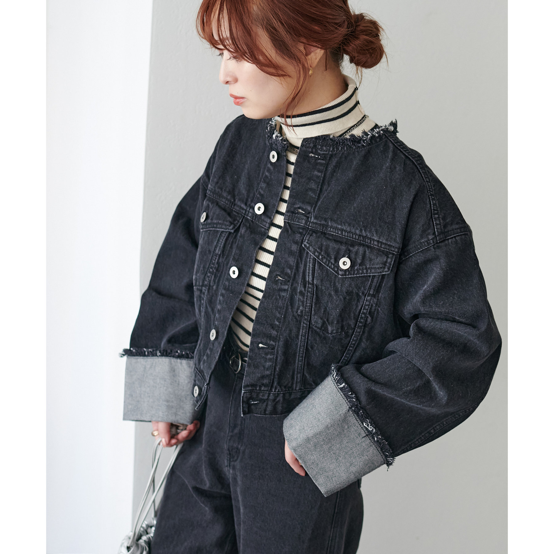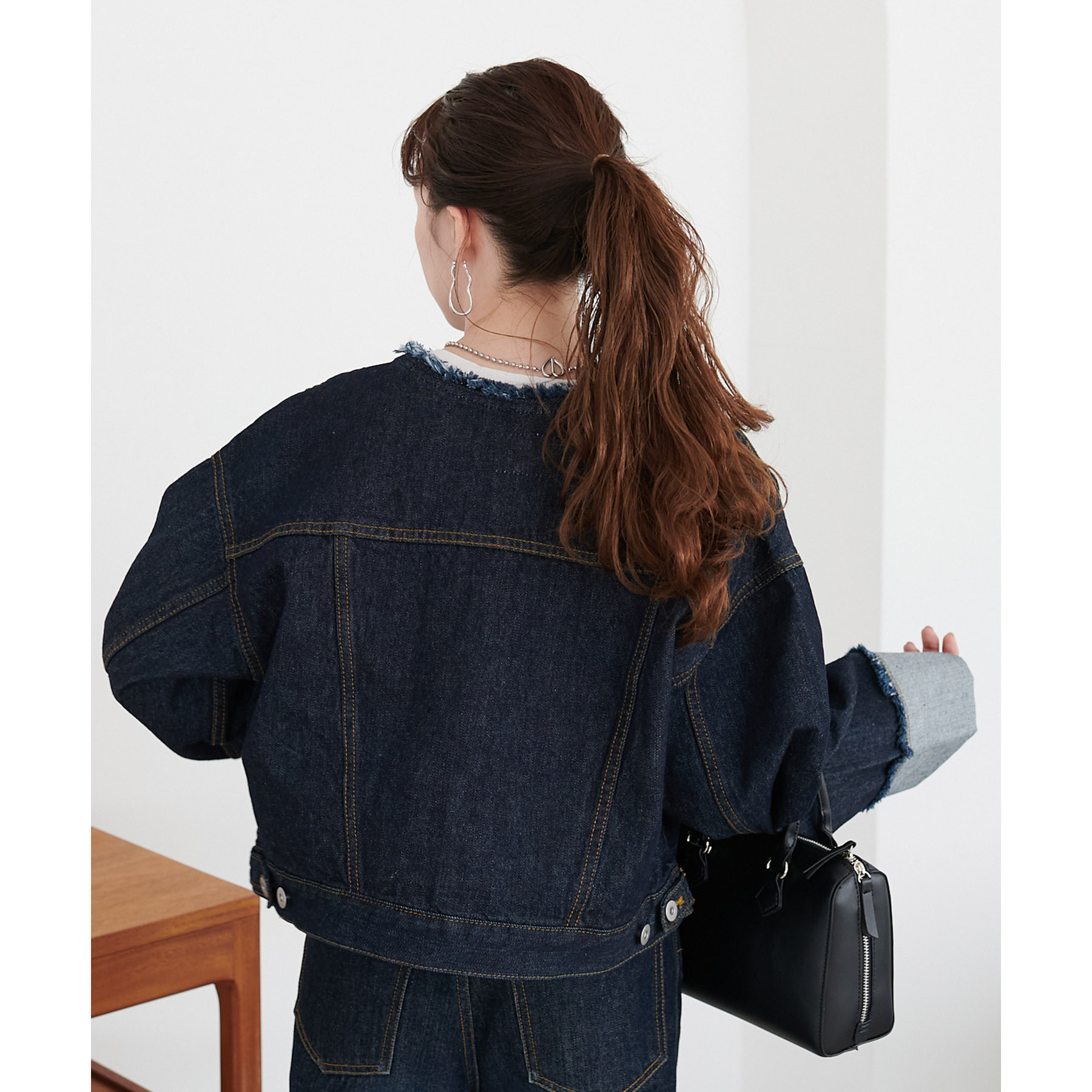 程よくゆとりのある身幅でありながら、クロップド丈でメリハリのあるデニムジャケット。手元はトレンドのロールアップデザインで、ワンランクおしゃれ見えを叶えてくれます!首元にはフリンジが施され、華やかな印象に○さらにノーカラーなデザインなので、インナーのネックデザインも選ばず着回しを楽しめるアイテムです!裾に施されたボタンでサイズ感を調整でき、シルエットの変化も楽しめます♪