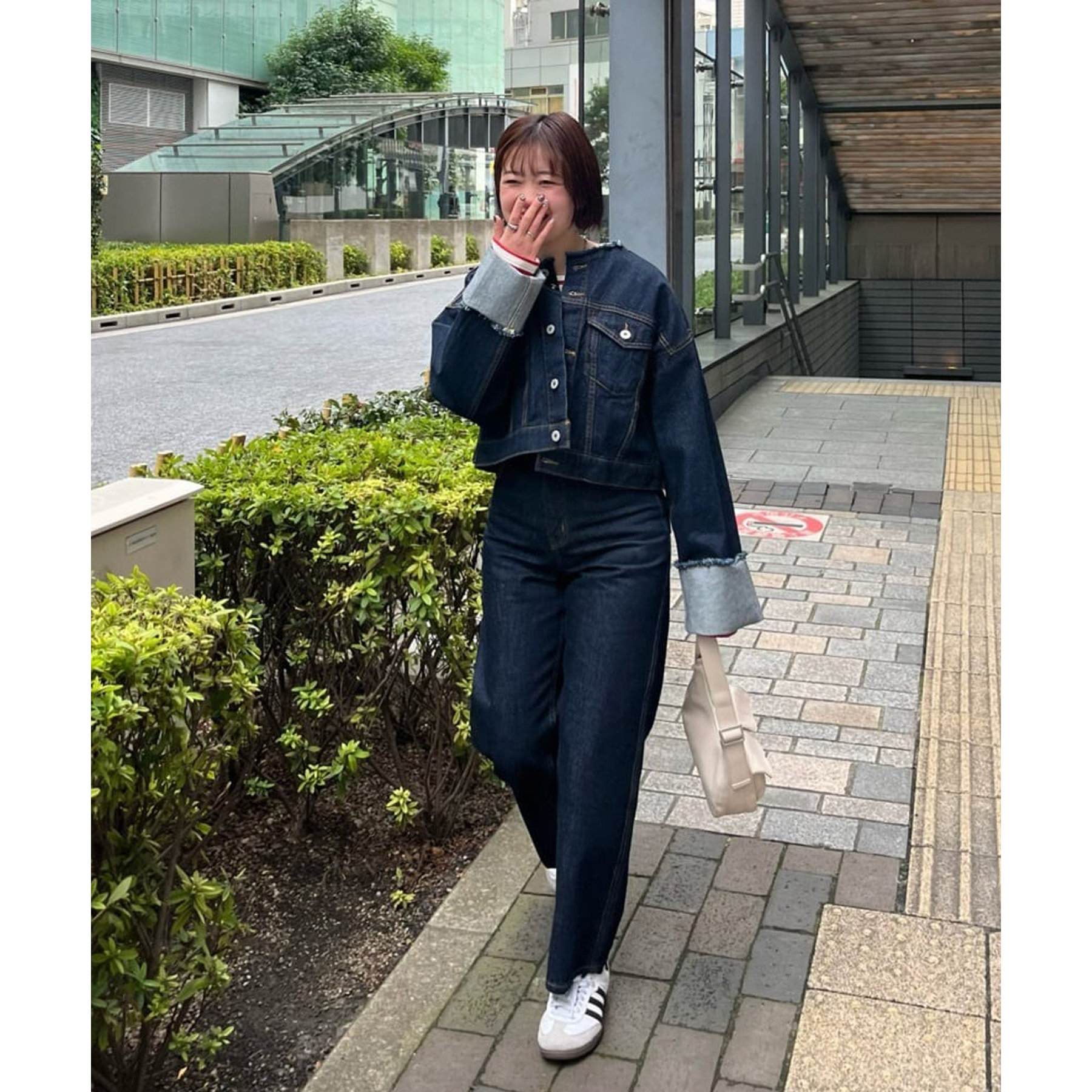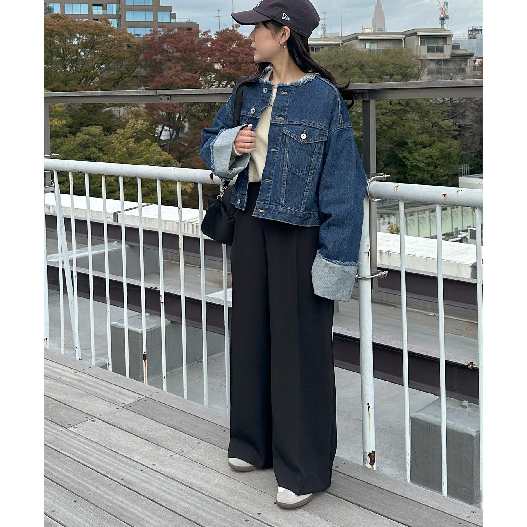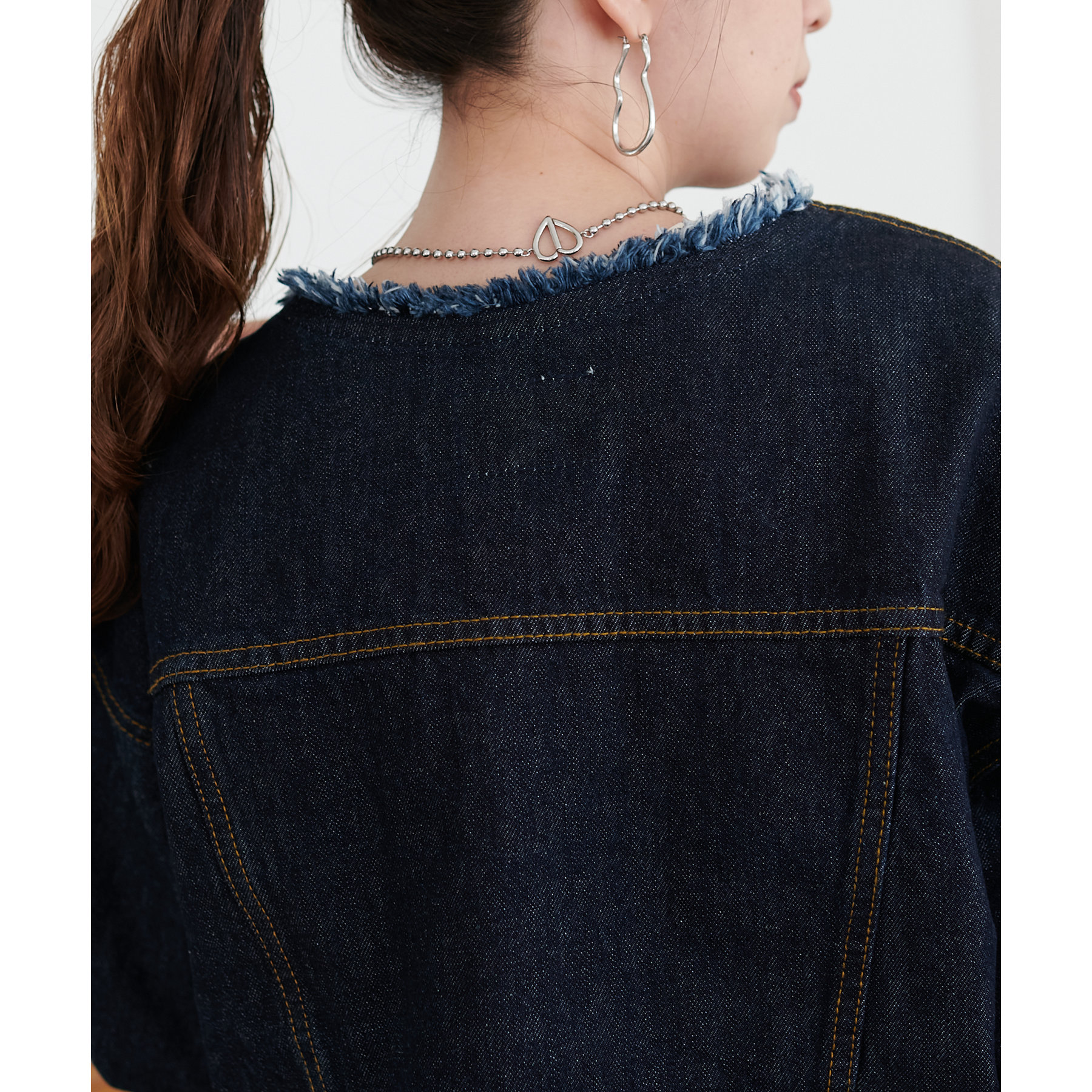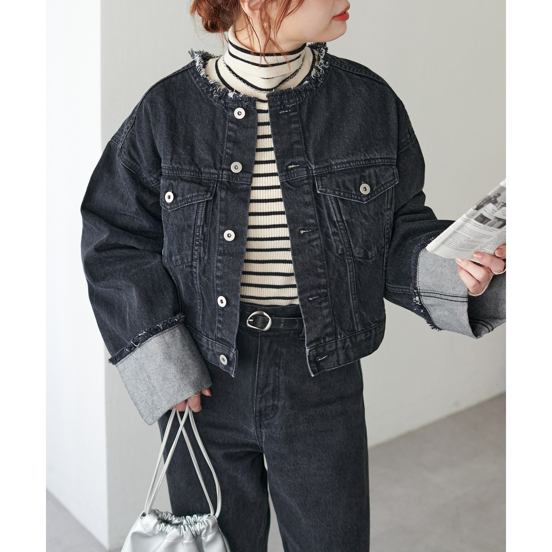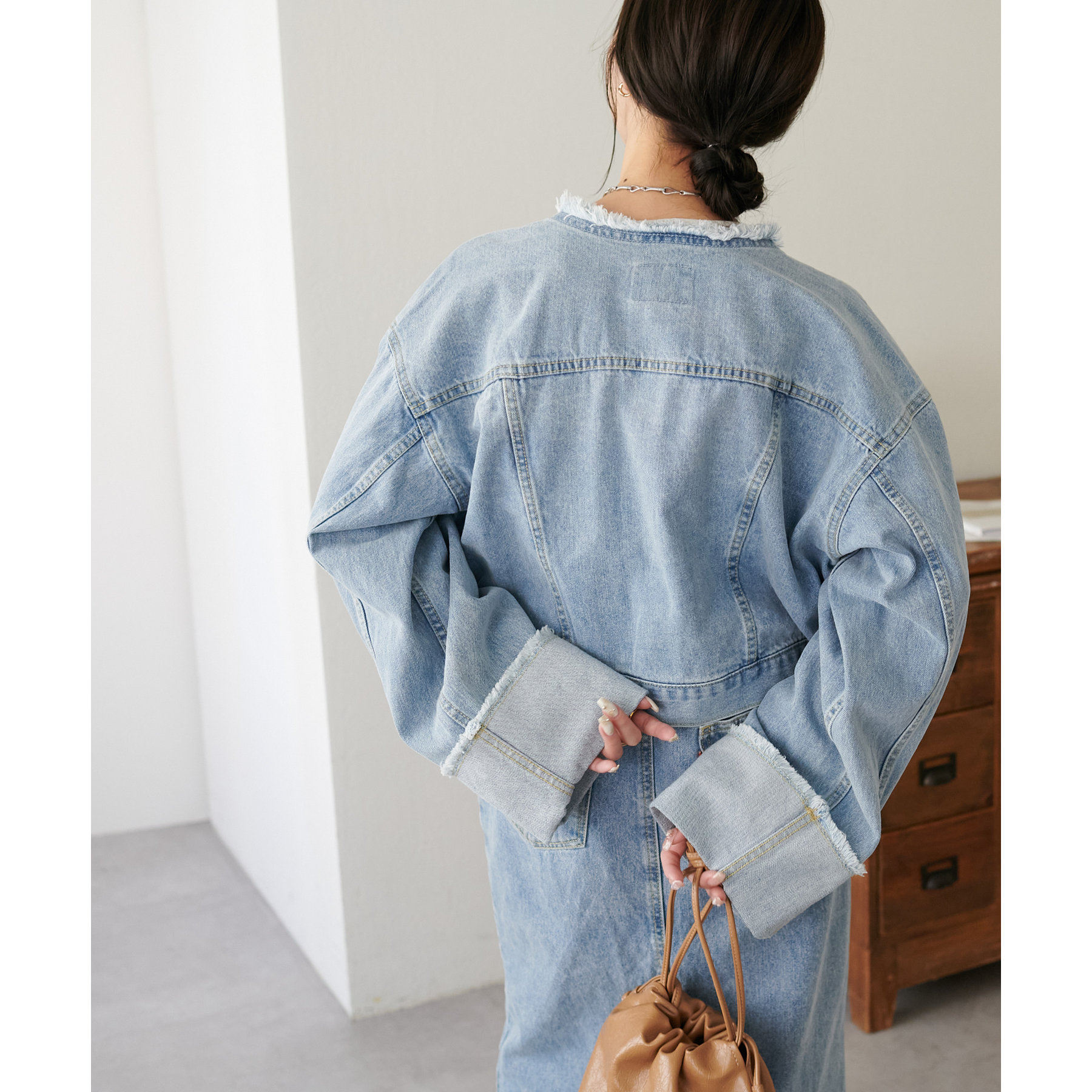 程よくゆとりのある身幅でありながら、クロップド丈でメリハリのあるデニムジャケット。手元はトレンドのロールアップデザインで、ワンランクおしゃれ見えを叶えてくれます!首元にはフリンジが施され、華やかな印象に○さらにノーカラーなデザインなので、インナーのネックデザインも選ばず着回しを楽しめるアイテムです!裾に施されたボタンでサイズ感を調整でき、シルエットの変化も楽しめます♪