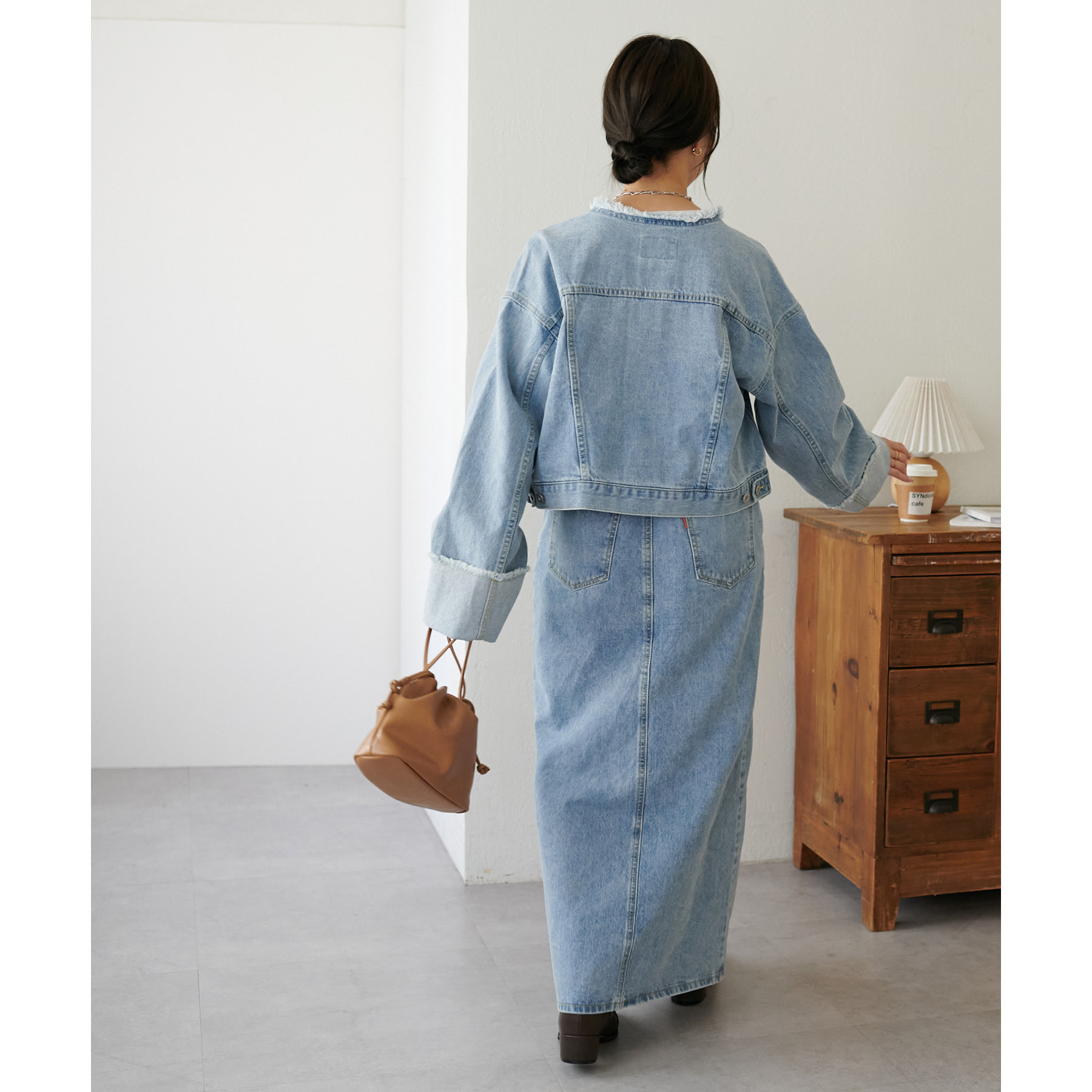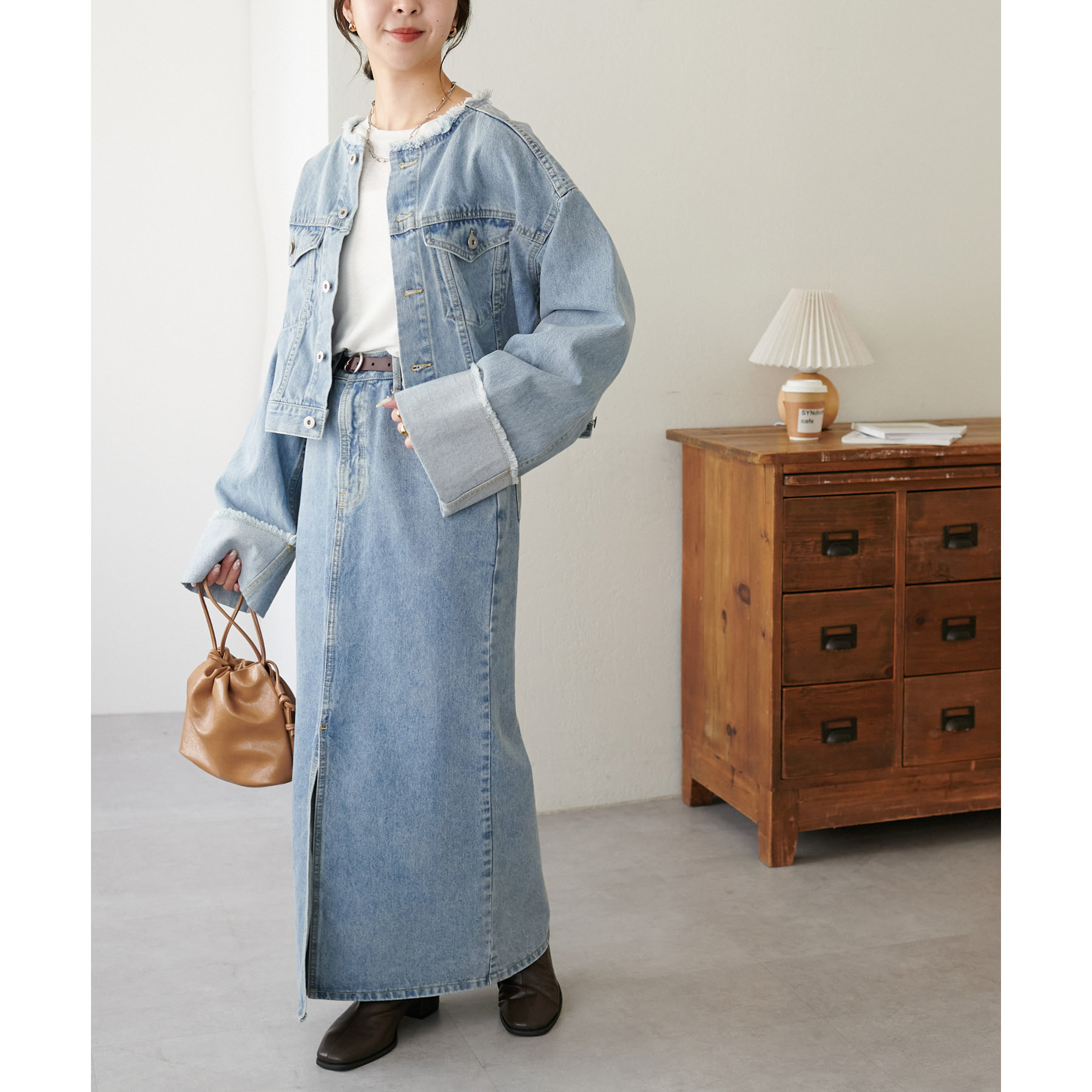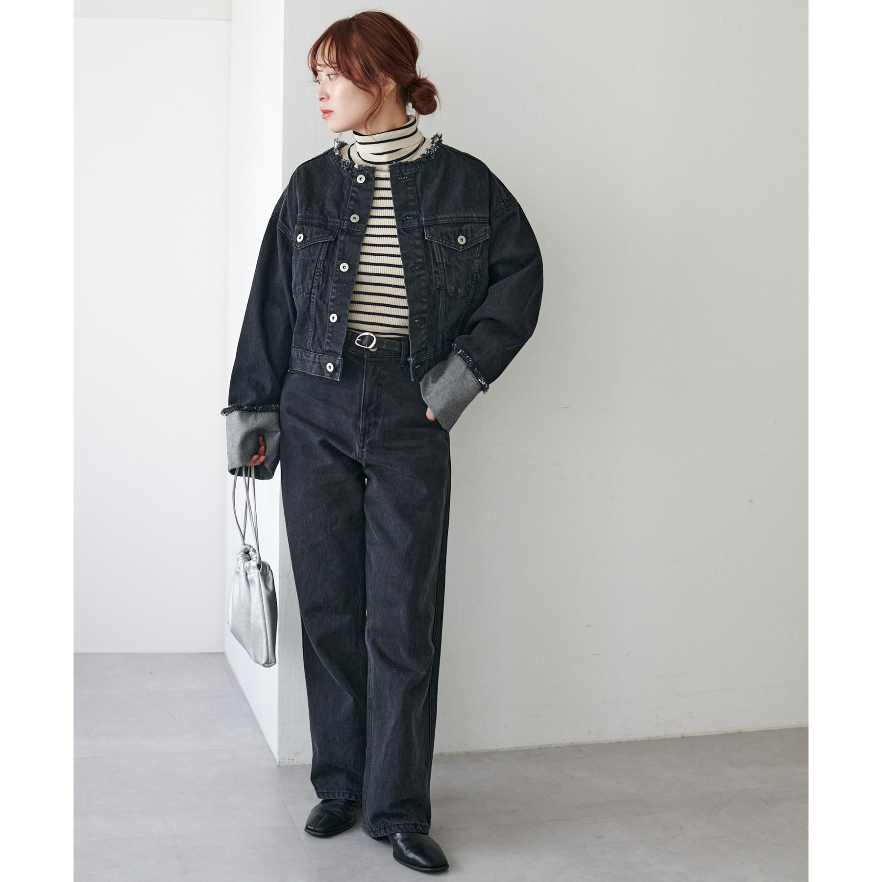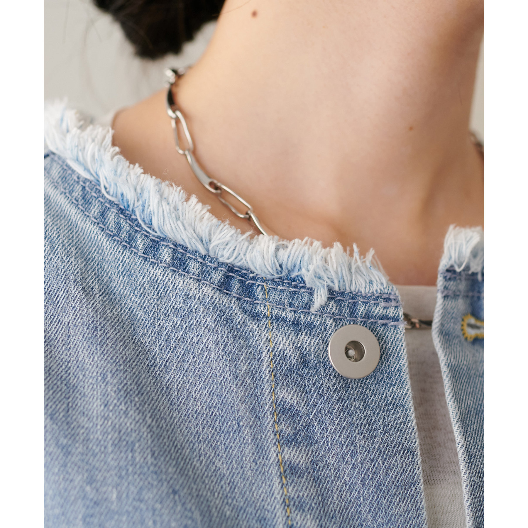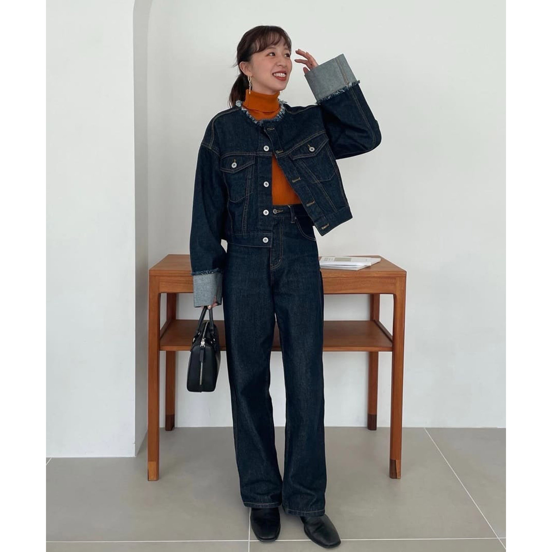 程よくゆとりのある身幅でありながら、クロップド丈でメリハリのあるデニムジャケット。手元はトレンドのロールアップデザインで、ワンランクおしゃれ見えを叶えてくれます!首元にはフリンジが施され、華やかな印象に○さらにノーカラーなデザインなので、インナーのネックデザインも選ばず着回しを楽しめるアイテムです!裾に施されたボタンでサイズ感を調整でき、シルエットの変化も楽しめます♪
