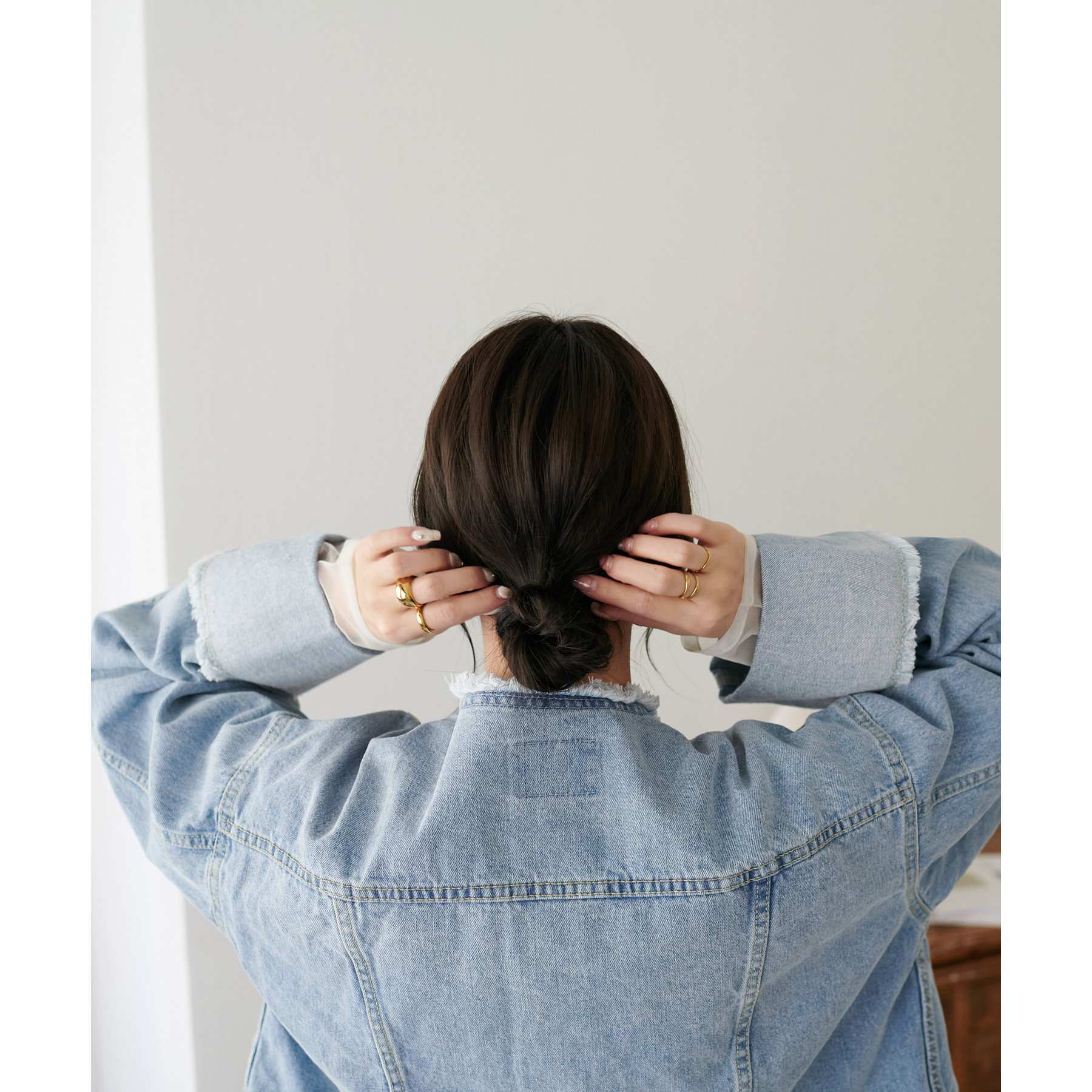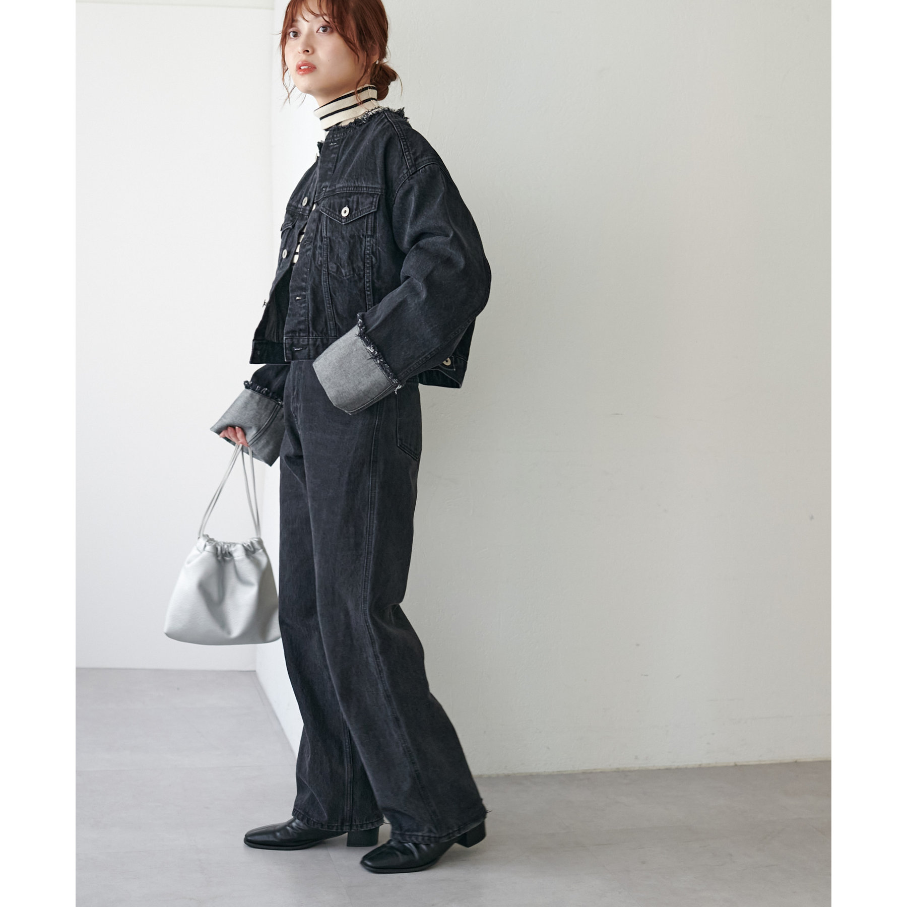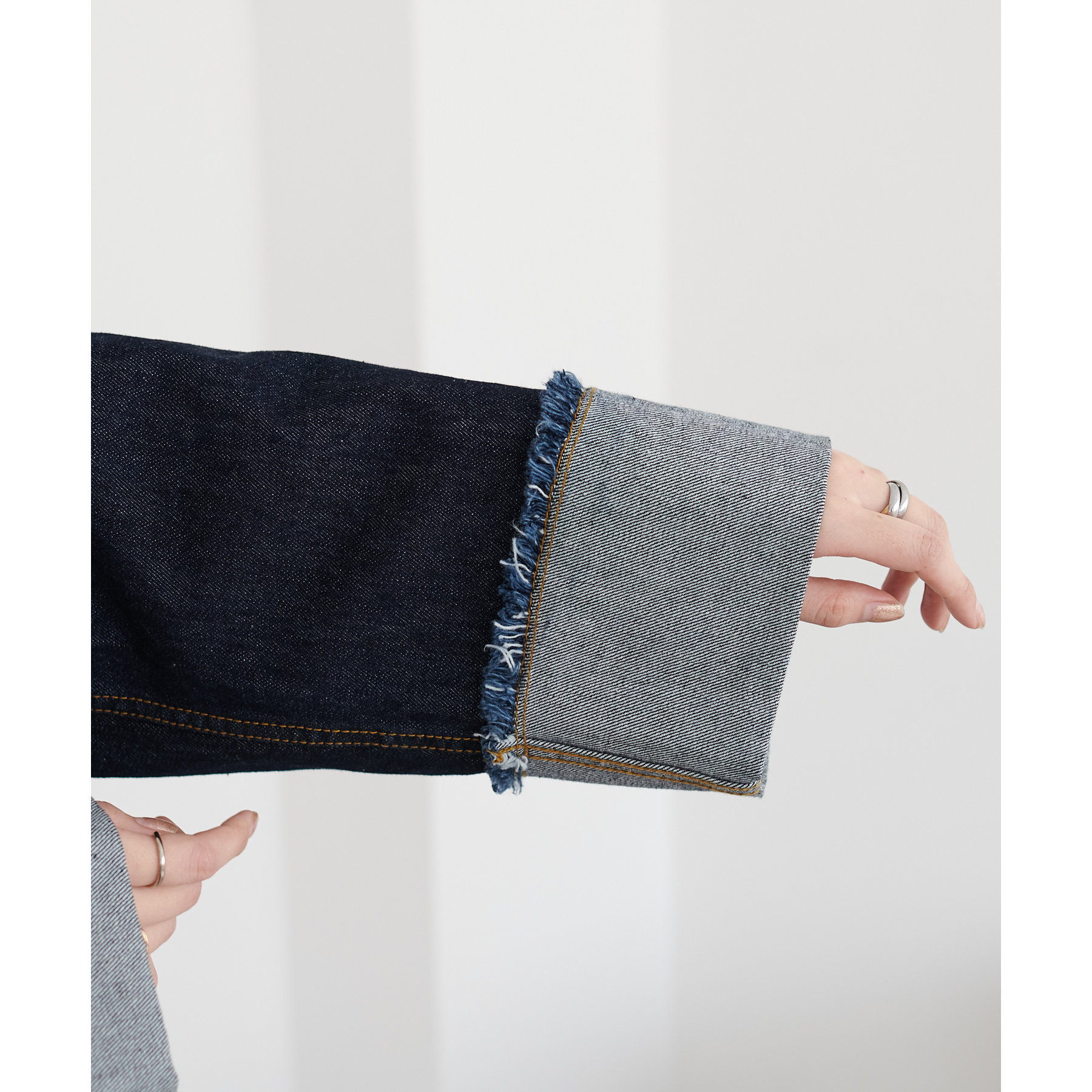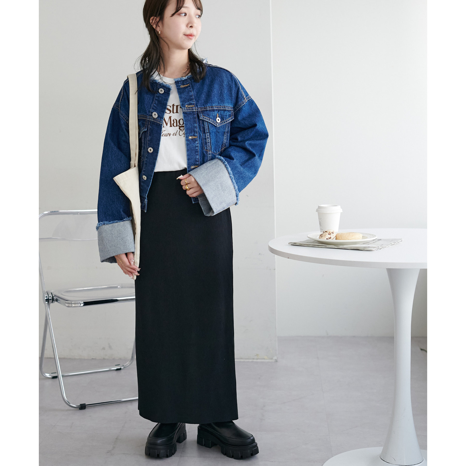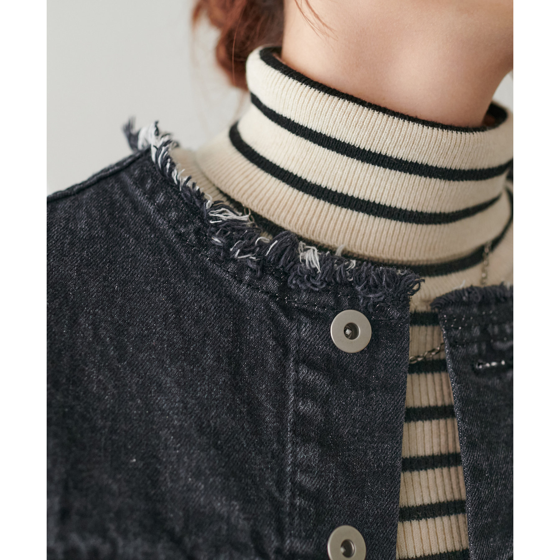 程よくゆとりのある身幅でありながら、クロップド丈でメリハリのあるデニムジャケット。手元はトレンドのロールアップデザインで、ワンランクおしゃれ見えを叶えてくれます!首元にはフリンジが施され、華やかな印象に○さらにノーカラーなデザインなので、インナーのネックデザインも選ばず着回しを楽しめるアイテムです!裾に施されたボタンでサイズ感を調整でき、シルエットの変化も楽しめます♪