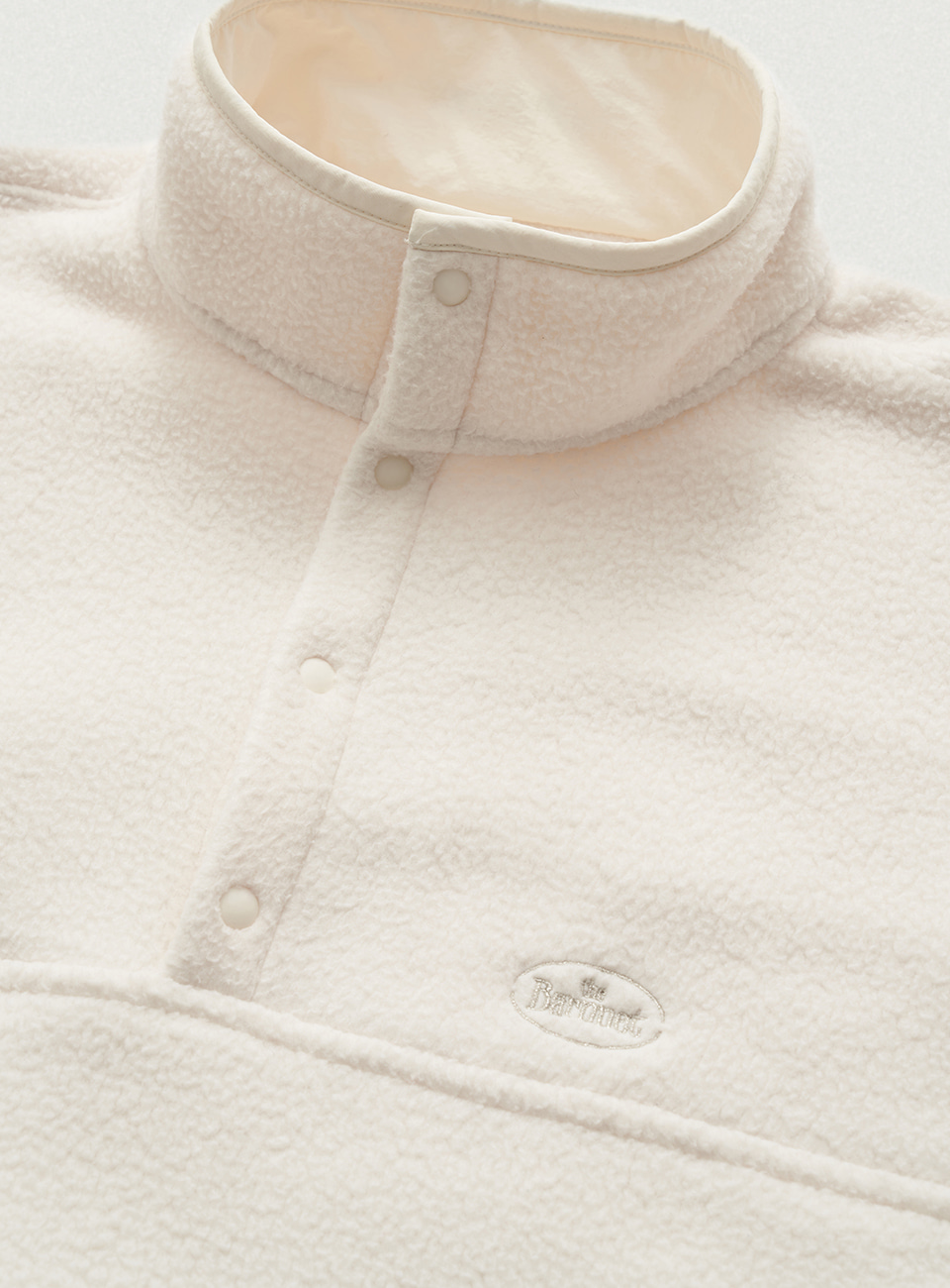 ハイネック仕様に、スナップボタン開閉方式を備えたフリースプルオーバータイプです。