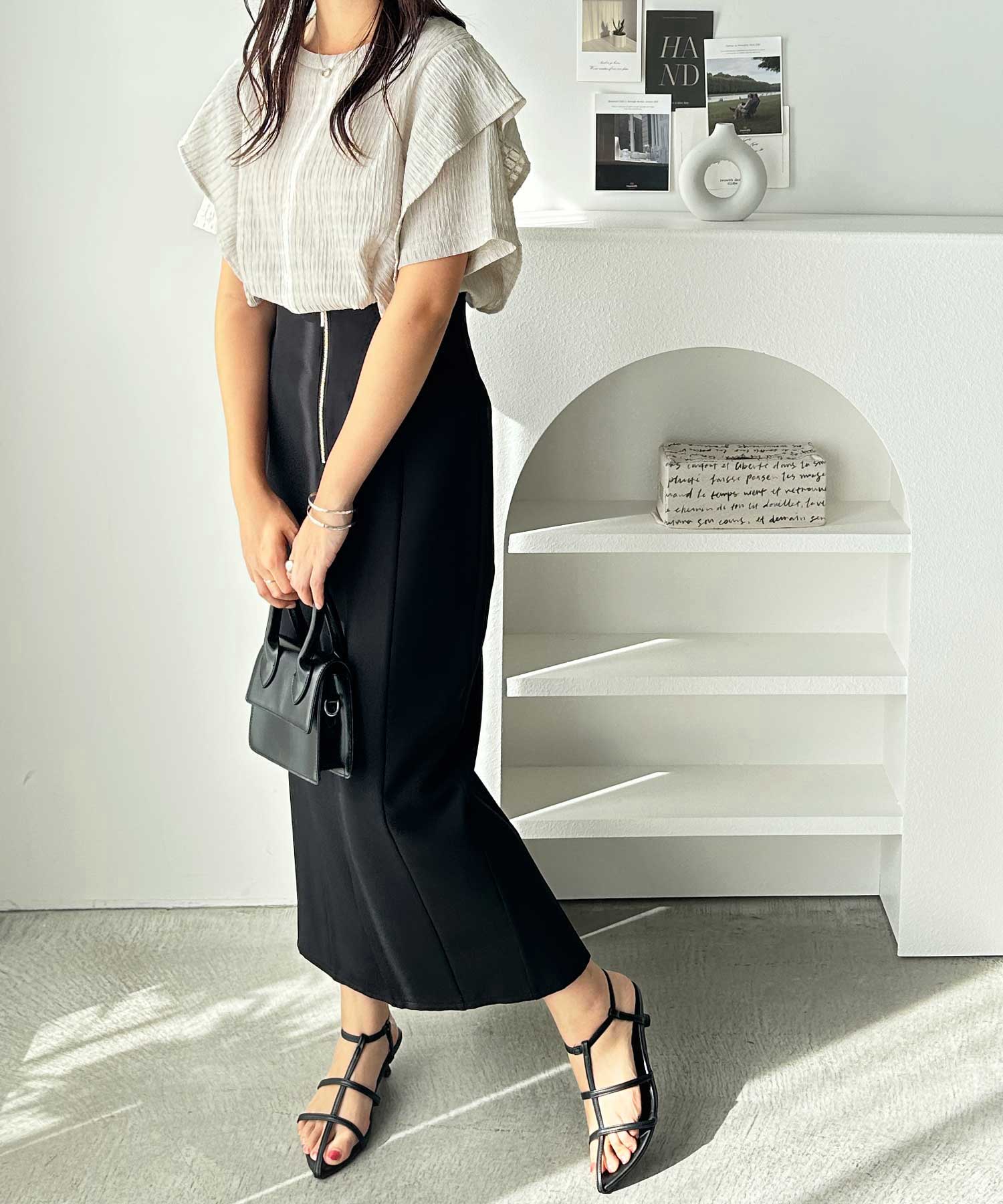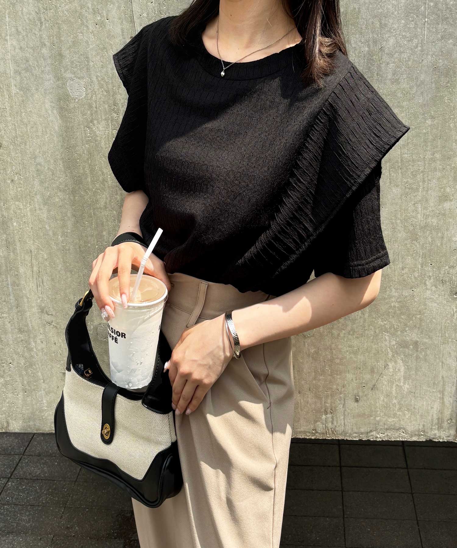 肩のラッフルデザインが華やかな印象のデザイントップス。