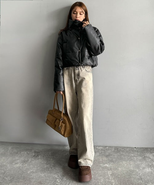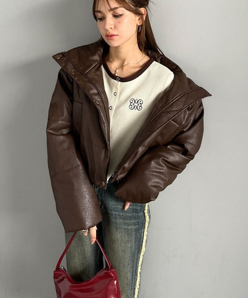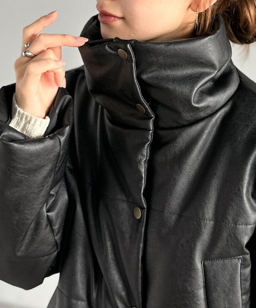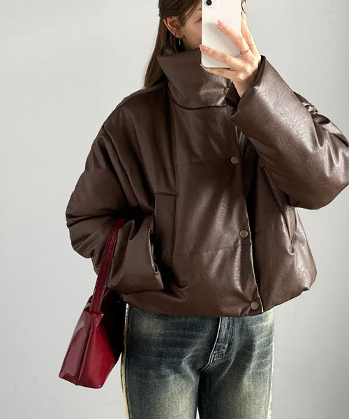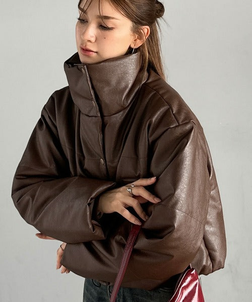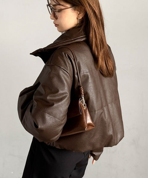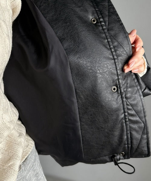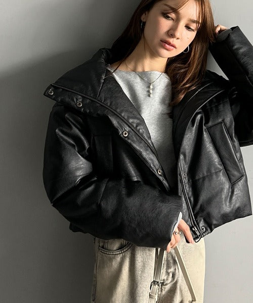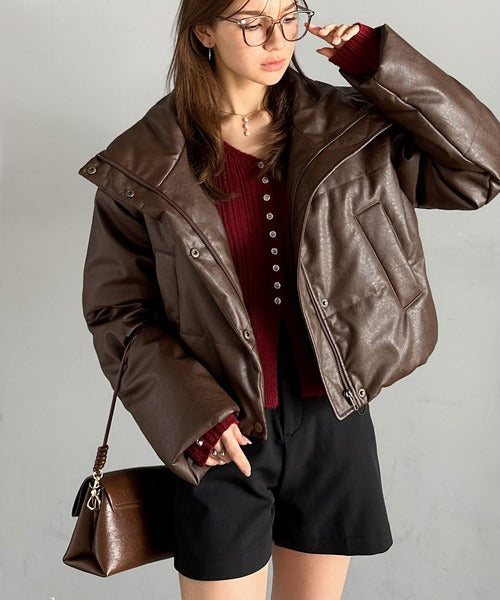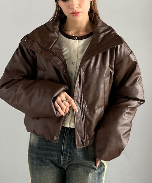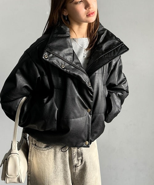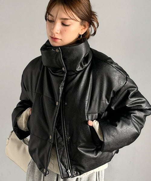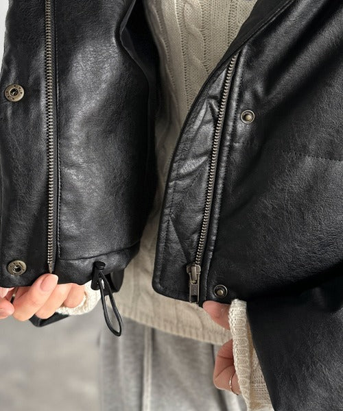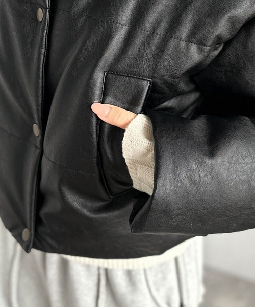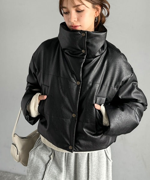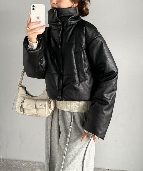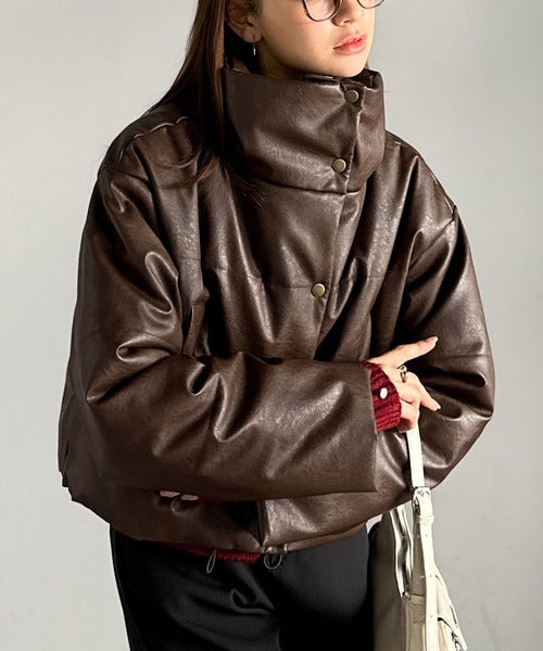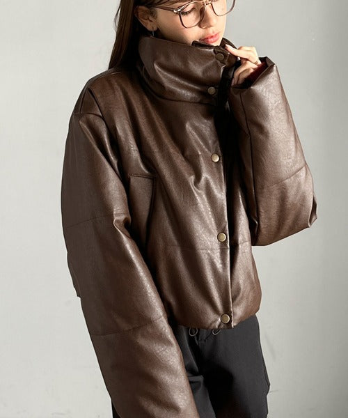 ヴィンテージライクなフェイクレザーのクロップド中綿コート。