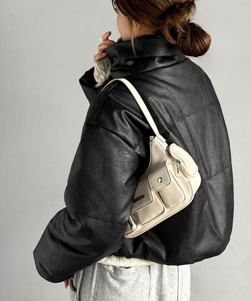 表面感のあるフェイクレザーが特徴で、カジュアルなスタイルに洗練を加えます。