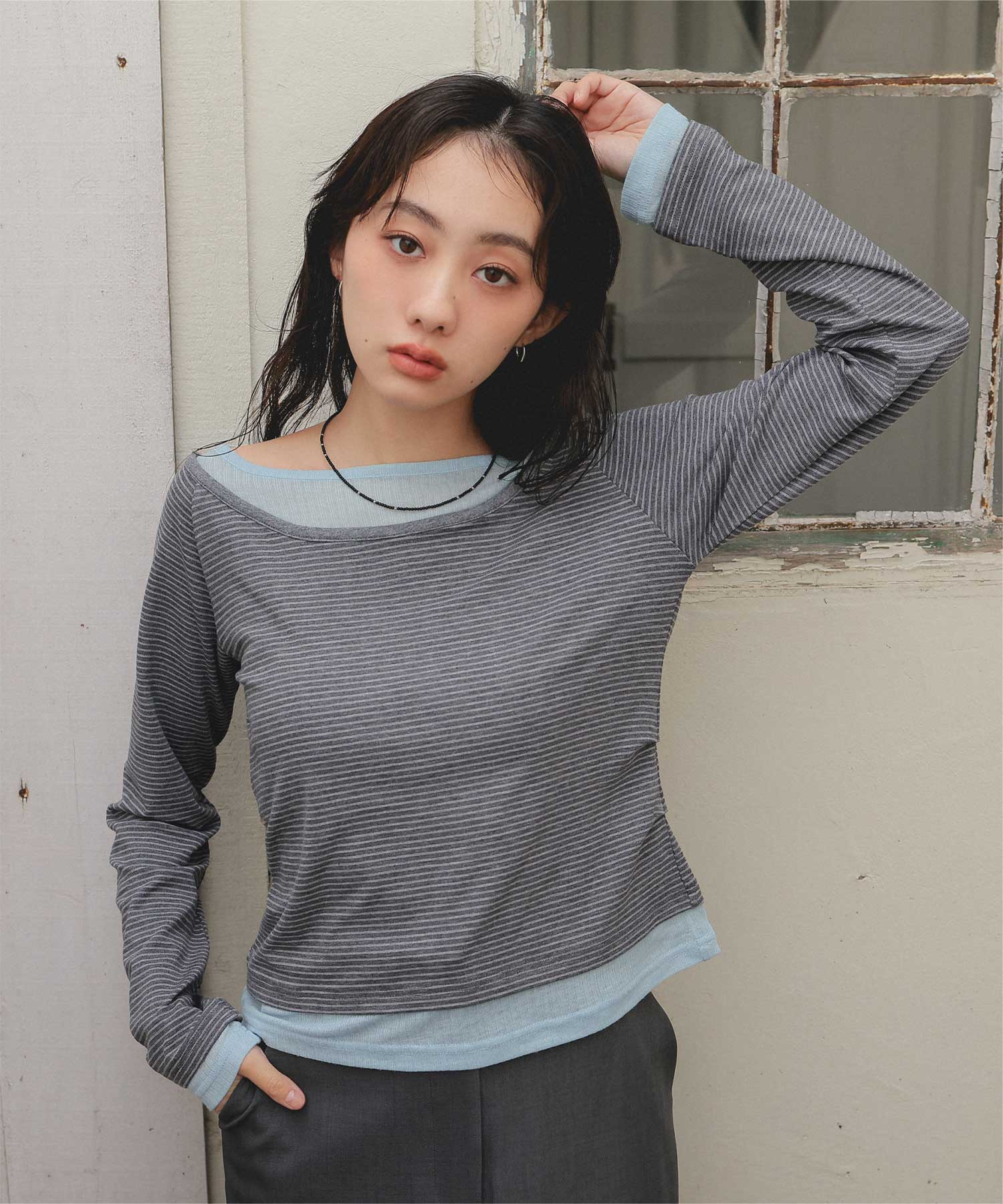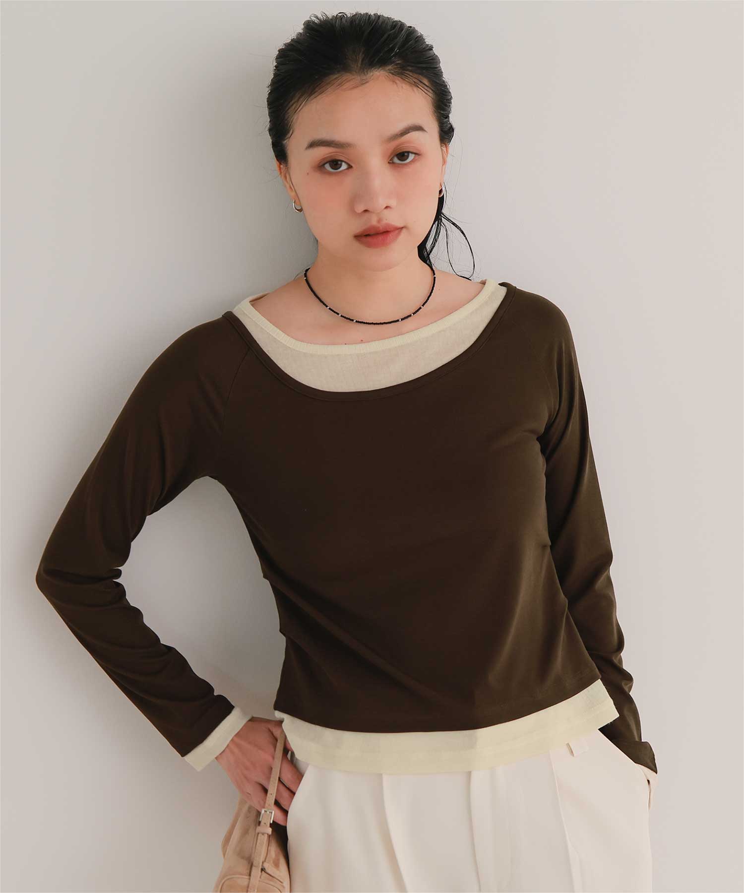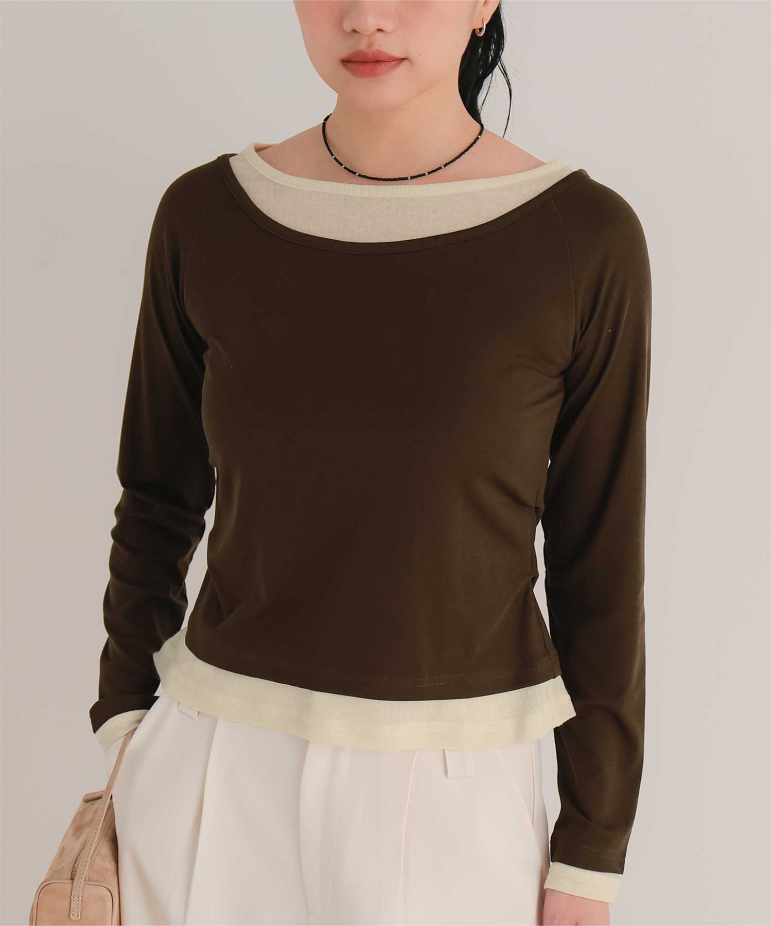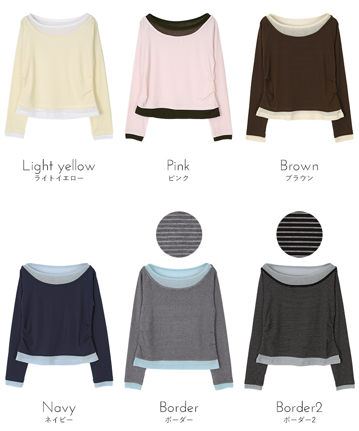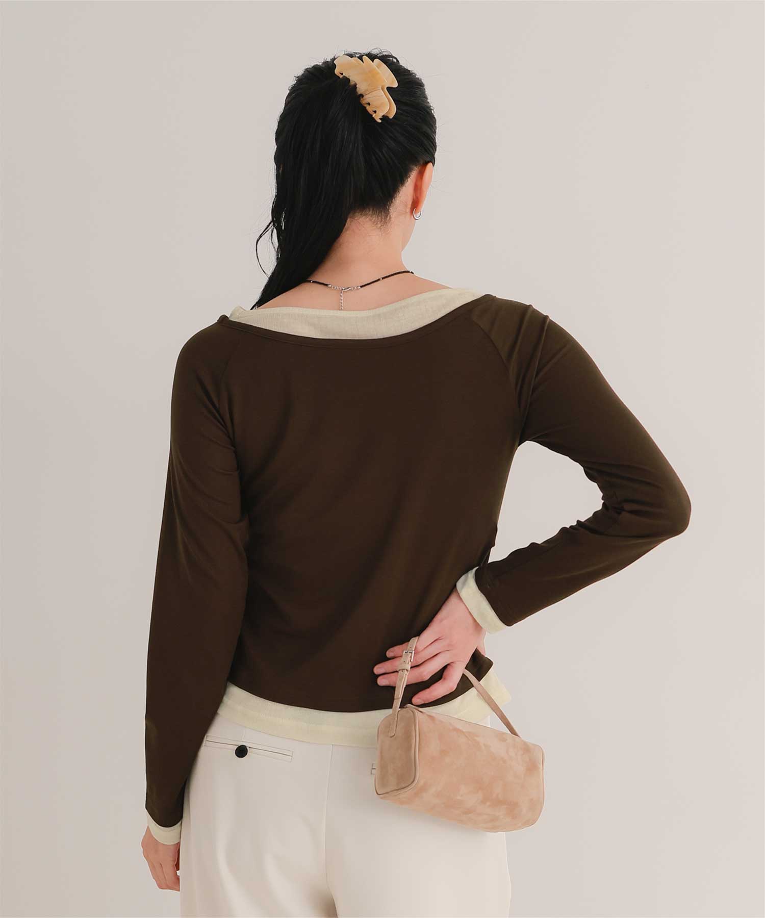 ・重ね着風の配色デザインがポイントで、1枚で決まるレイヤード風トップス