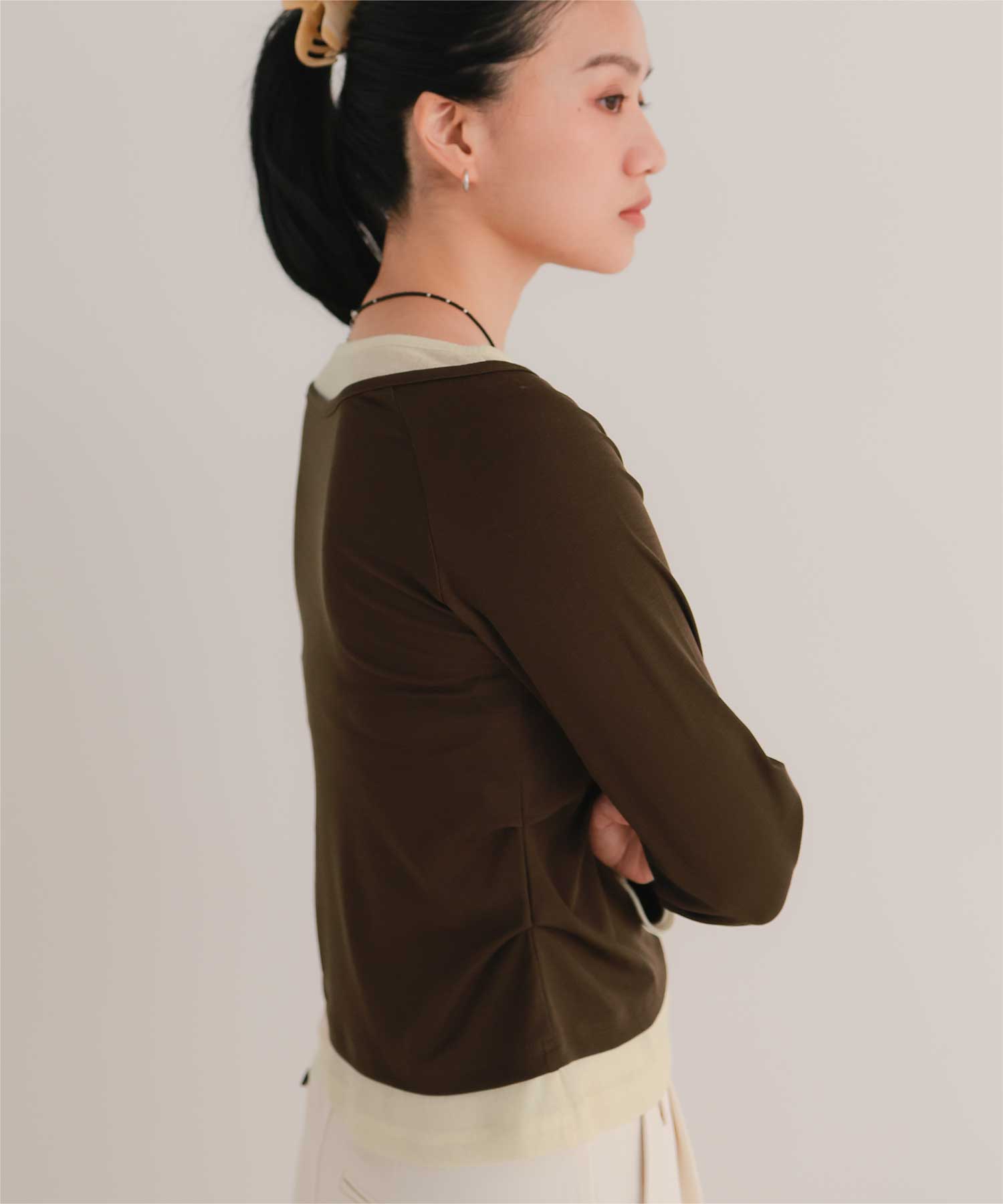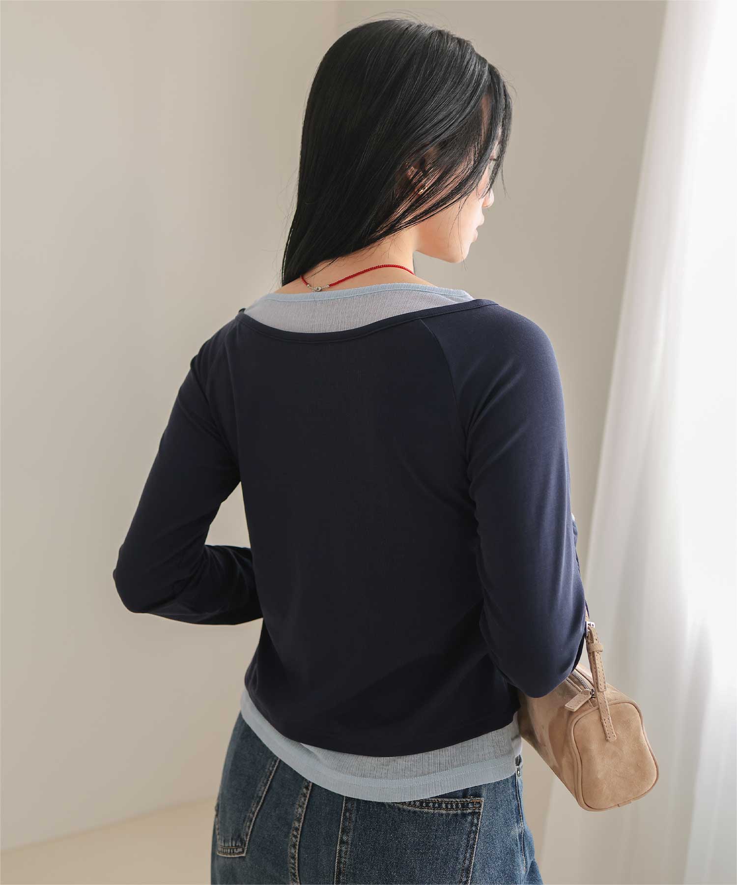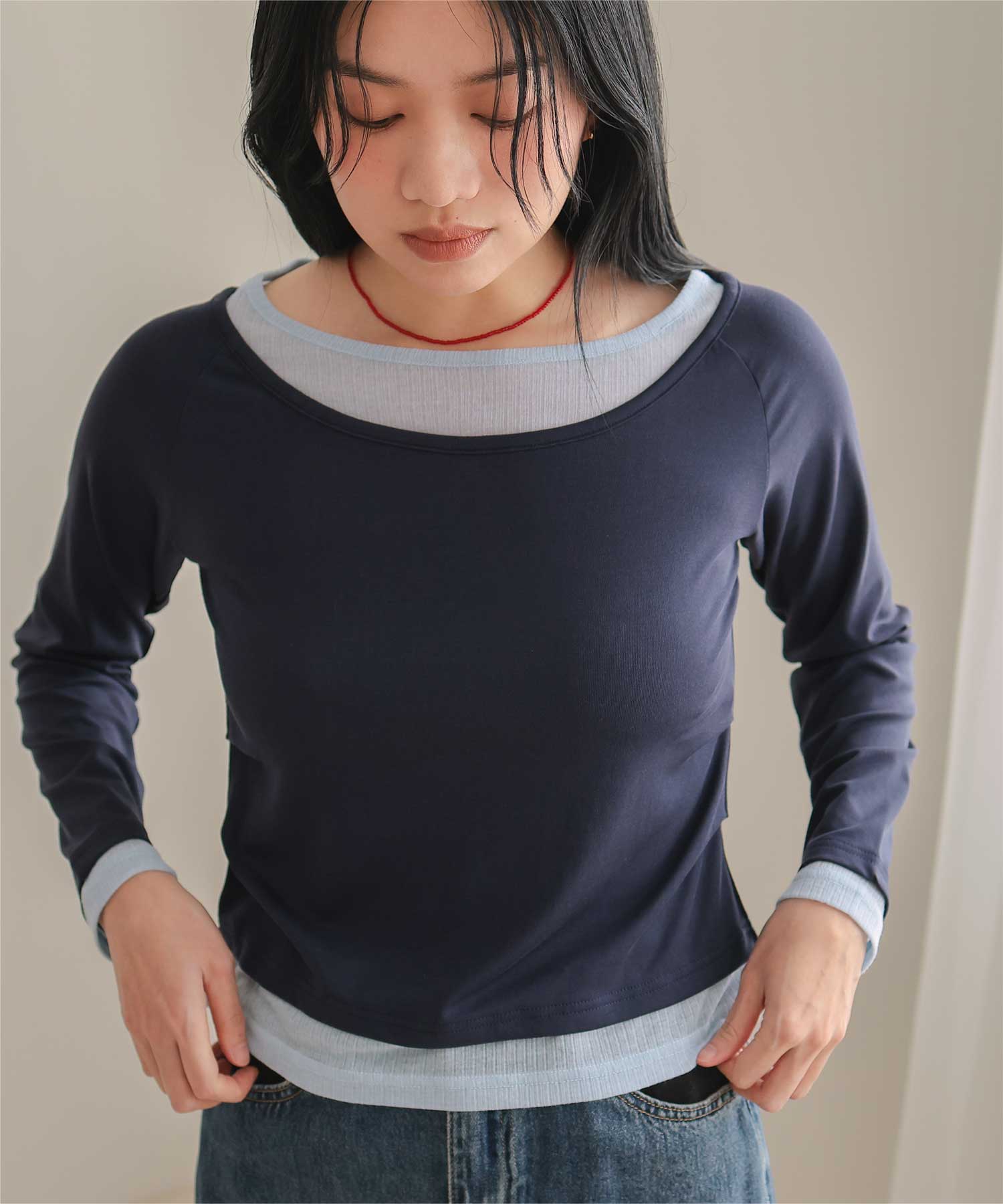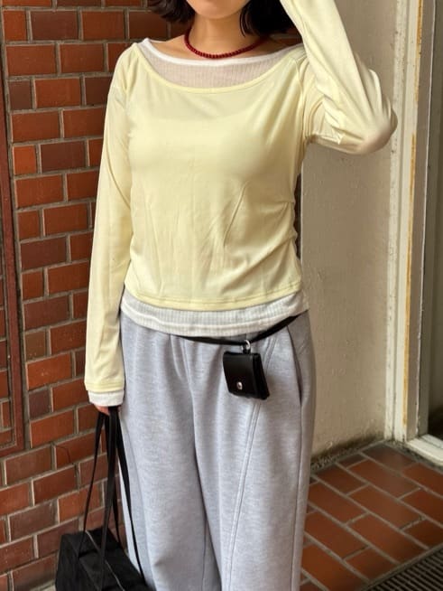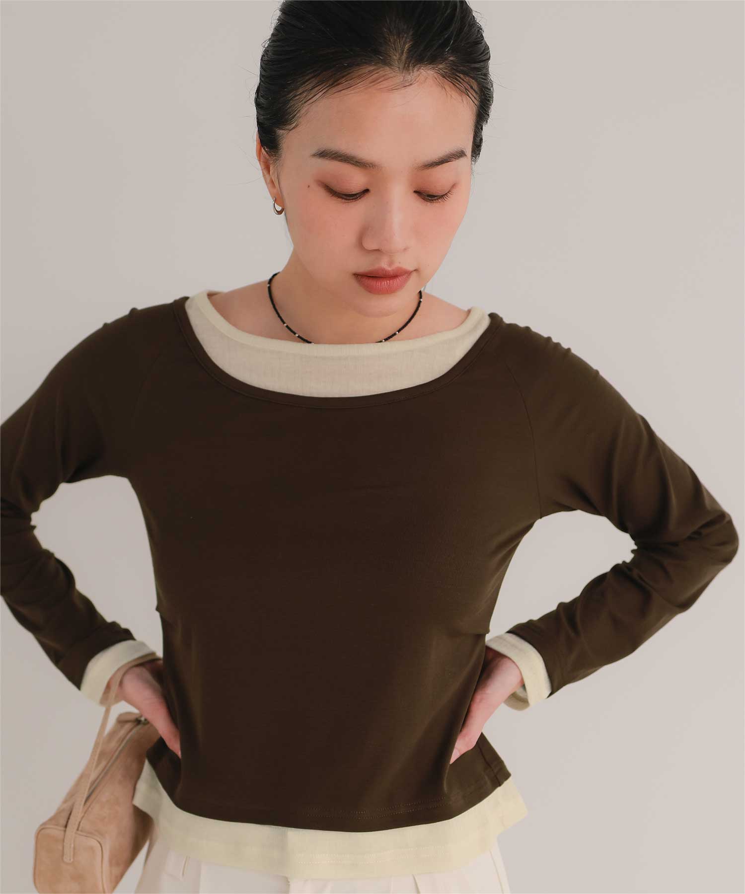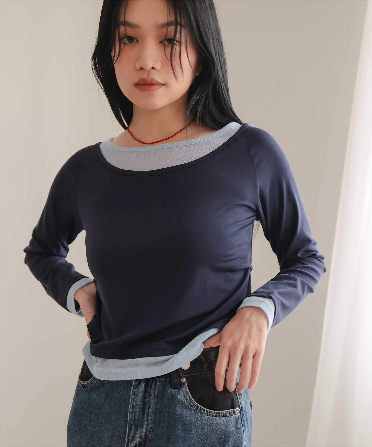 ・重ね着風の配色デザインがポイントで、1枚で決まるレイヤード風トップス