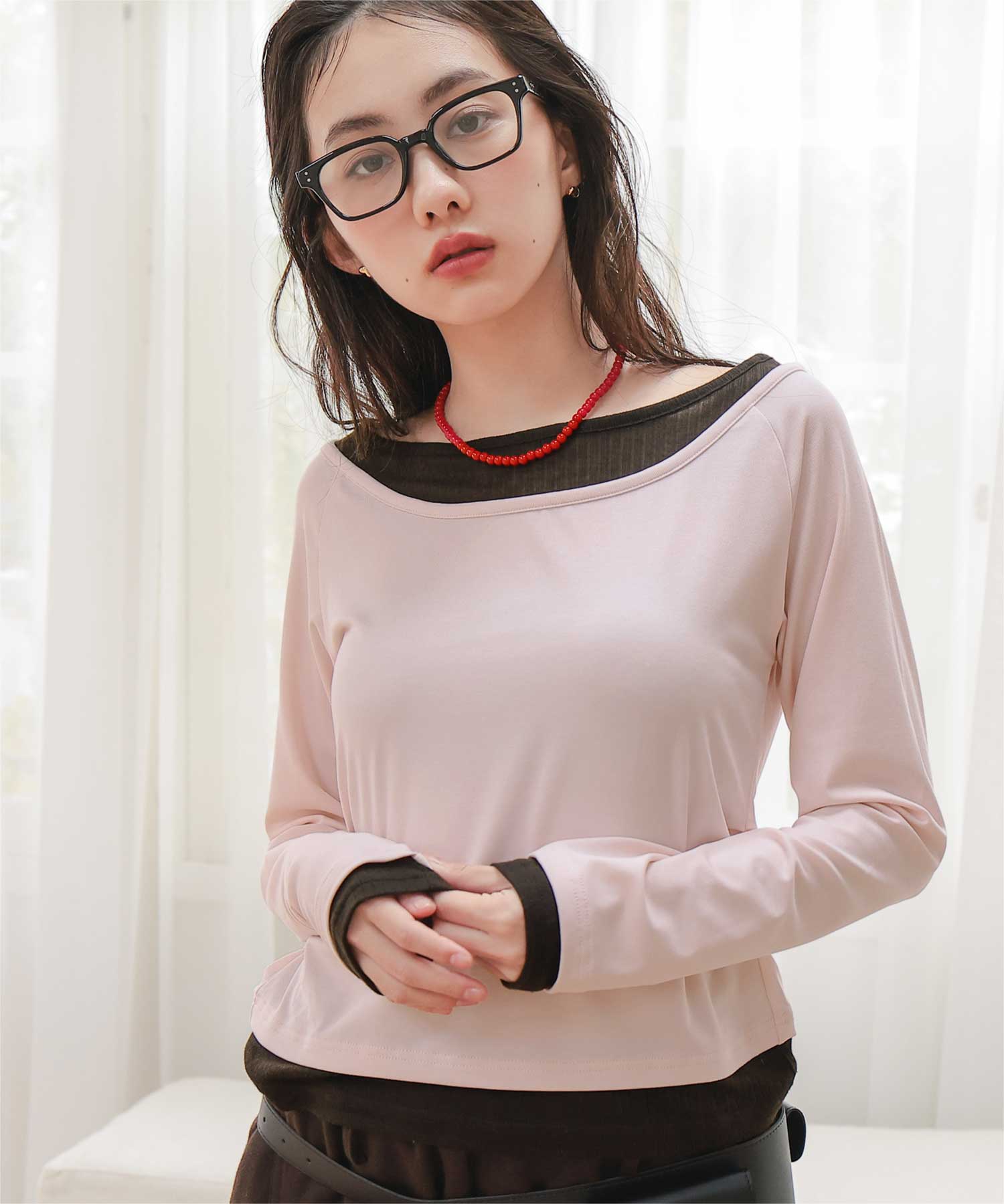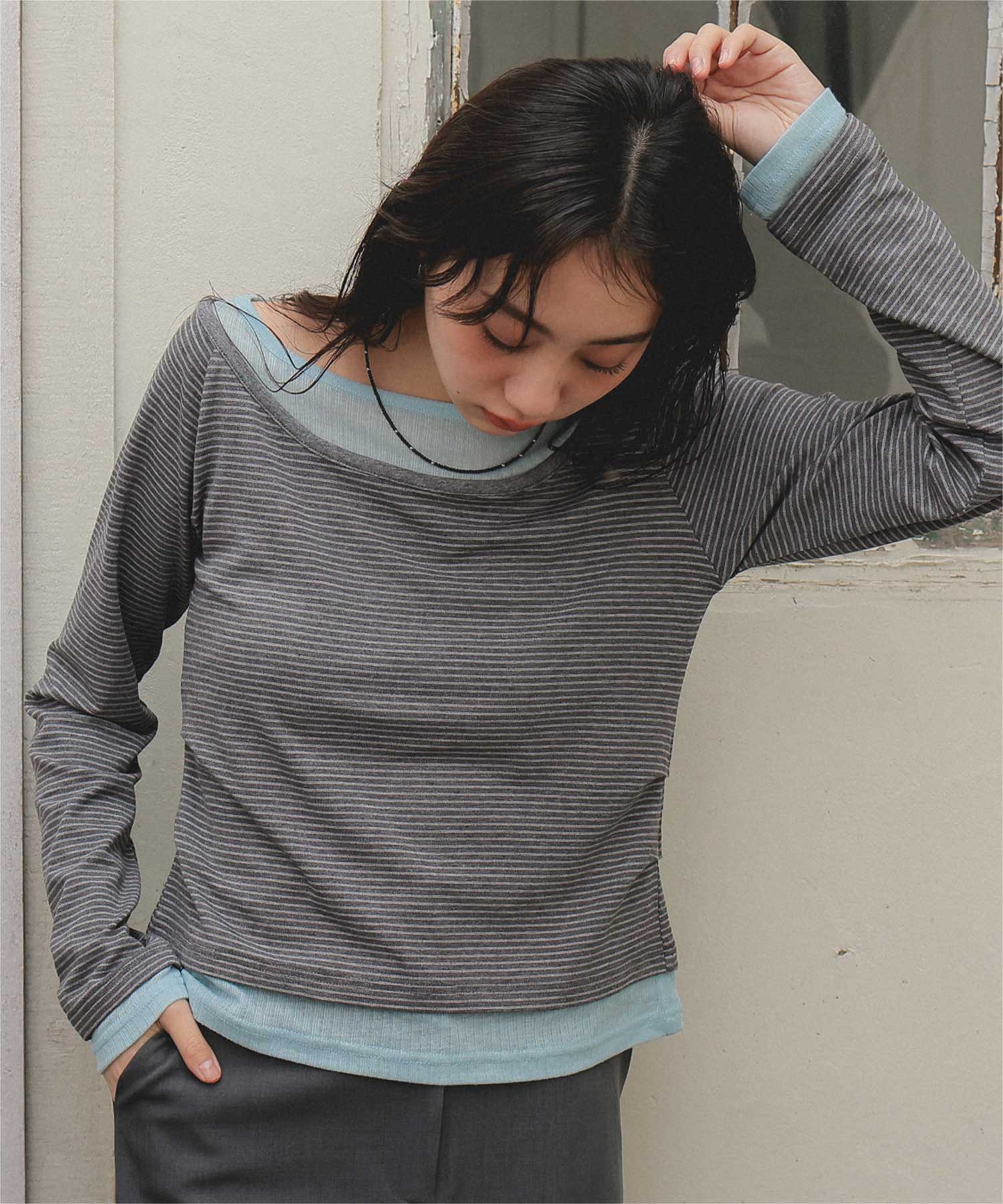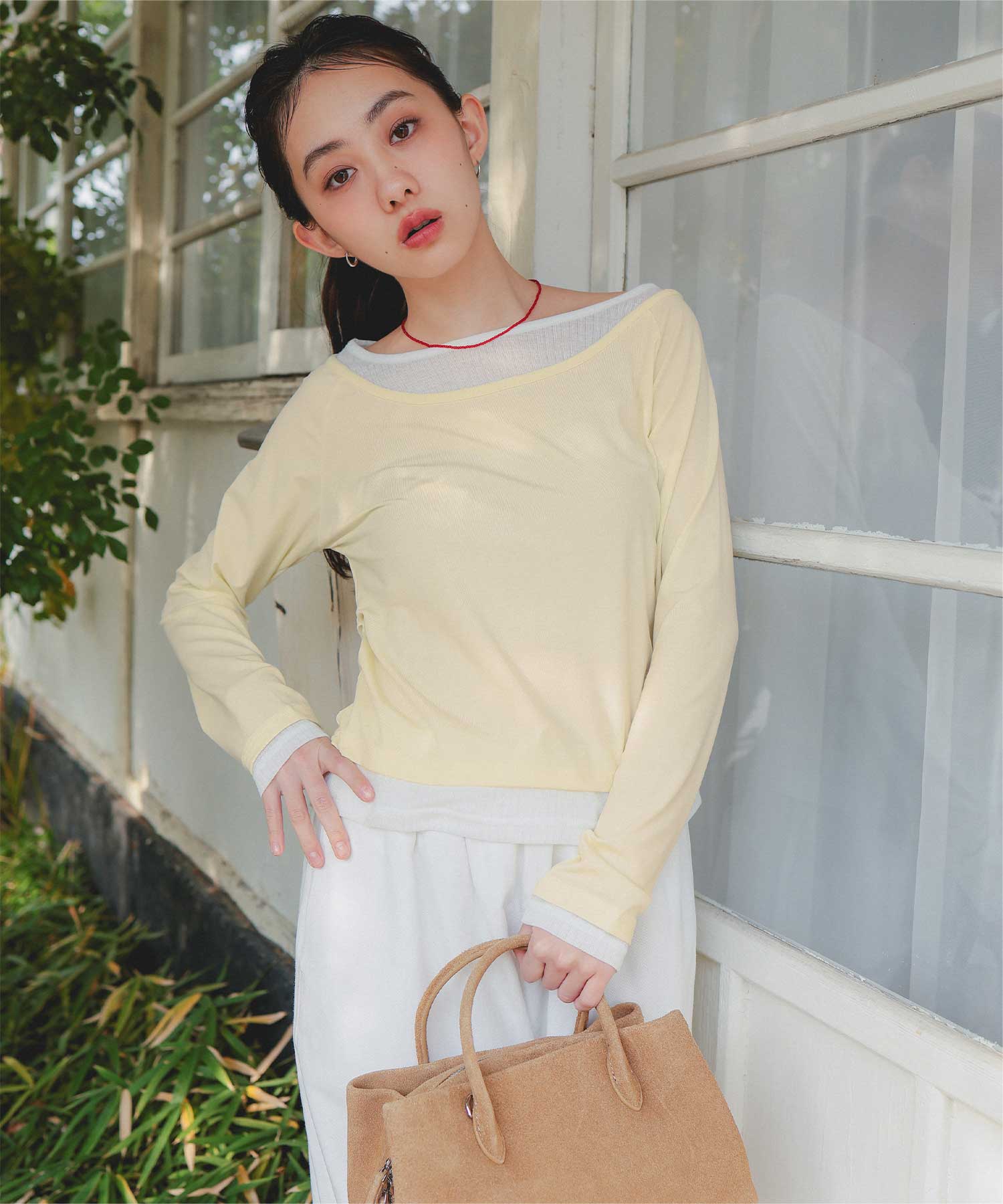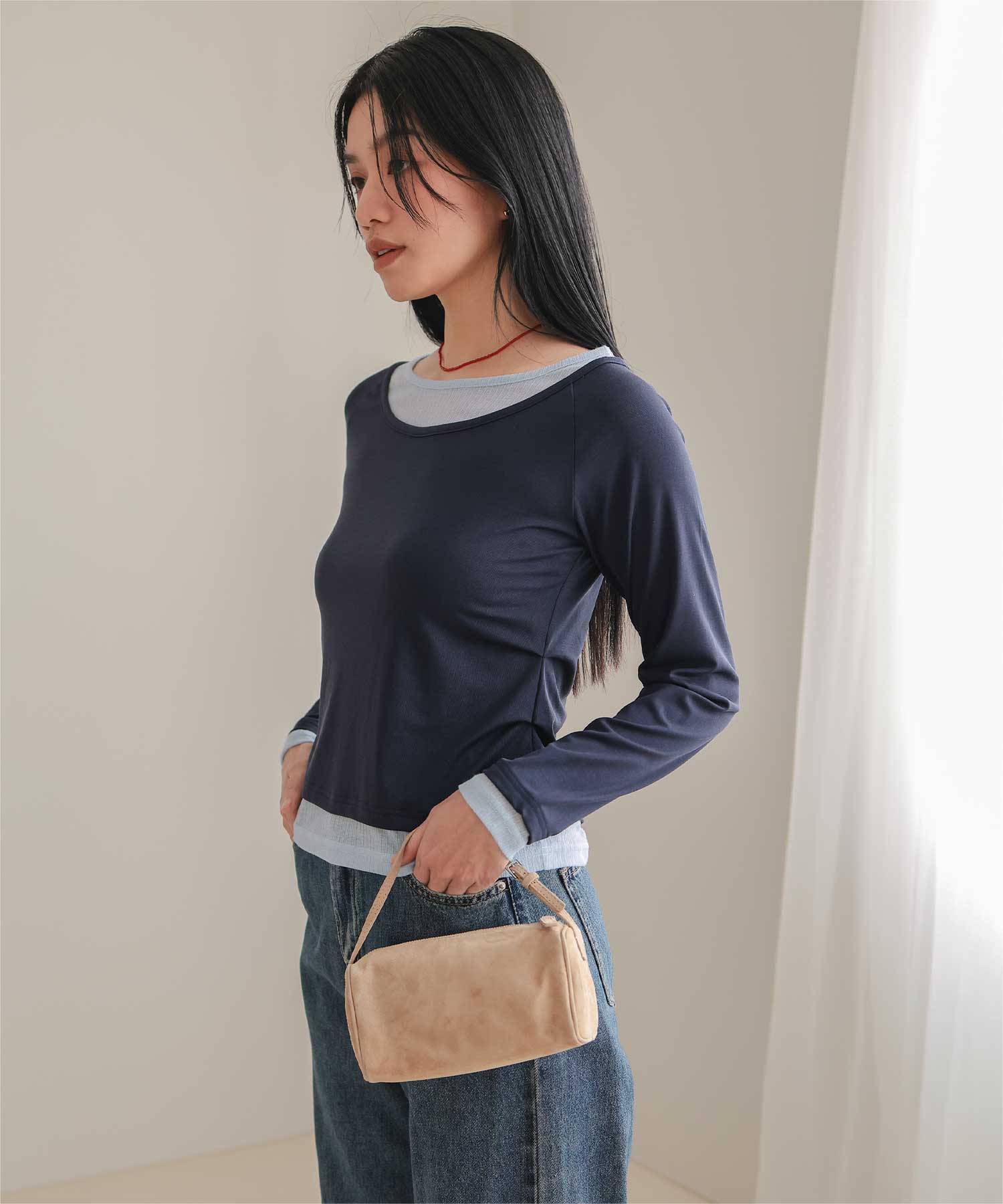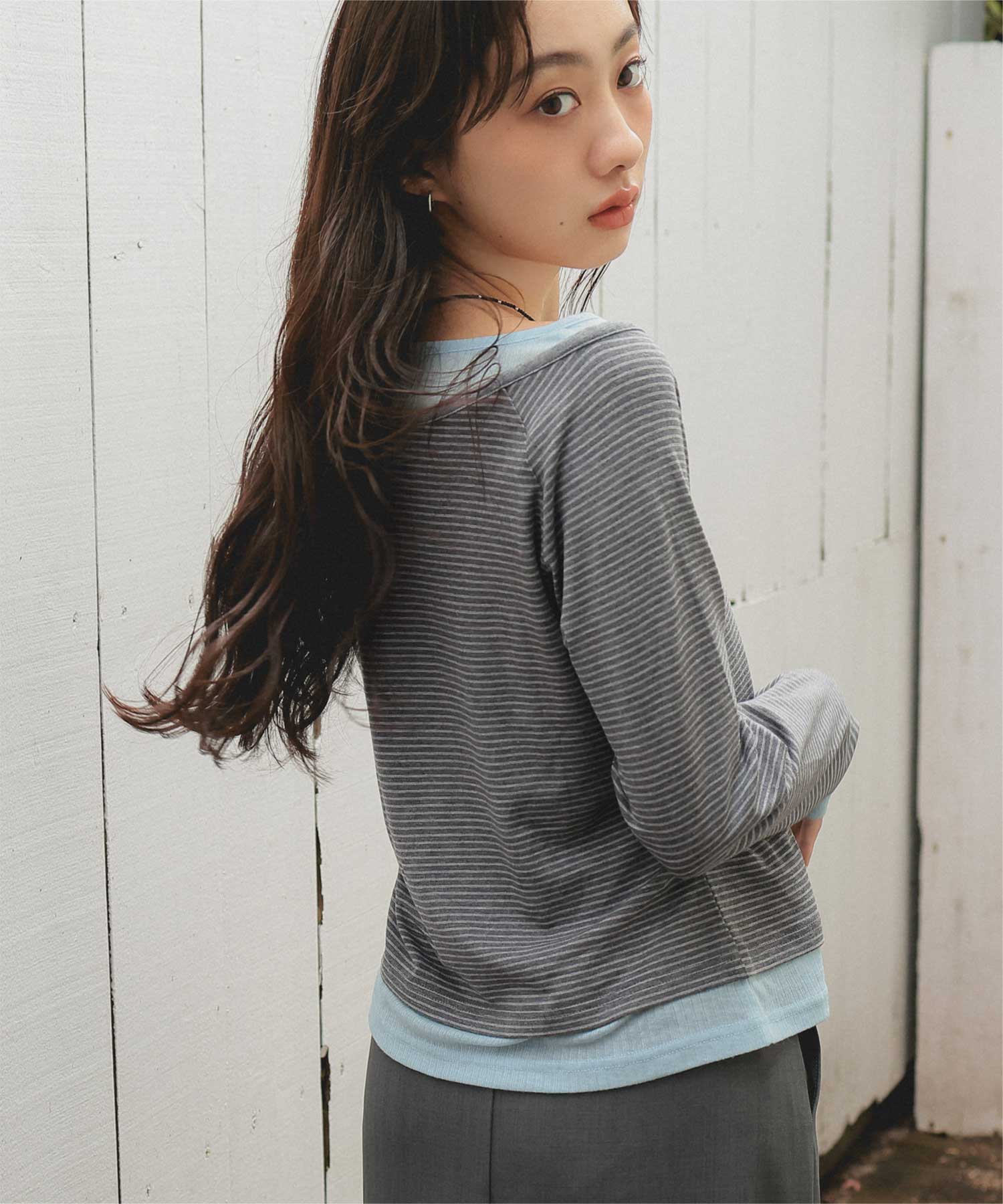 ・重ね着風の配色デザインがポイントで、1枚で決まるレイヤード風トップス