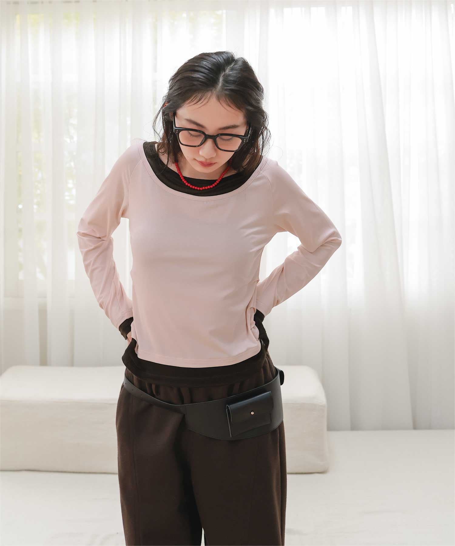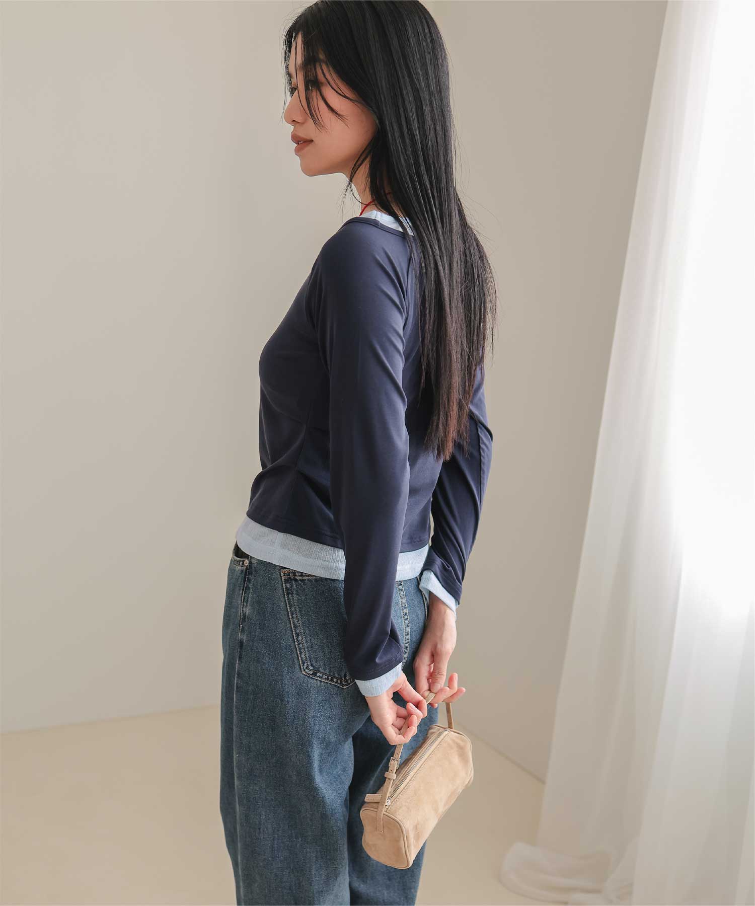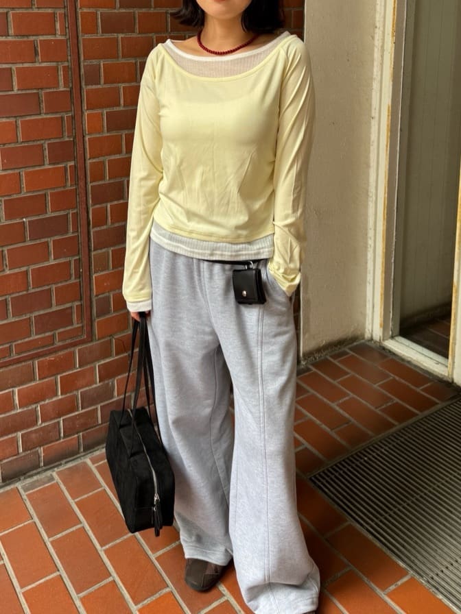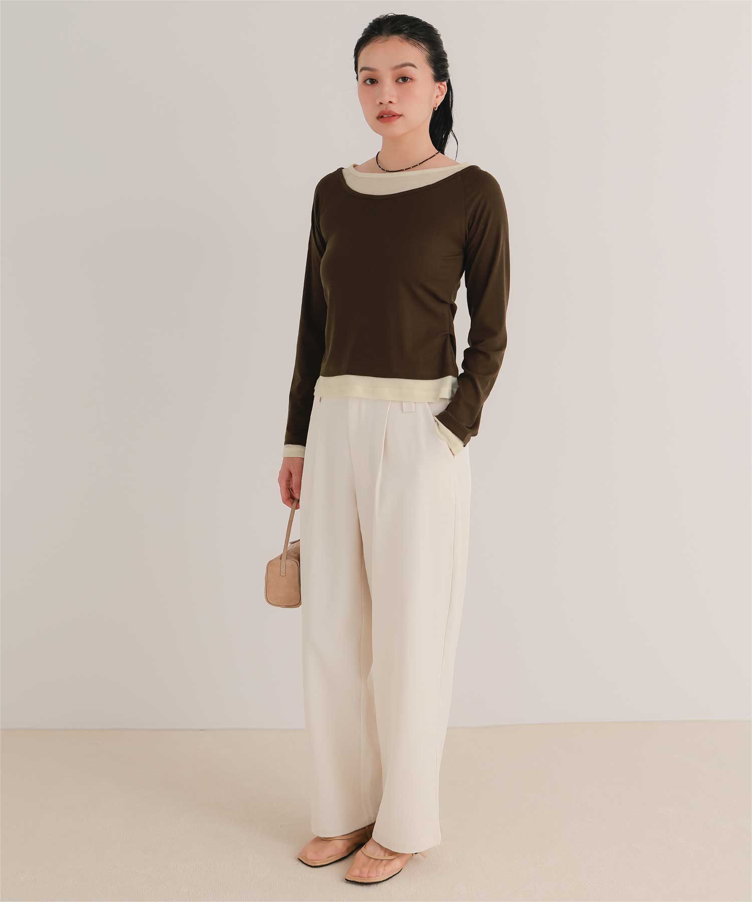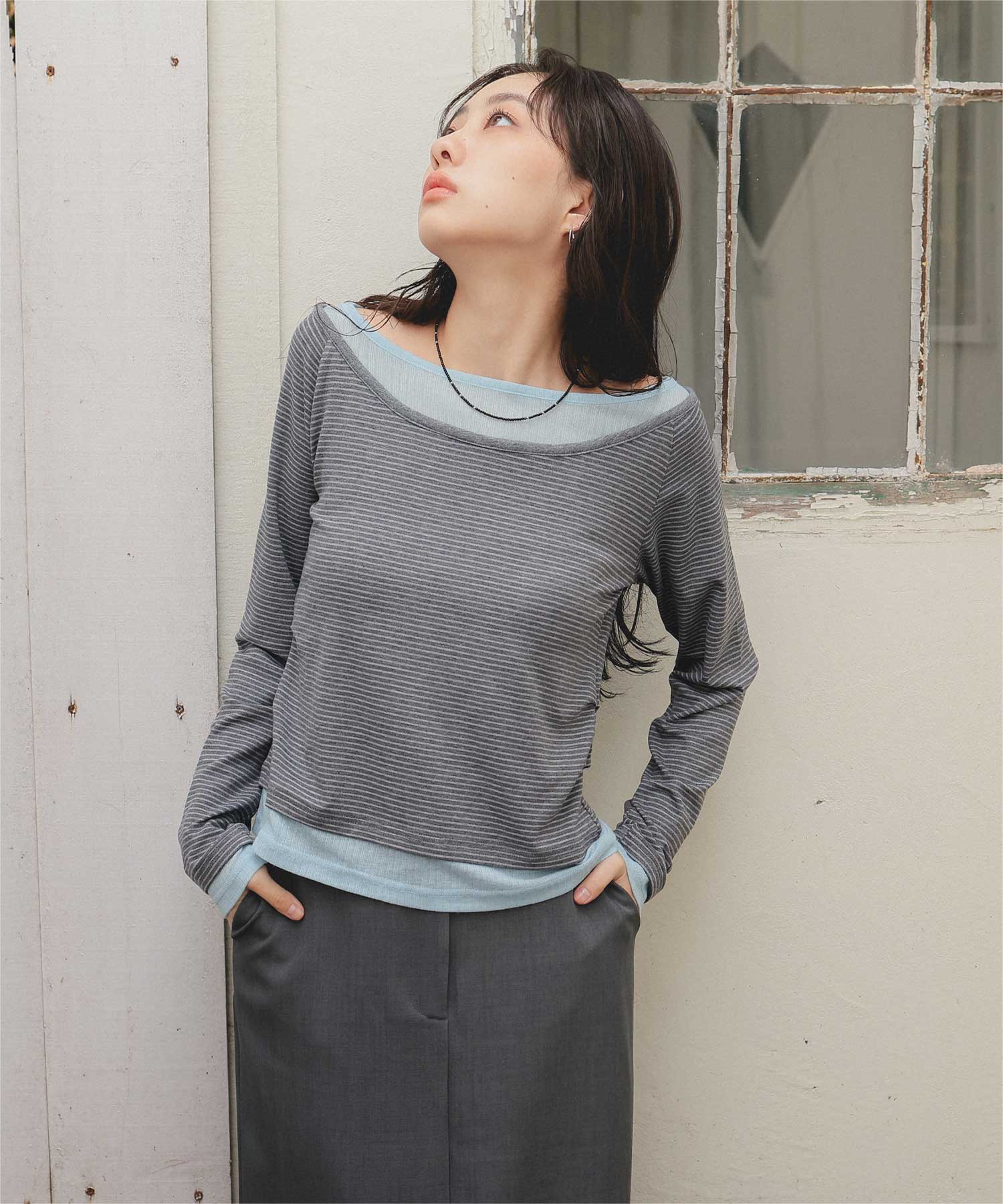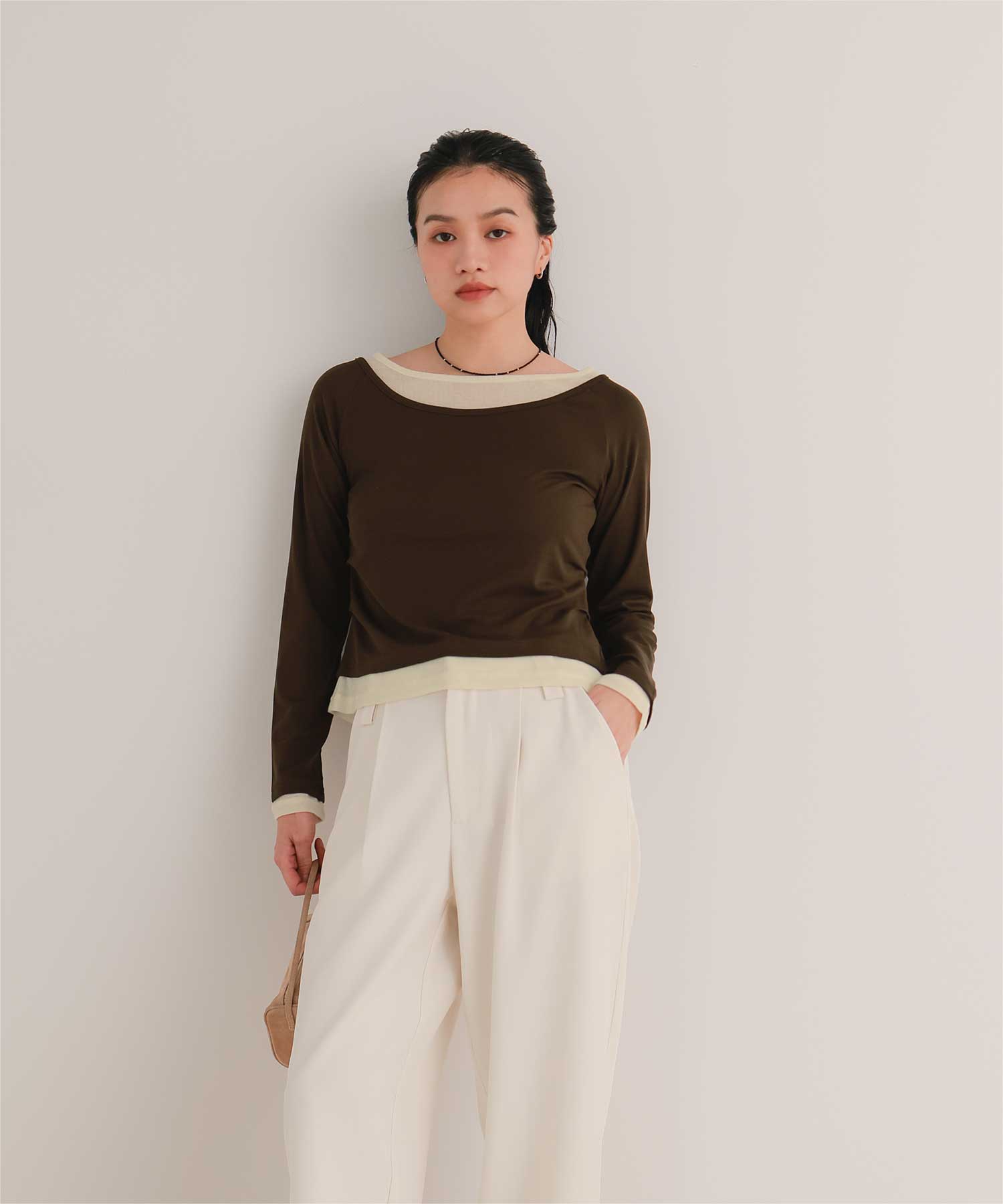 ・重ね着風の配色デザインがポイントで、1枚で決まるレイヤード風トップス