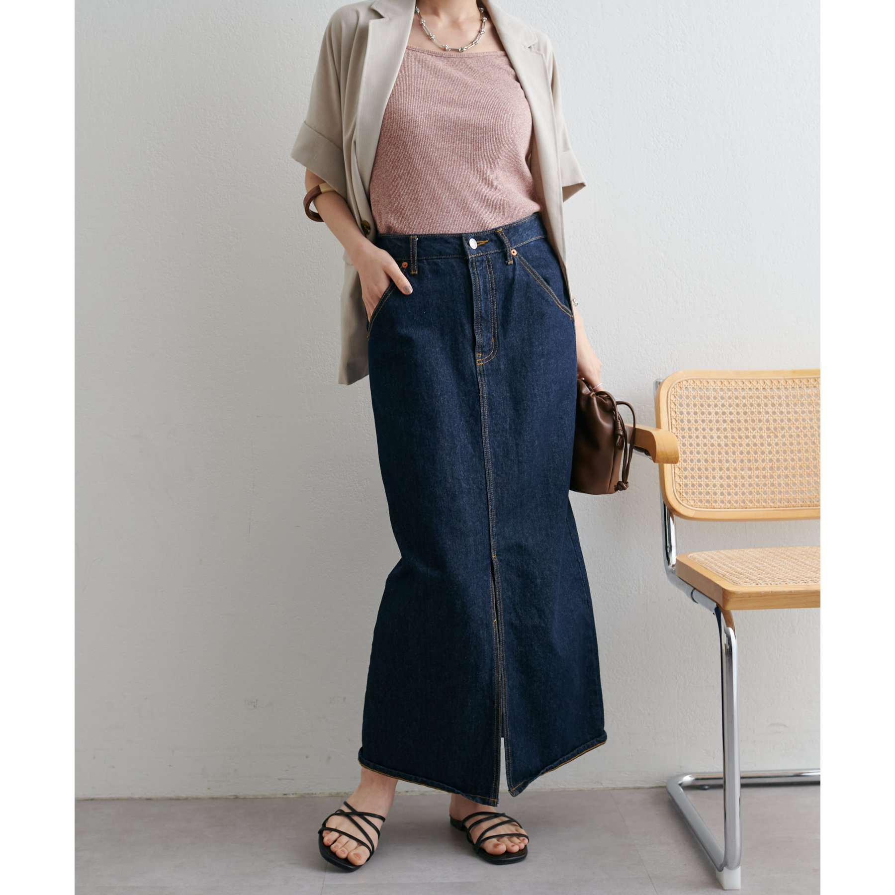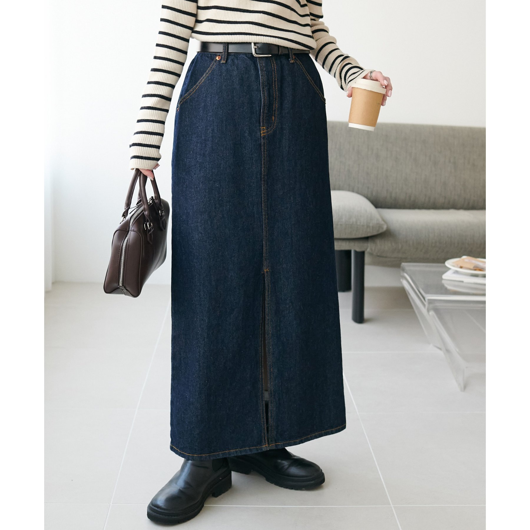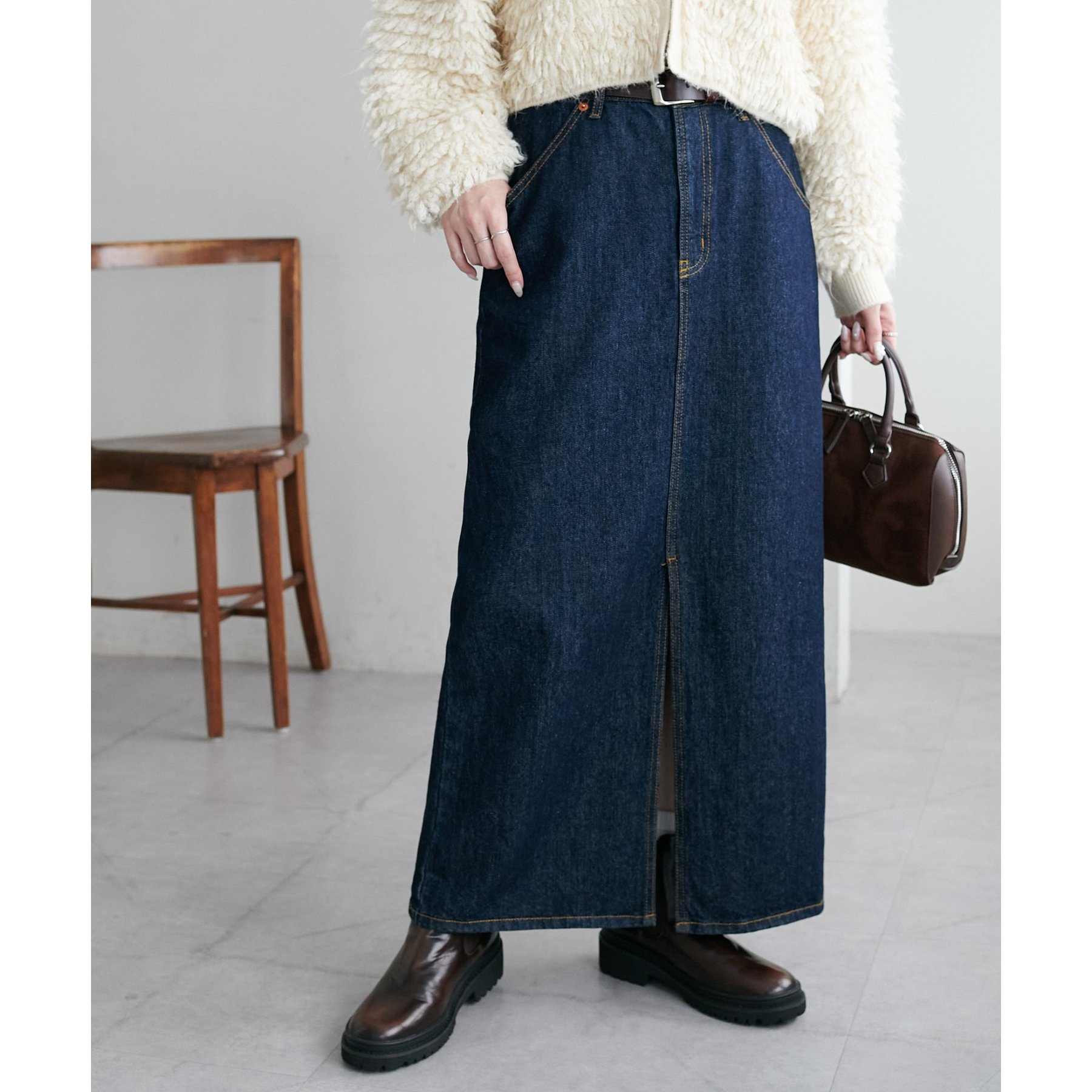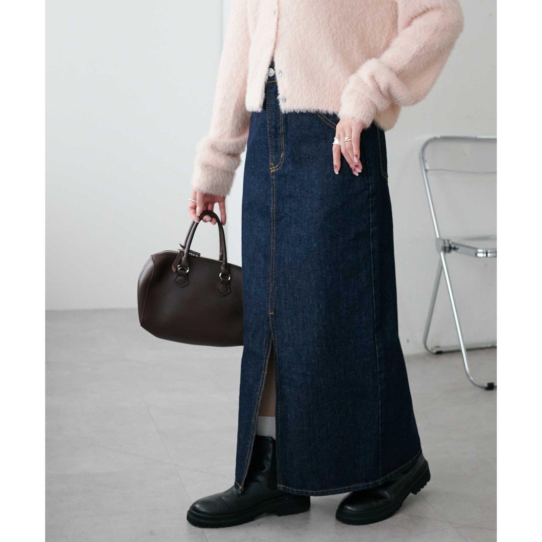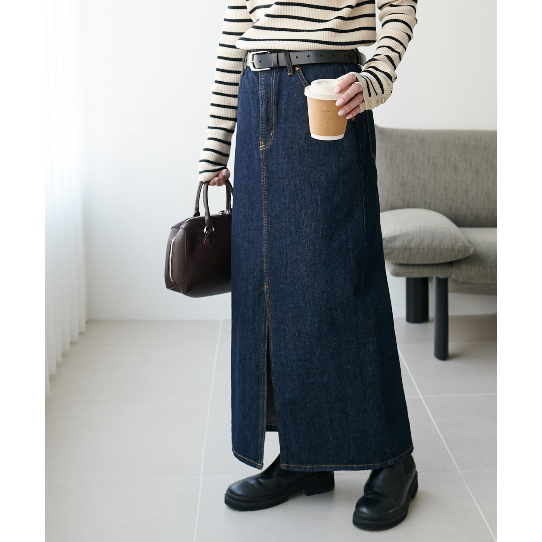 華奢見えする美シルエットのデニムナロースカート。ベーシックなデザインで様々なトップスと合わせやすく、着回しのできるアイテムです。前スリットも入っているので歩きやすさも抜群!