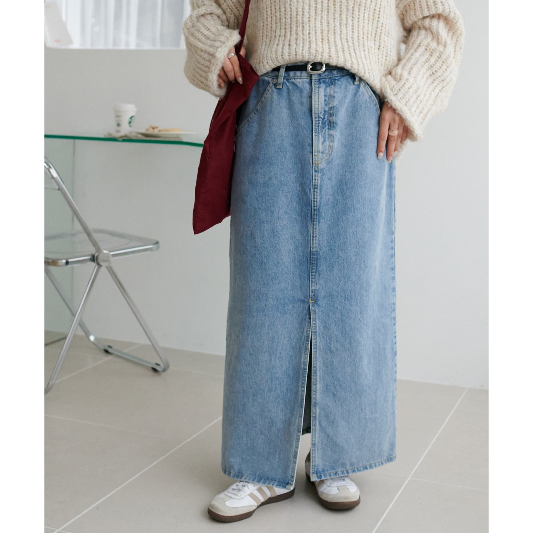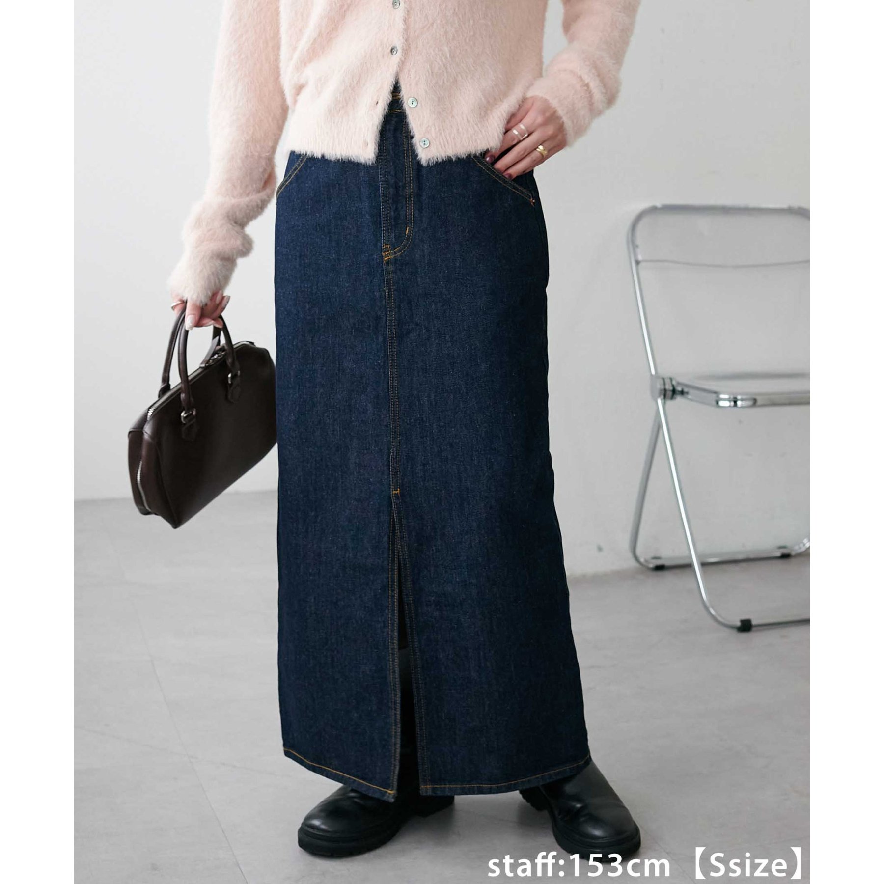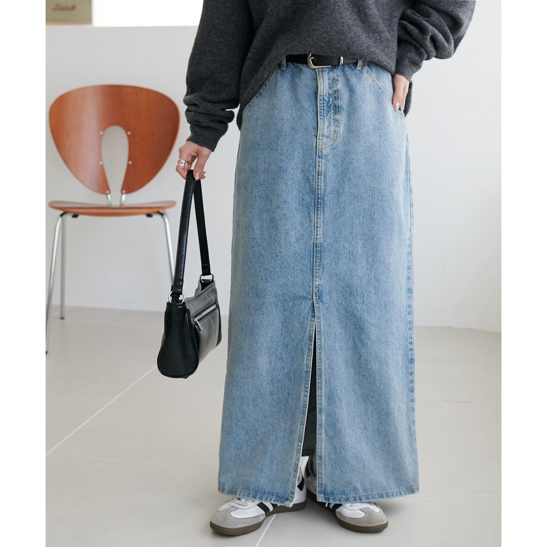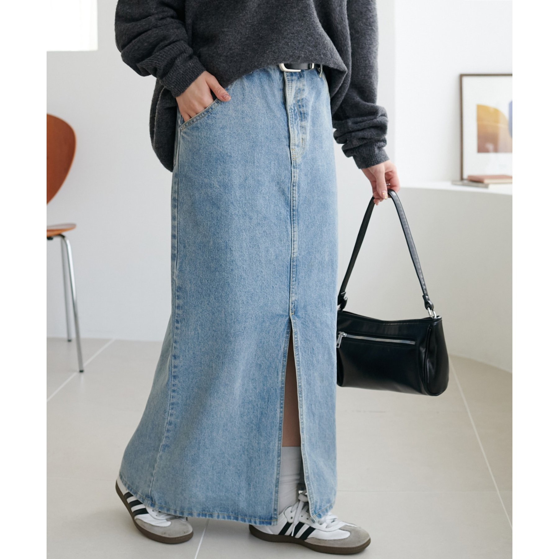 華奢見えする美シルエットのデニムナロースカート。ベーシックなデザインで様々なトップスと合わせやすく、着回しのできるアイテムです。前スリットも入っているので歩きやすさも抜群!