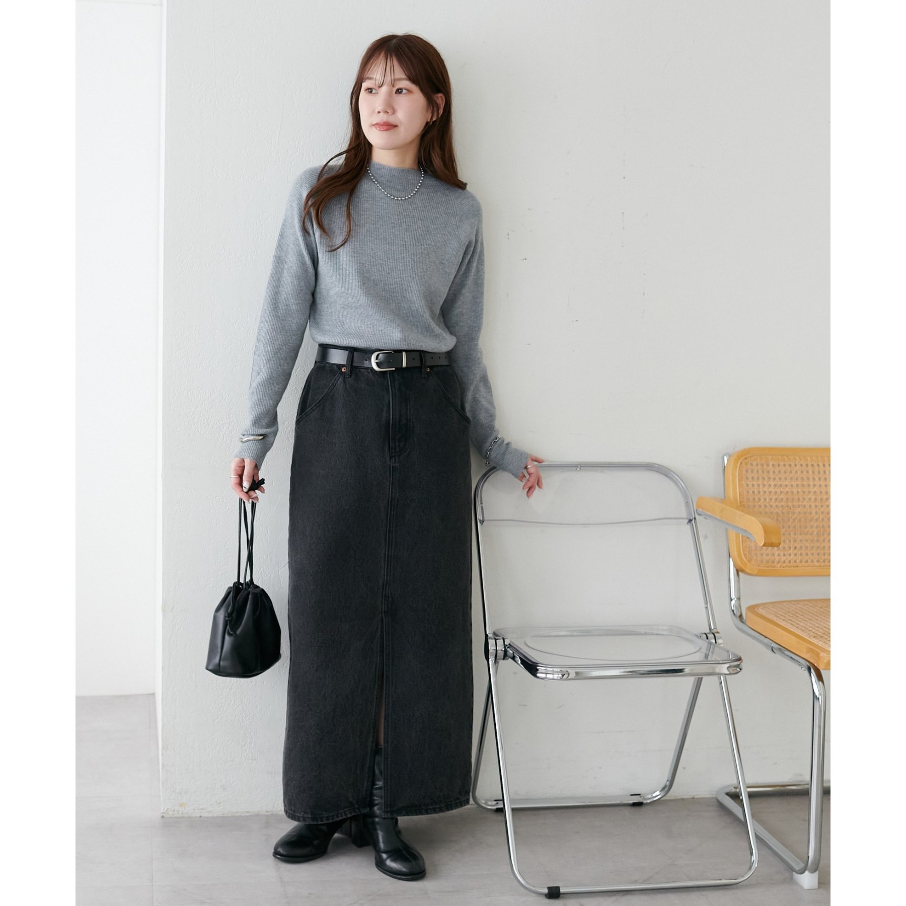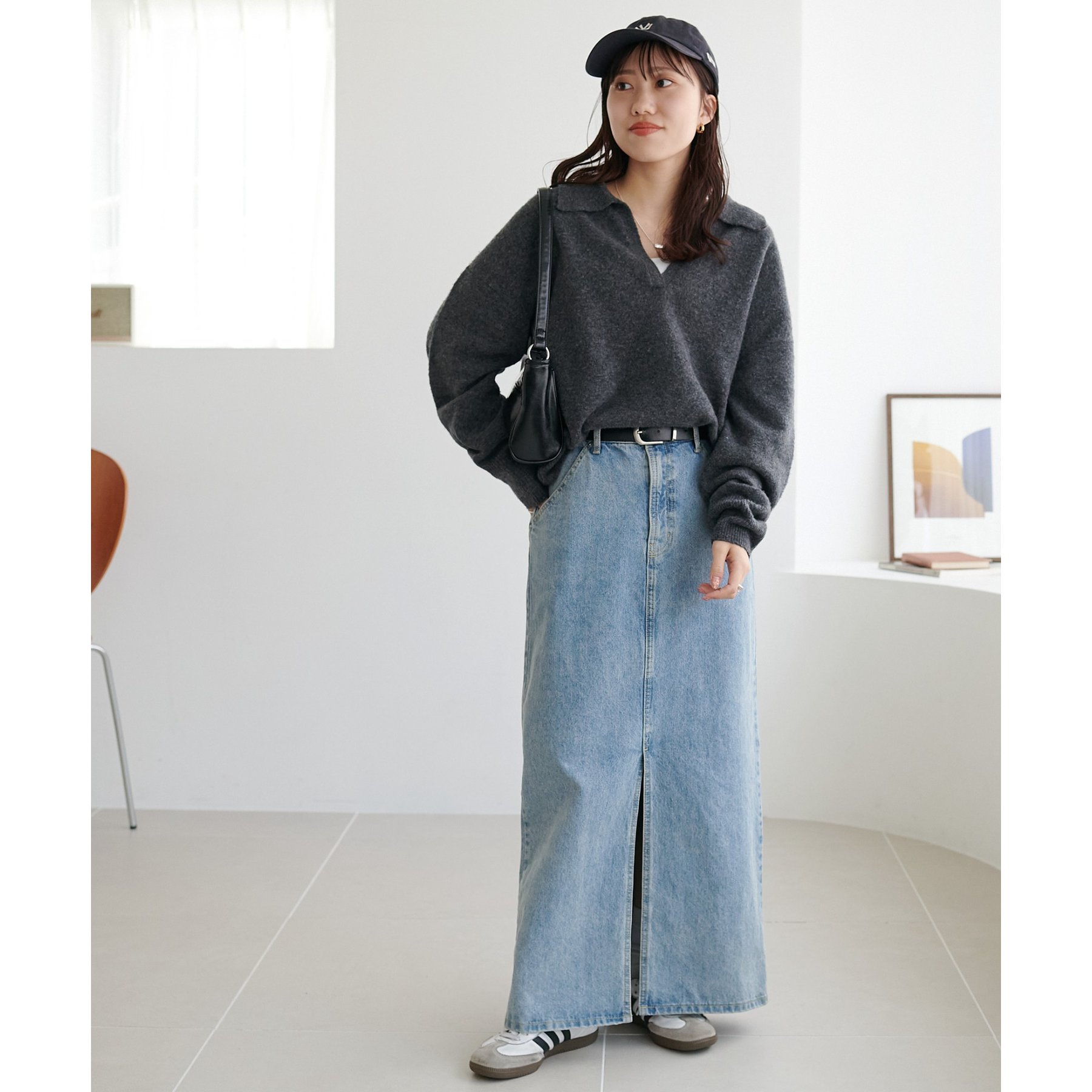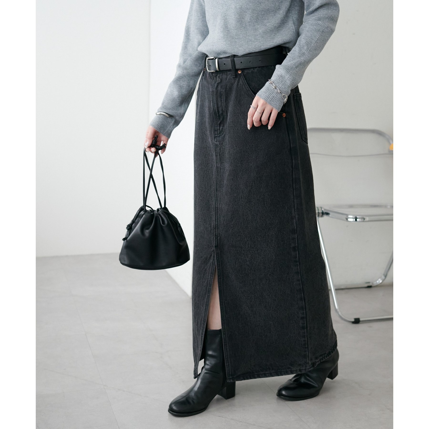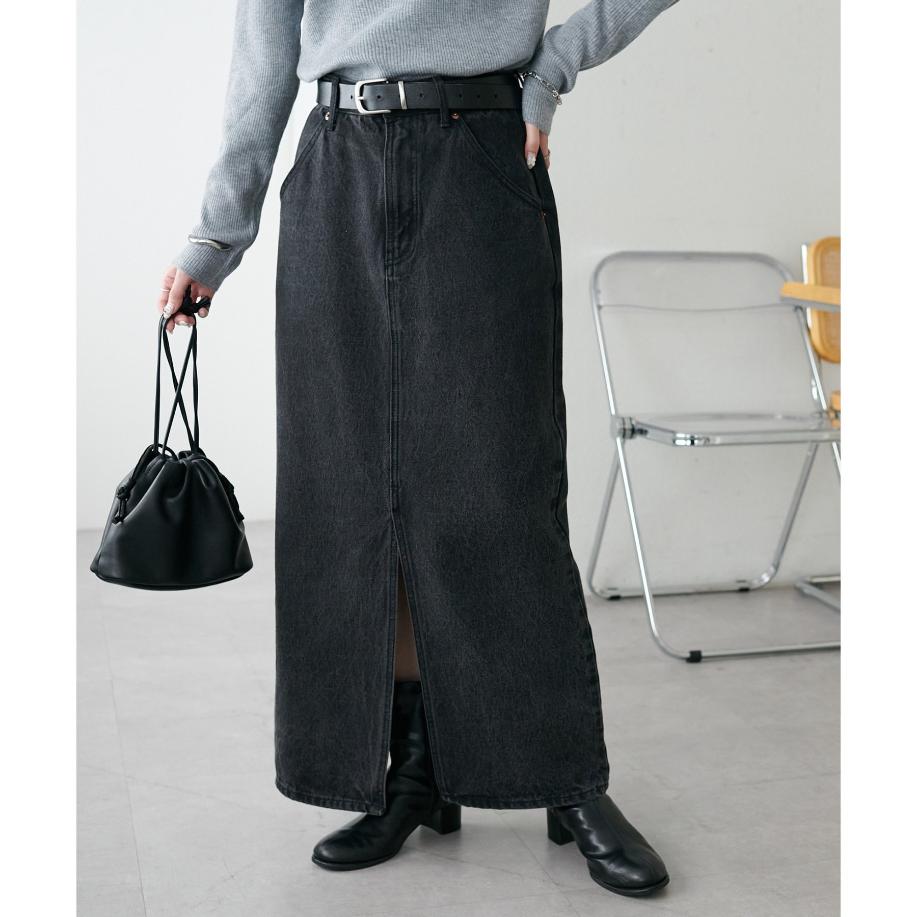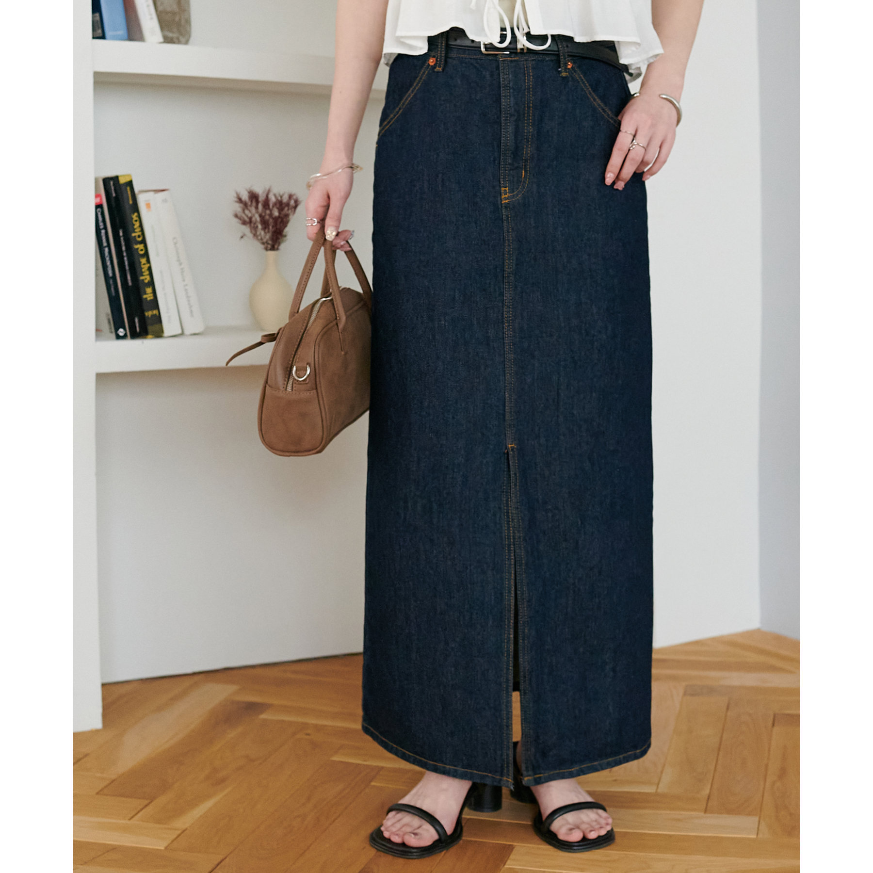 華奢見えする美シルエットのデニムナロースカート。ベーシックなデザインで様々なトップスと合わせやすく、着回しのできるアイテムです。前スリットも入っているので歩きやすさも抜群!