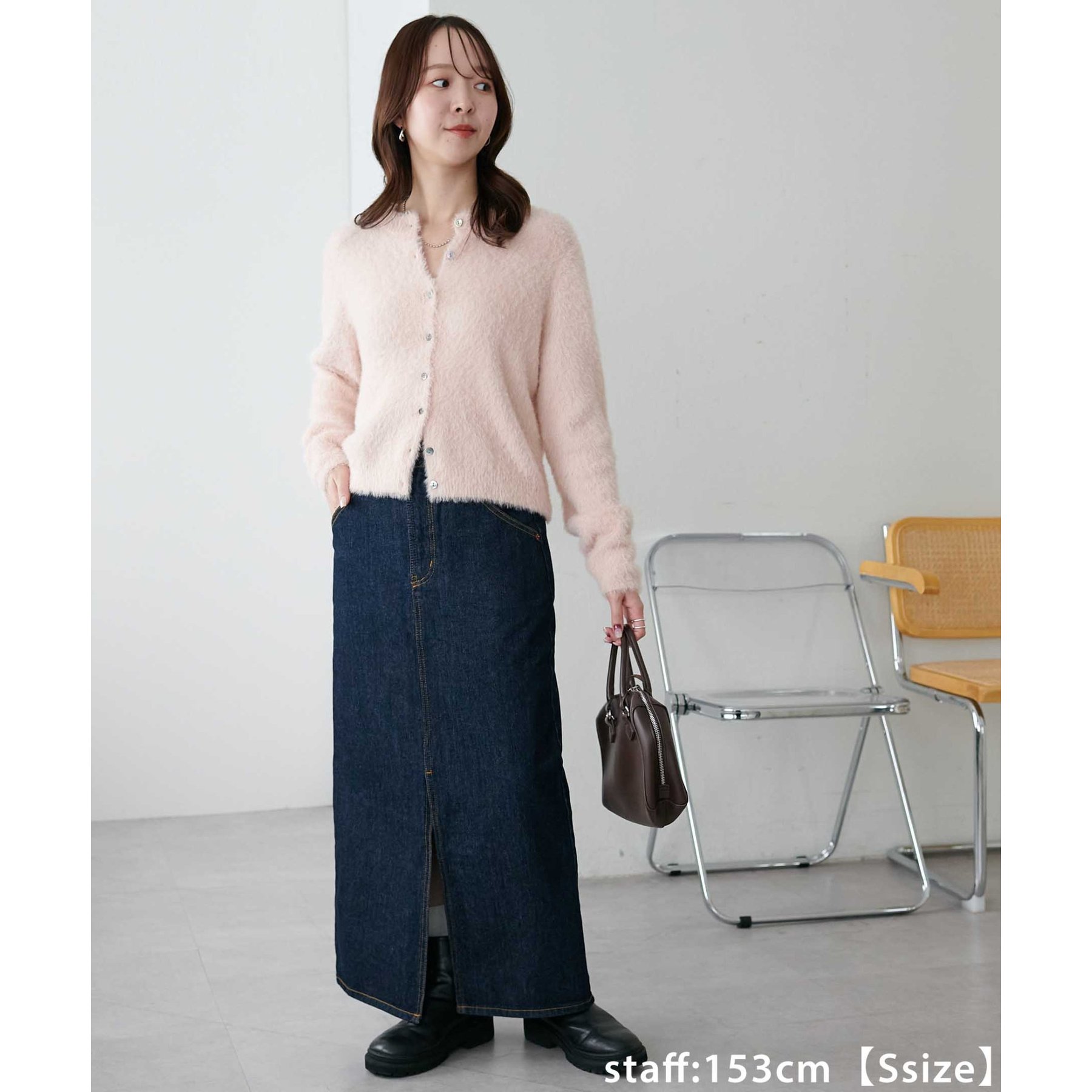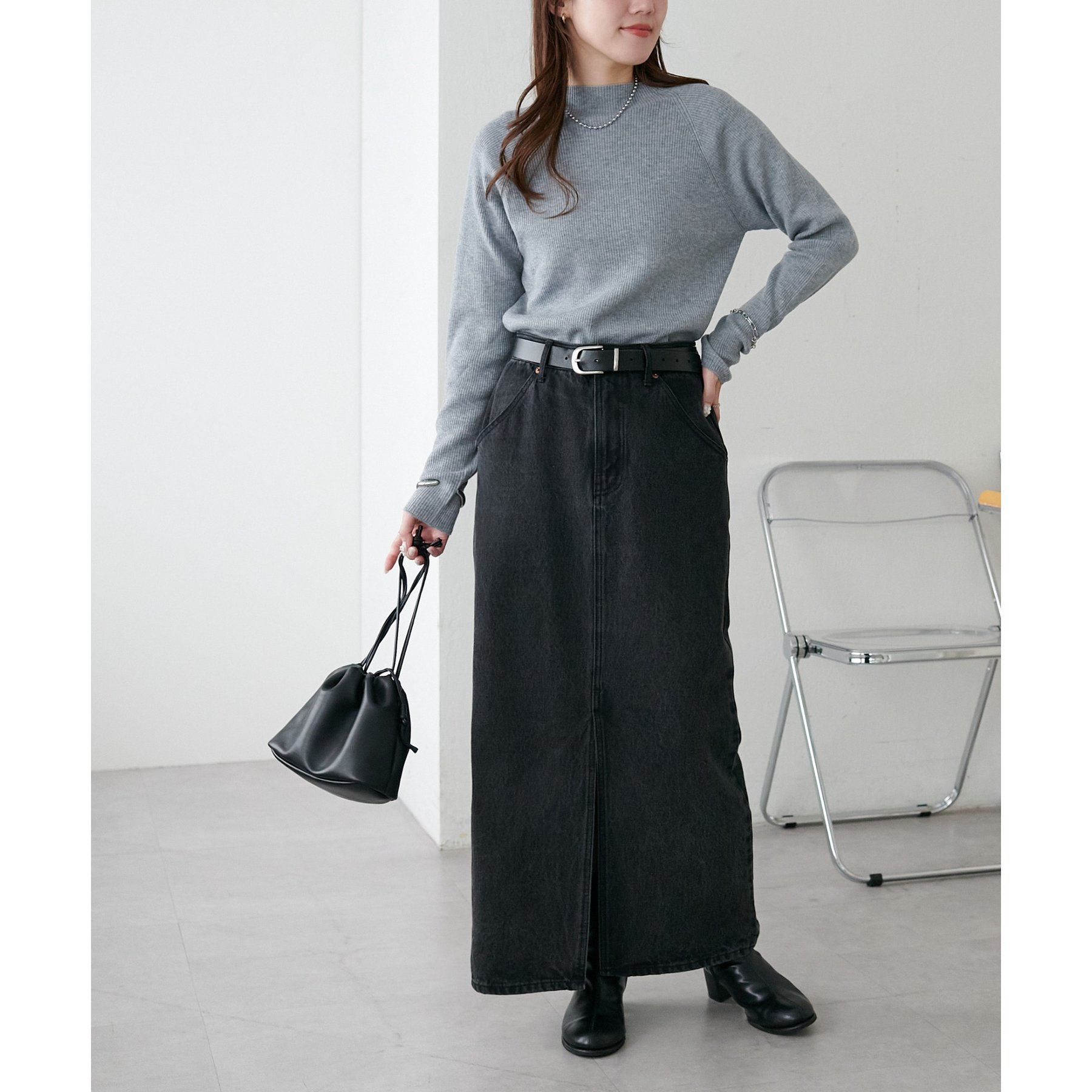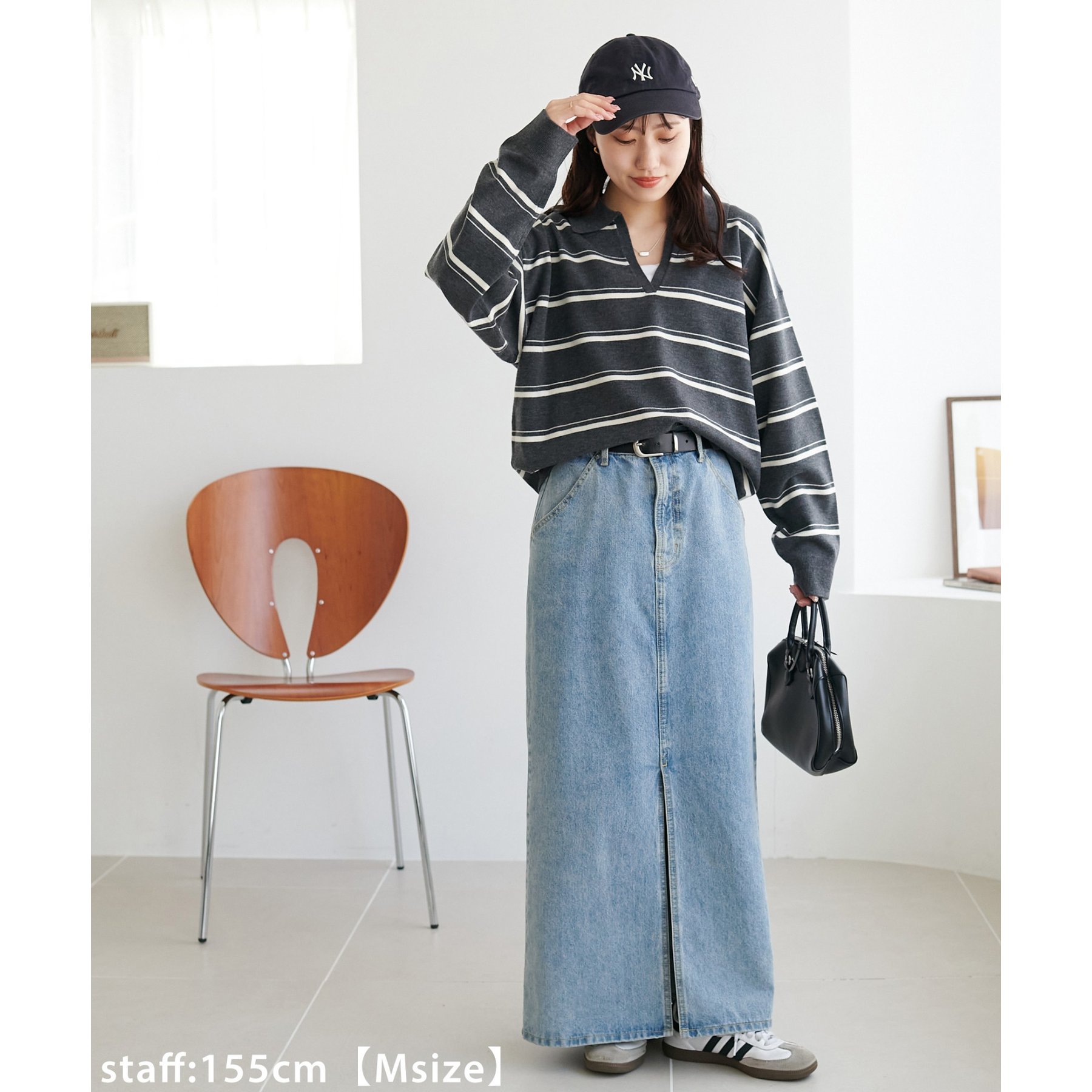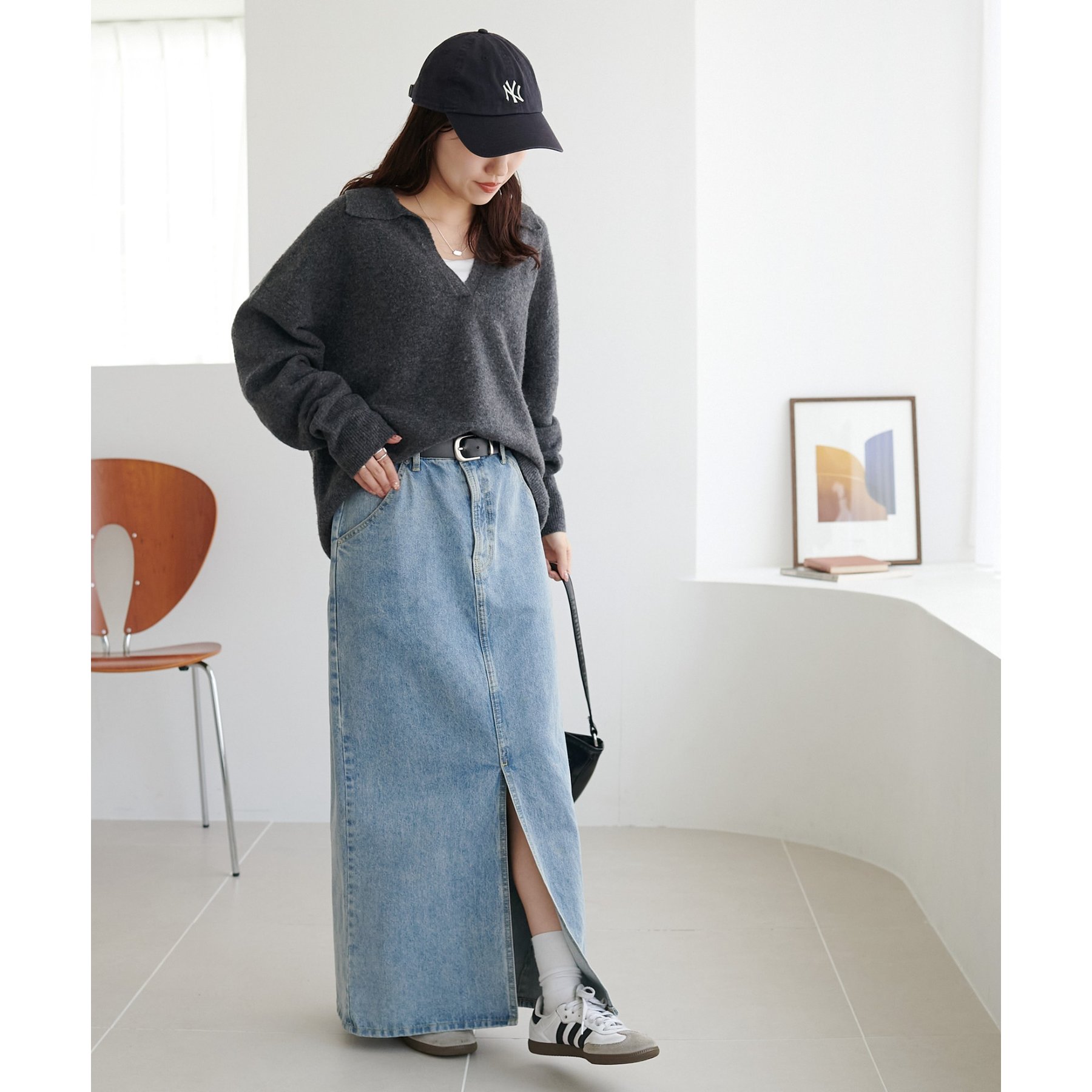 華奢見えする美シルエットのデニムナロースカート。ベーシックなデザインで様々なトップスと合わせやすく、着回しのできるアイテムです。前スリットも入っているので歩きやすさも抜群!