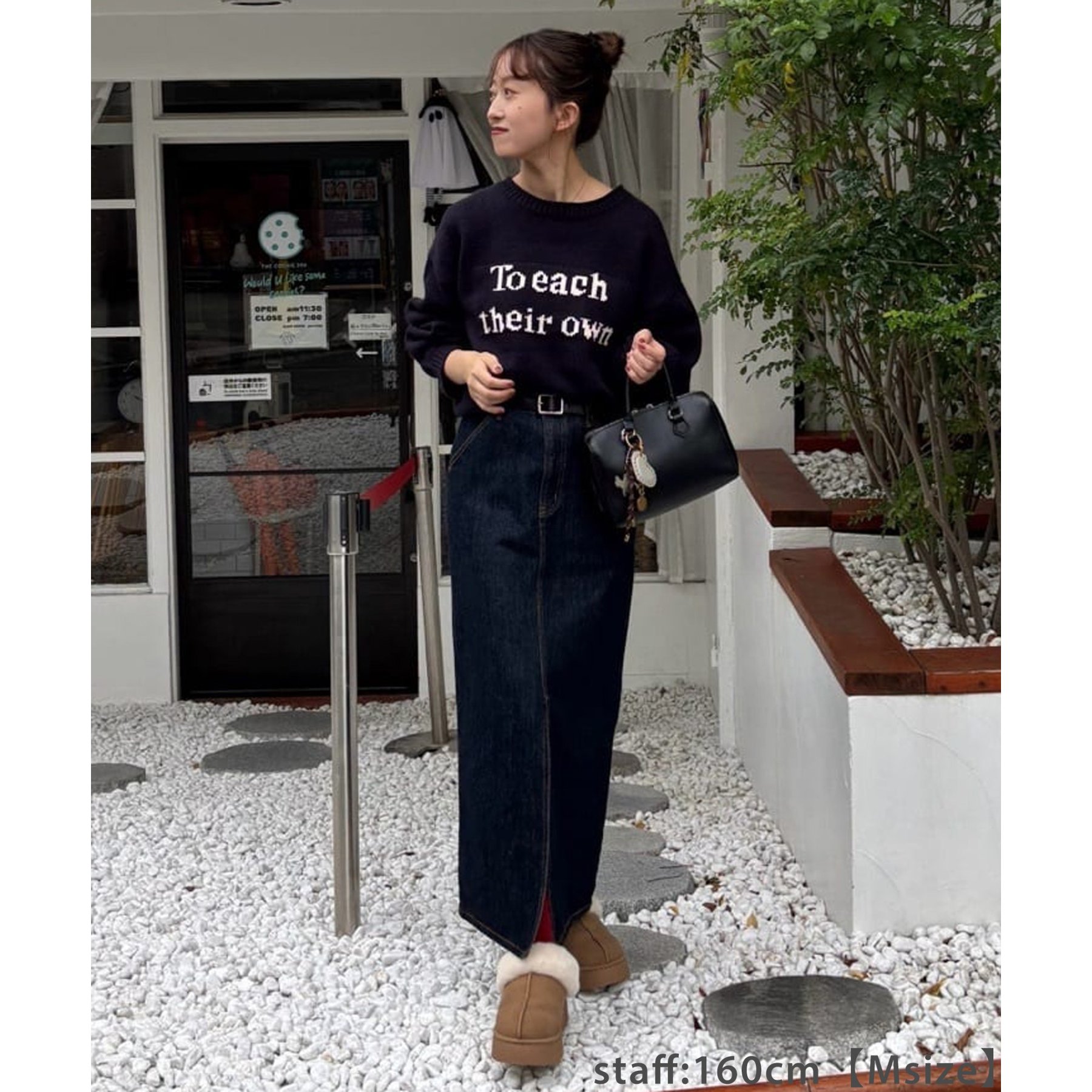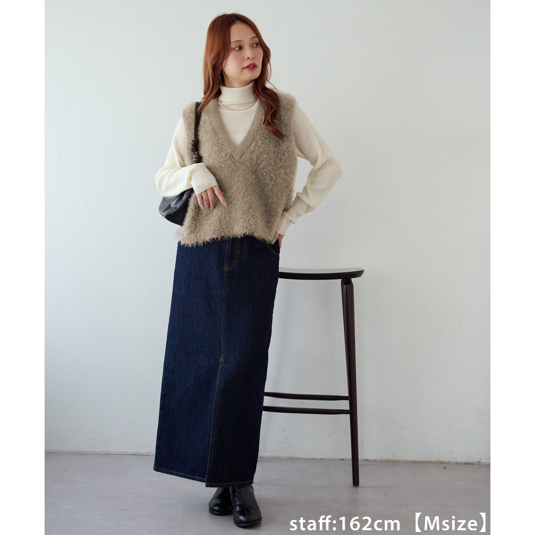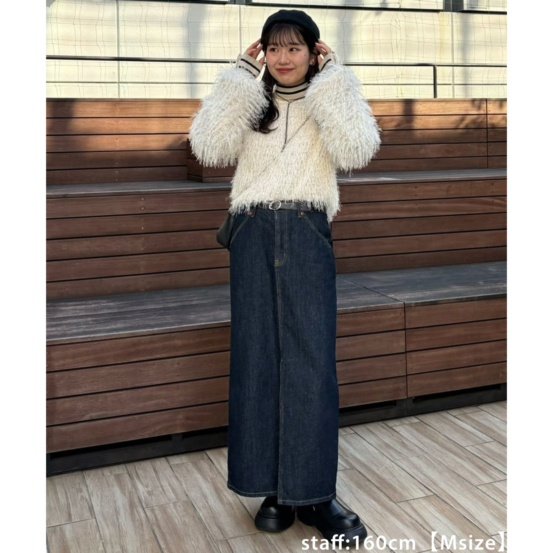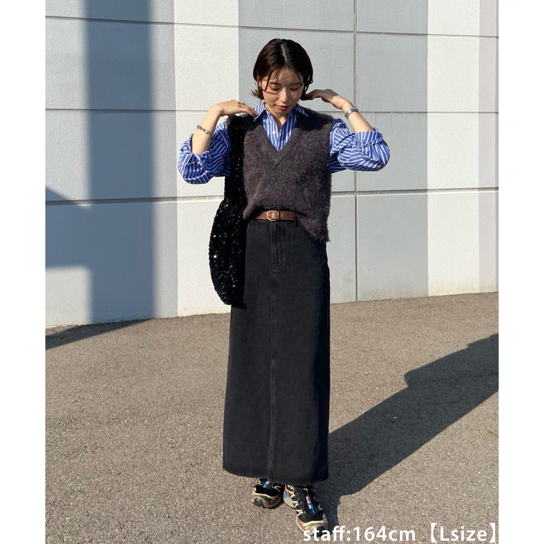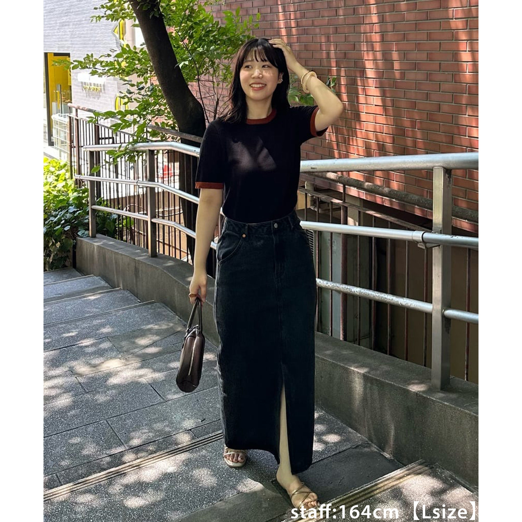 華奢見えする美シルエットのデニムナロースカート。ベーシックなデザインで様々なトップスと合わせやすく、着回しのできるアイテムです。前スリットも入っているので歩きやすさも抜群!