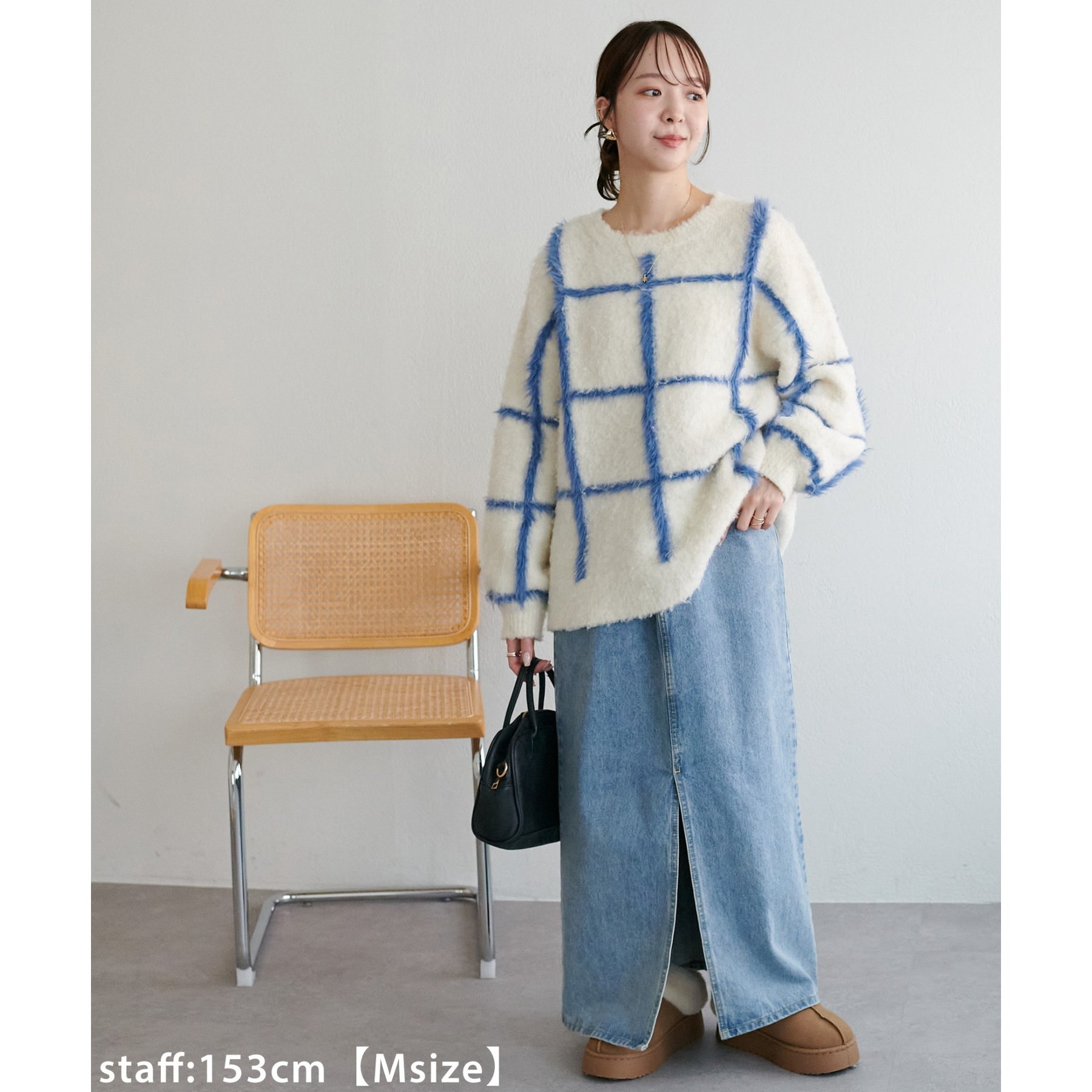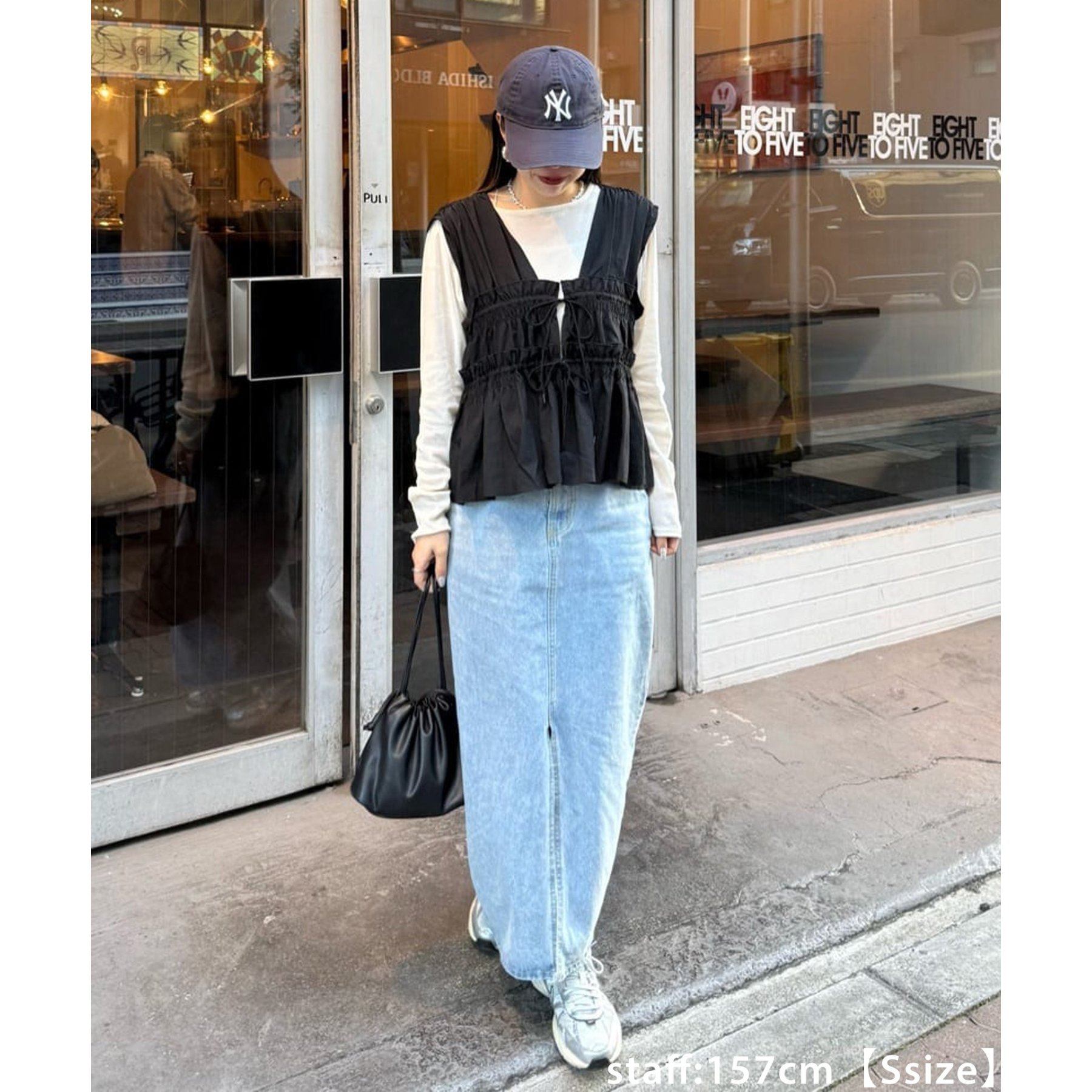 159cmスタッフ(Mサイズ着用):気になる腰回りもカバーしてくれます。タックインすることでメリハリのあるコーデに◎