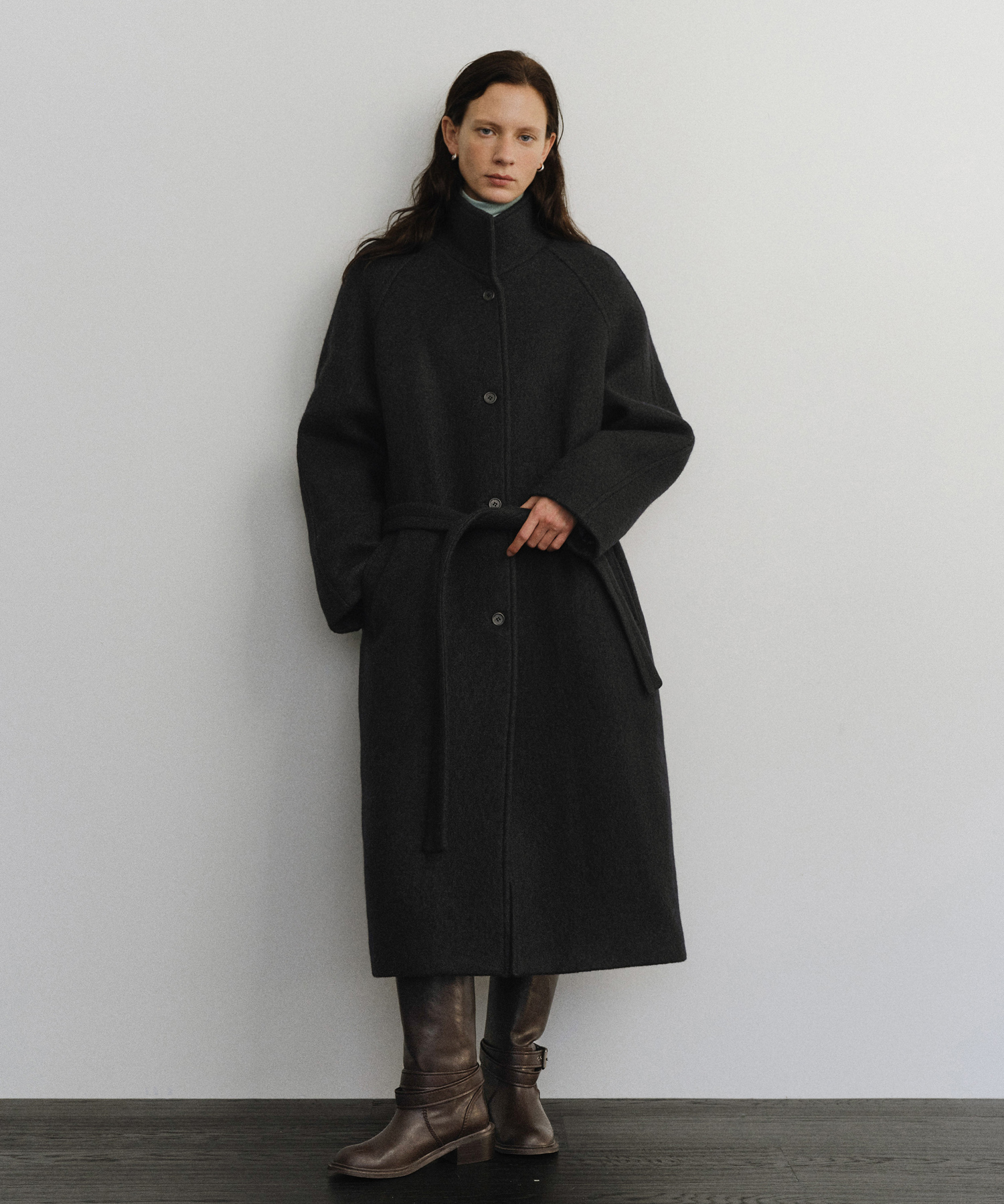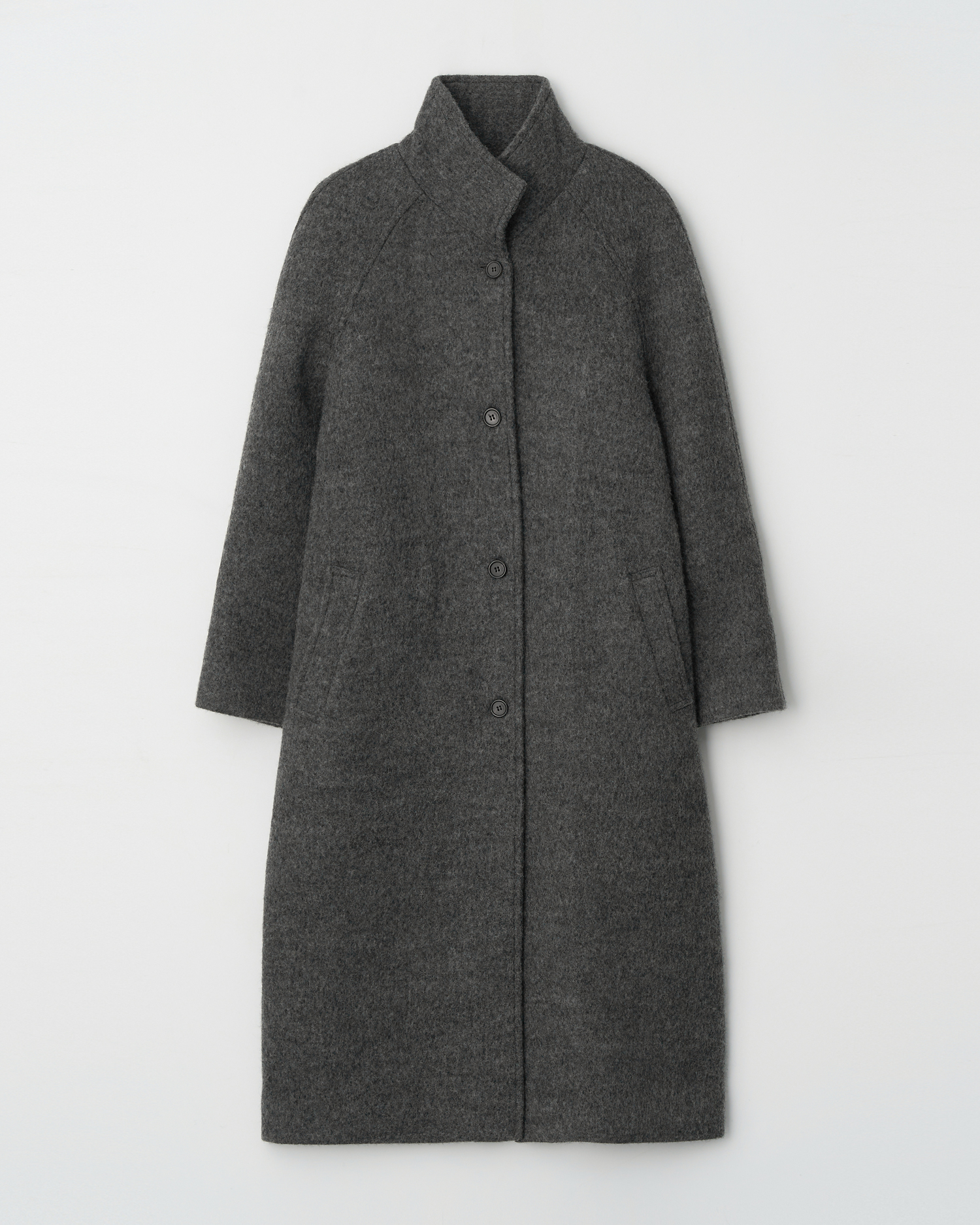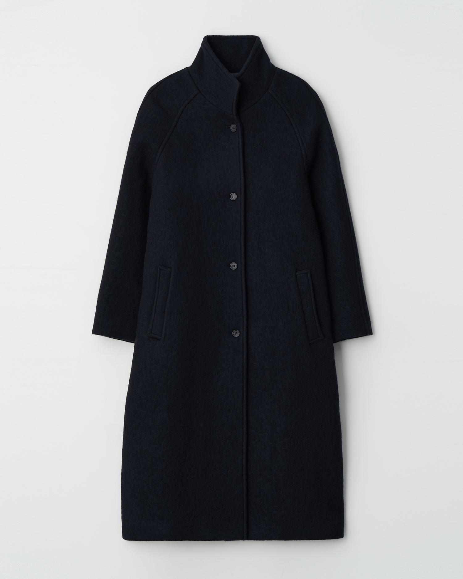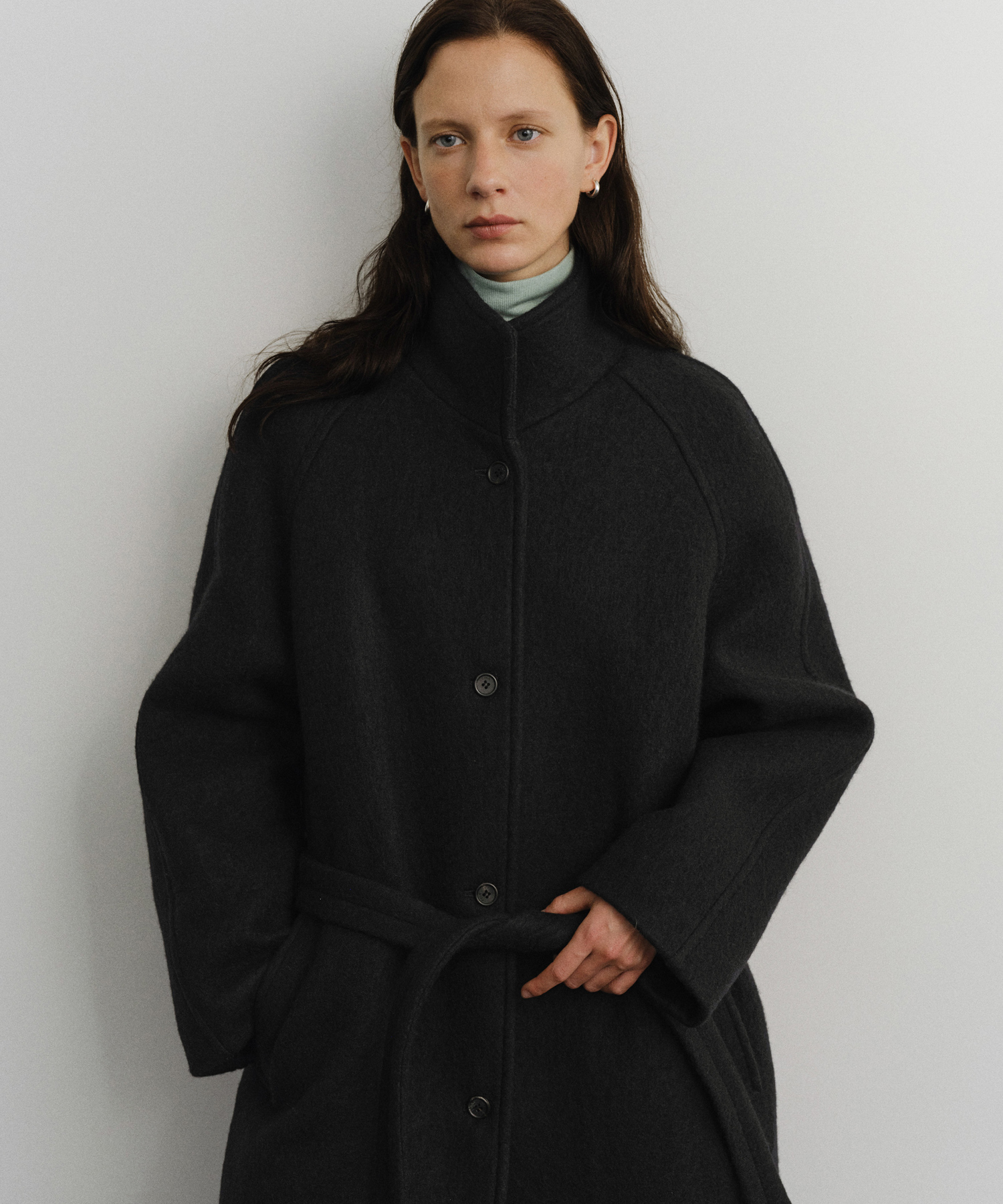 - 首元をゆったり包むハイネックカラーはボタンクロージングで表情を変えることができ、シックで端正なムードを演出します。
