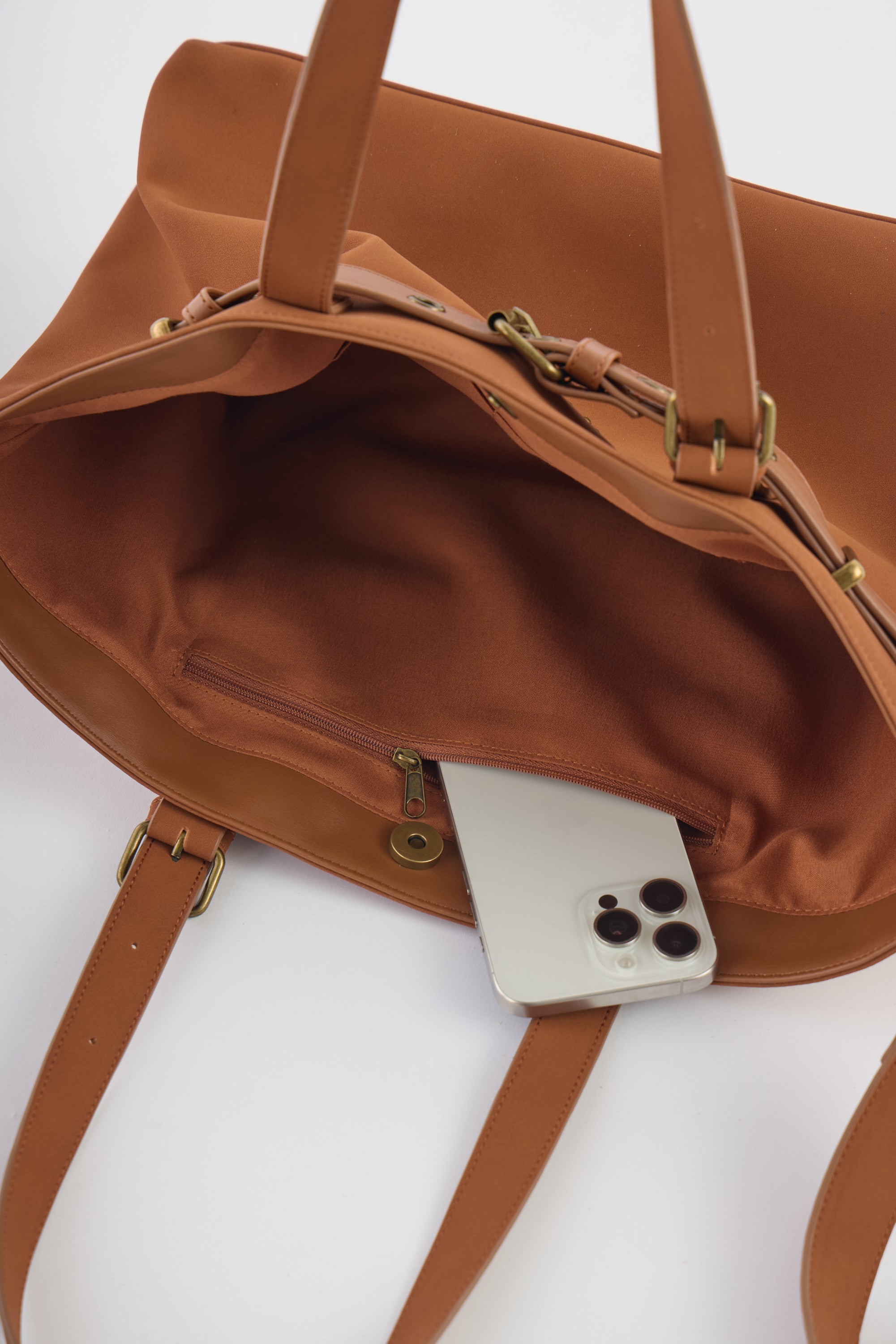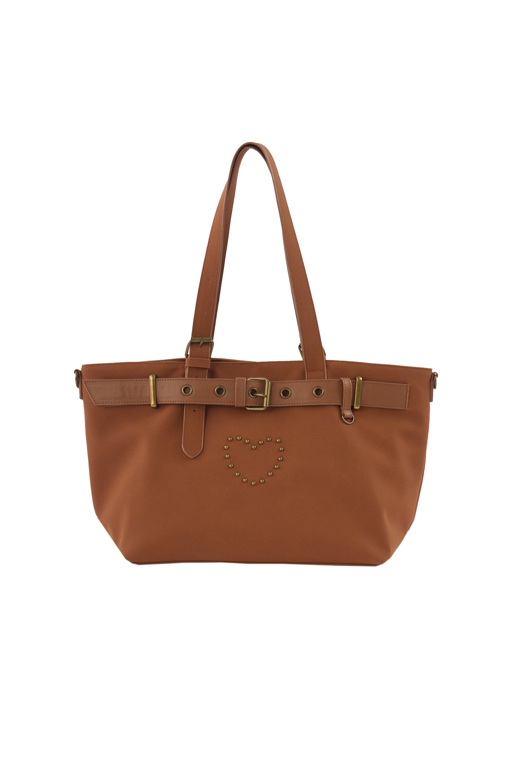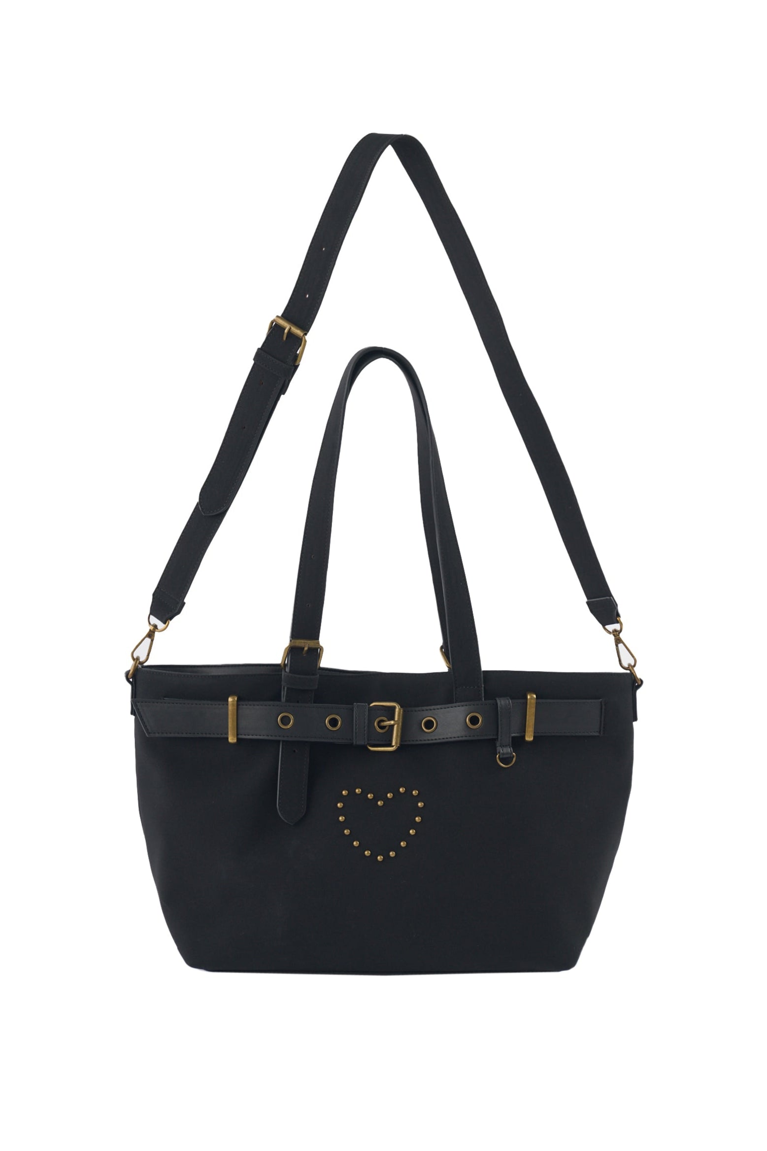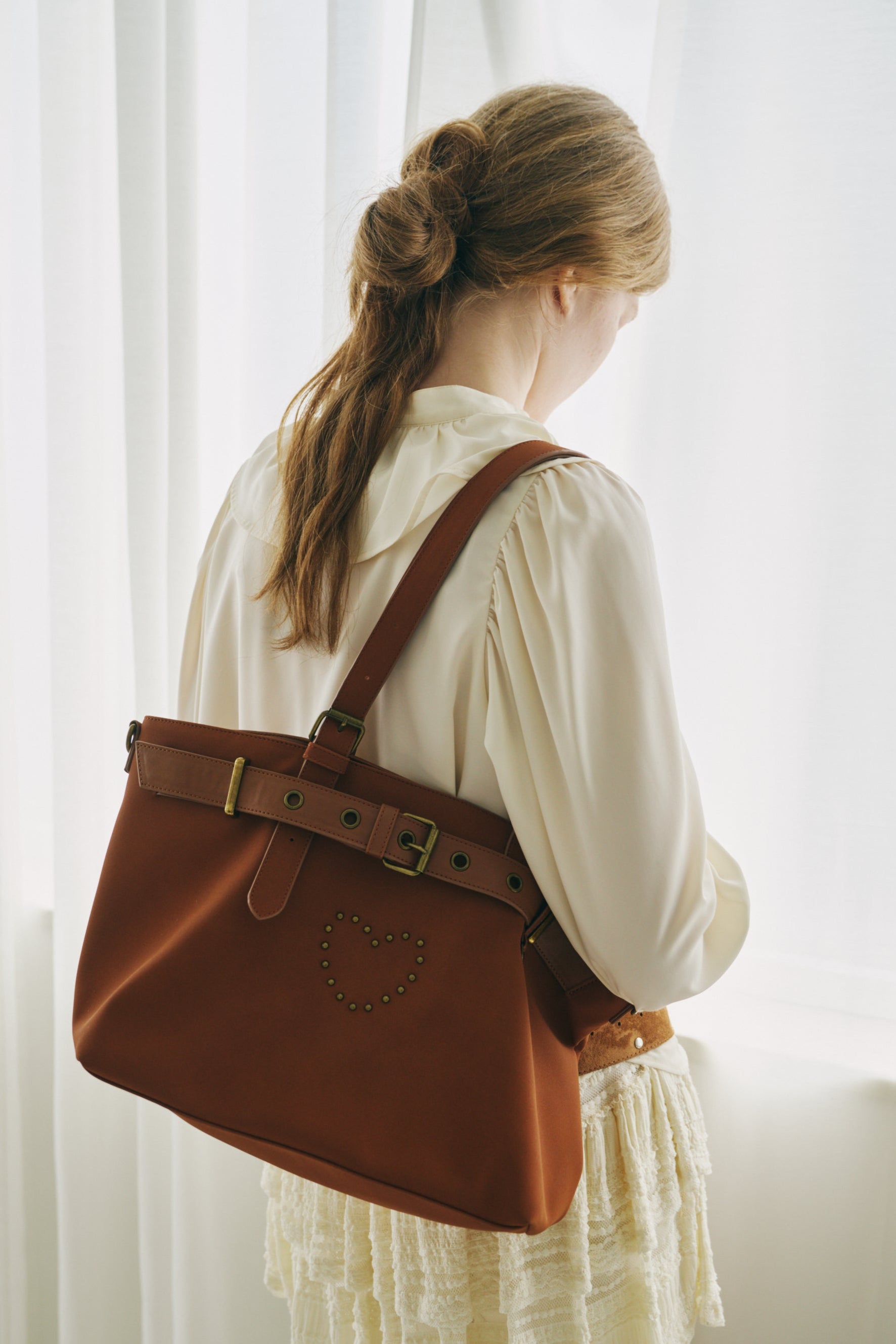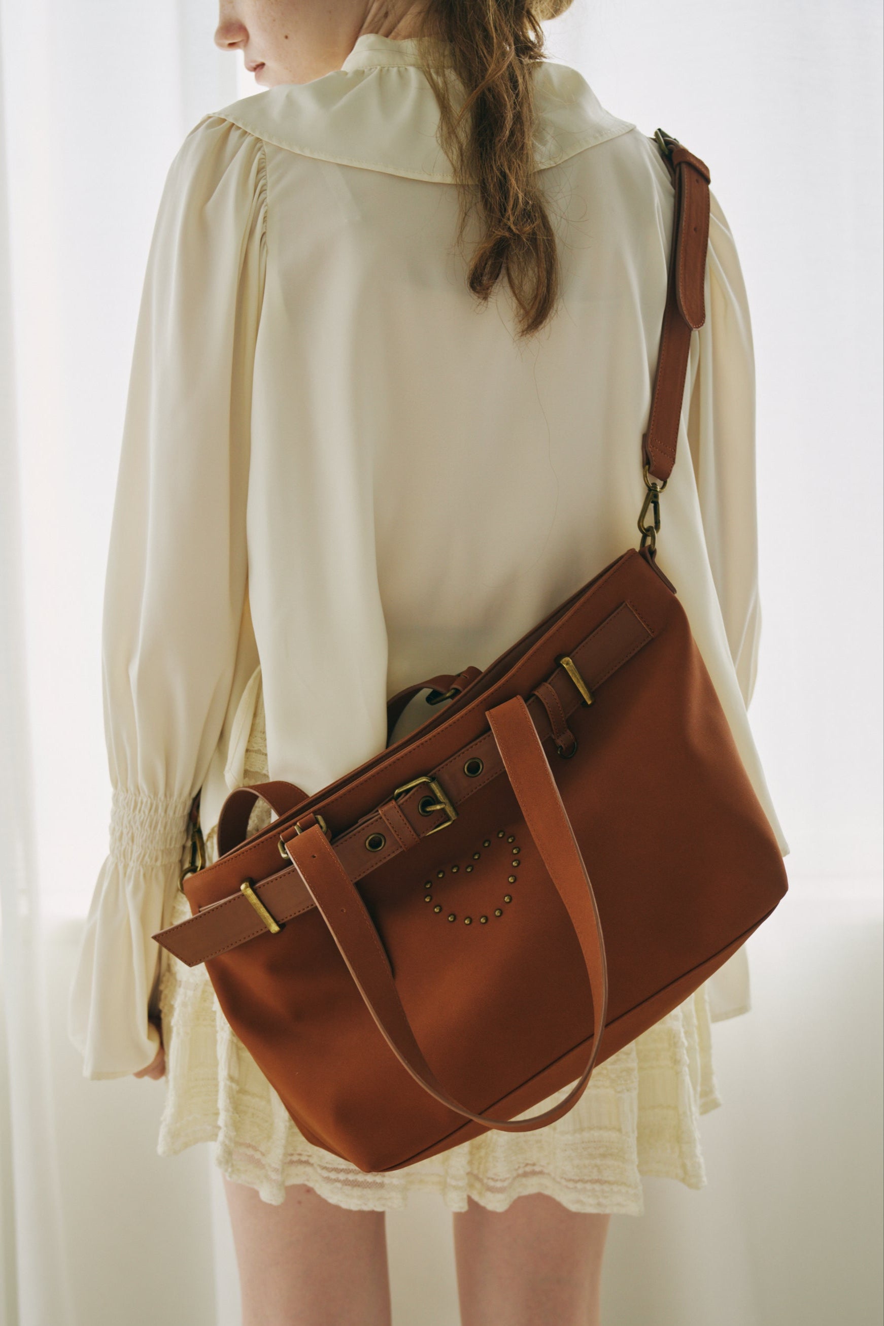 上品見えするスエード調素材バッグは、シンプルながらもハートスタッズやベルトデザインが程よい存在感をプラス。収納力もあり、PCやタブレット、お弁当や水筒もすっきり収納できます。