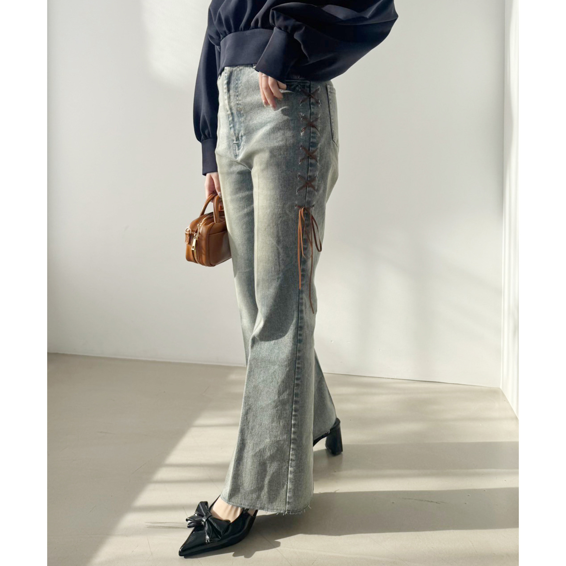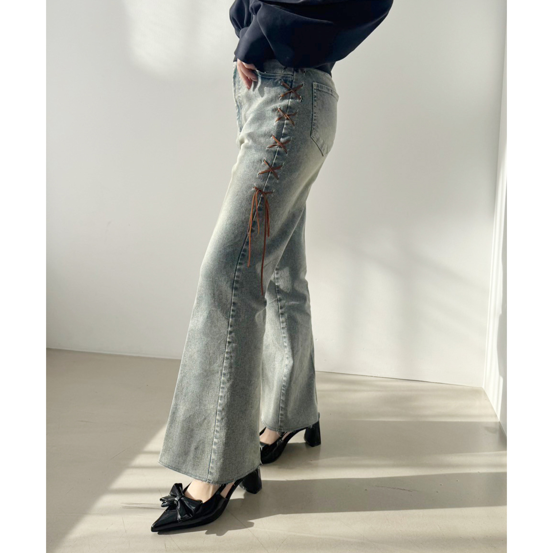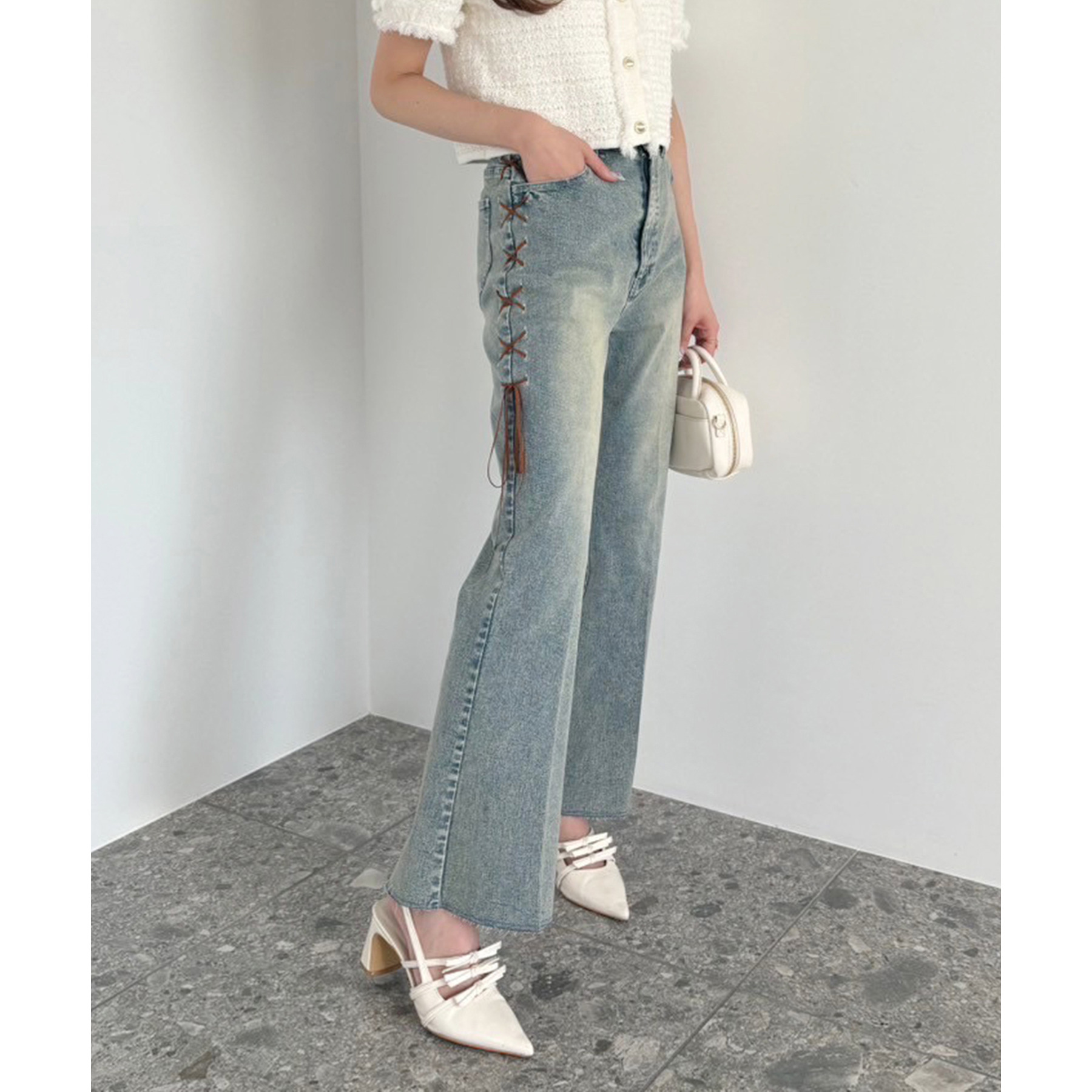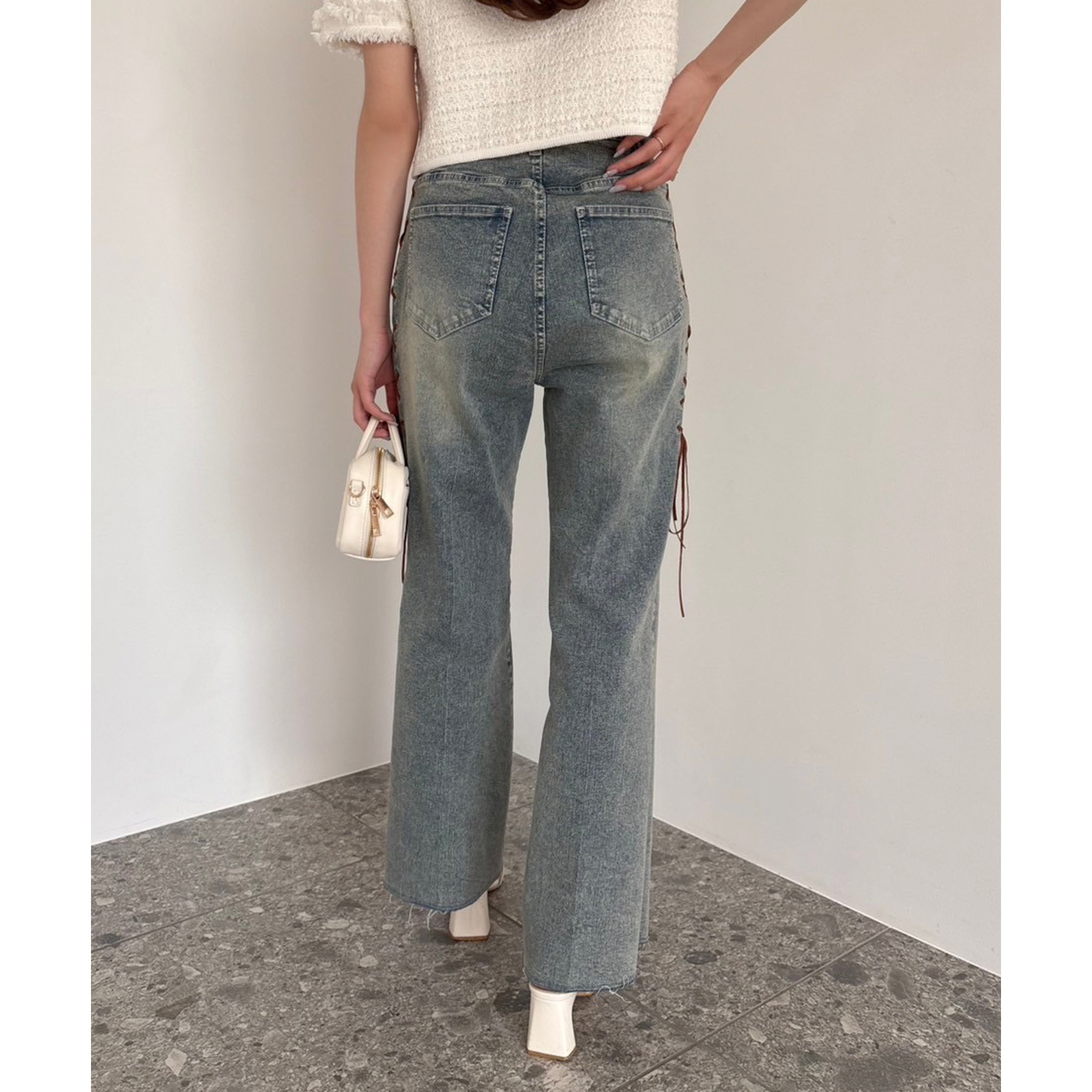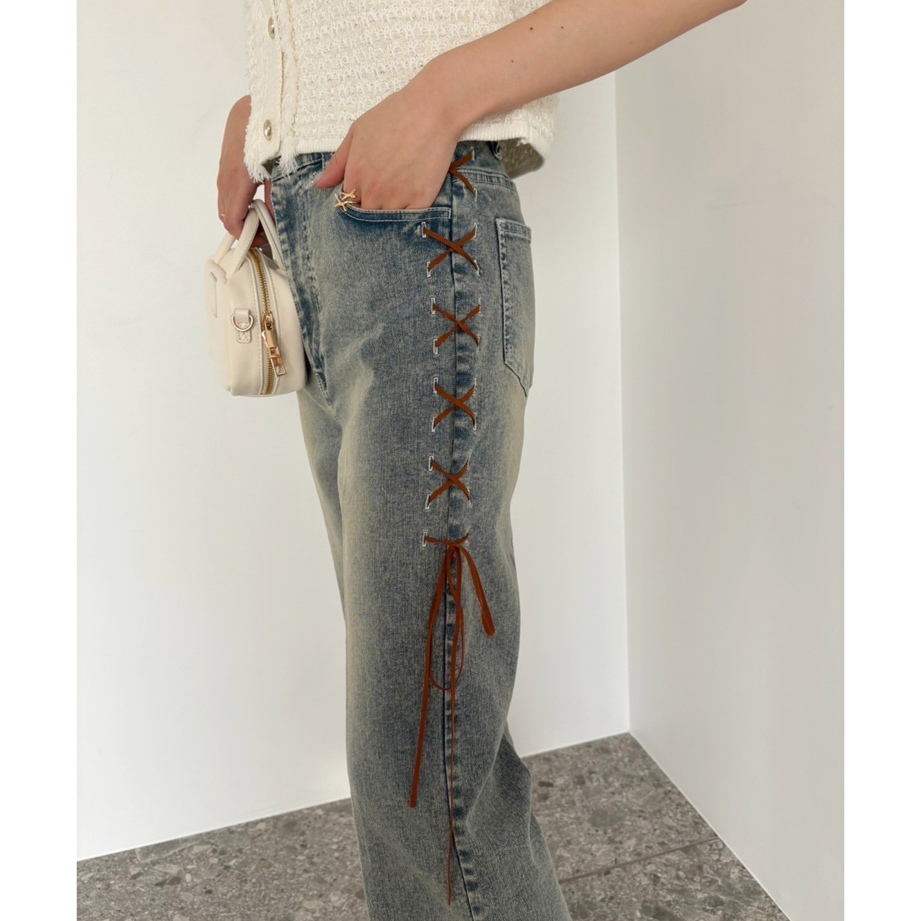 サイドのレースアップがおしゃれ見えするデニムパンツ