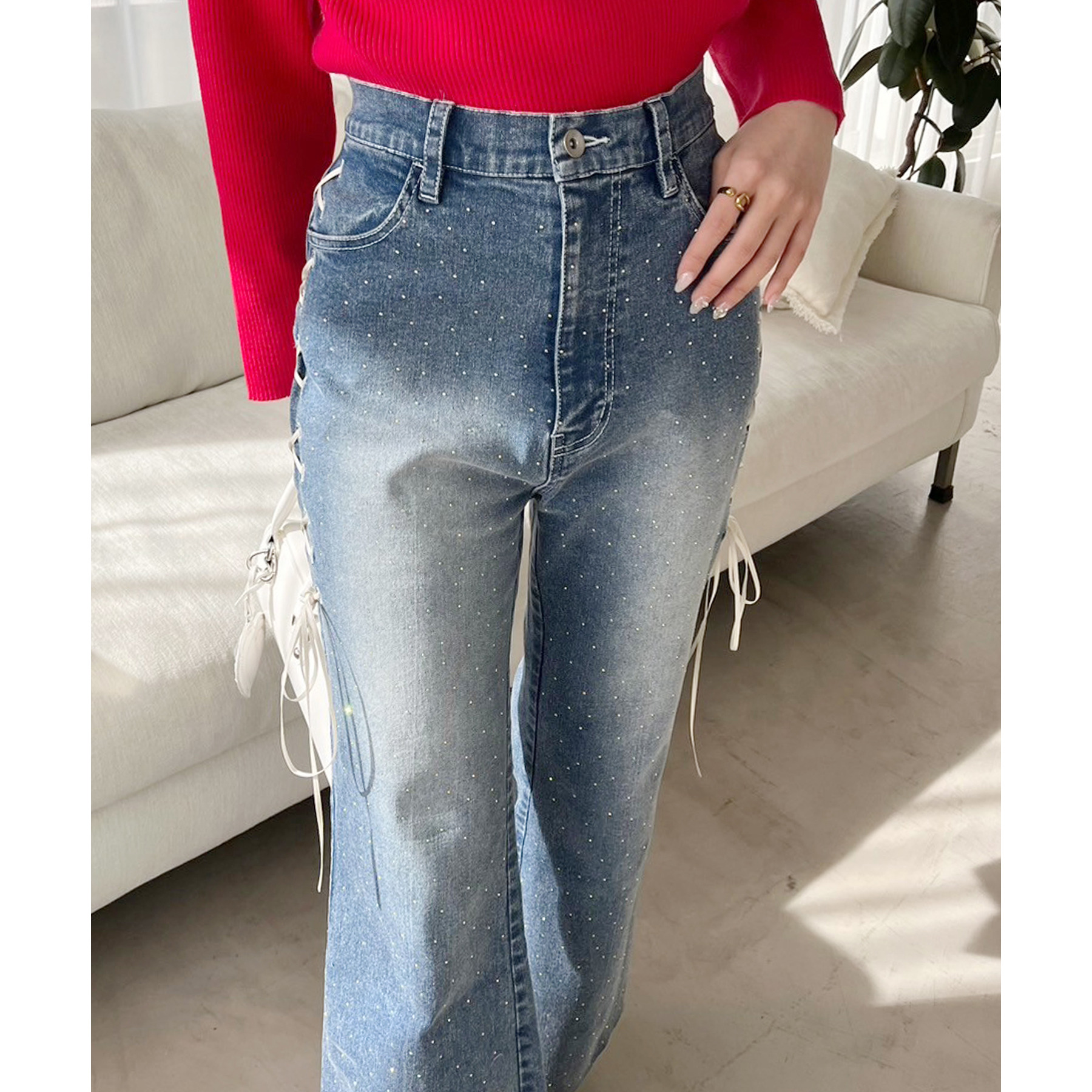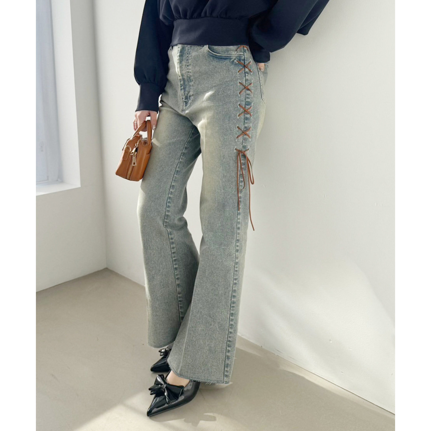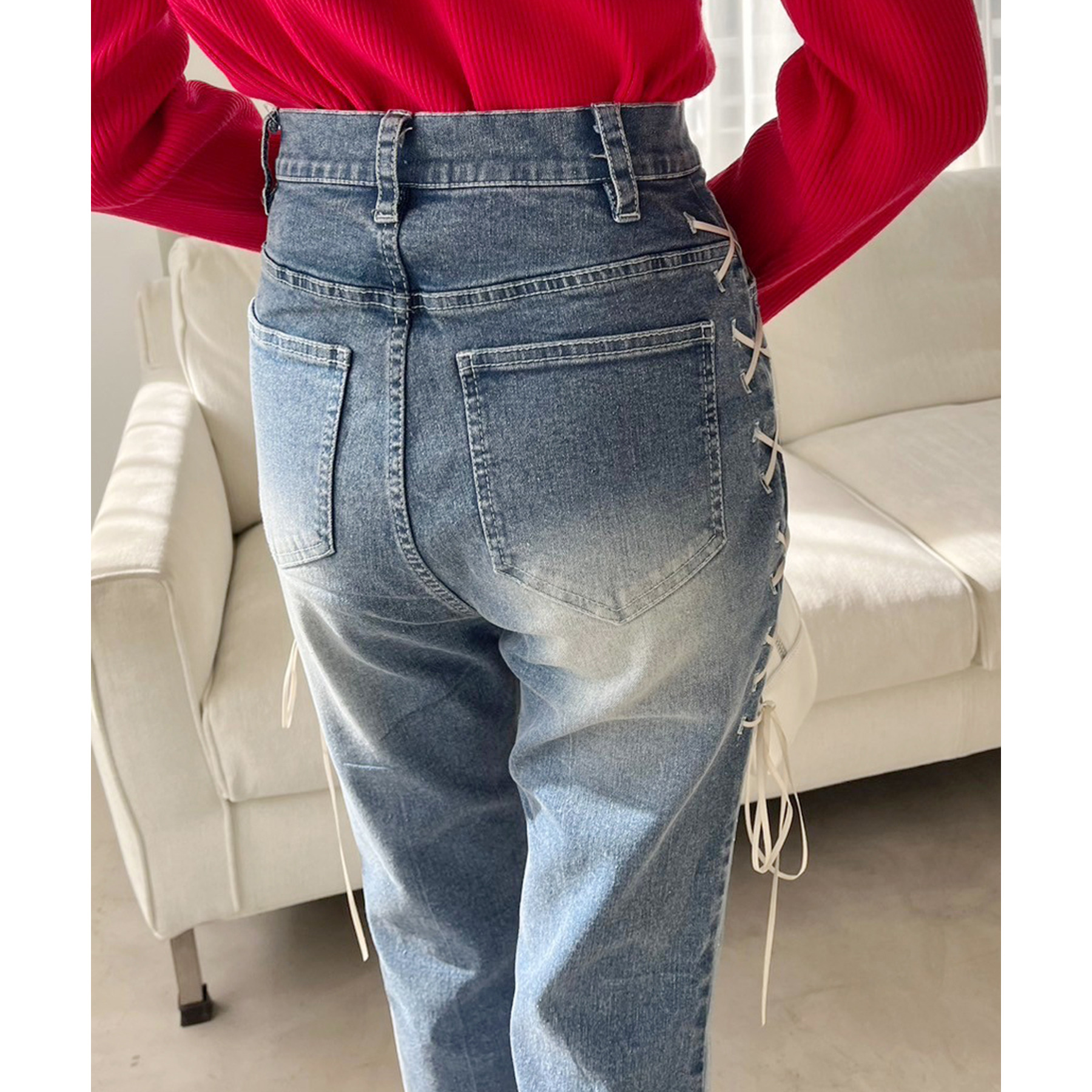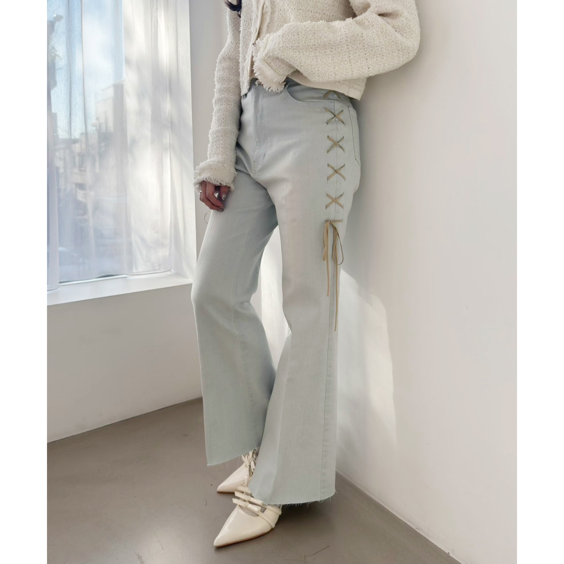 サイドのレースアップがおしゃれ見えするデニムパンツ