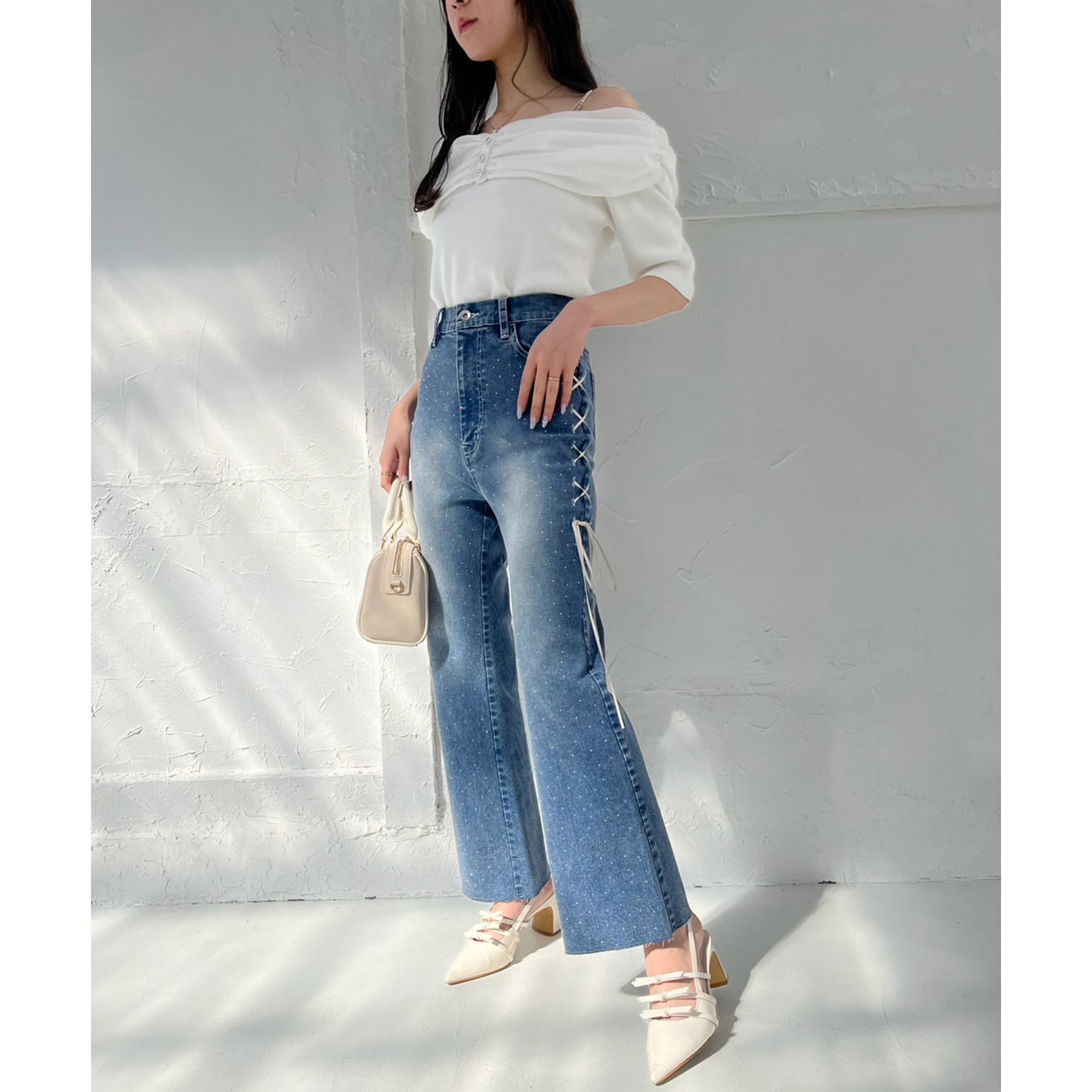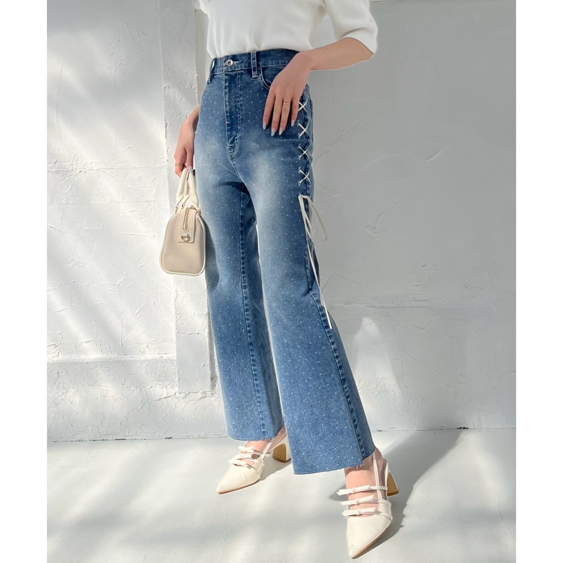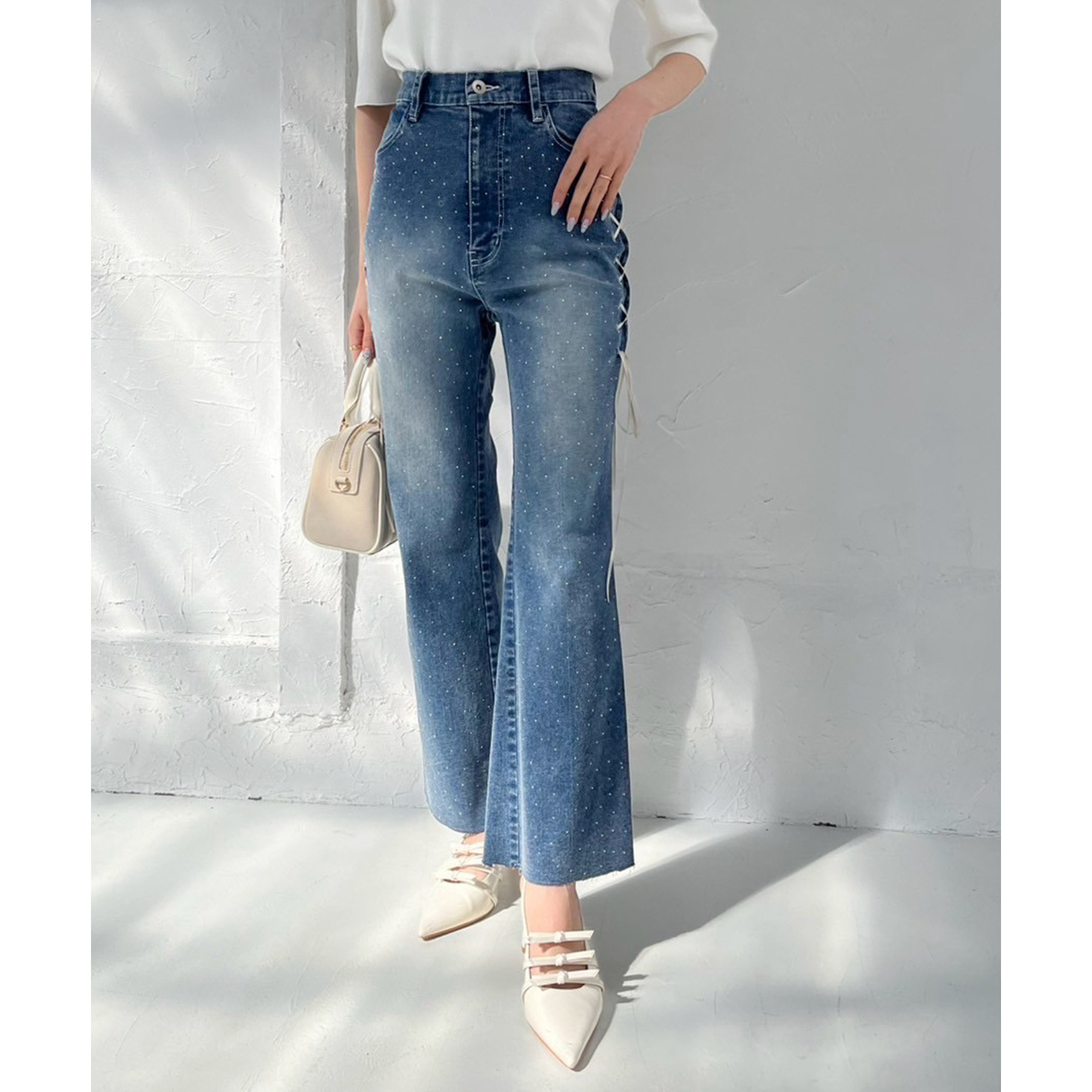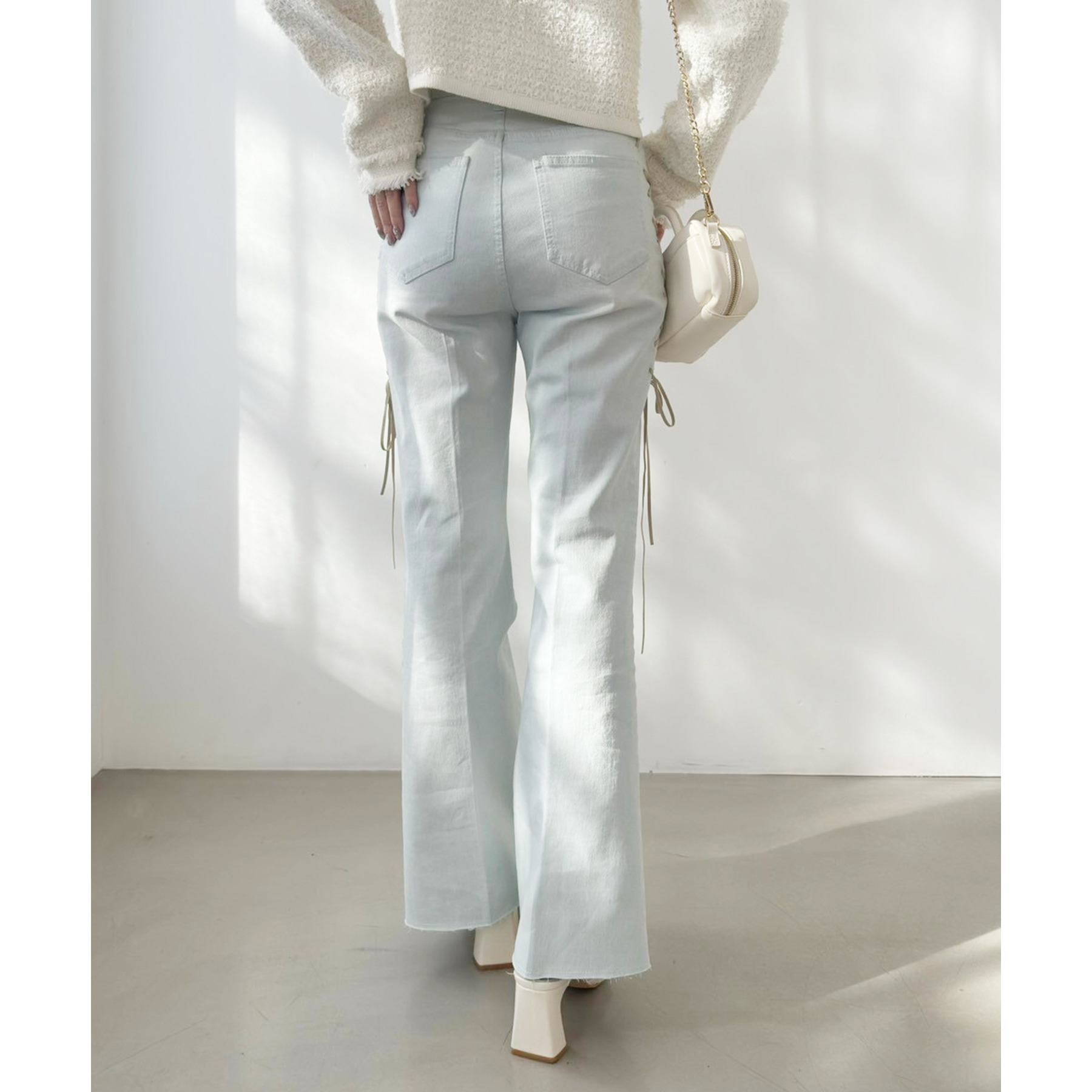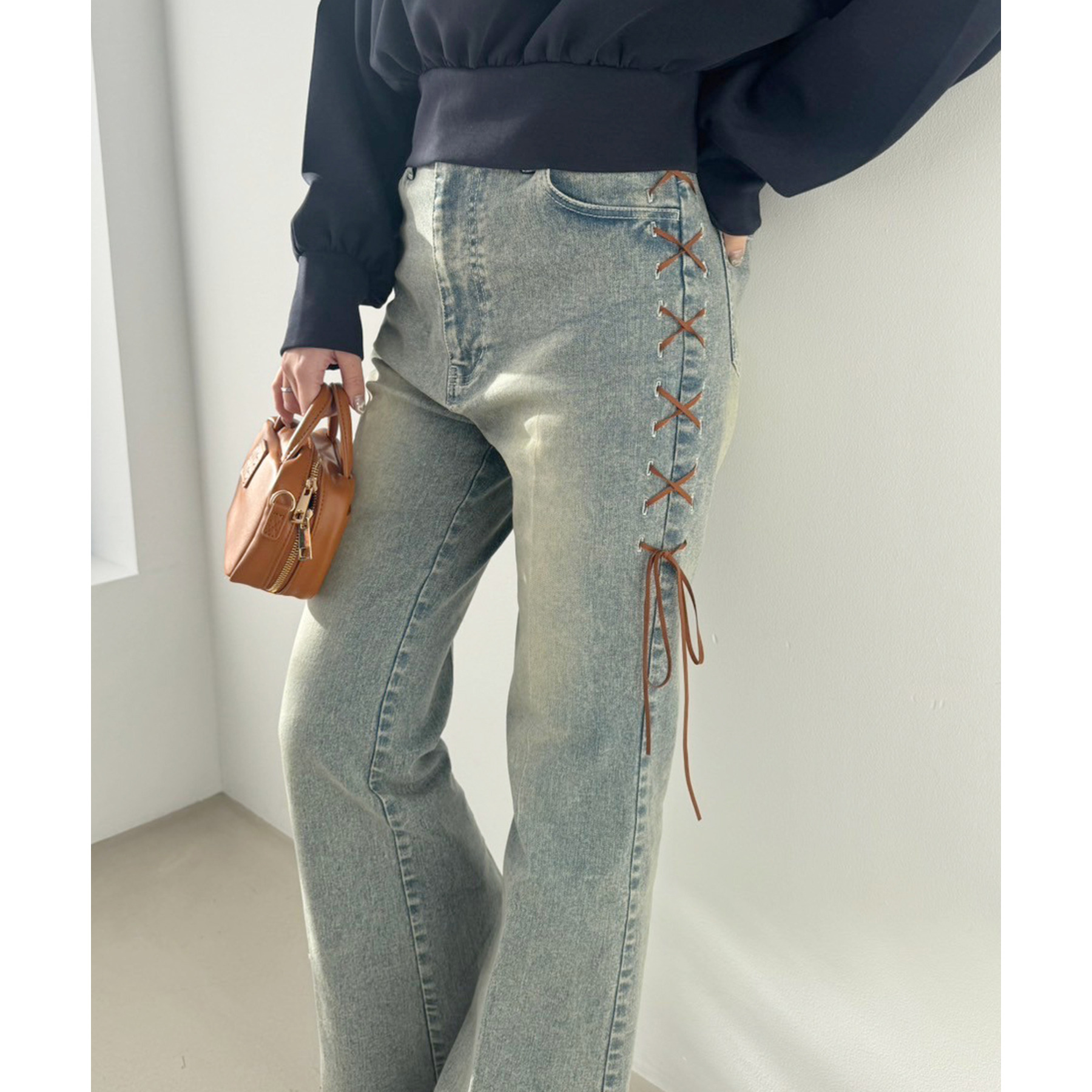 サイドのレースアップがおしゃれ見えするデニムパンツ