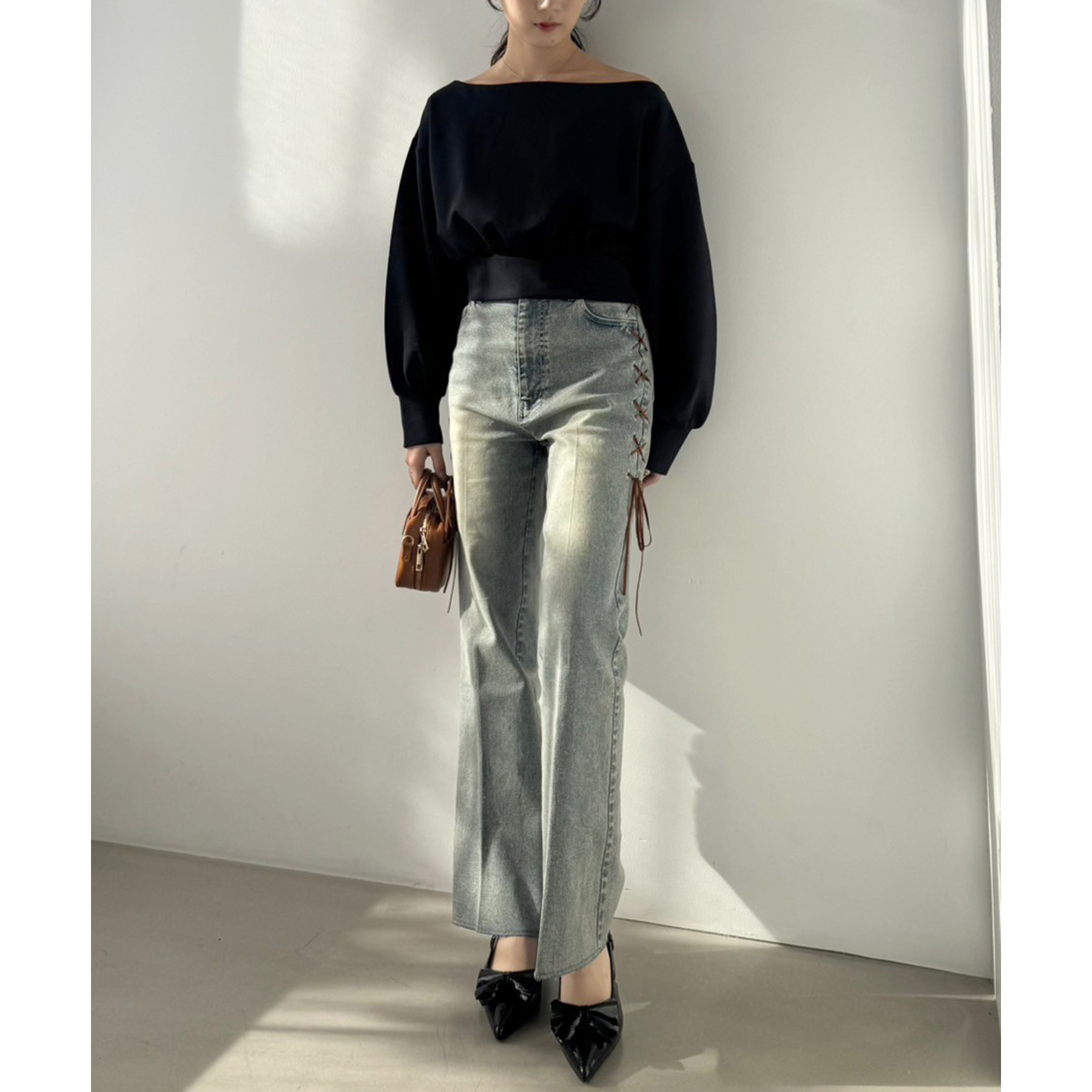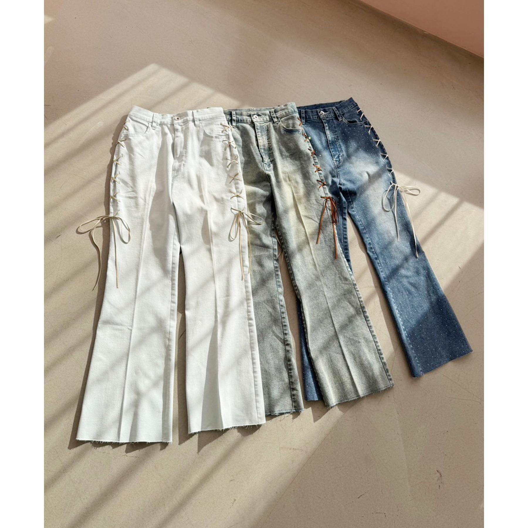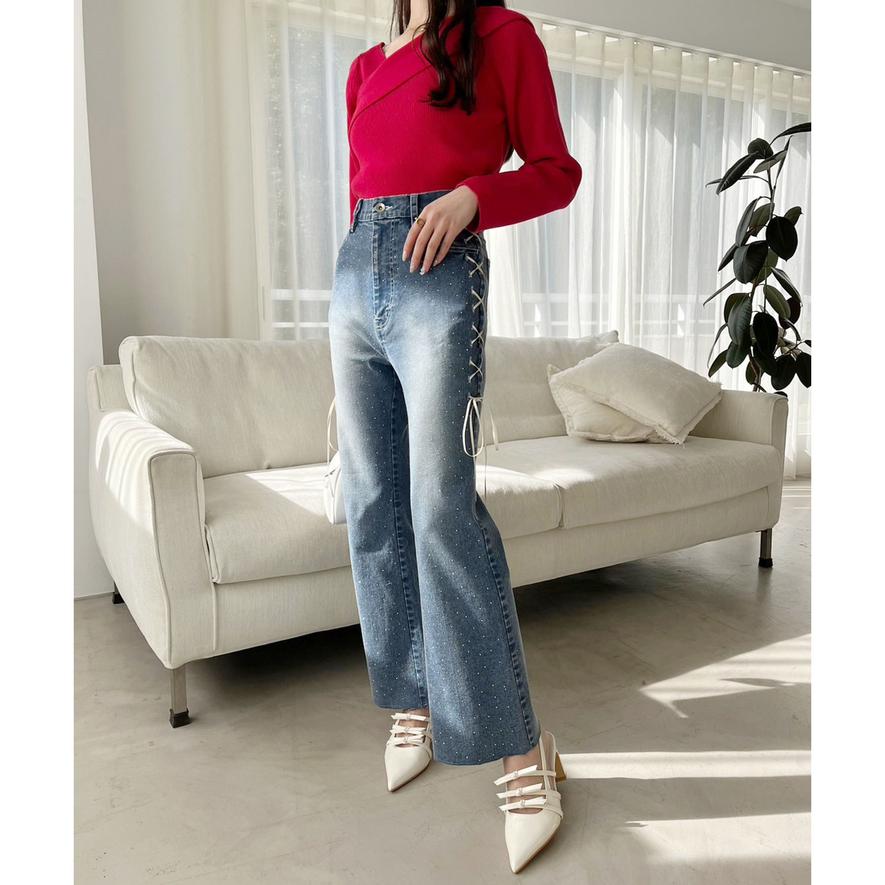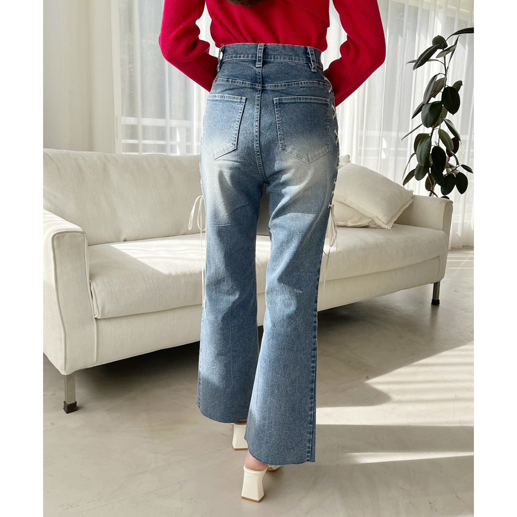 サイドのレースアップがおしゃれ見えするデニムパンツ