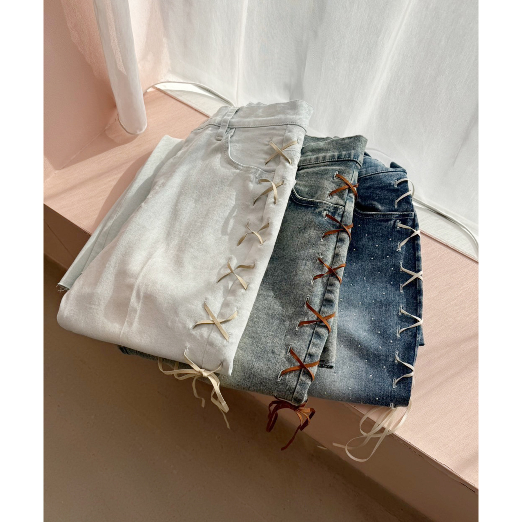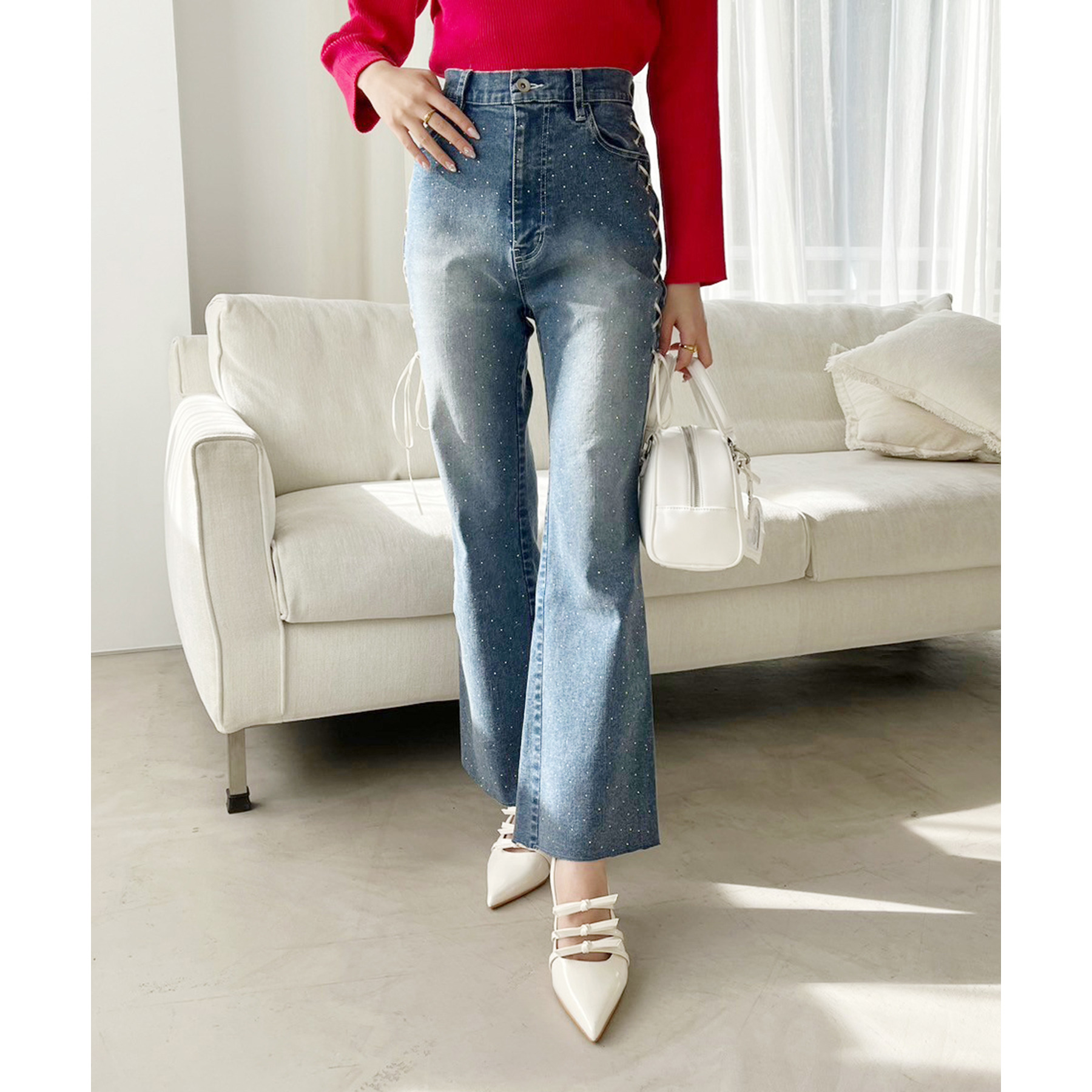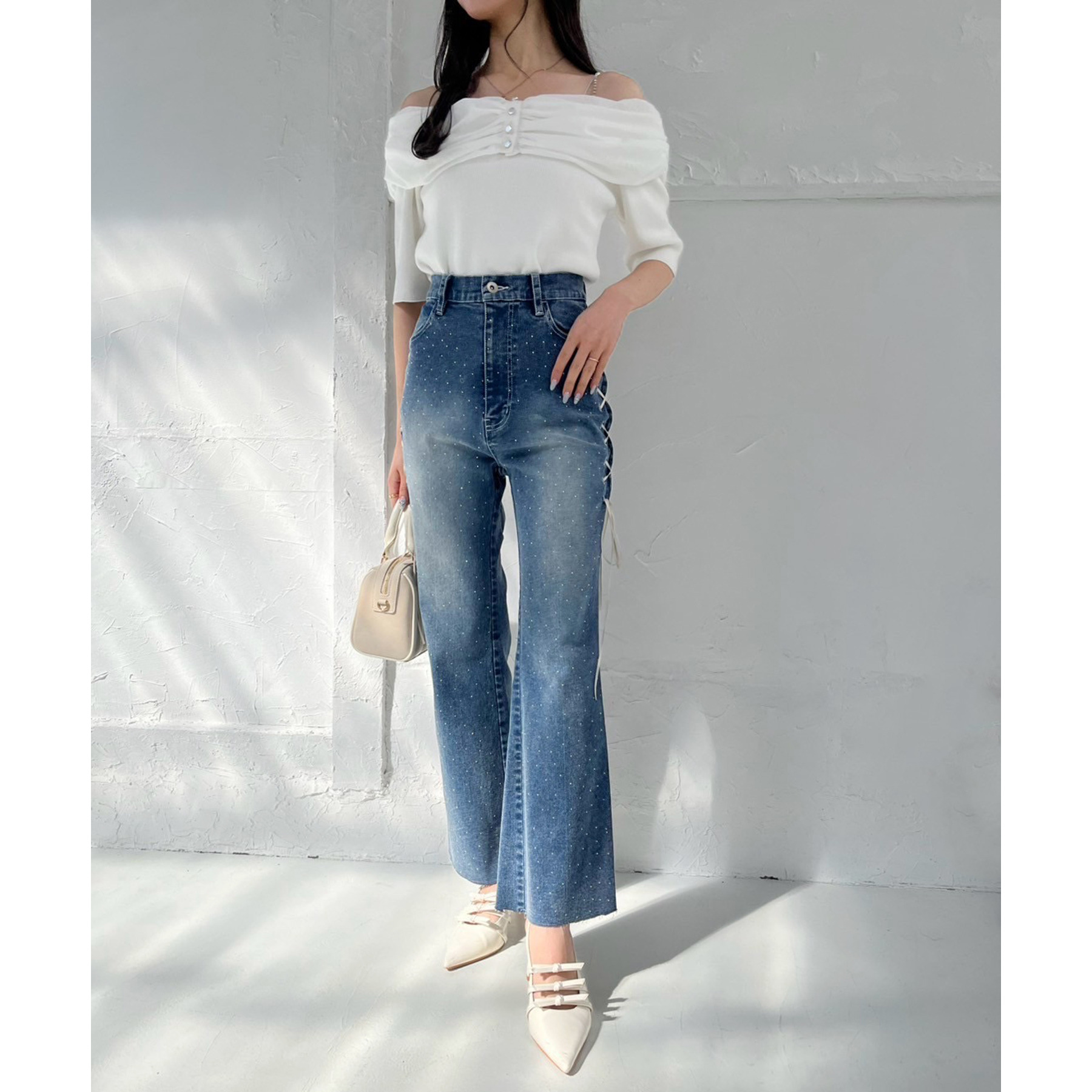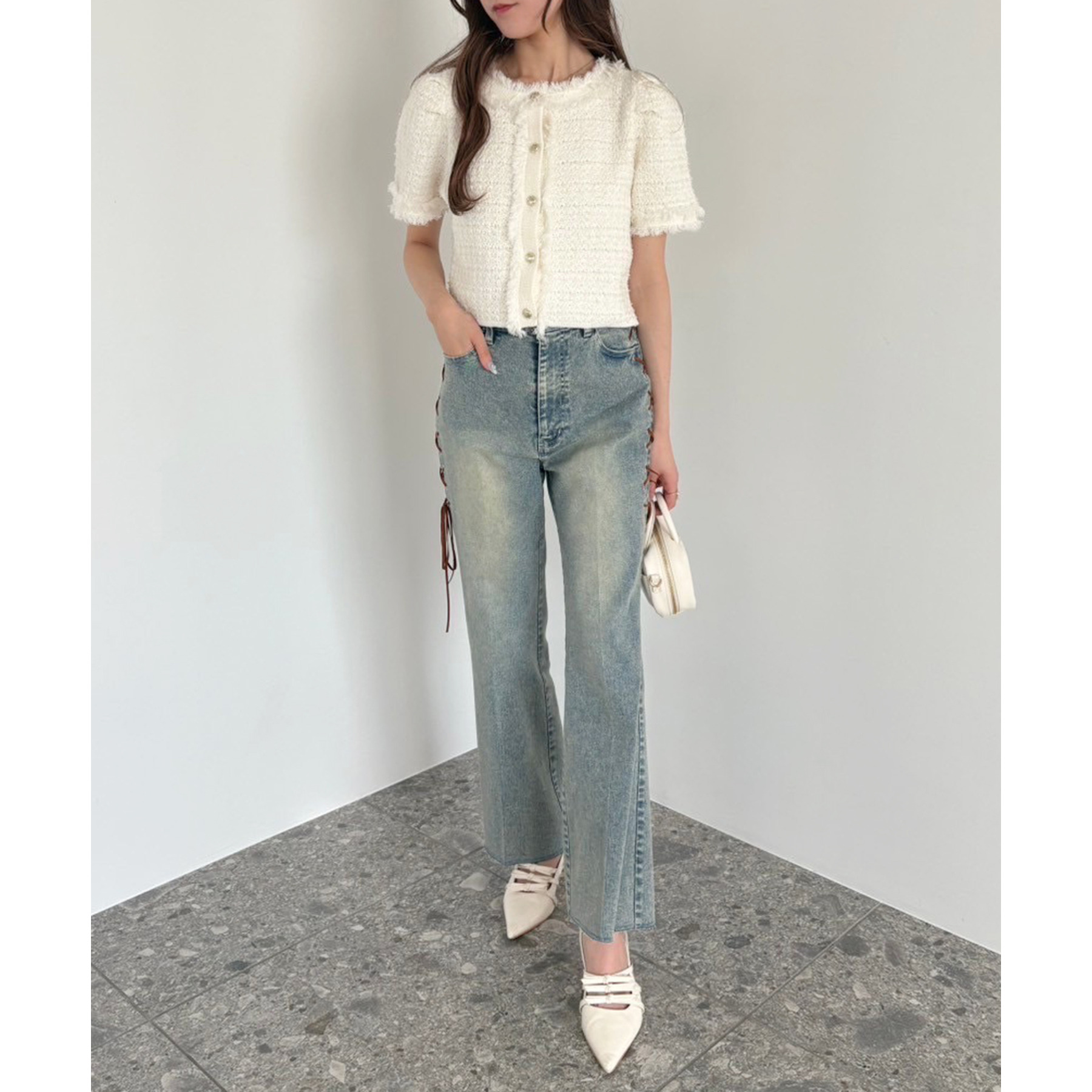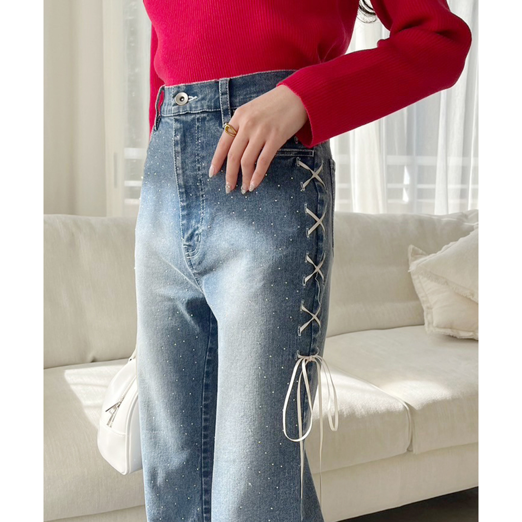 サイドのレースアップがおしゃれ見えするデニムパンツ