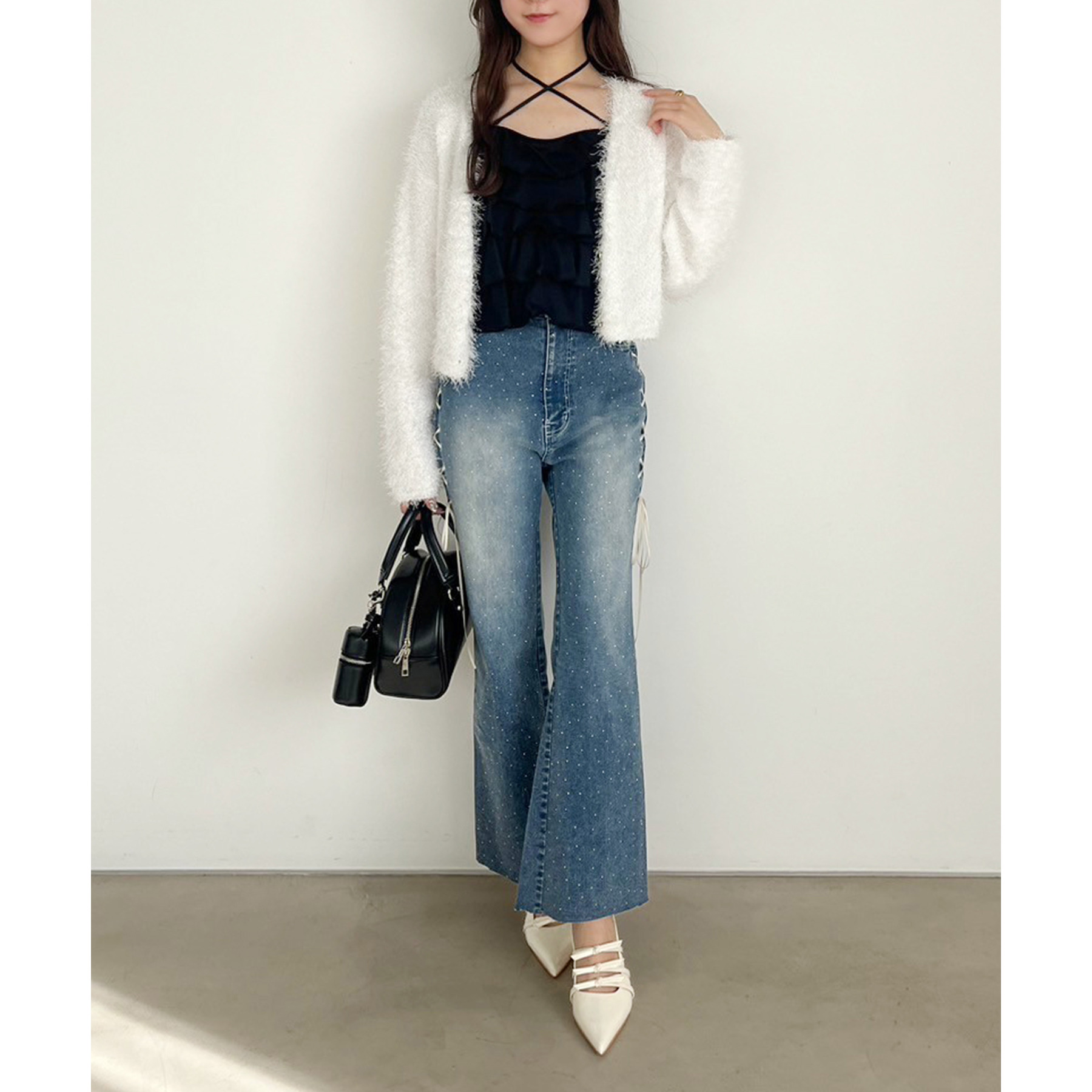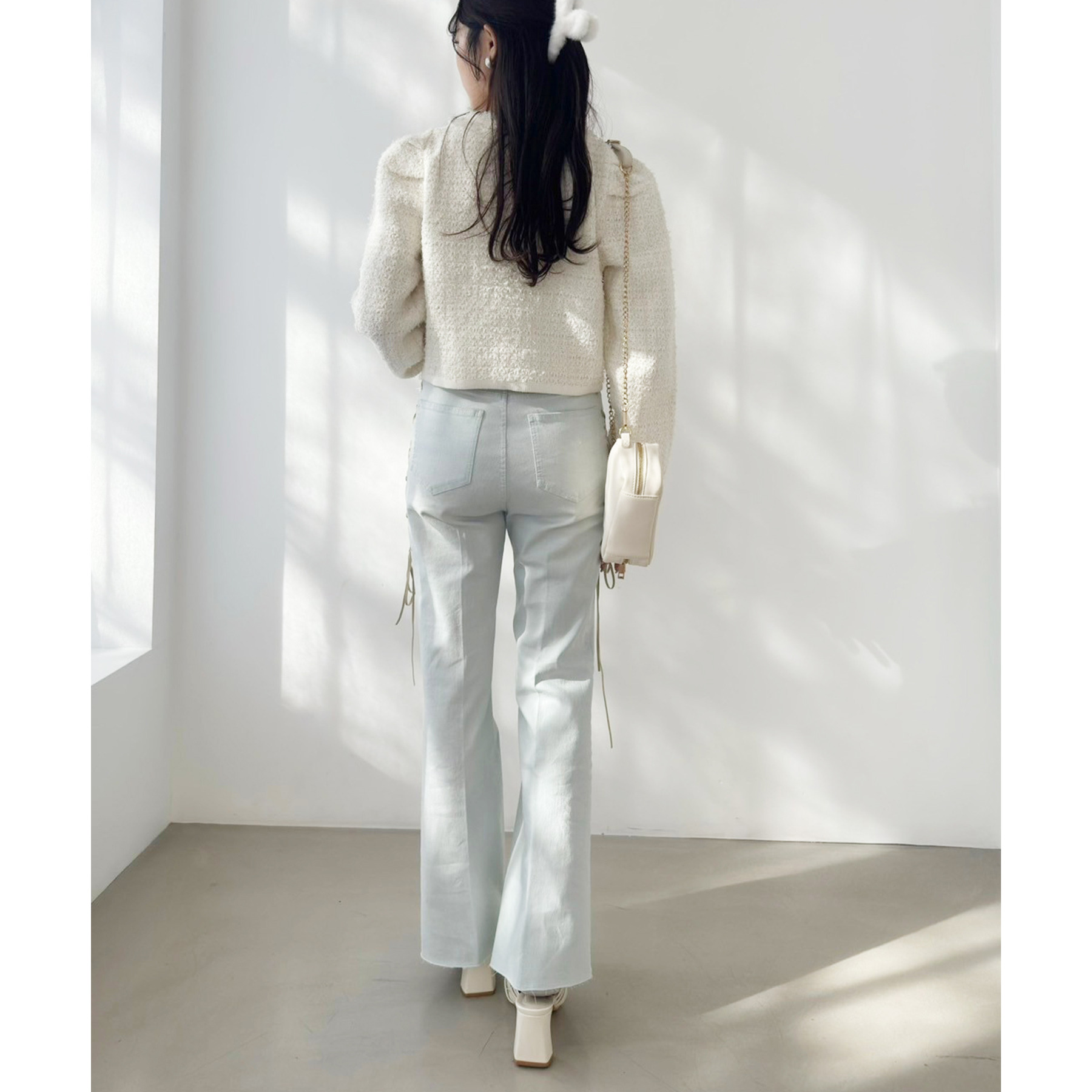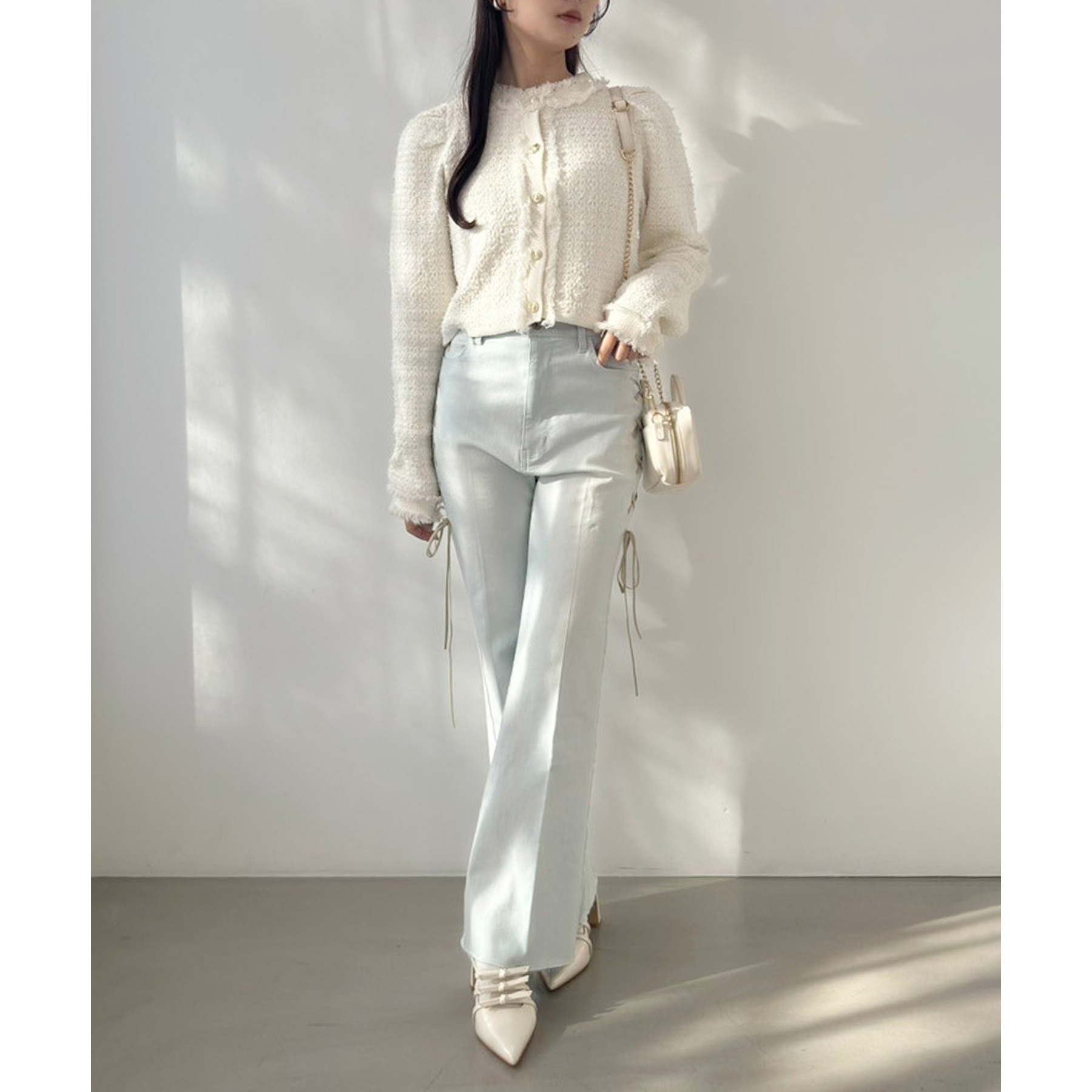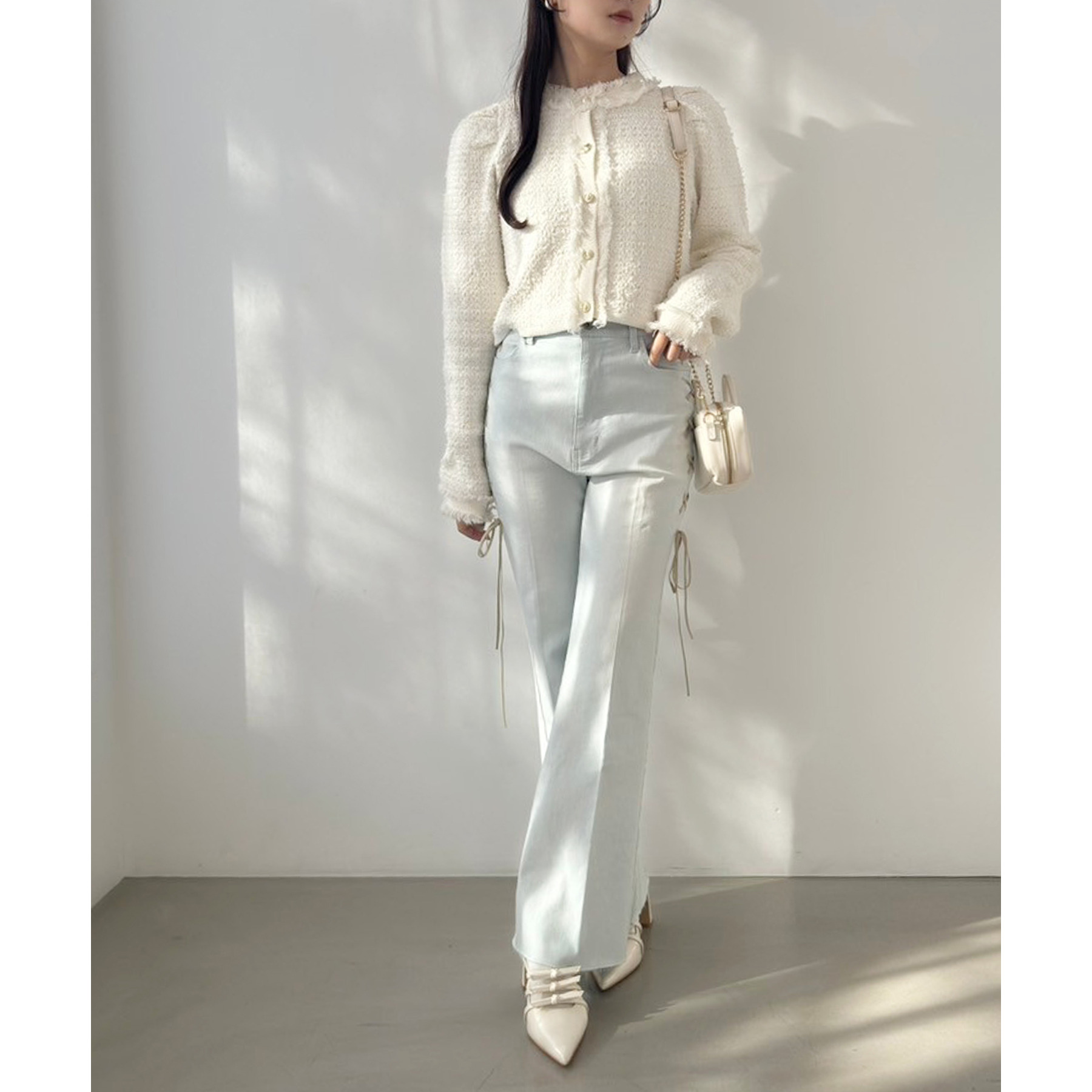 サイドのレースアップがおしゃれ見えするデニムパンツ