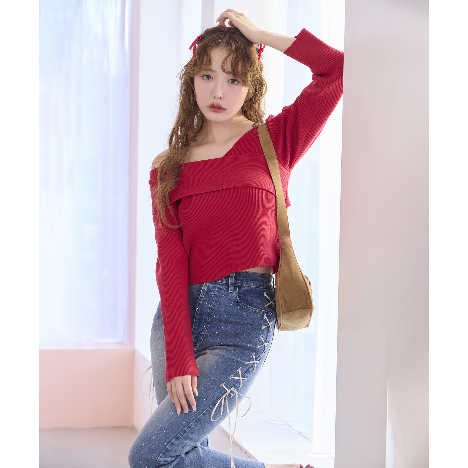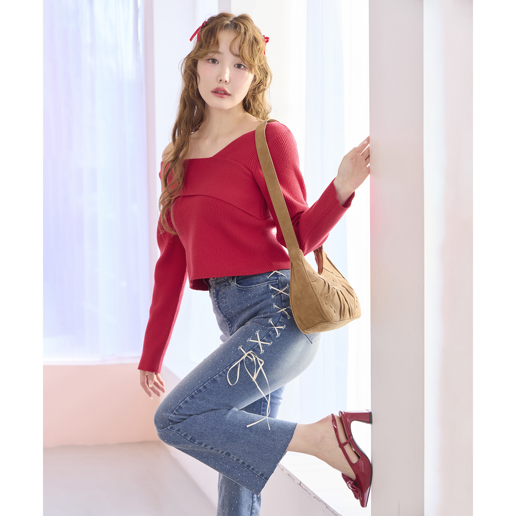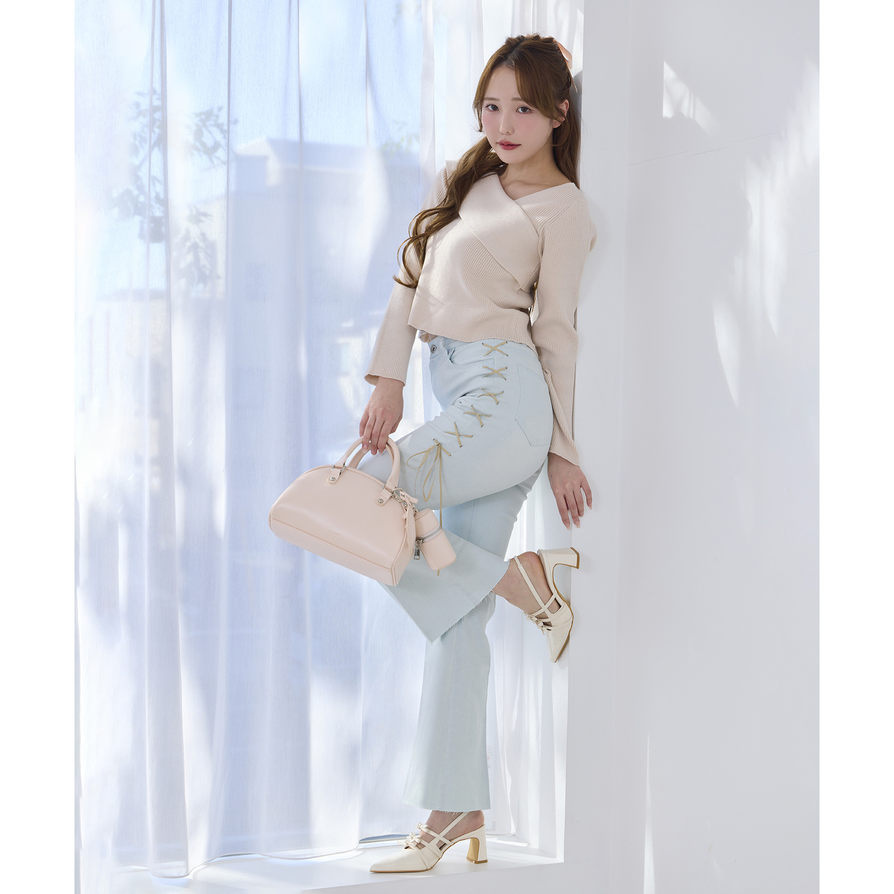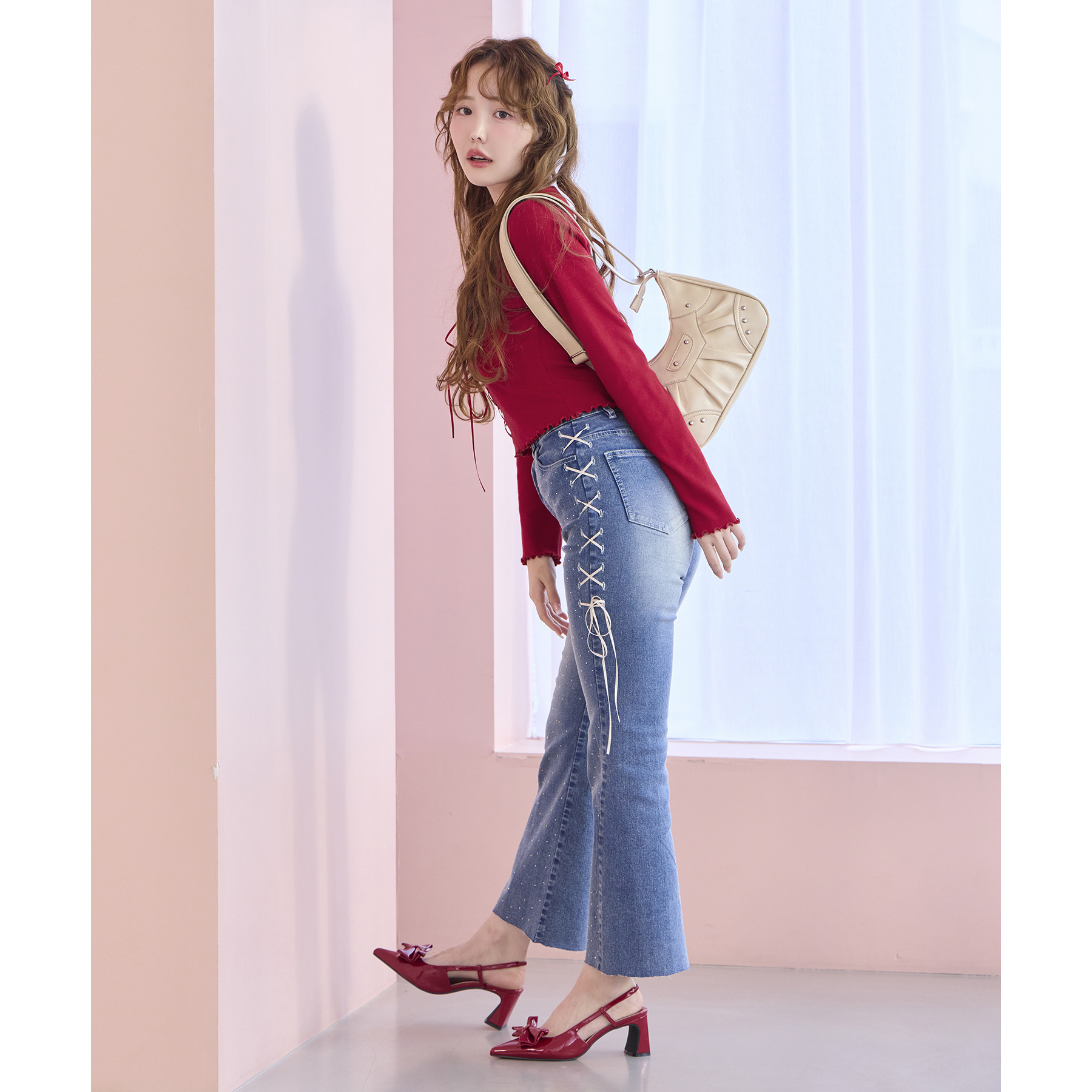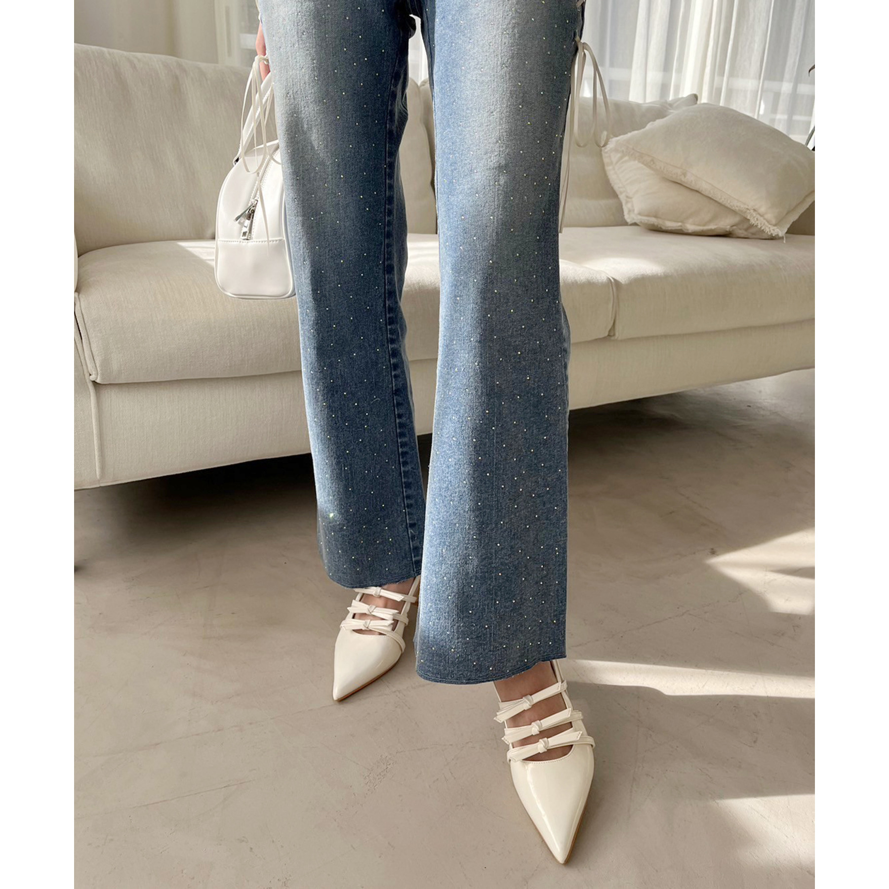 サイドのレースアップがおしゃれ見えするデニムパンツ