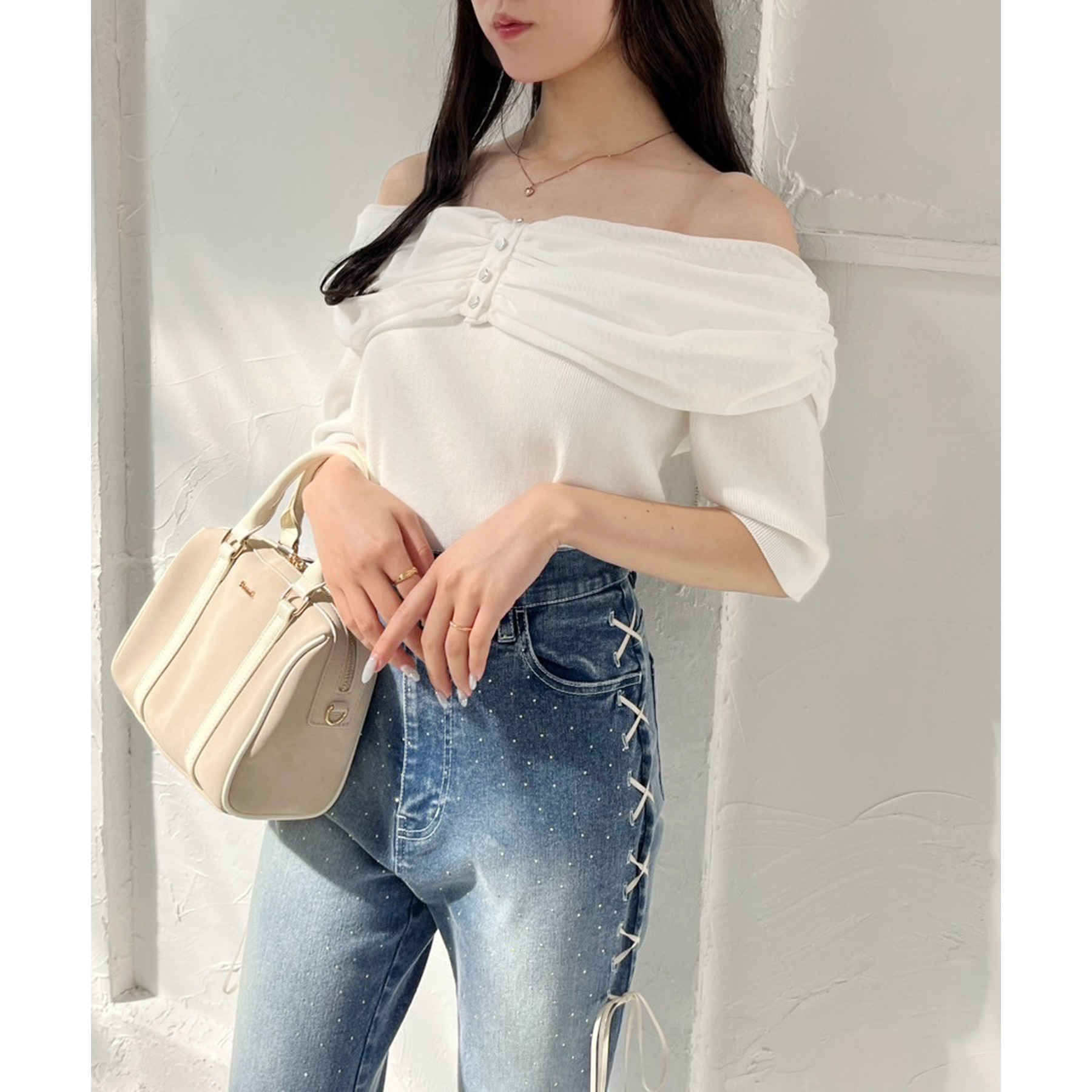 カジュアルになりやすいデニムは少し甘めなトップスとの合わせが今年らしい着こなしでおすすめ。
