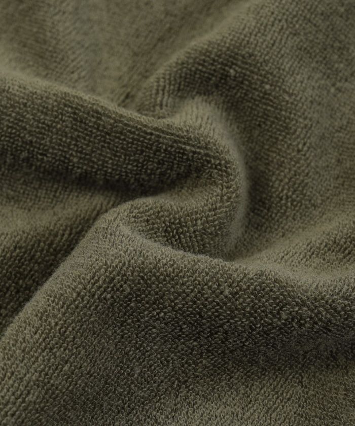 細かいパイル素材を使用している為、裁ち目から細かな繊維が出てくることがございます。繰り返しのお洗濯で解消されますので、予めご了承ください。