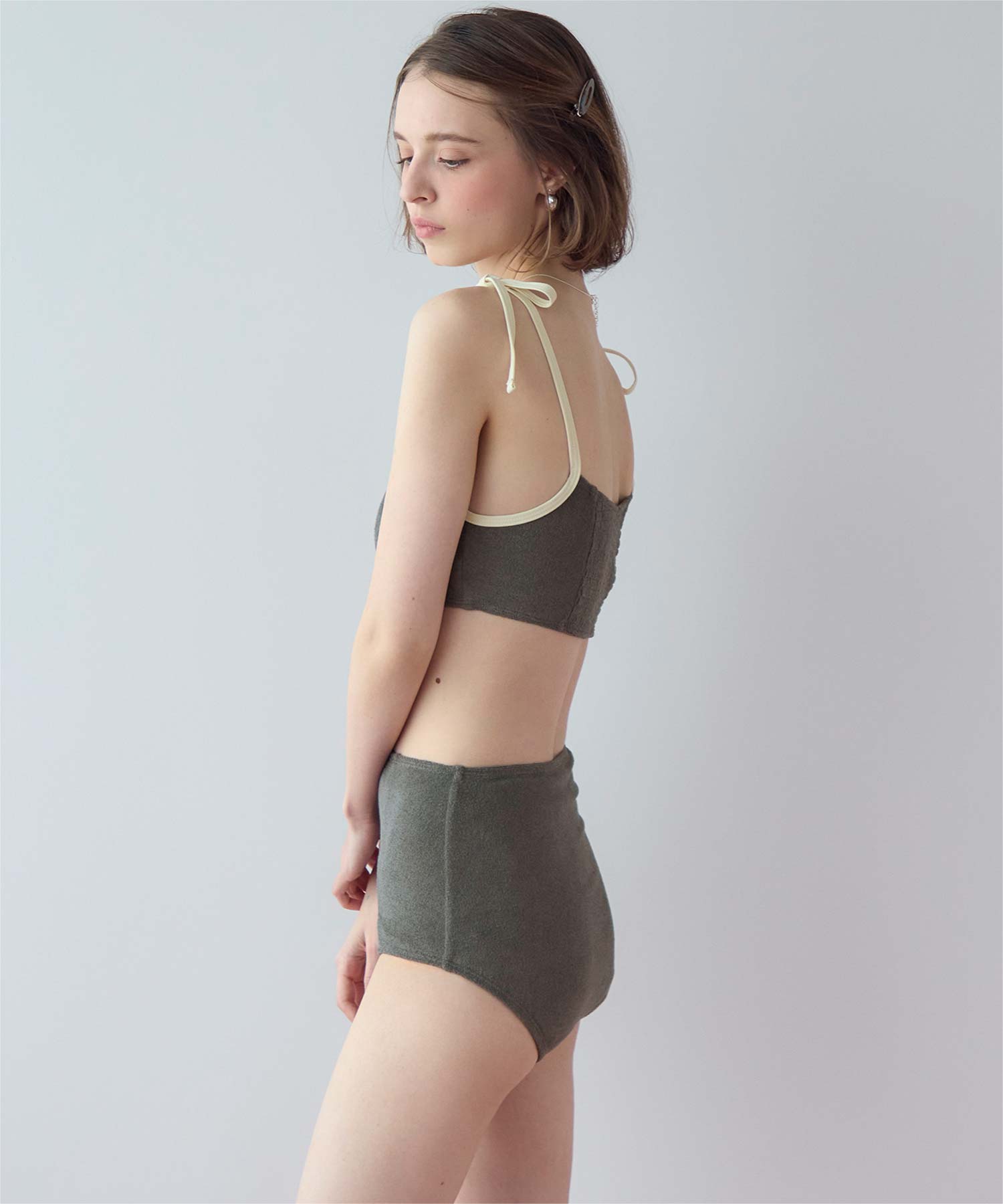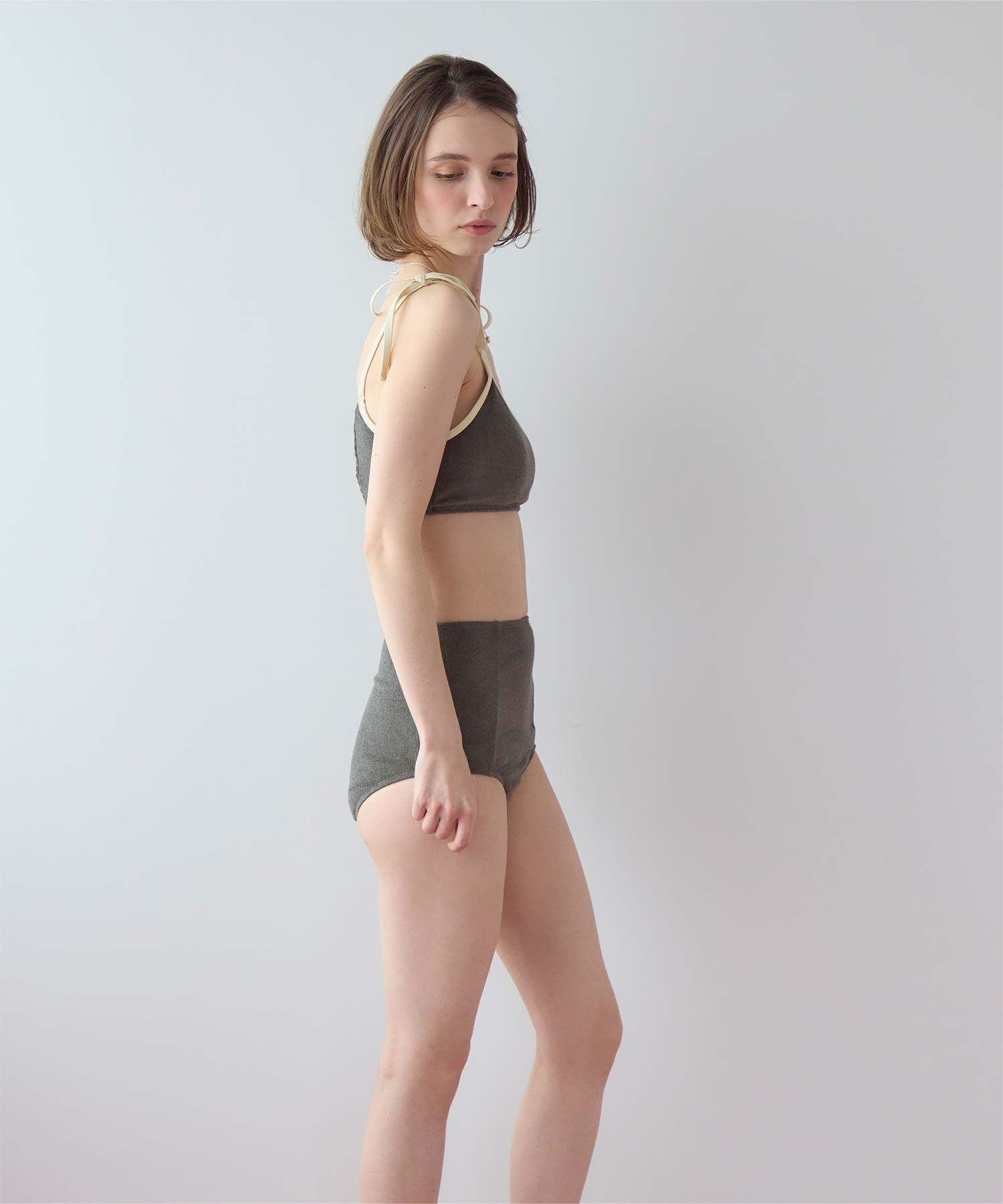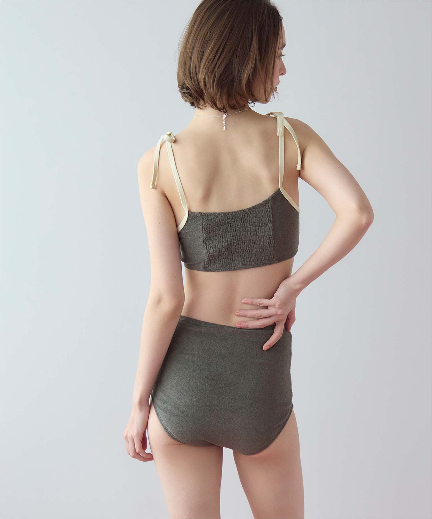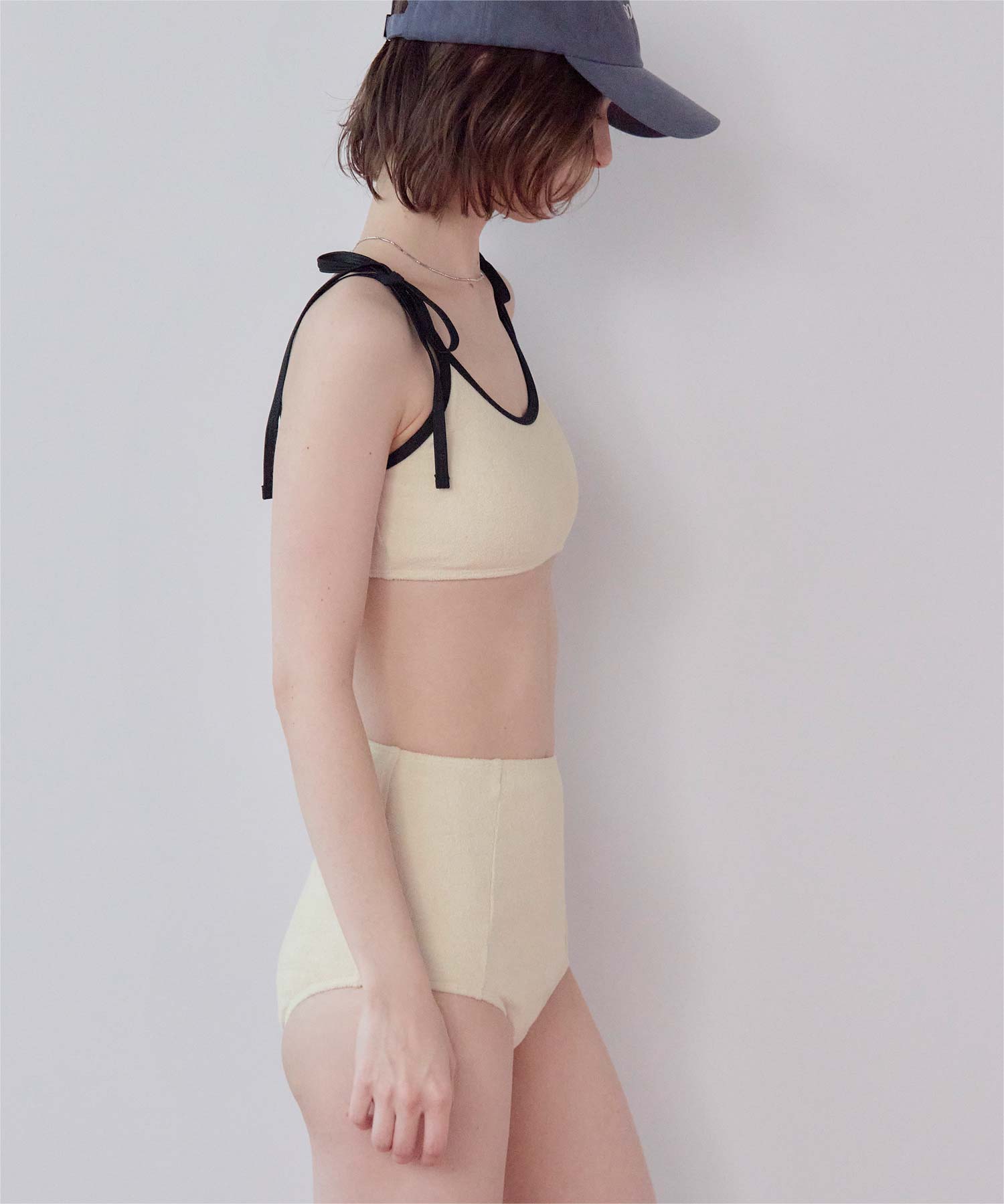 ・こなれ感のある細かめのパイル地の質感が大人可愛いハイウエストビキニ。