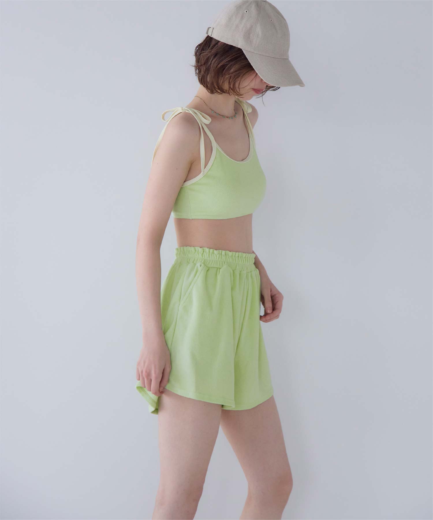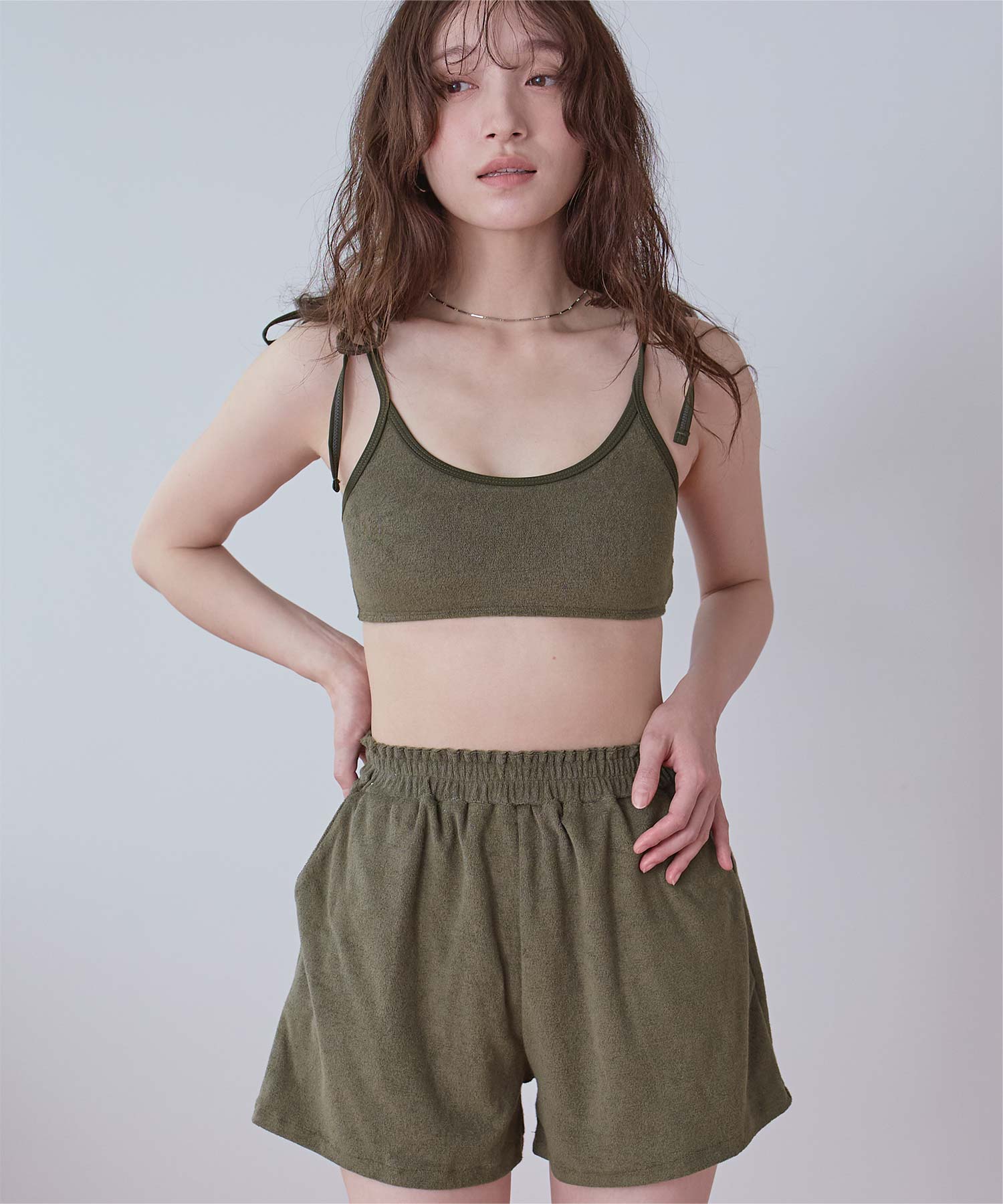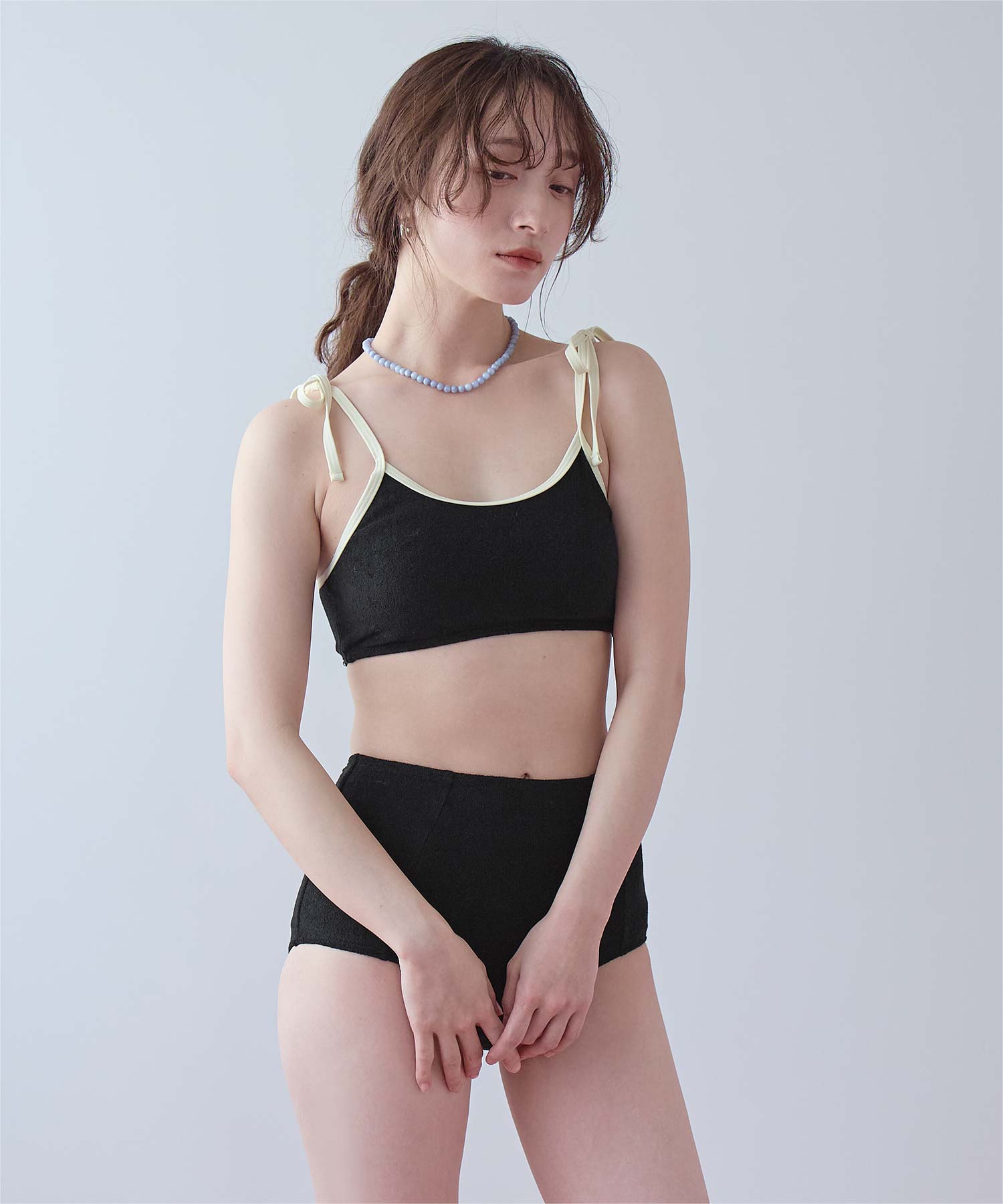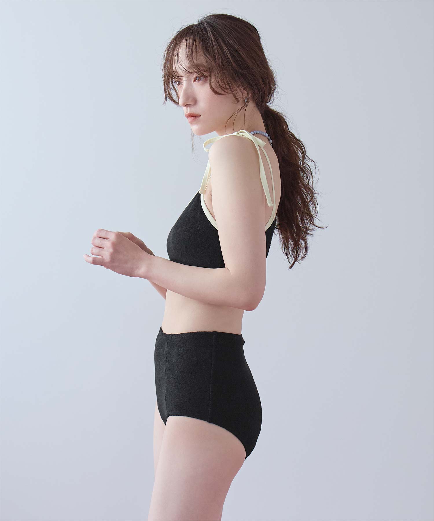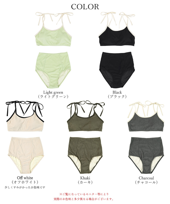 ・こなれ感のある細かめのパイル地の質感が大人可愛いハイウエストビキニ。