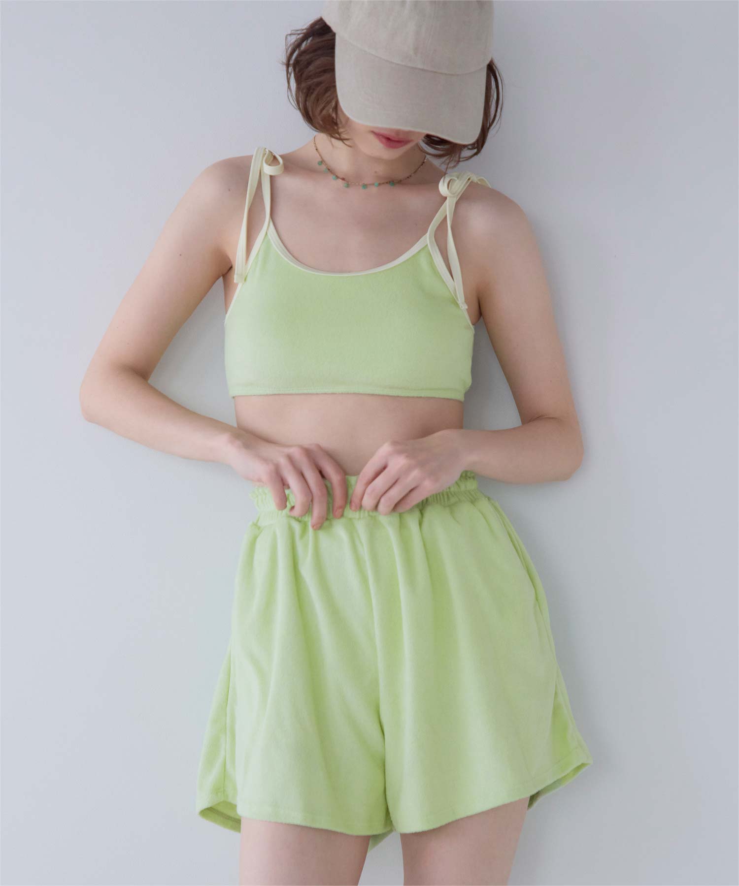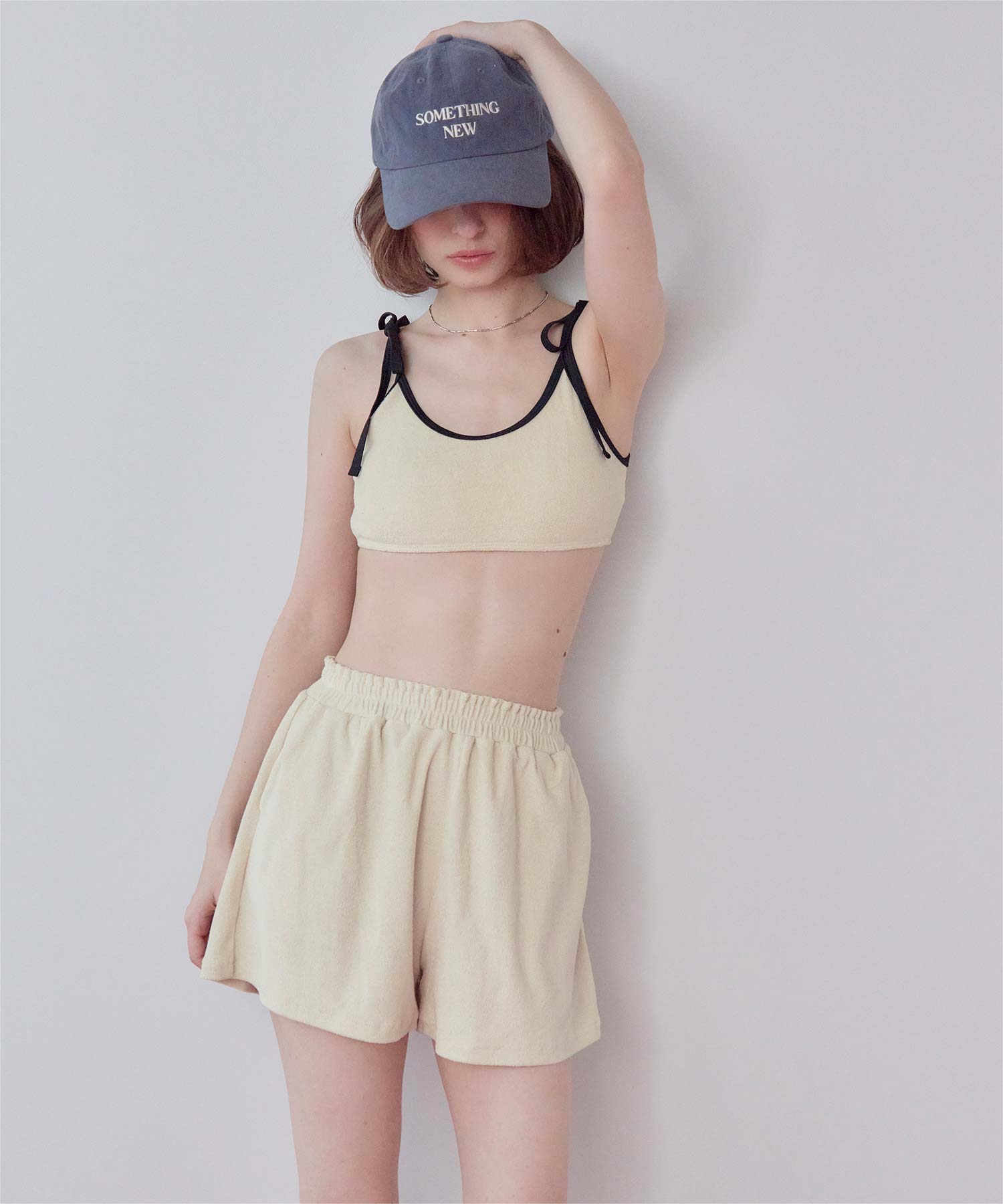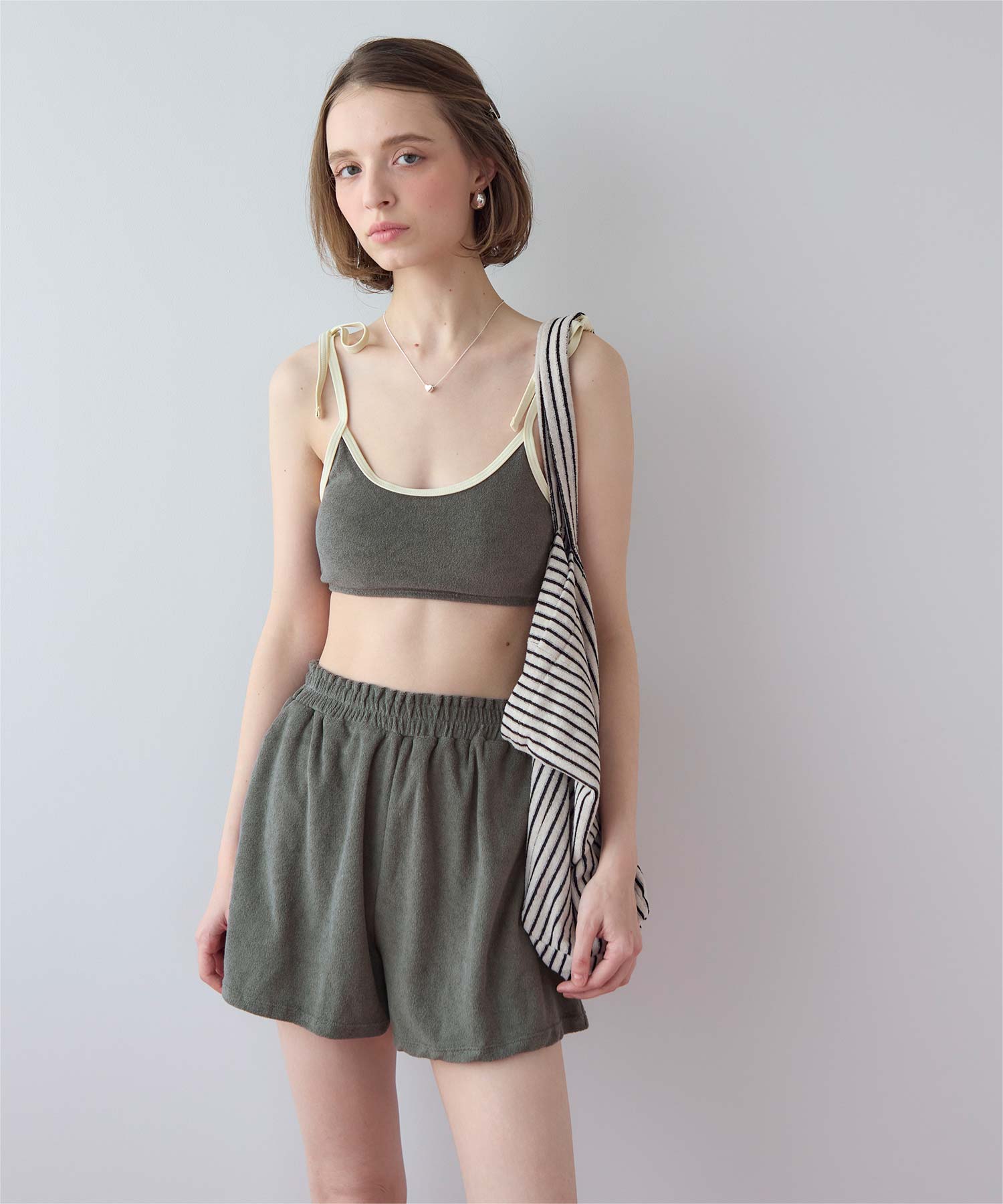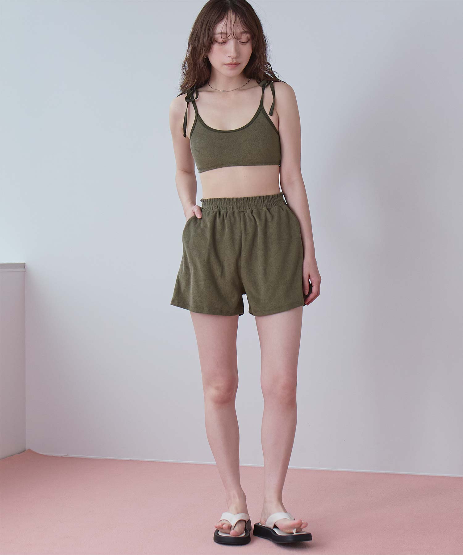 ・こなれ感のある細かめのパイル地の質感が大人可愛いハイウエストビキニ。