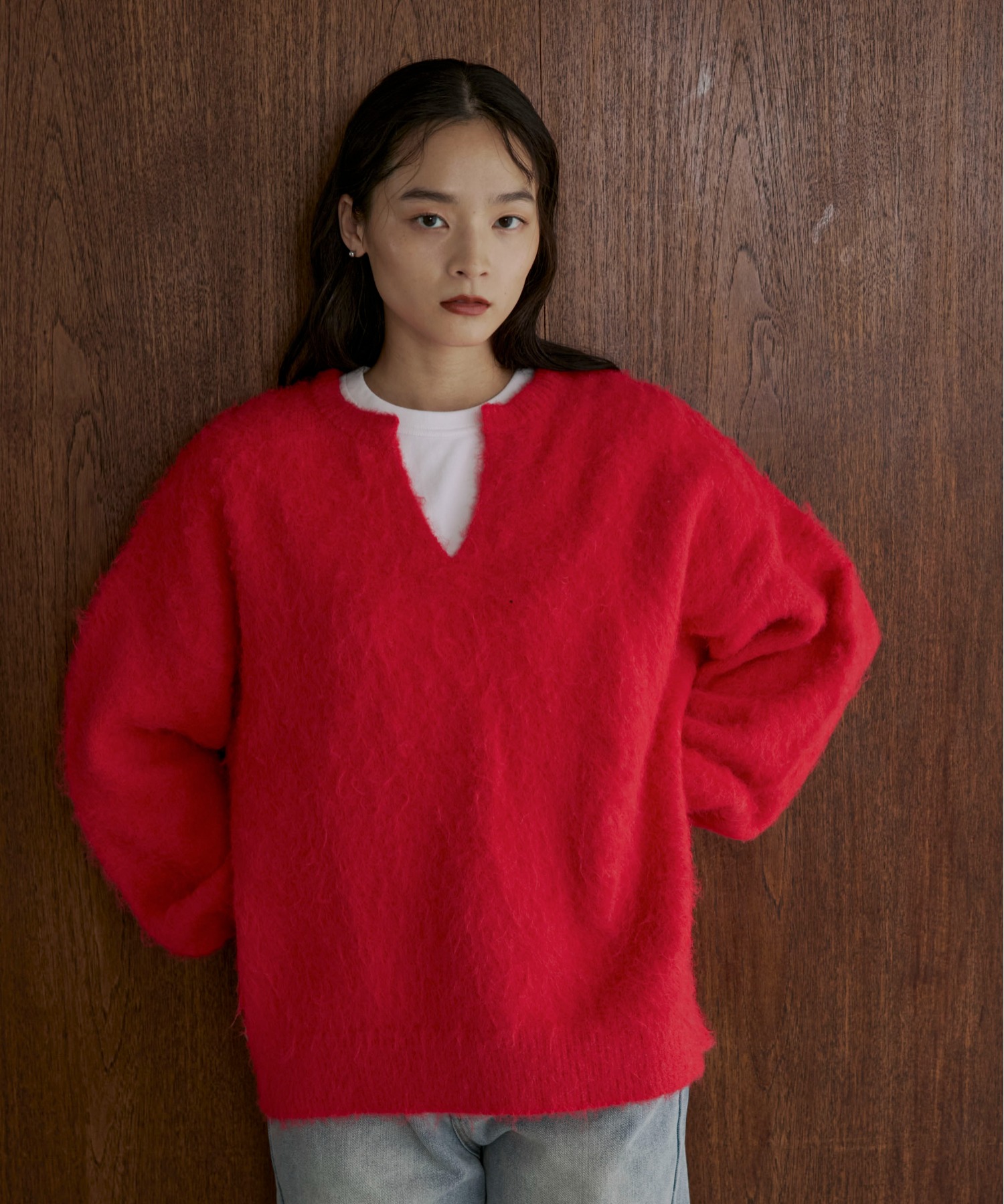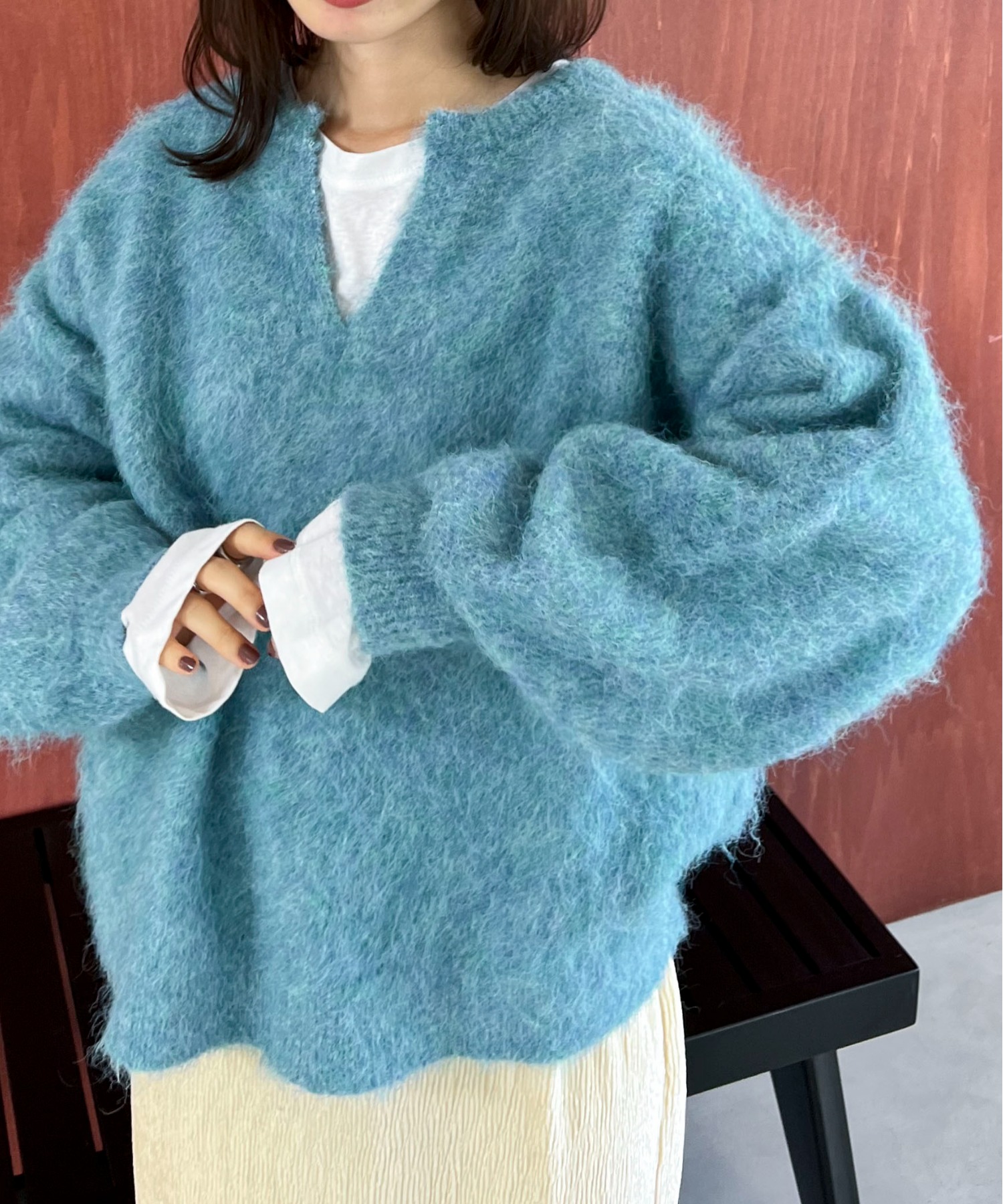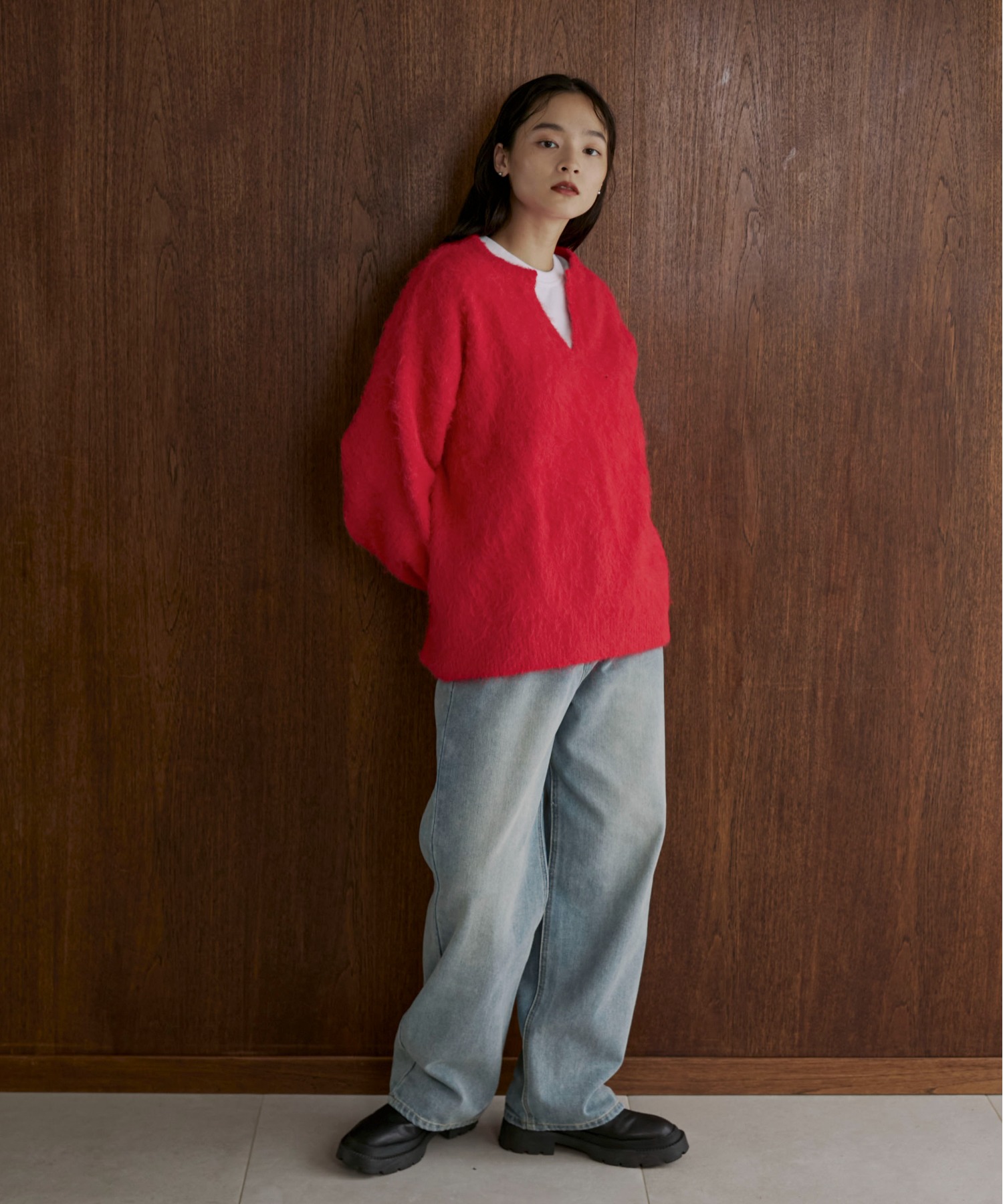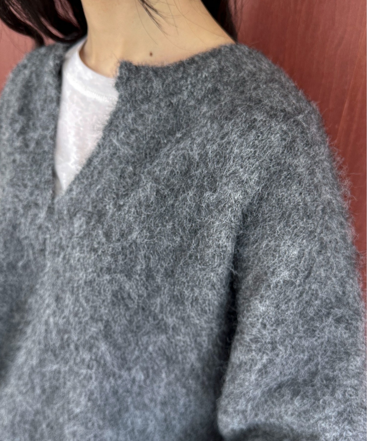 【ハンドウォッシャブル】ウール混起毛キーネックニット