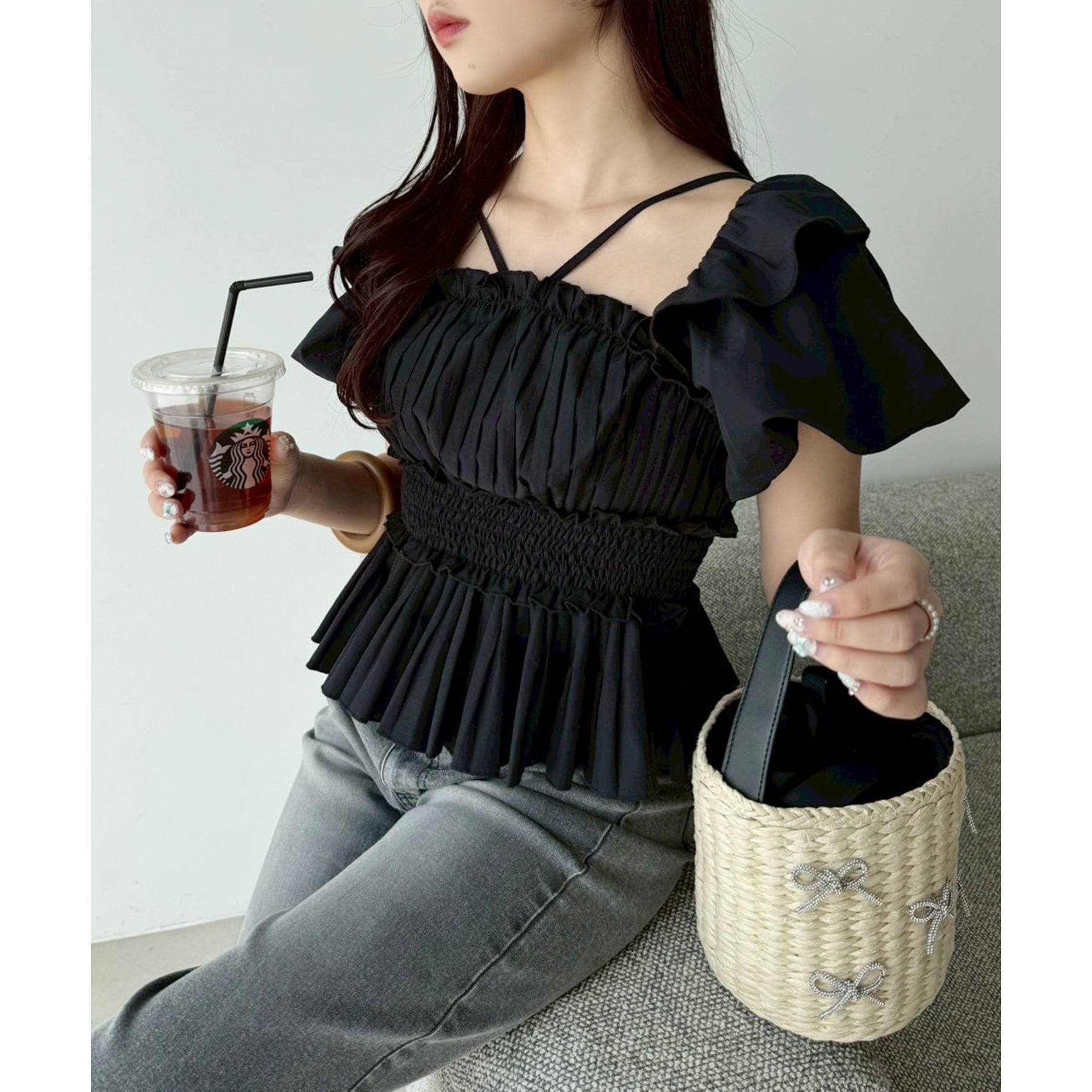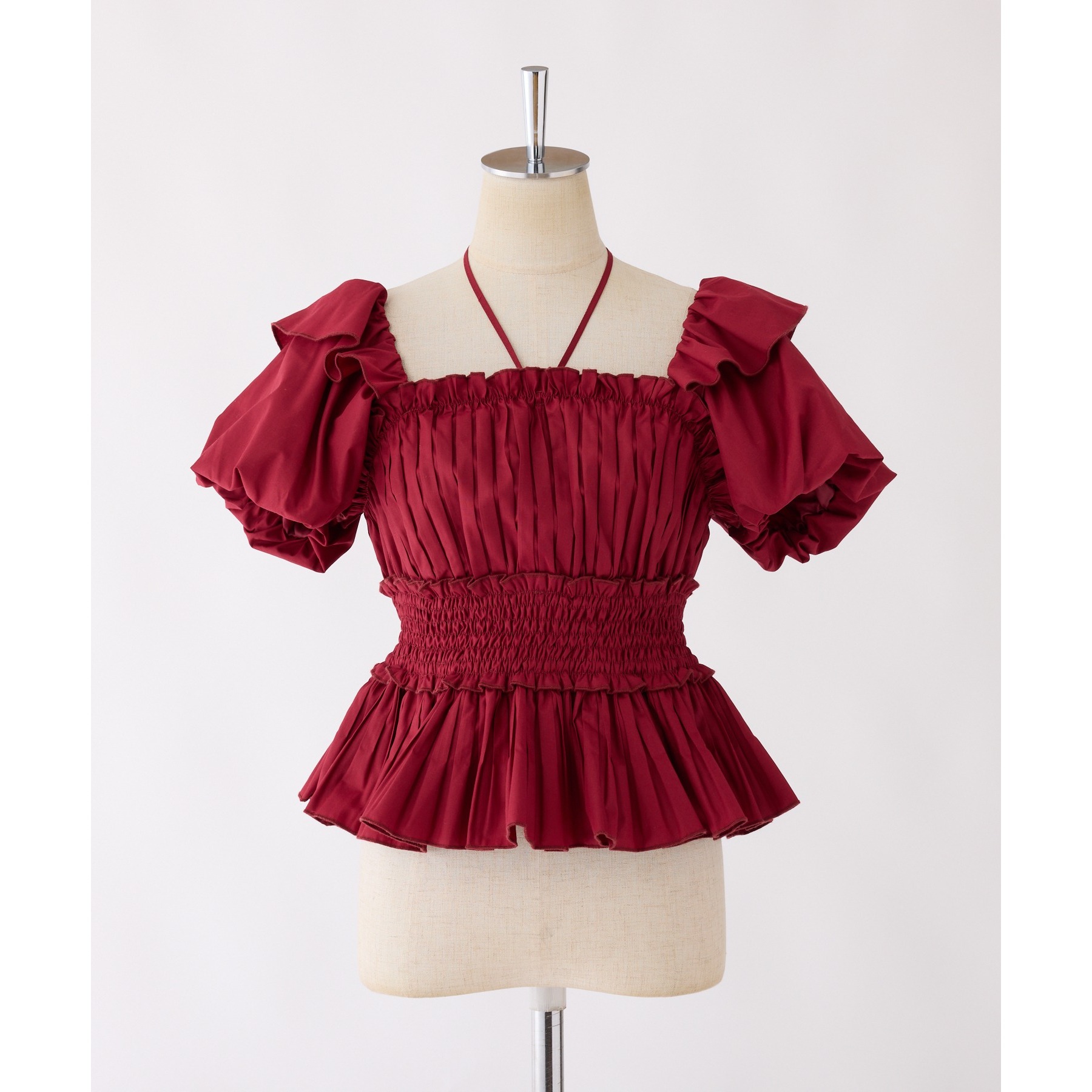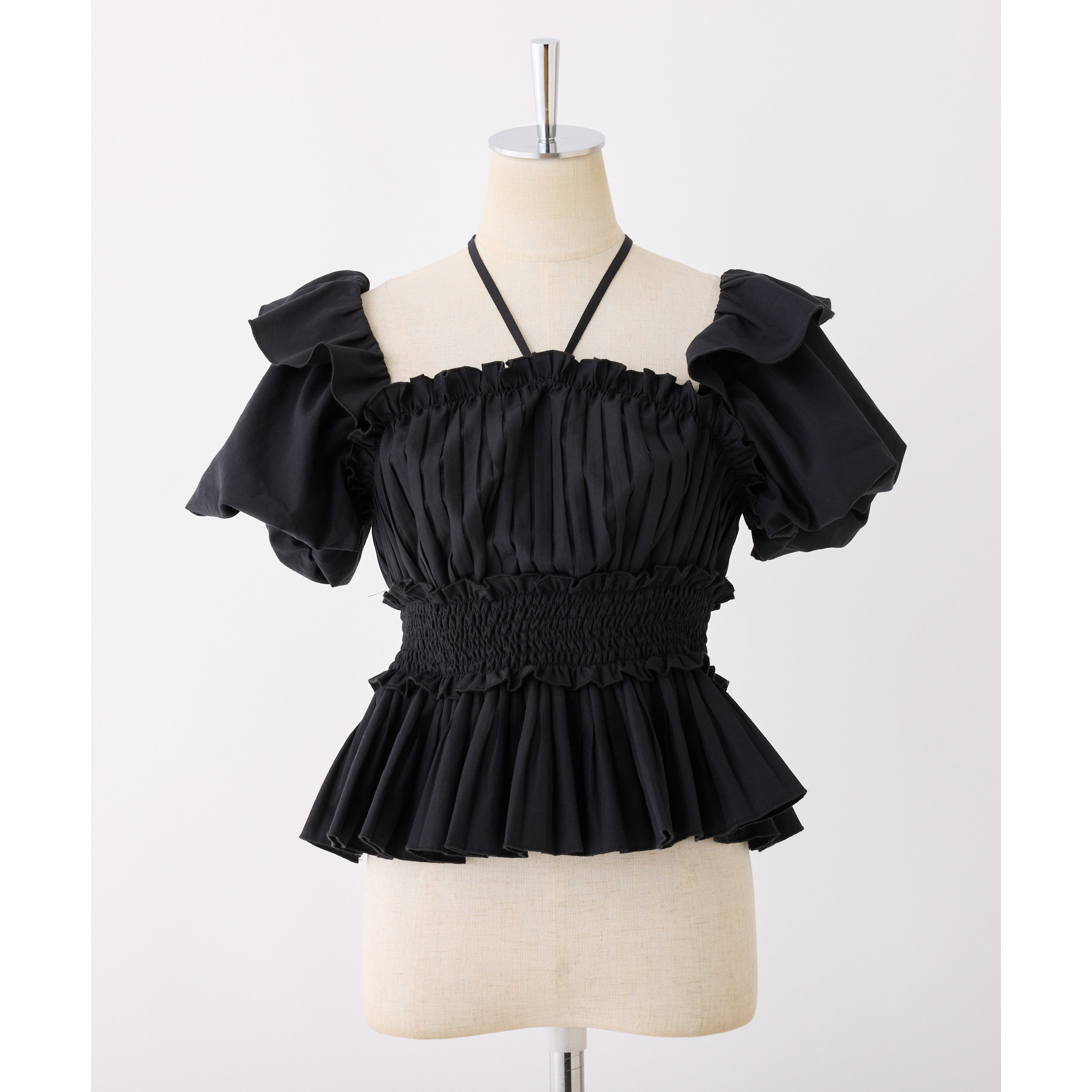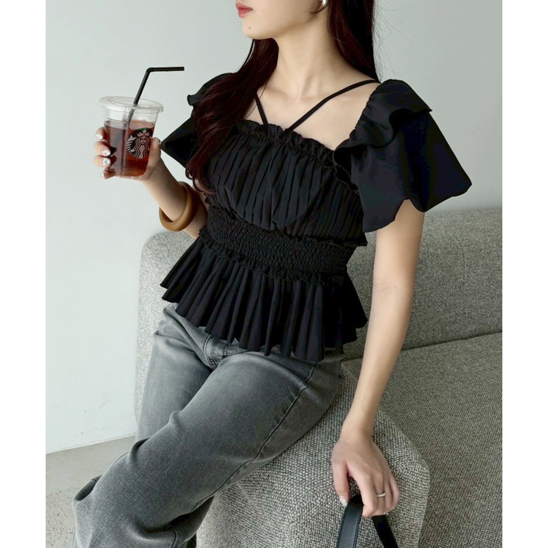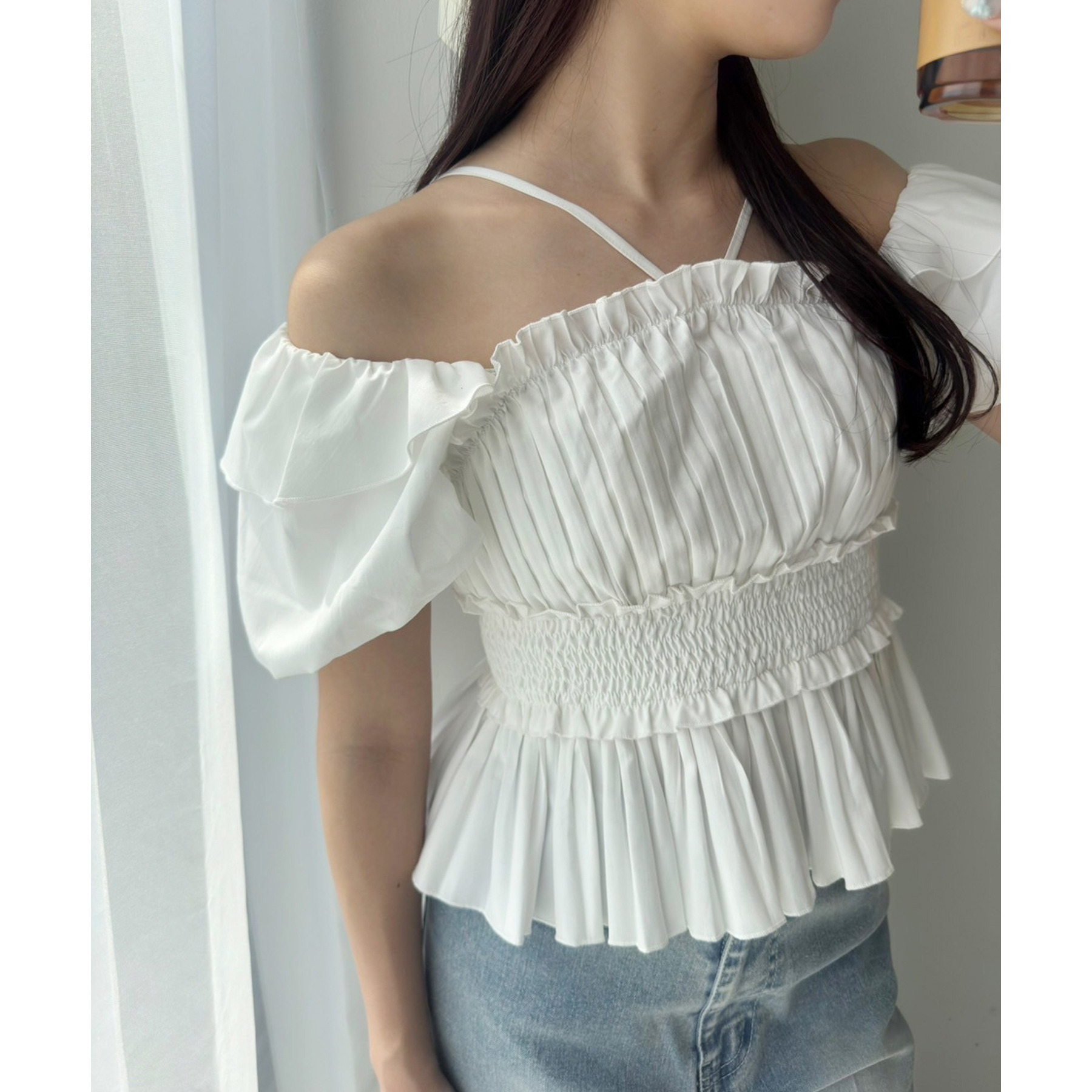 繊細なプリーツ素材を使用した、立体感のあるペプラムデザインが魅力の一枚。