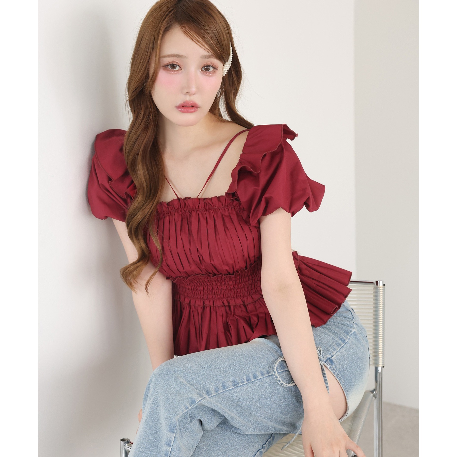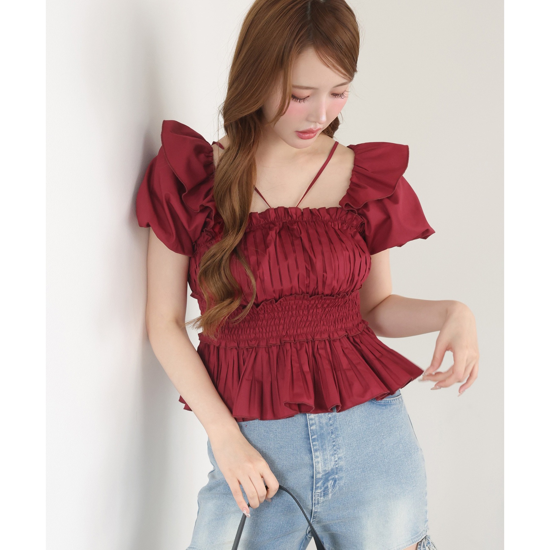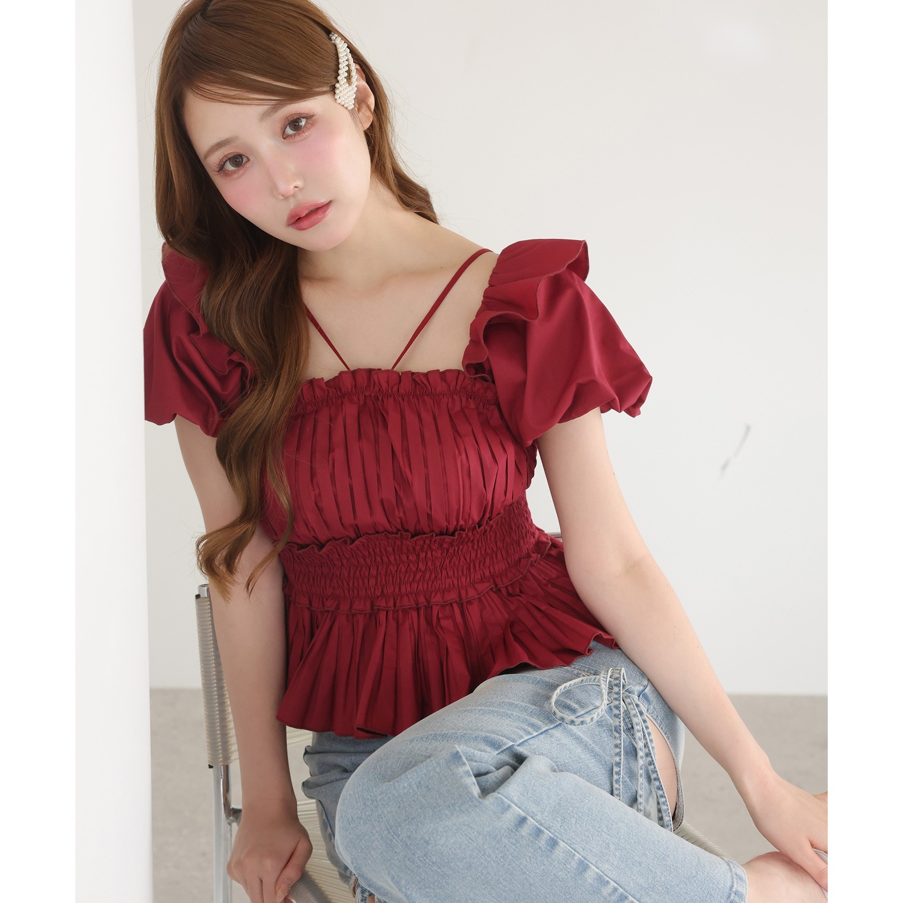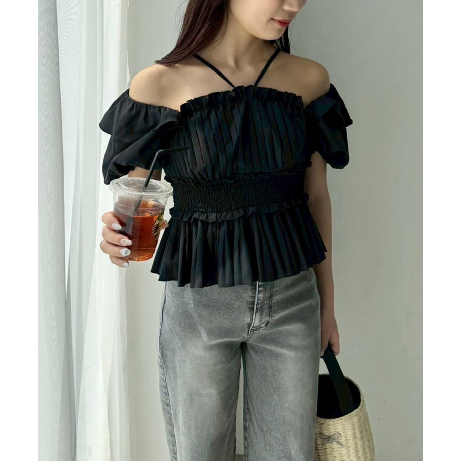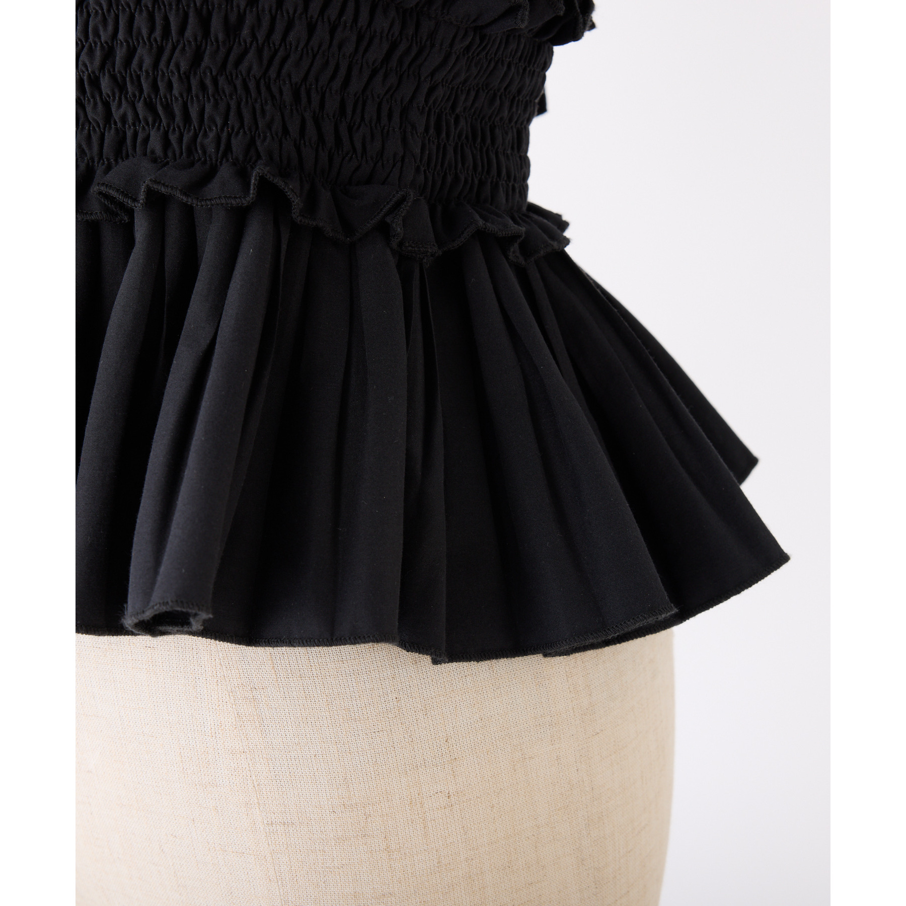 繊細なプリーツ素材を使用した、立体感のあるペプラムデザインが魅力の一枚。