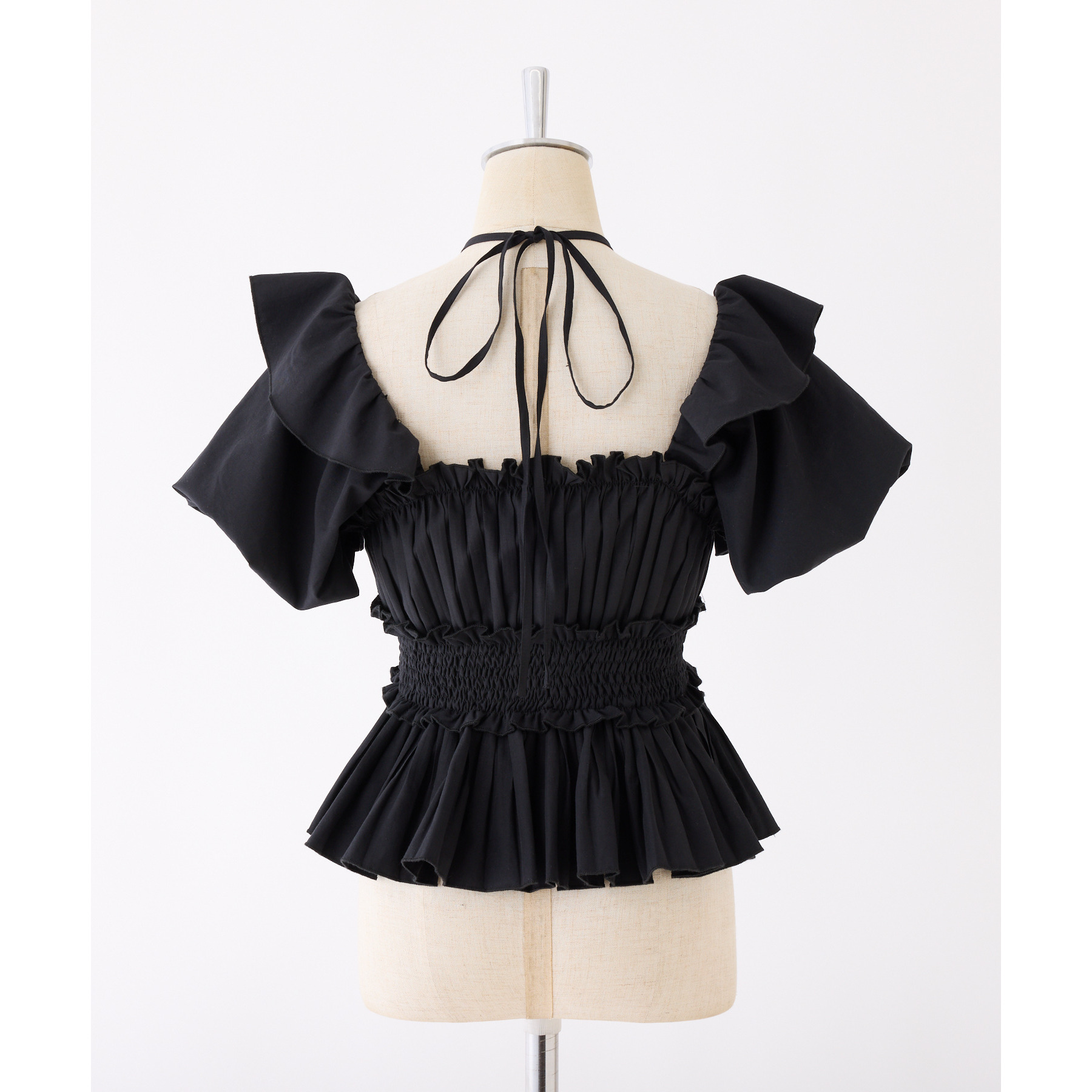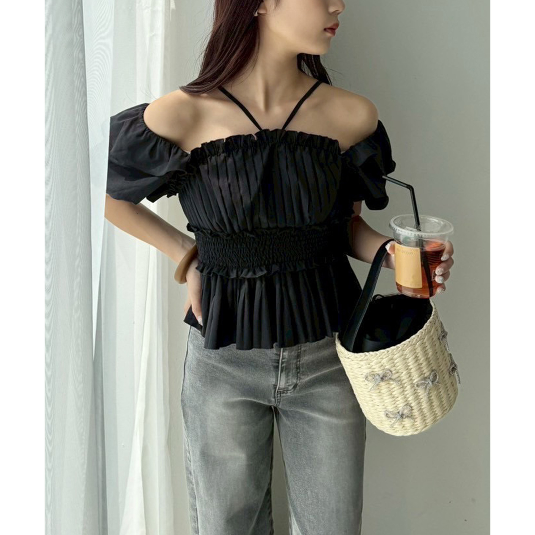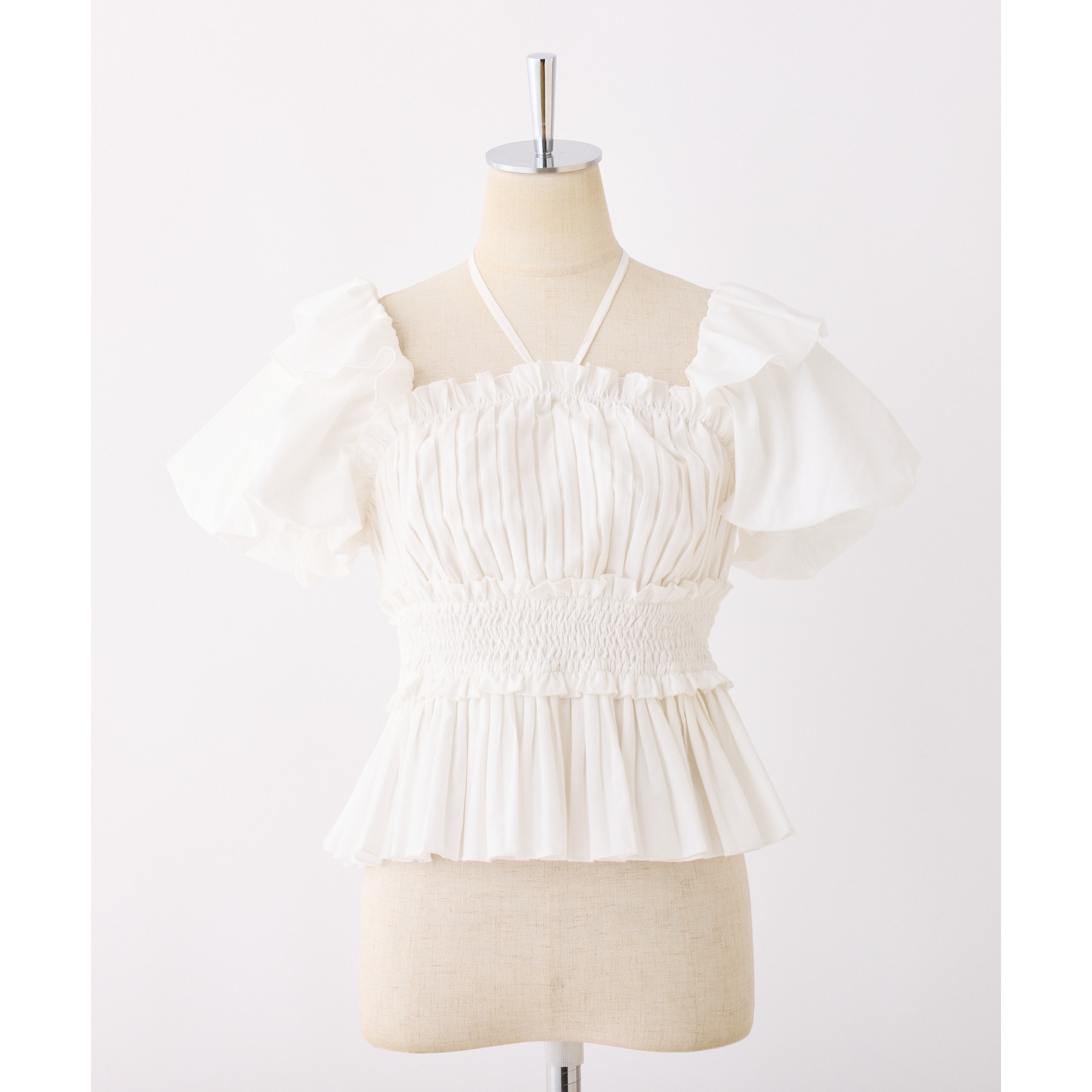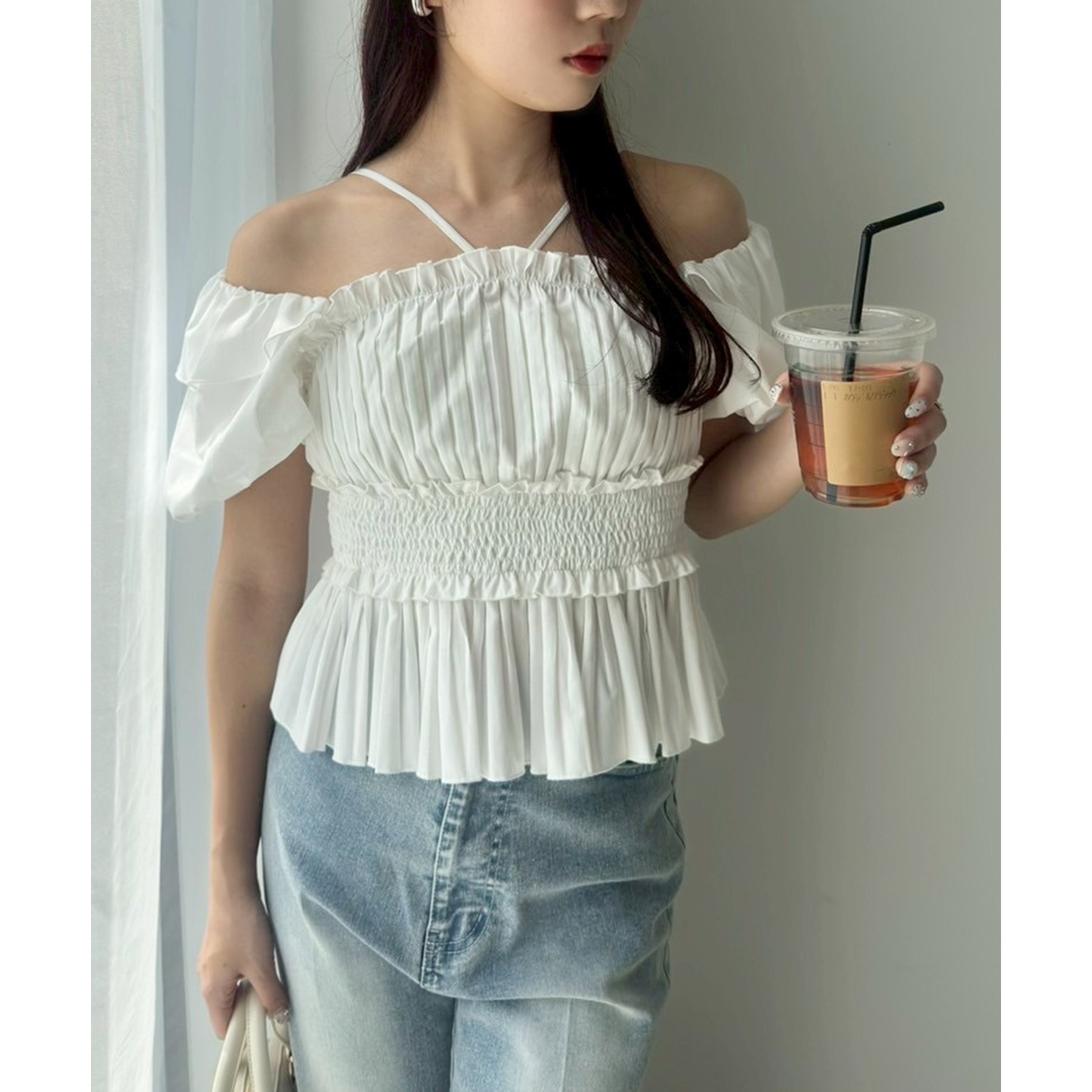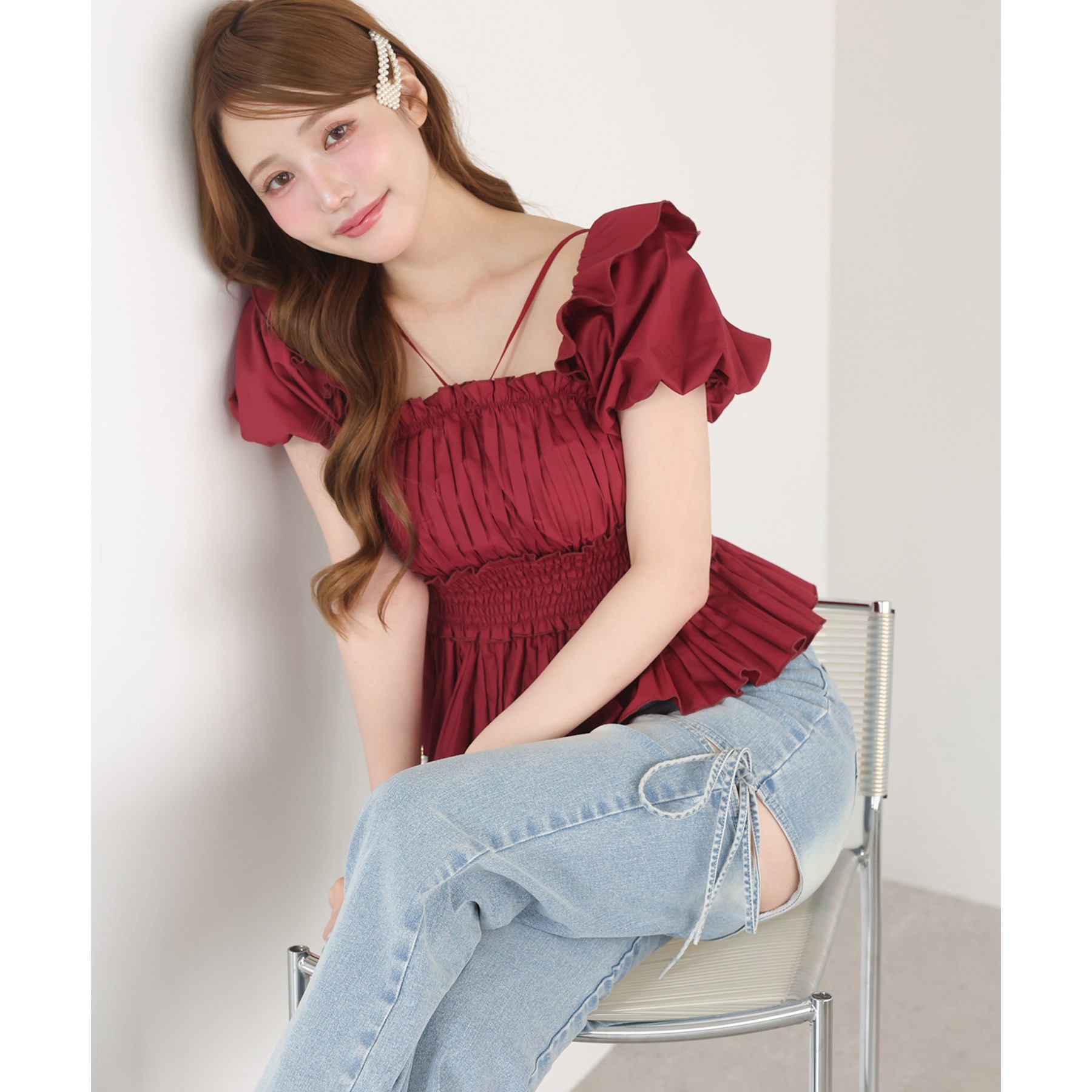繊細なプリーツ素材を使用した、立体感のあるペプラムデザインが魅力の一枚。