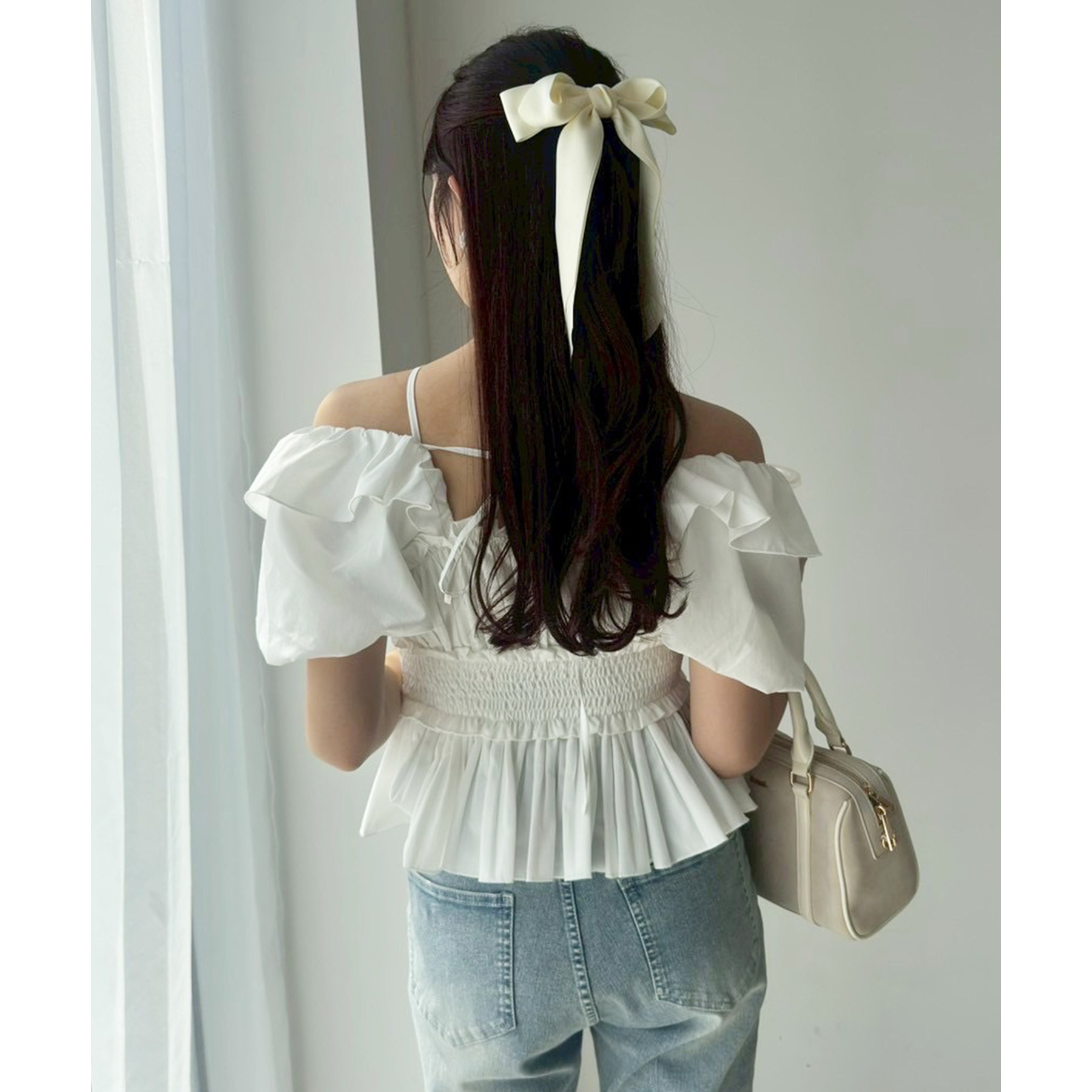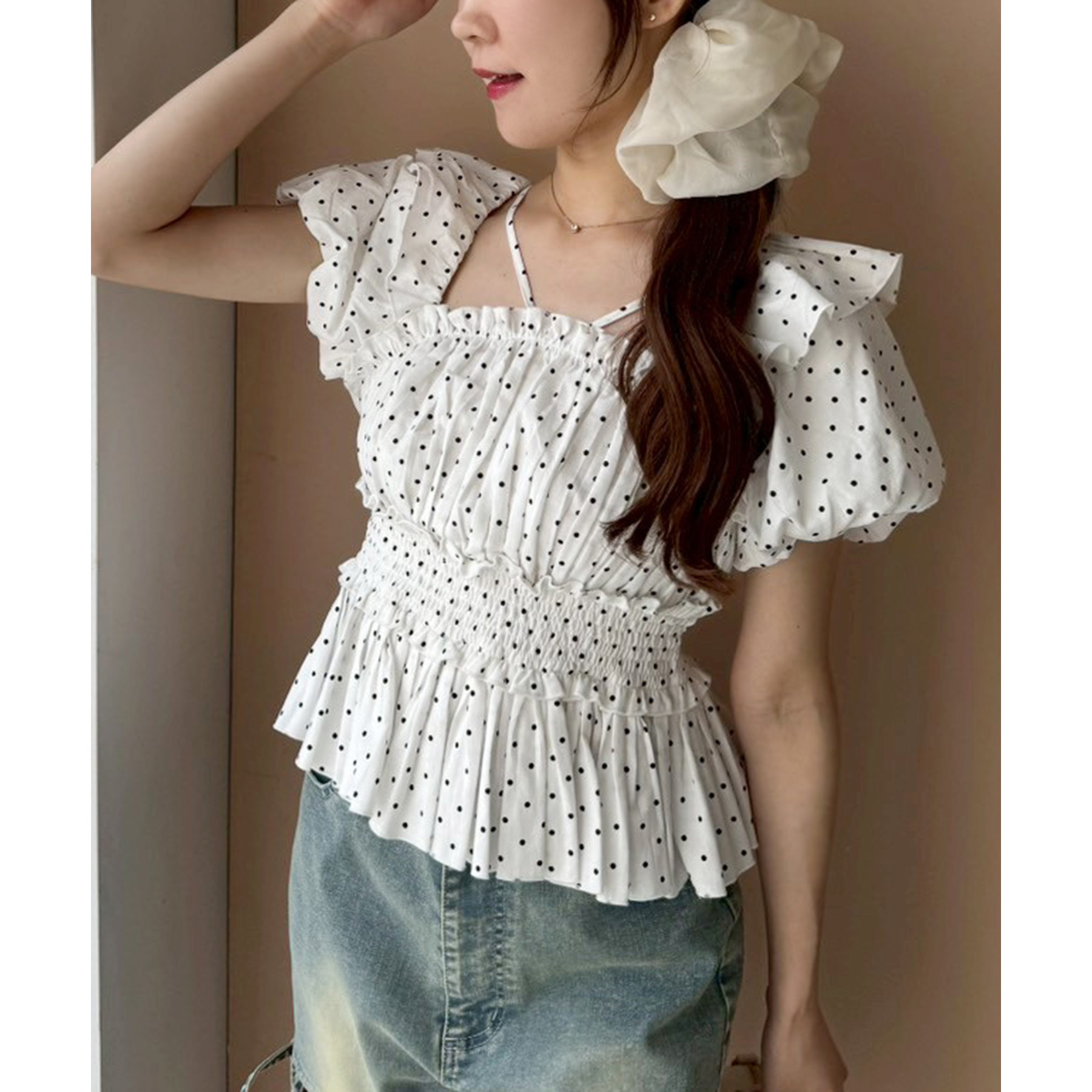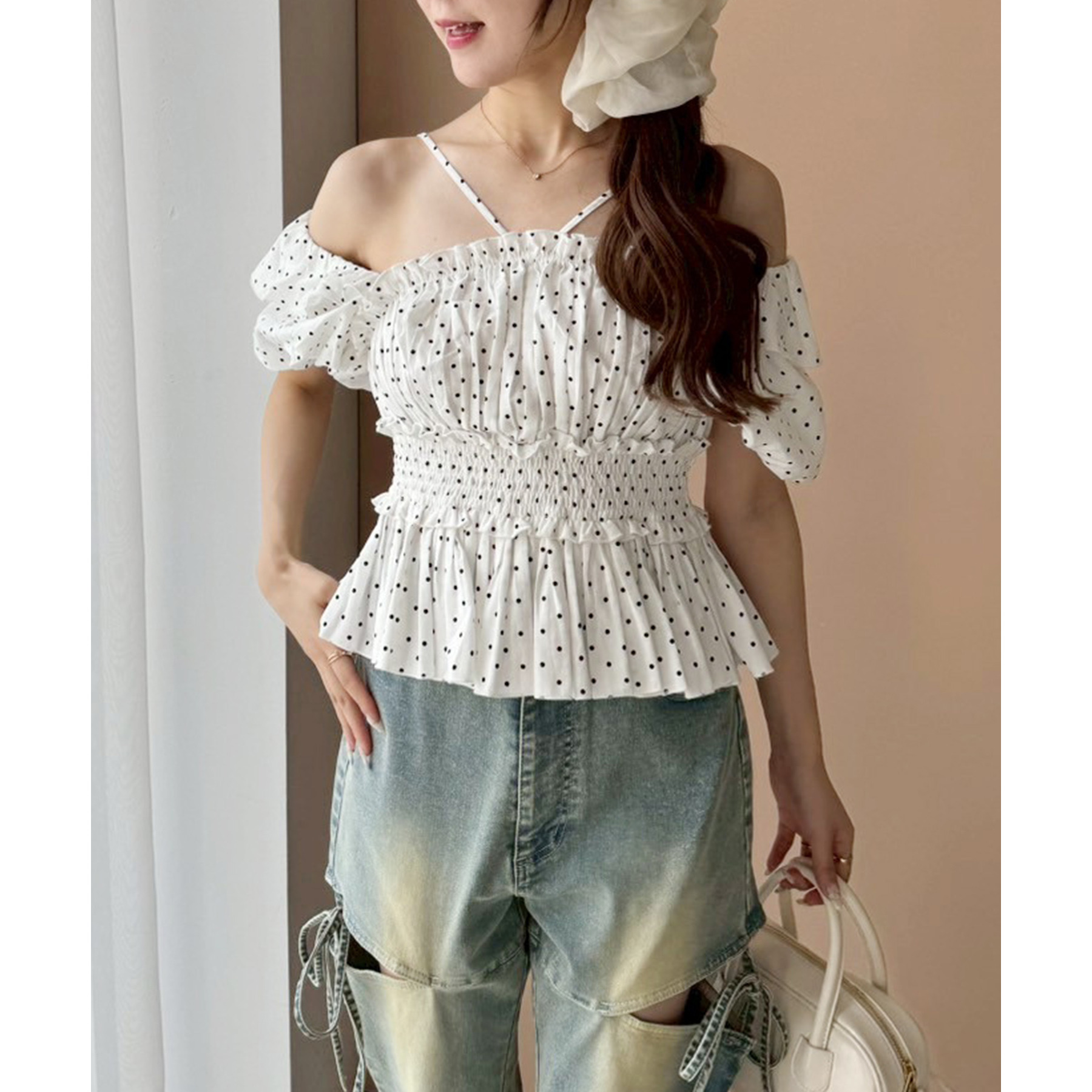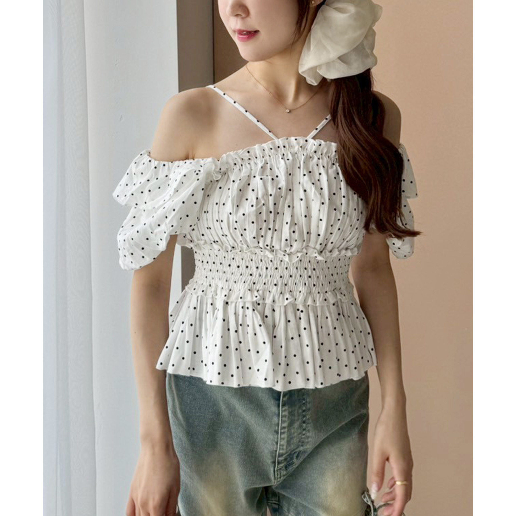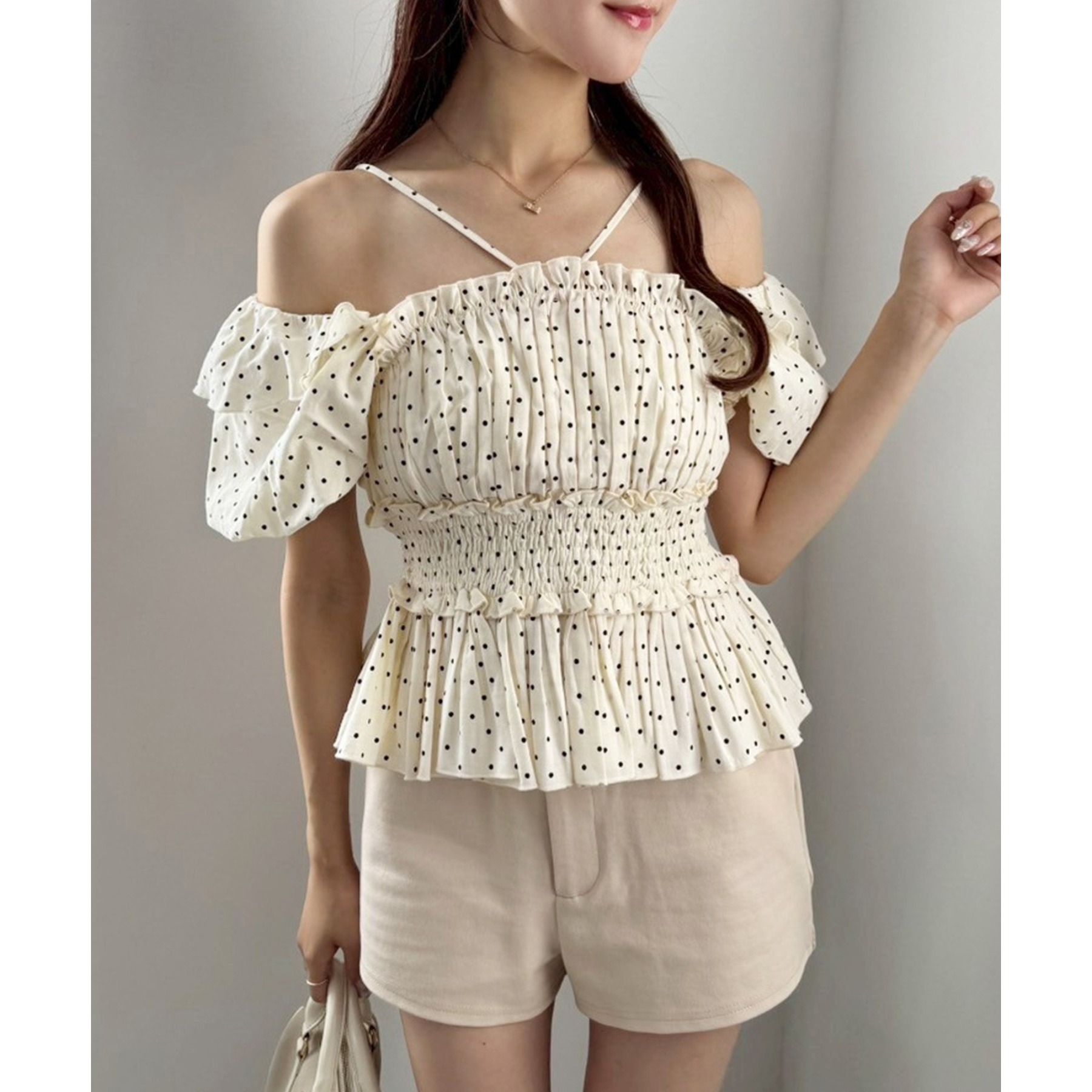 繊細なプリーツ素材を使用した、立体感のあるペプラムデザインが魅力の一枚。