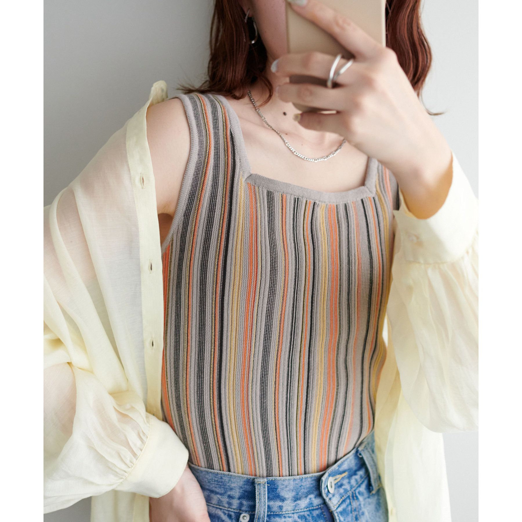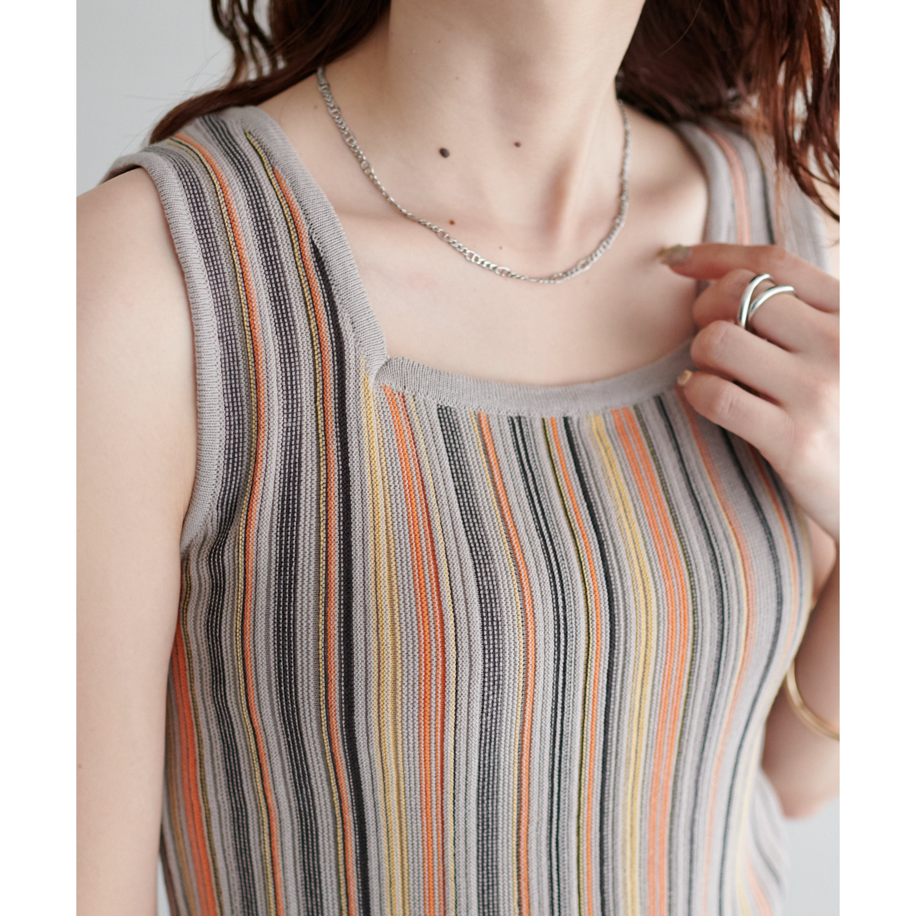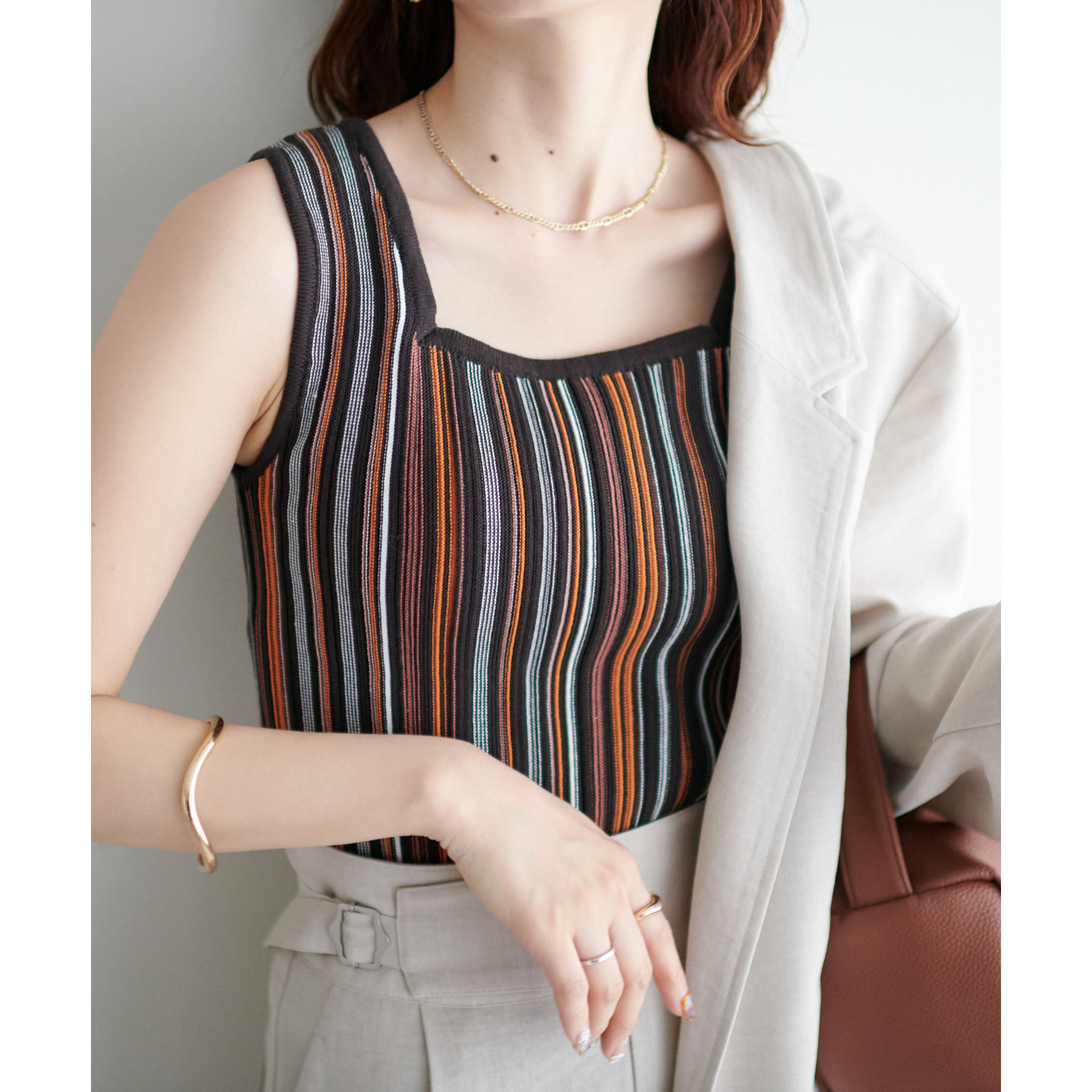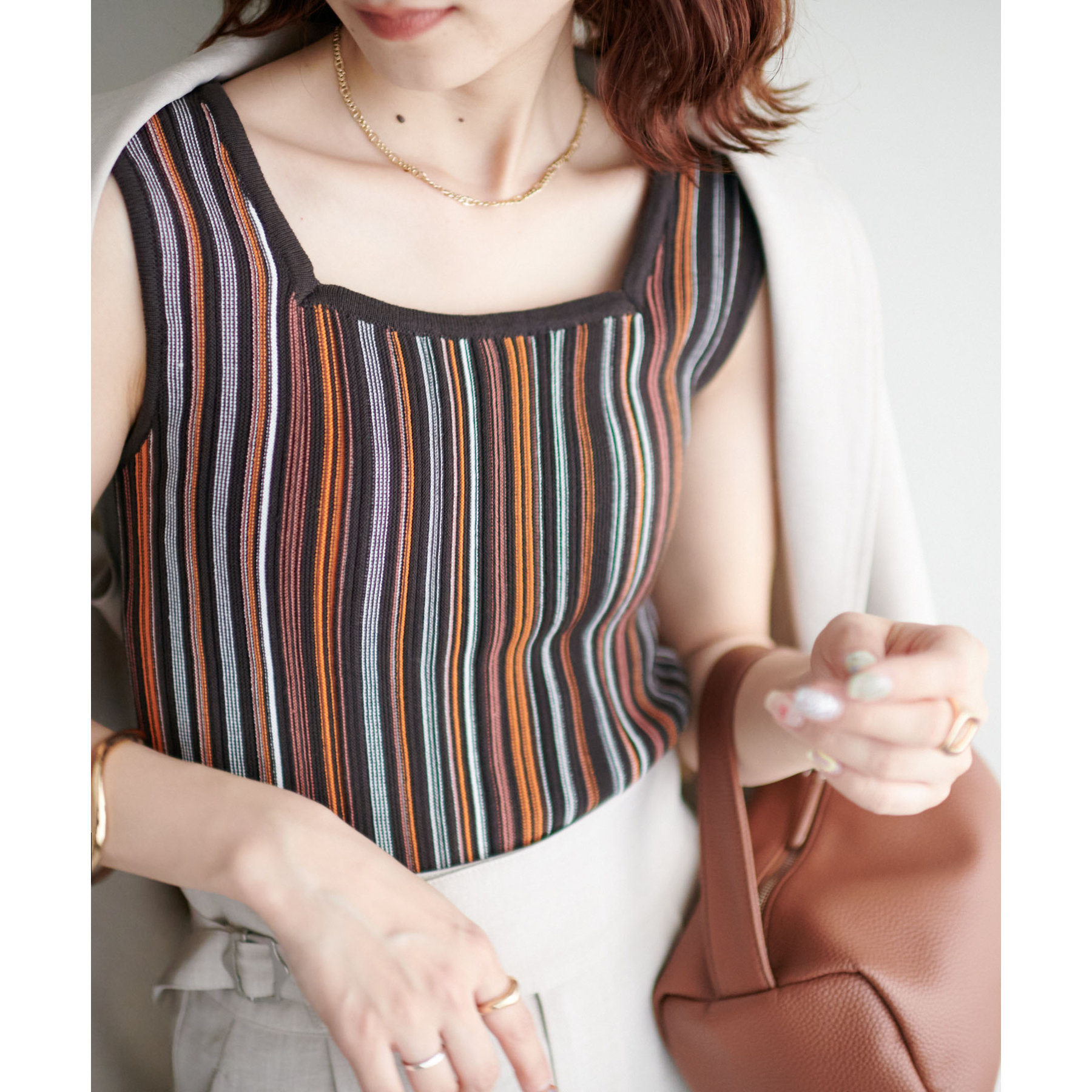 コーディネートにアクセントを添える、マルチストライプ柄のタンクトップ。スクエアネックとUネック、前後逆にしても着用できる2WAY仕様。程よく厚みのある生地感で、インナーとしてはもちろん一枚着としても活躍します。太めのストラップで下着のラインが出にくく、安心感のある着心地もポイント。鮮やかな色使いが、シーズンムードを盛り上げてくれるアイテムです♪
