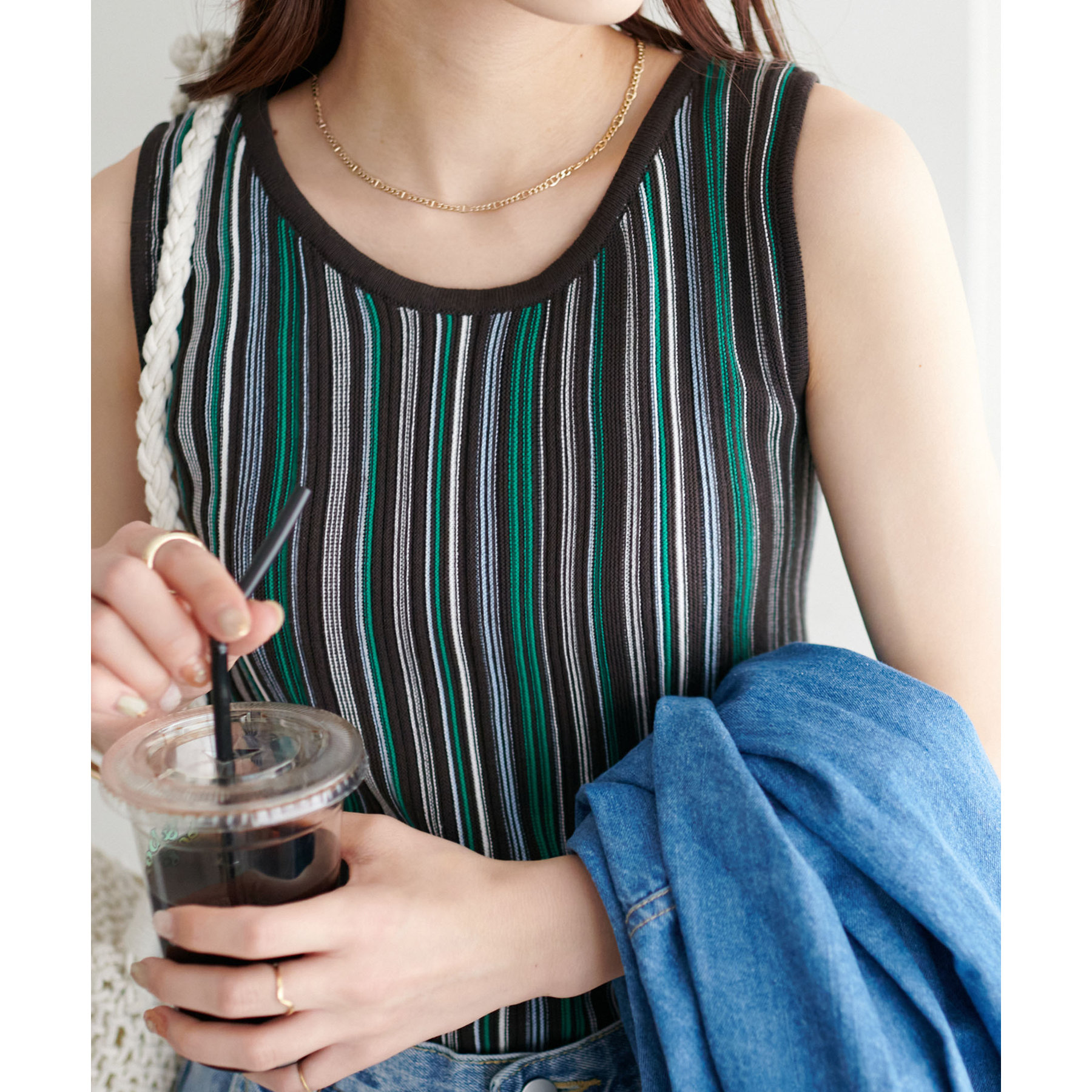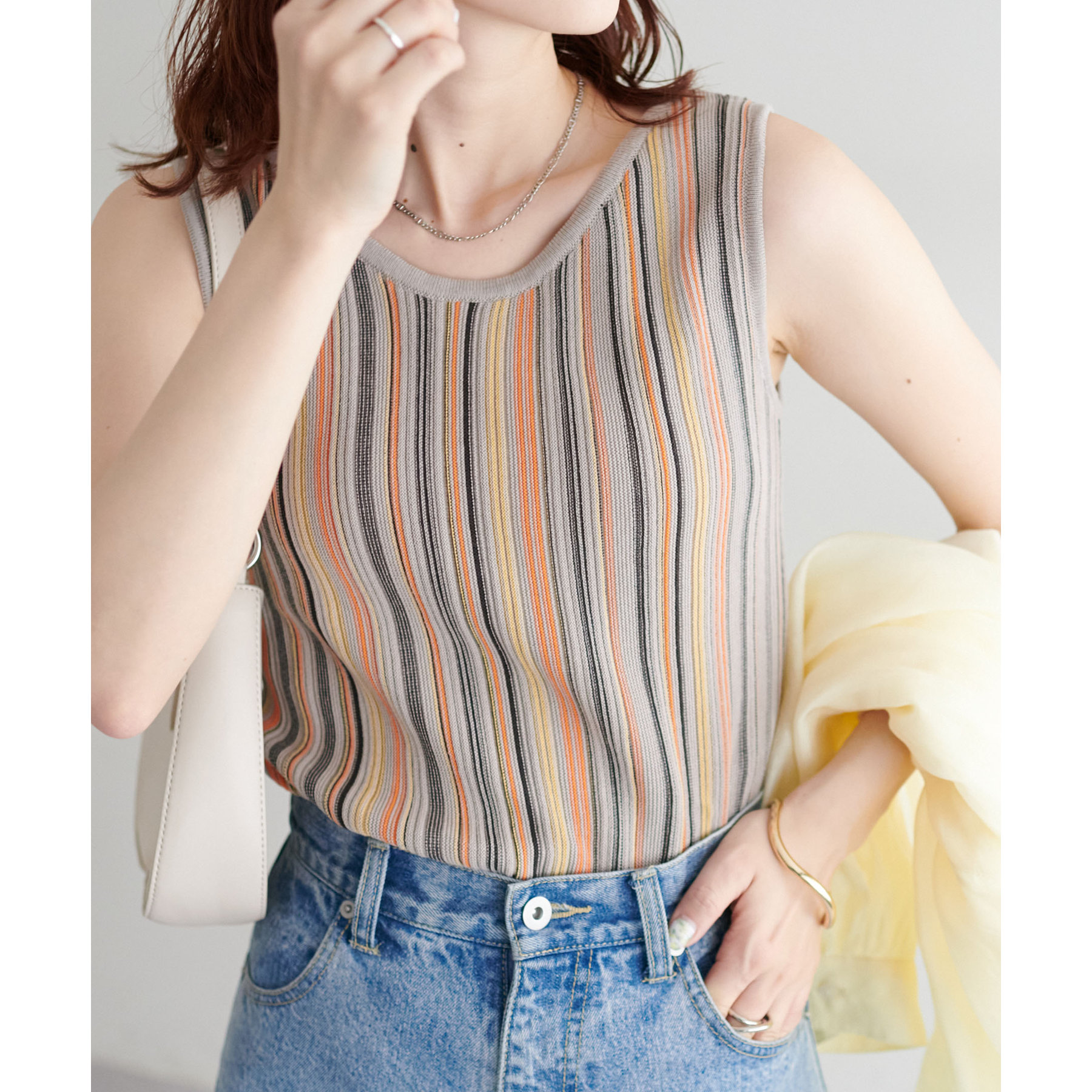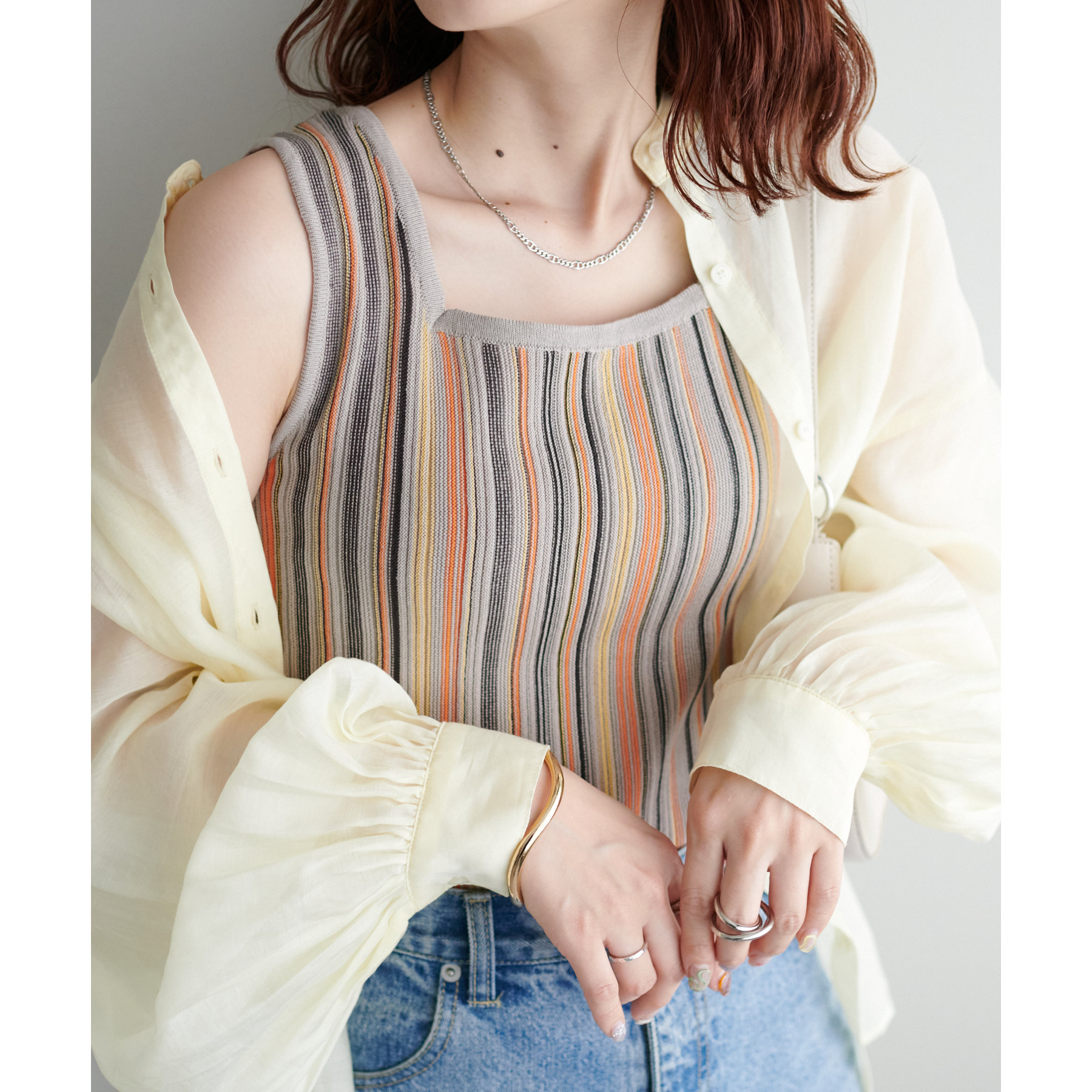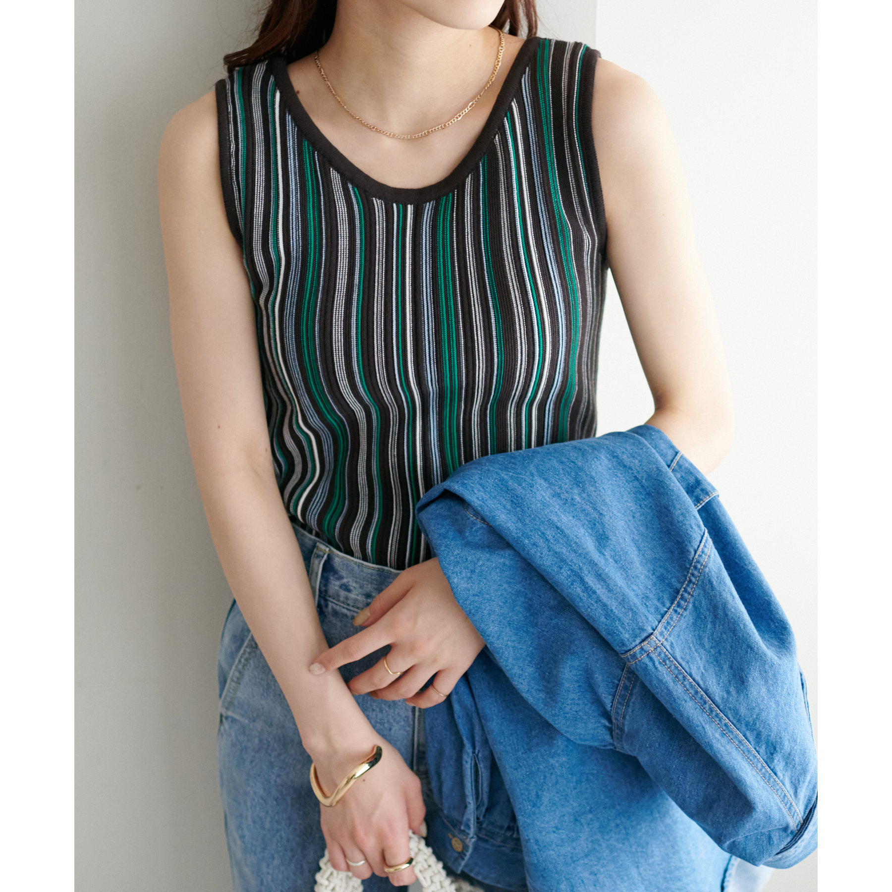コーディネートにアクセントを添える、マルチストライプ柄のタンクトップ。スクエアネックとUネック、前後逆にしても着用できる2WAY仕様。程よく厚みのある生地感で、インナーとしてはもちろん一枚着としても活躍します。太めのストラップで下着のラインが出にくく、安心感のある着心地もポイント。鮮やかな色使いが、シーズンムードを盛り上げてくれるアイテムです♪