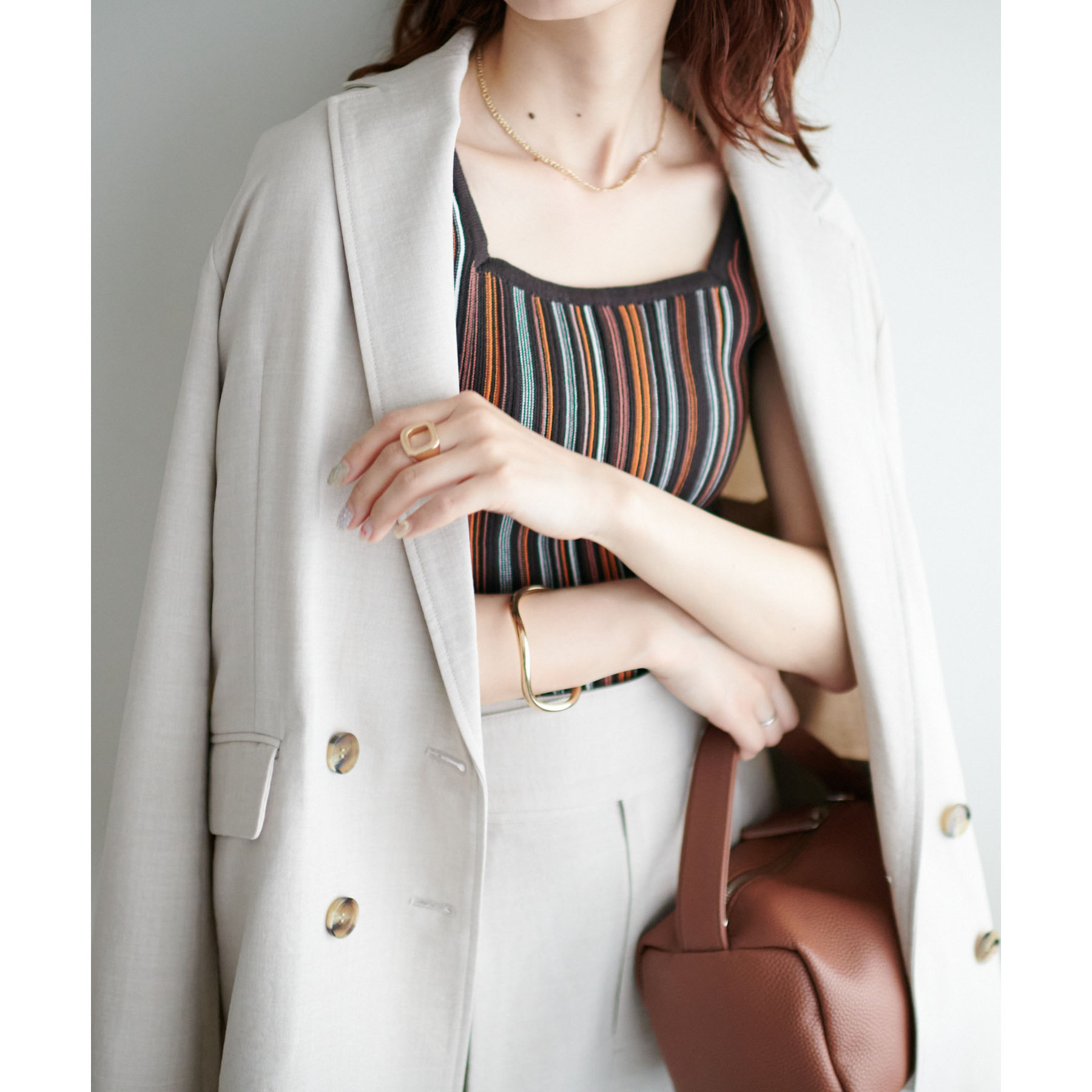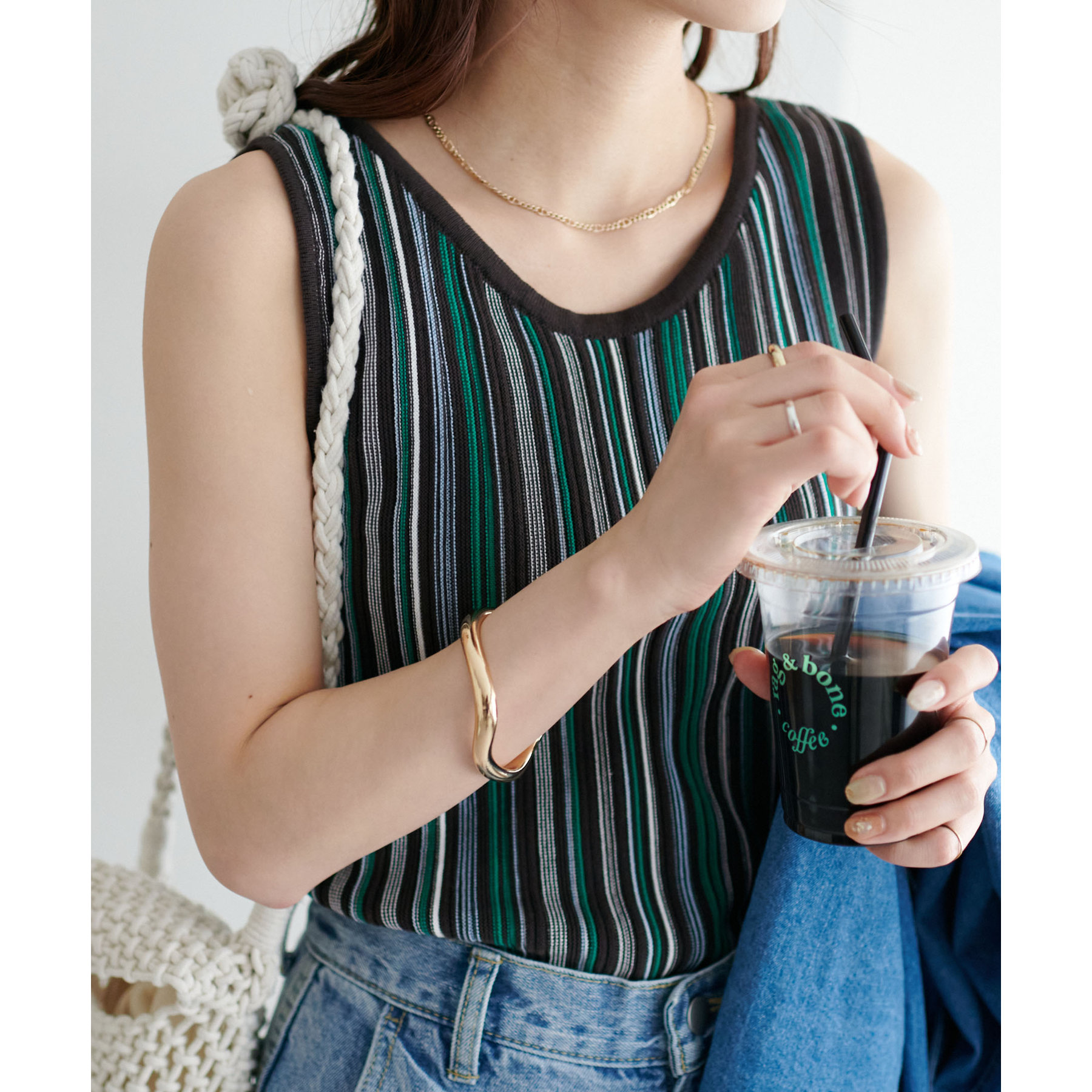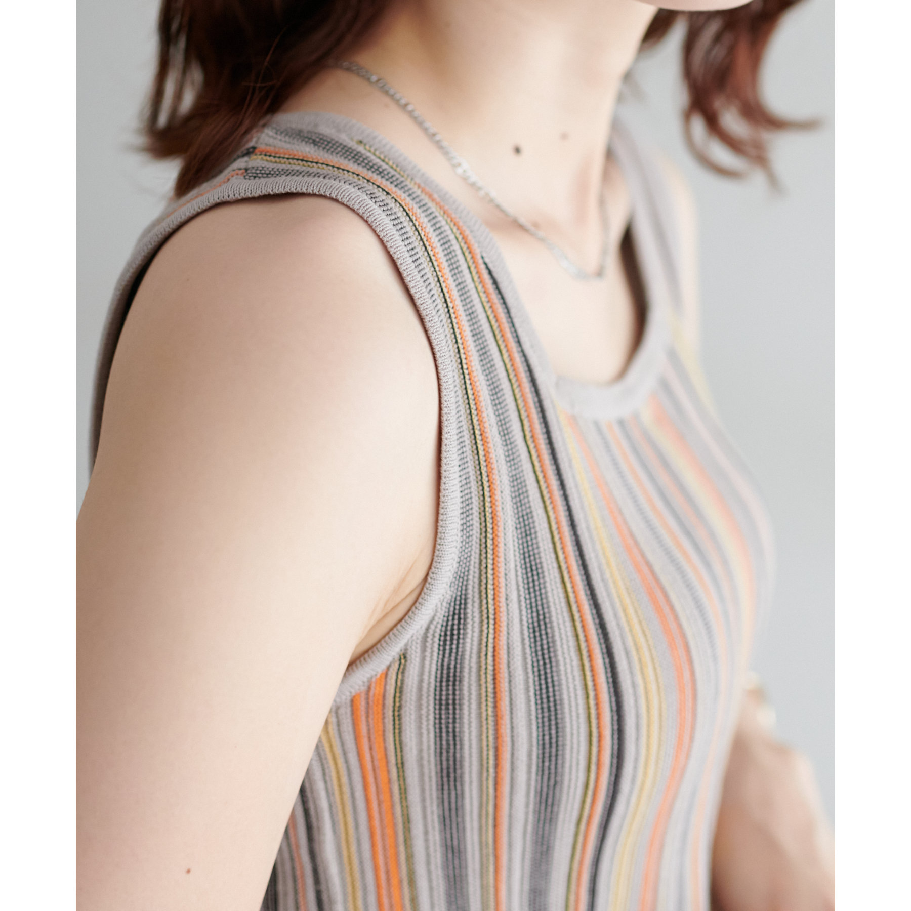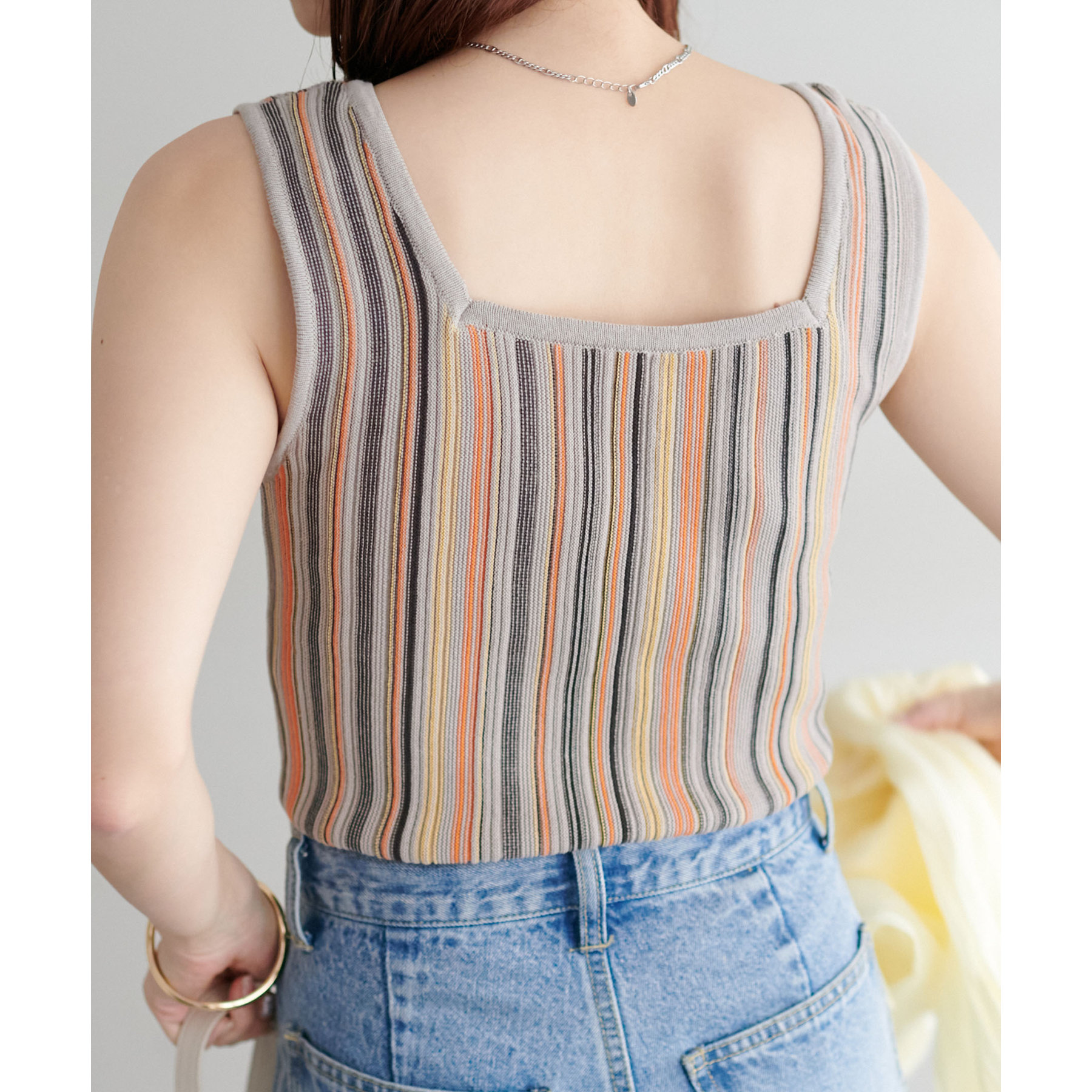 コーディネートにアクセントを添える、マルチストライプ柄のタンクトップ。スクエアネックとUネック、前後逆にしても着用できる2WAY仕様。程よく厚みのある生地感で、インナーとしてはもちろん一枚着としても活躍します。太めのストラップで下着のラインが出にくく、安心感のある着心地もポイント。鮮やかな色使いが、シーズンムードを盛り上げてくれるアイテムです♪