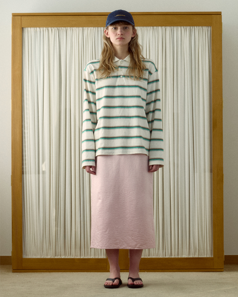 ゆとりのある丈感と、体に自然に沿うシルエットが美しいストライプカラーティーシャツ。