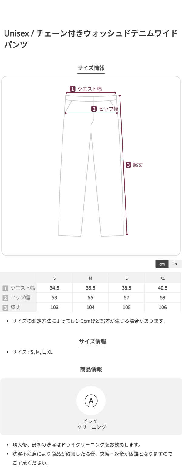 着丈 S:103cm M:104cm L:105cm XL:106cm