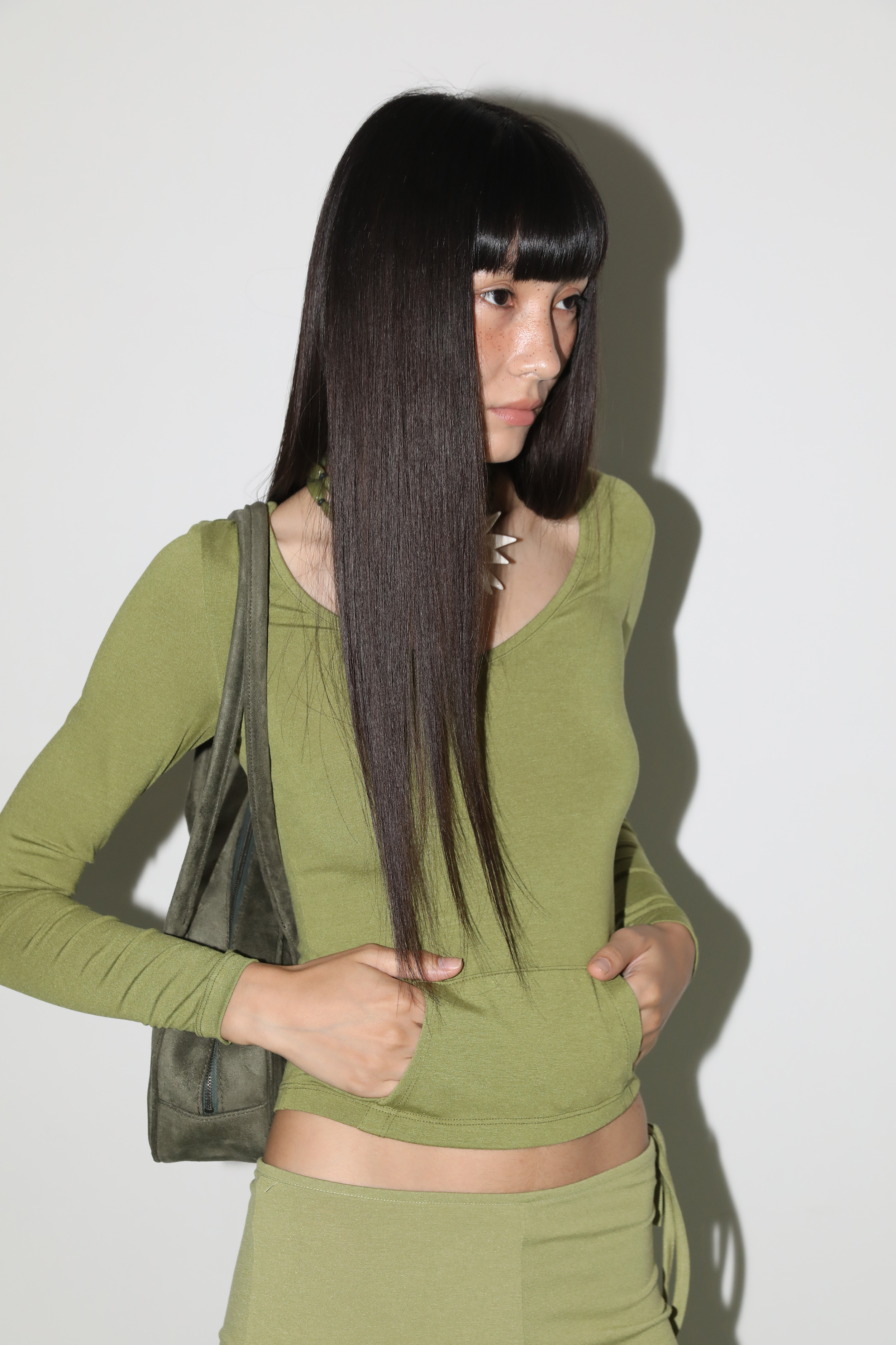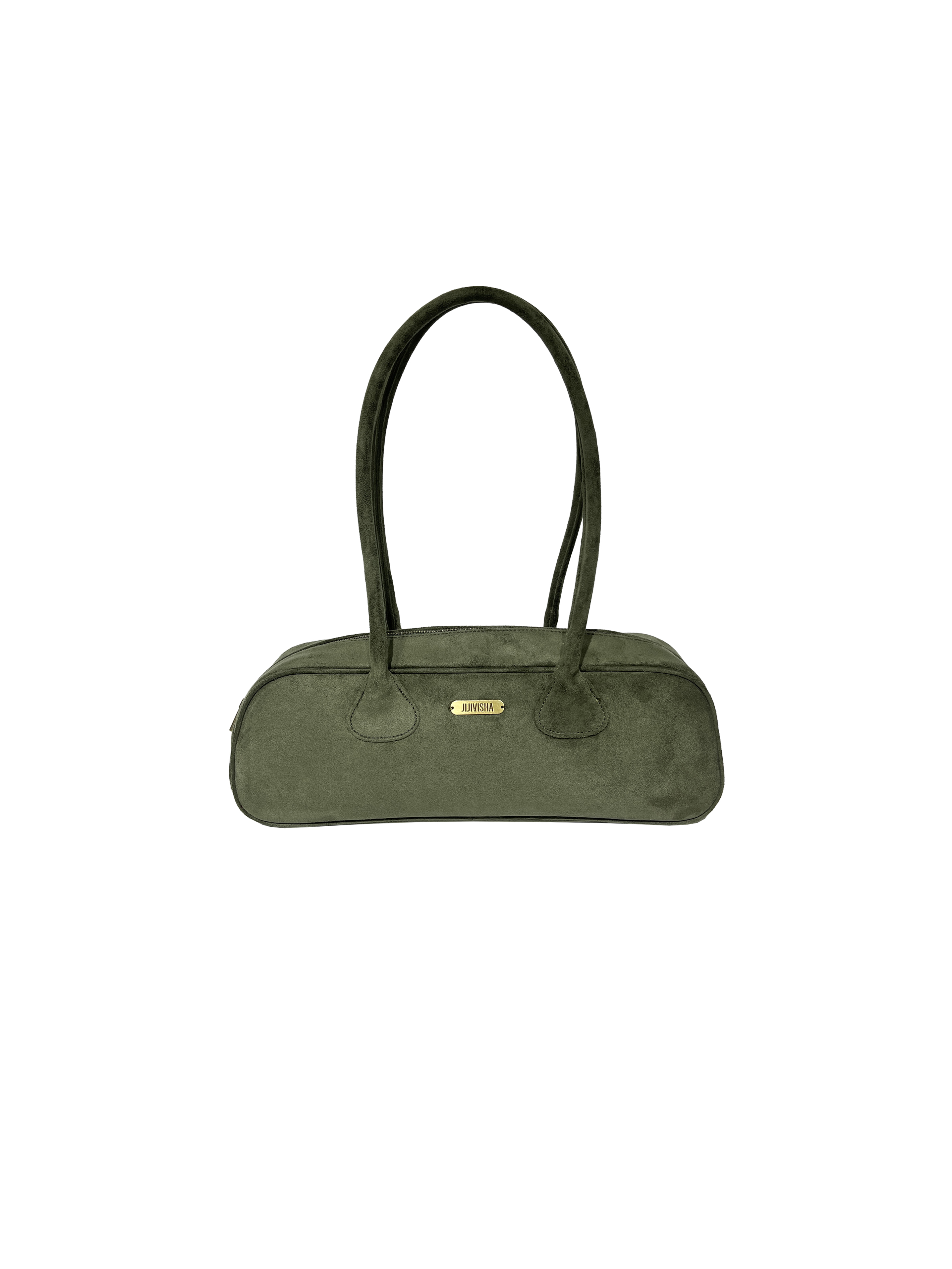 サポートビシャアンティークラベルポイントのスエードショルダーバッグ。