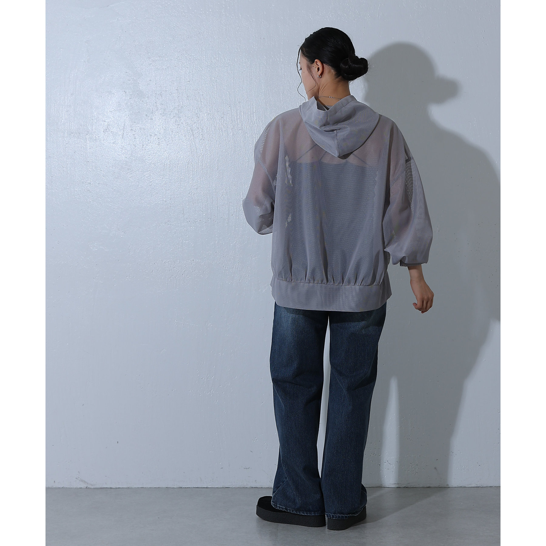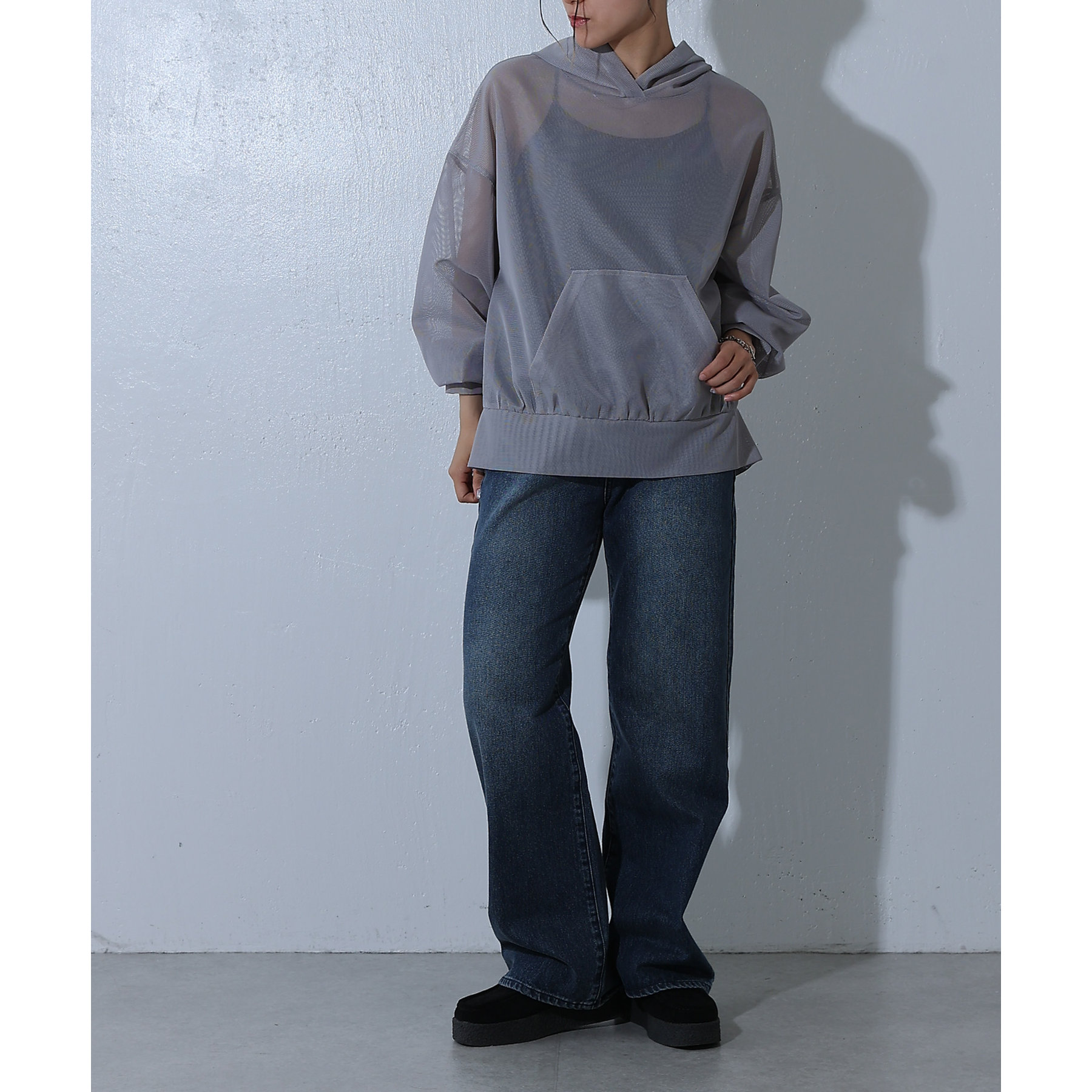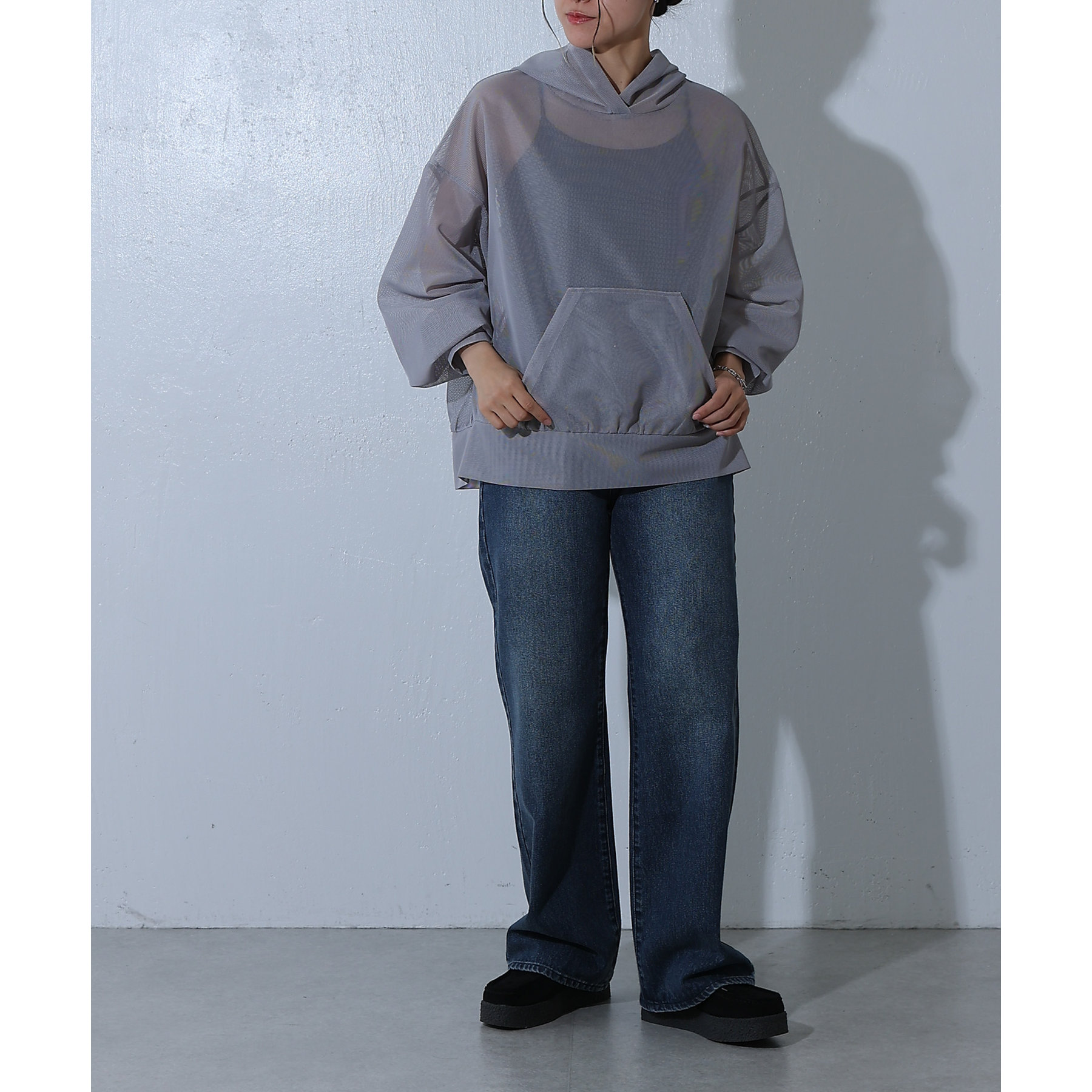 メッシュ素材のパーカーで一枚で涼しげな印象に◎