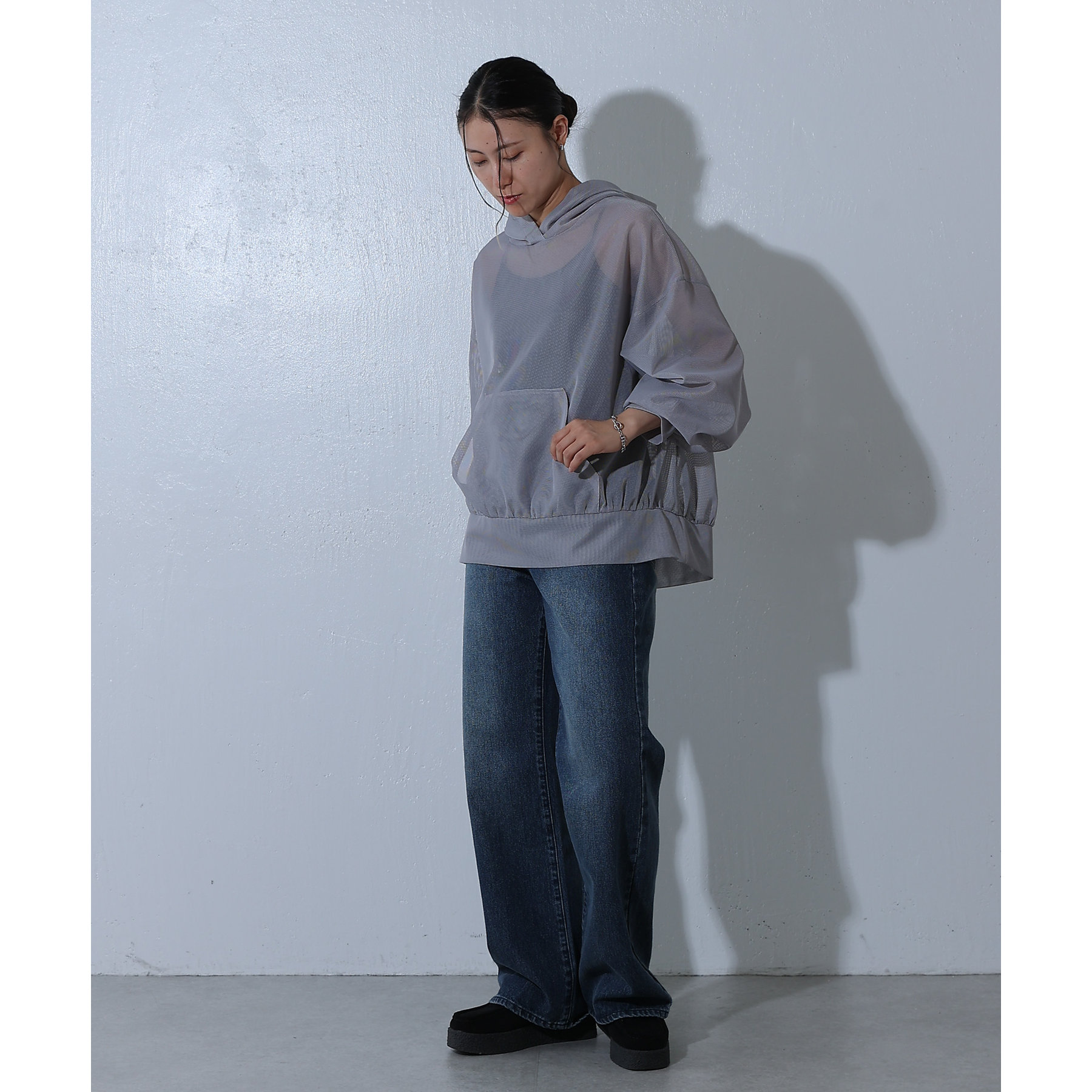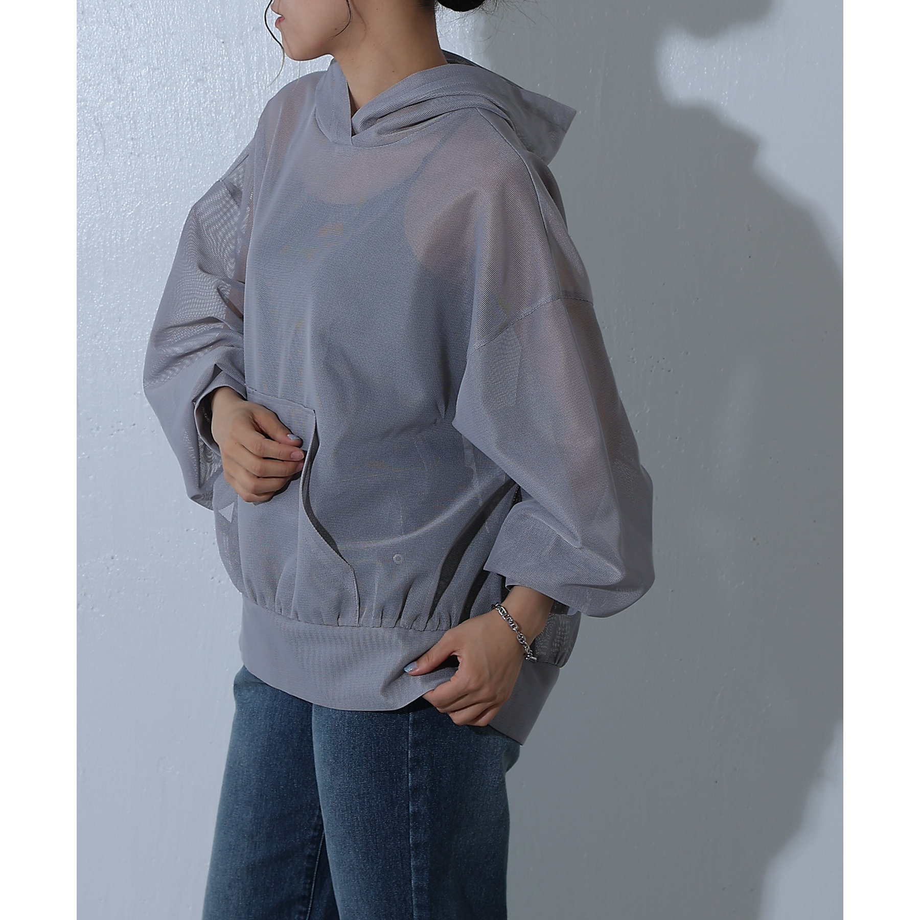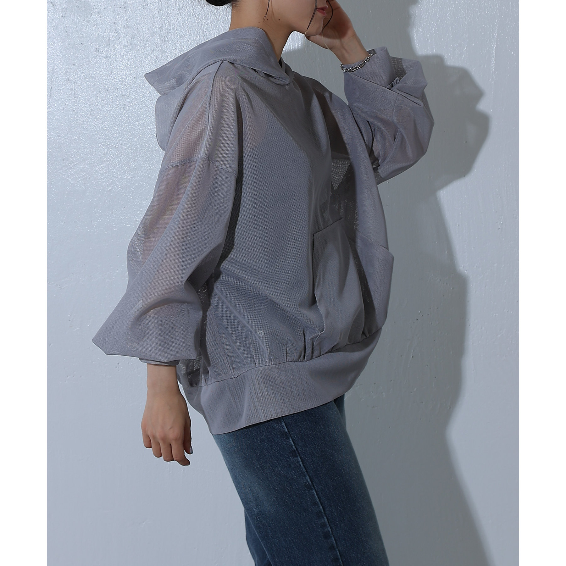 メッシュ素材のパーカーで一枚で涼しげな印象に◎