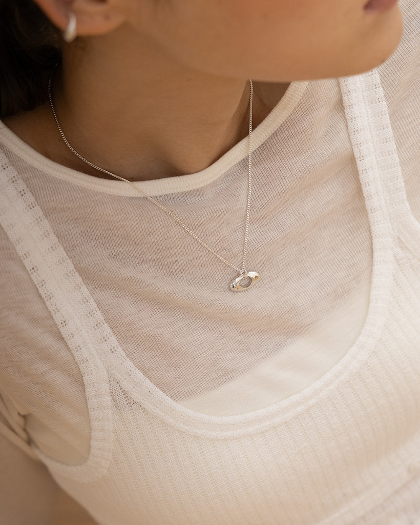 曲線に沿って流れる楕円モチーフのペンダントネックレスです。