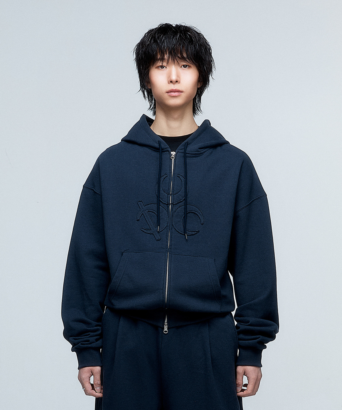 A cropped-length, slim-fit hoodie zip-up. Made from heavyweight cotton with bio-processing to maintain its shape, it features rough-edged symbol appliqué embroidery and fabric colors that create a vintage mood.