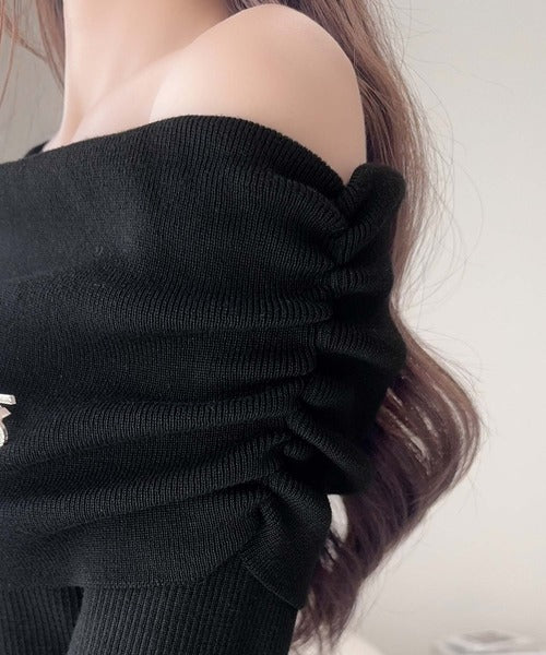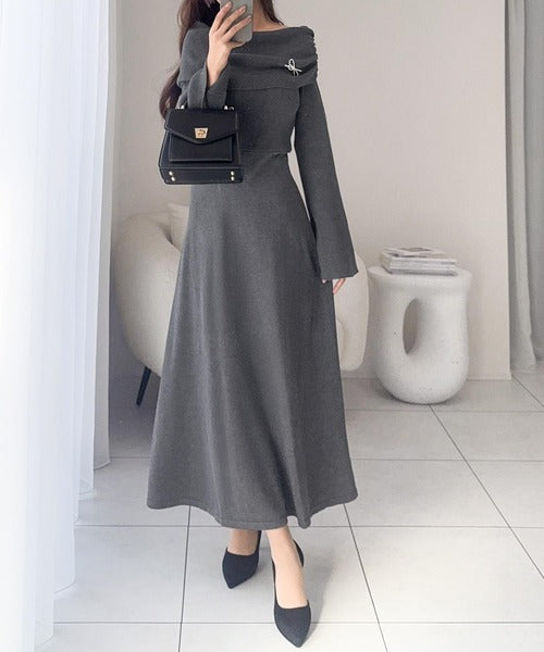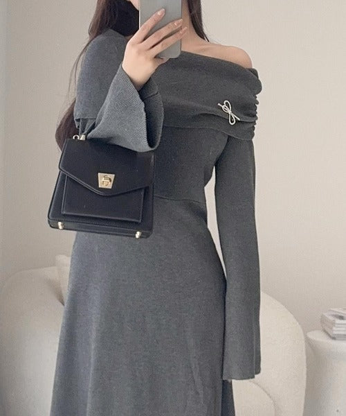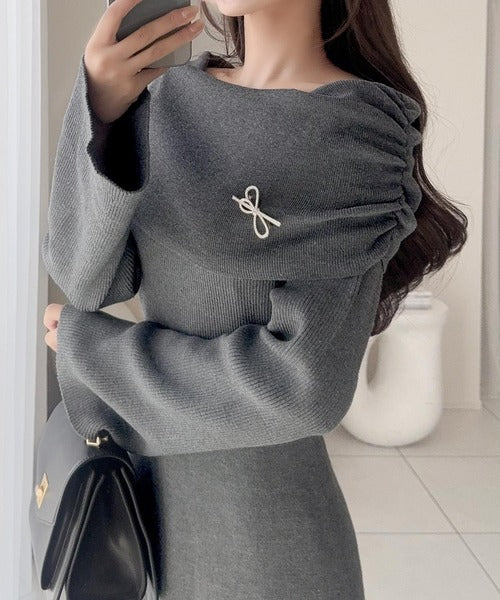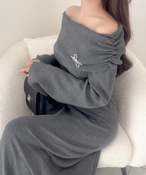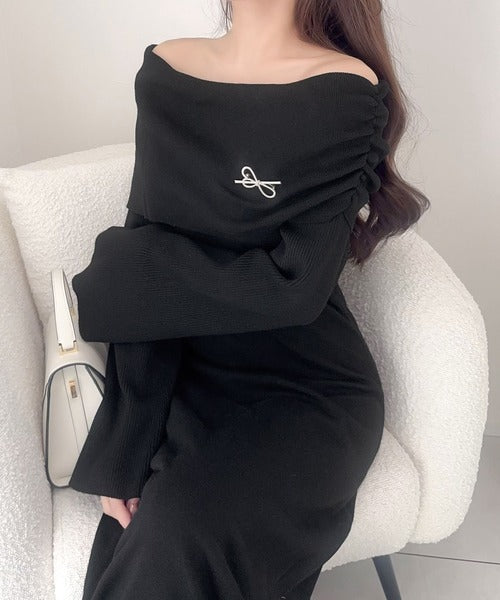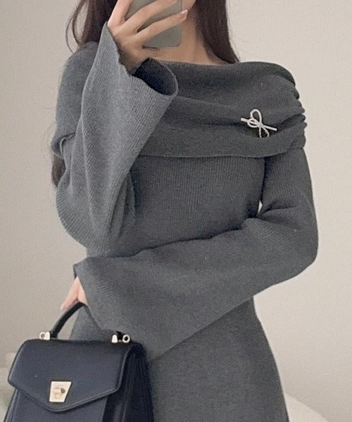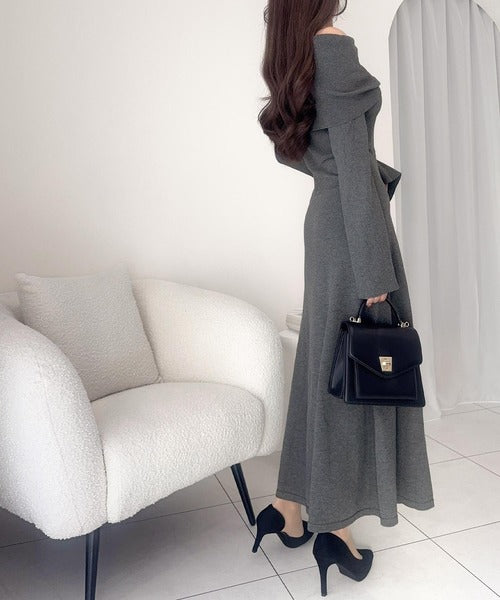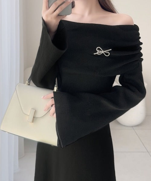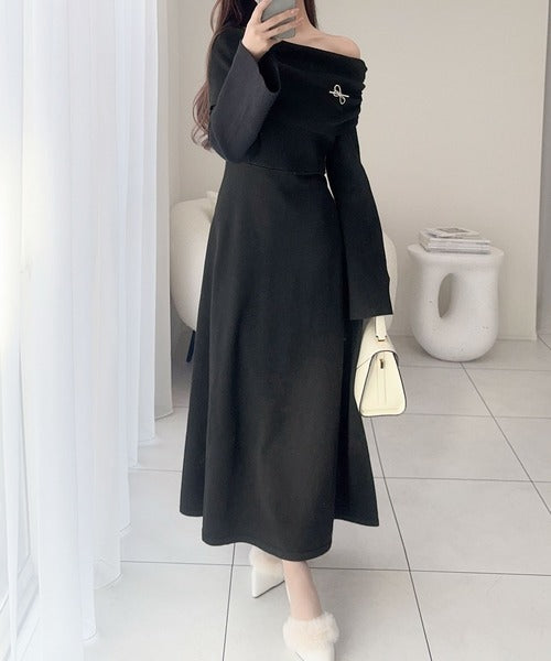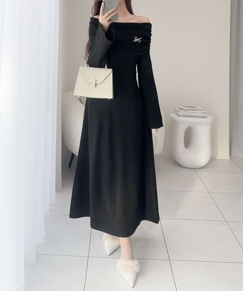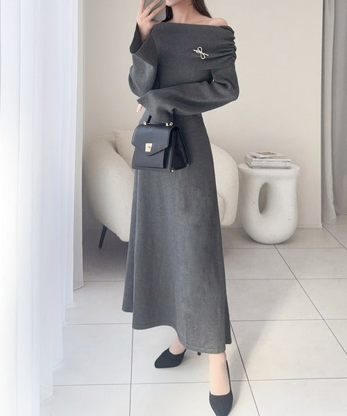【mily bilet】女性らしさを自在に演出♪リボンブローチ付きオフショルマルチWAYニットロングワンピース mi1359027