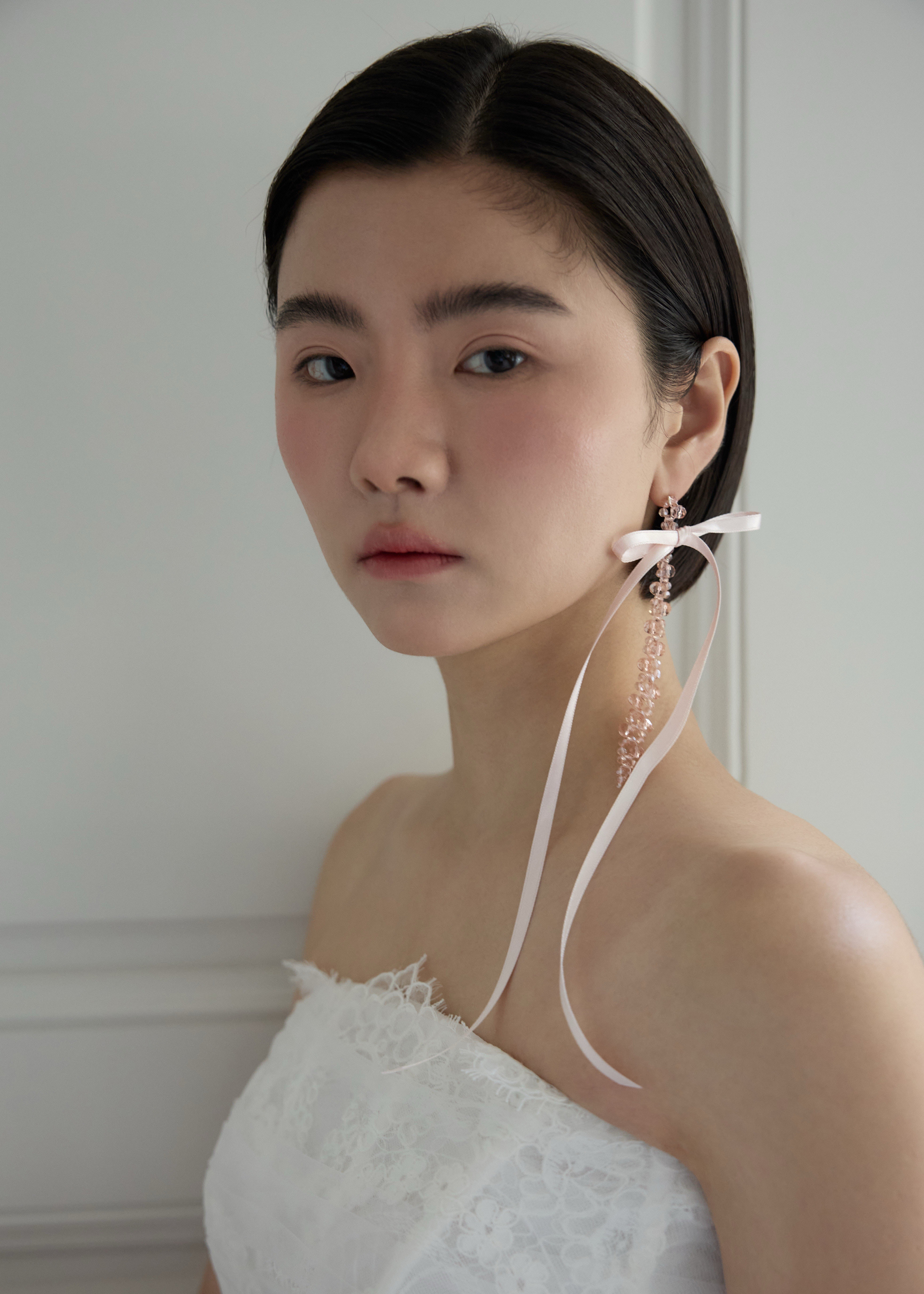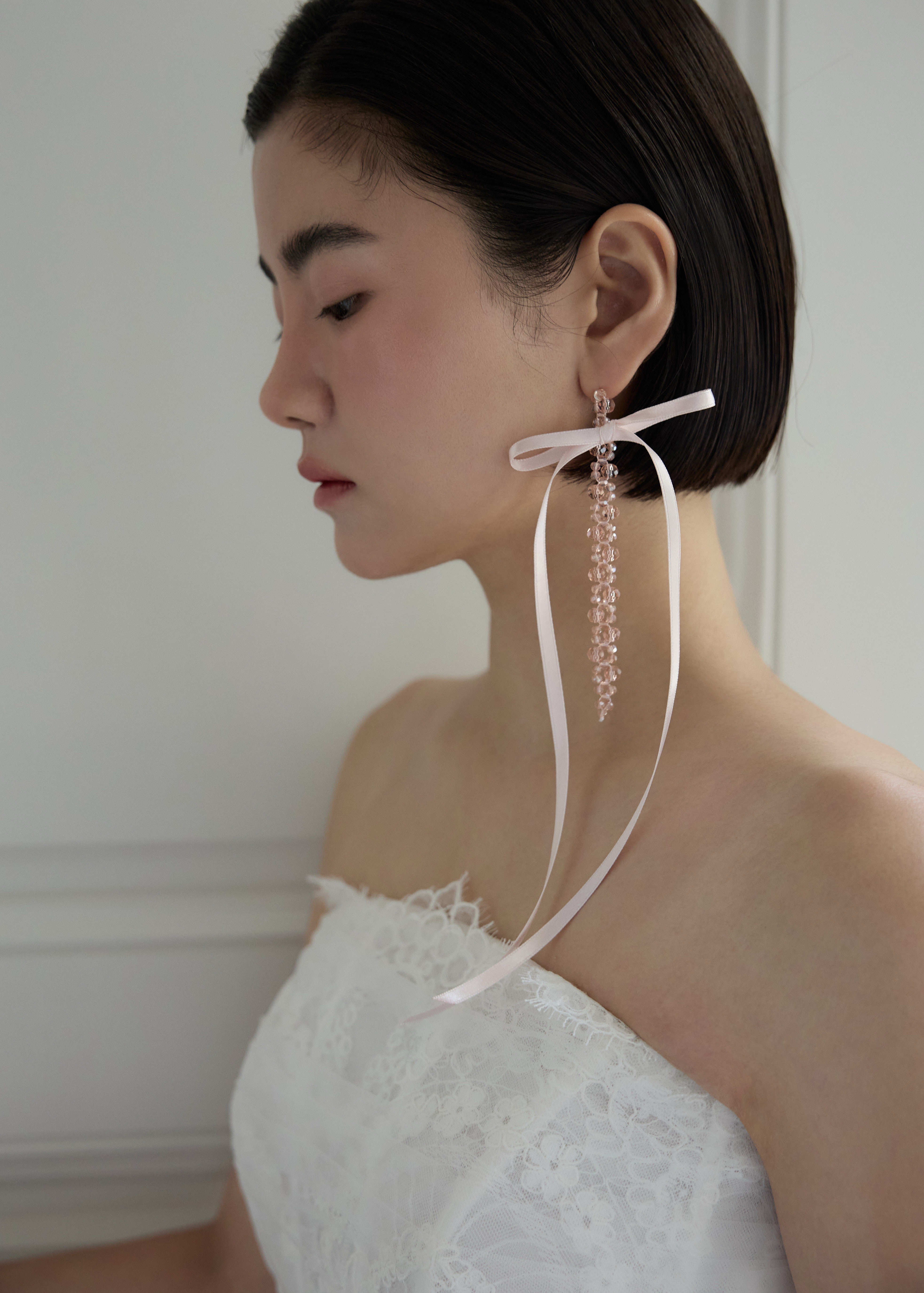 淡く繊細なピンクカラーがポイントになる、愛らしいムードのドロップイヤリングです。