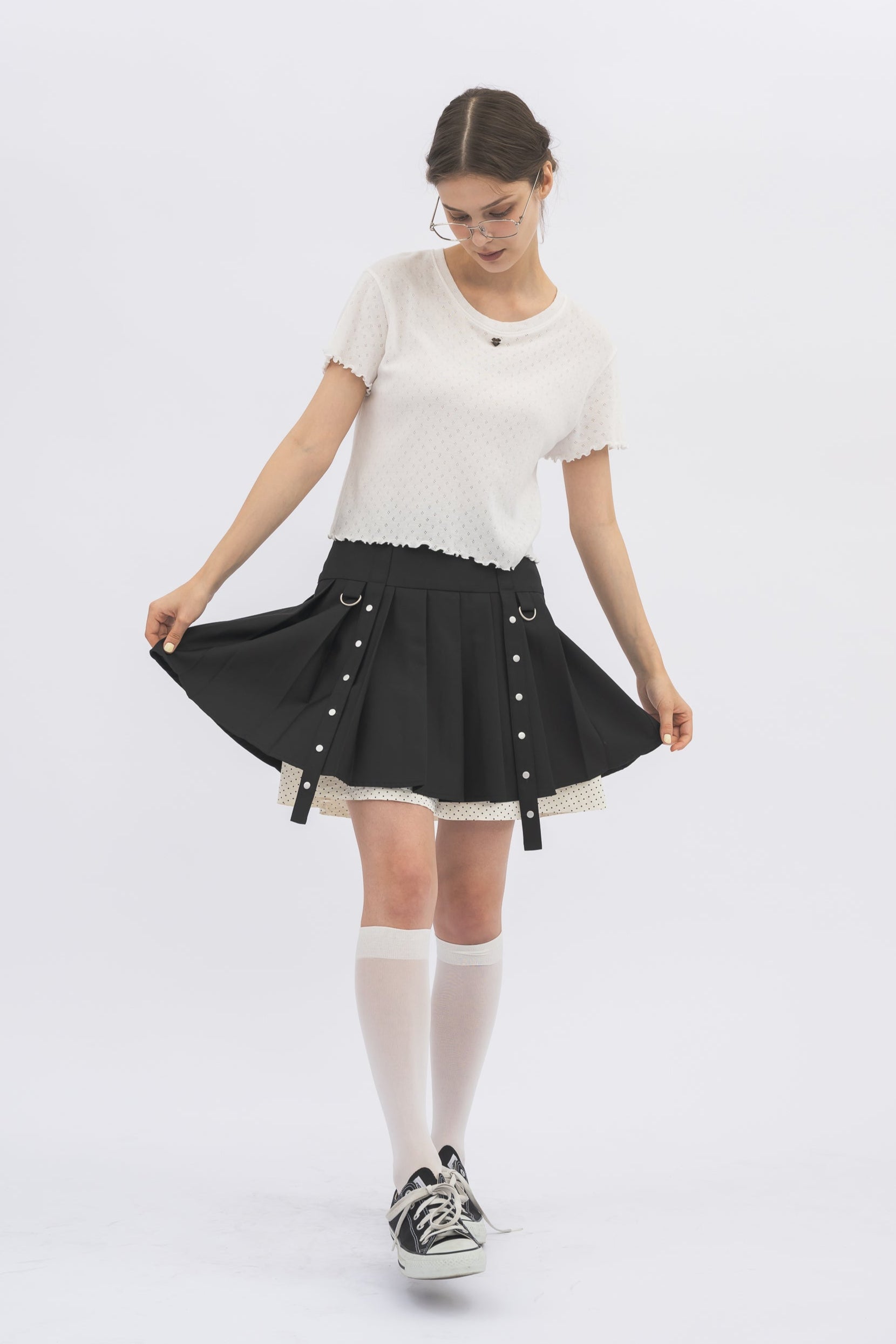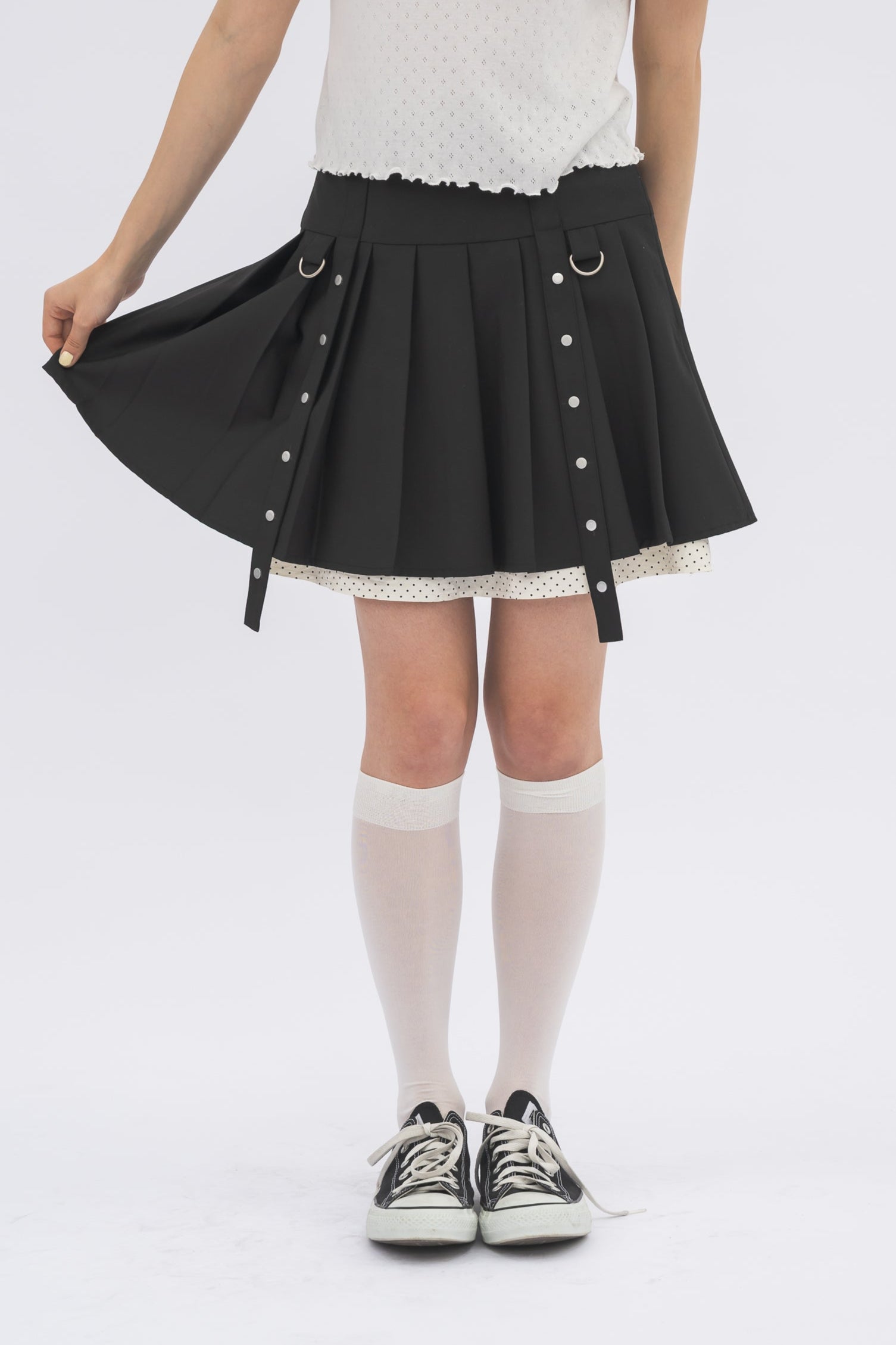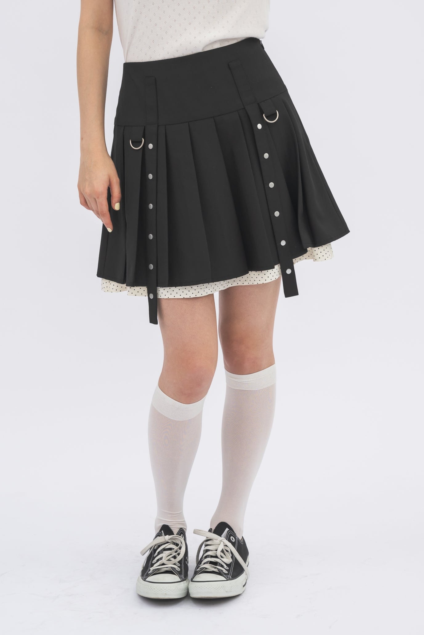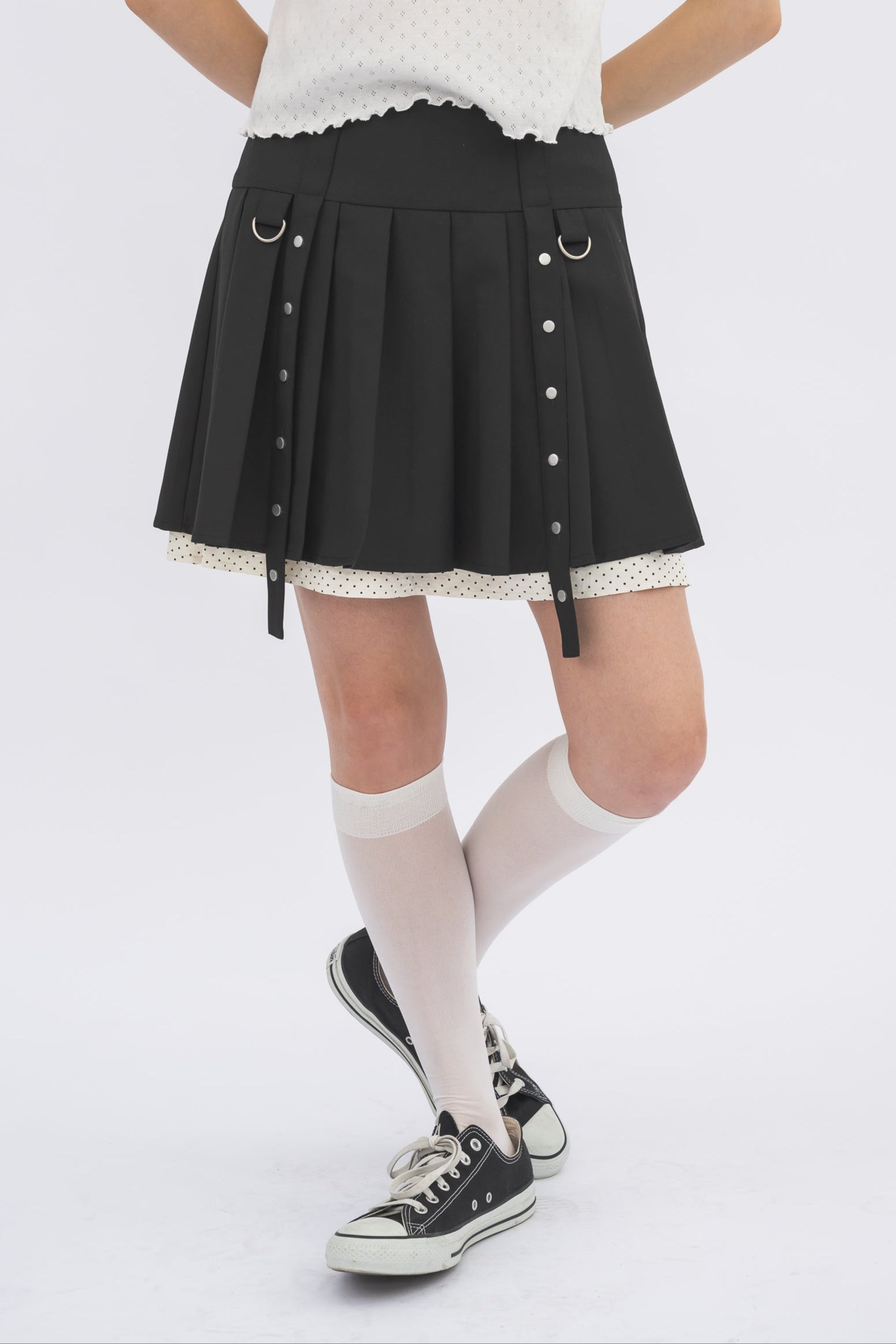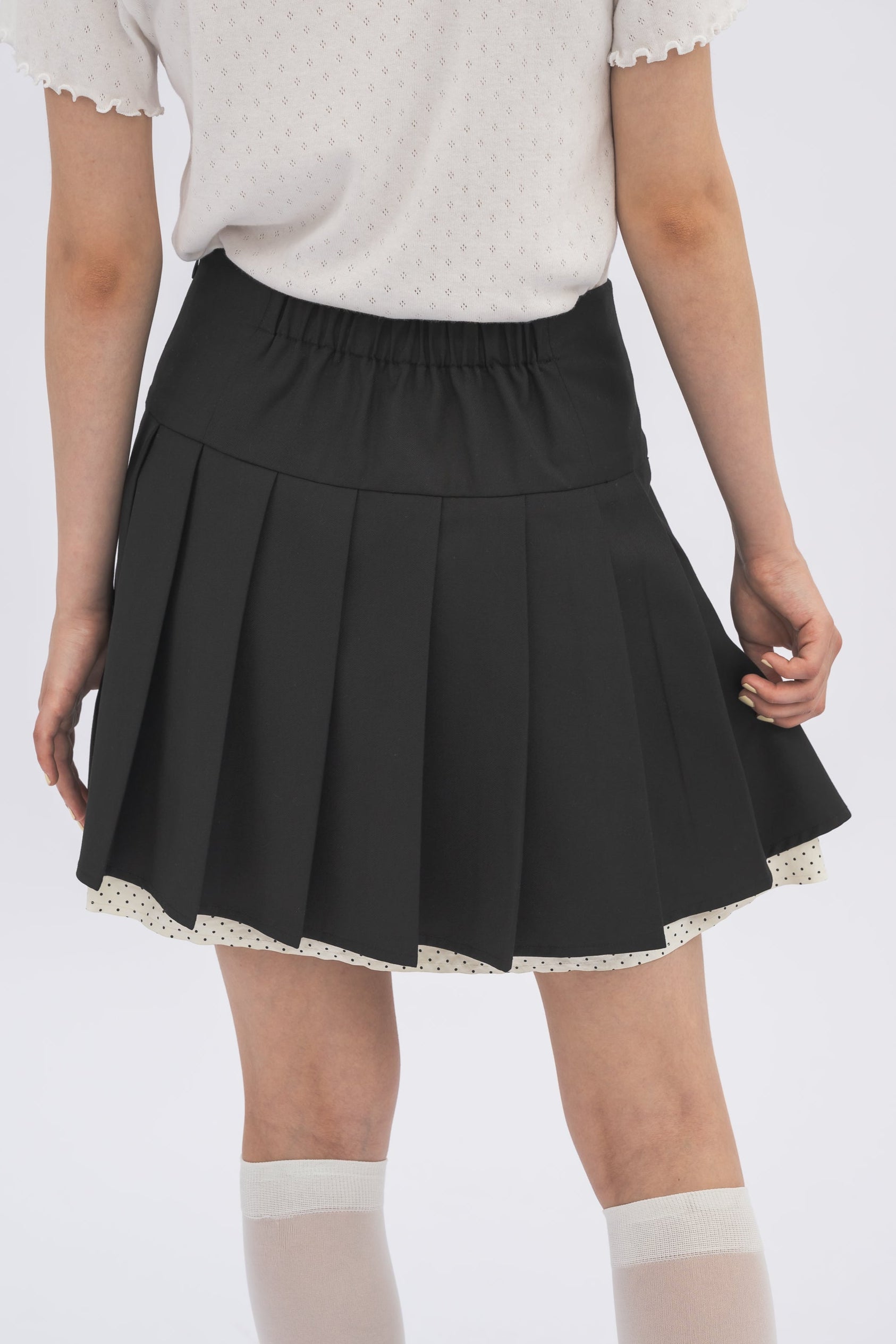 ミニ丈ながらもプリーツの切り替えが気になる下半身を自然にカバー。